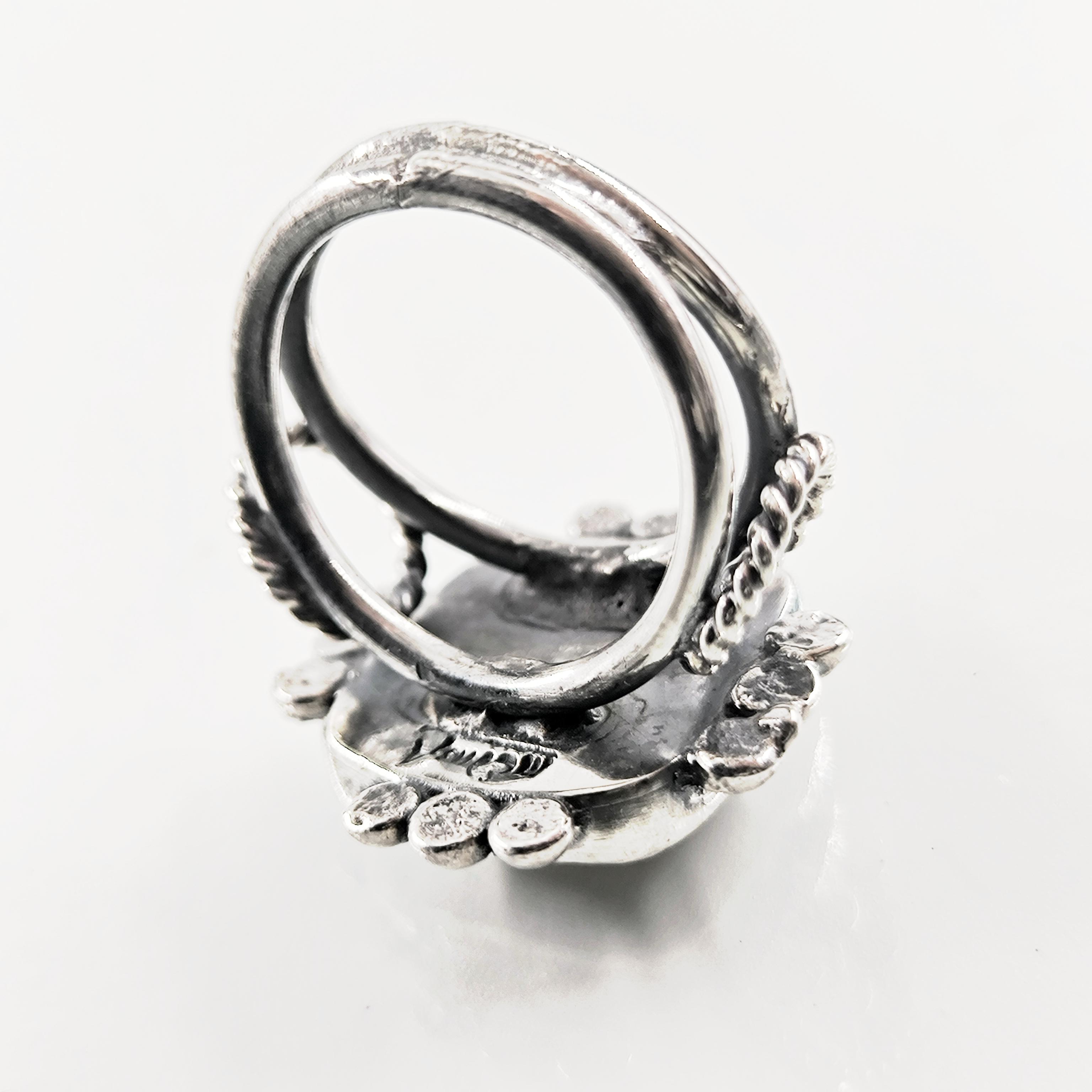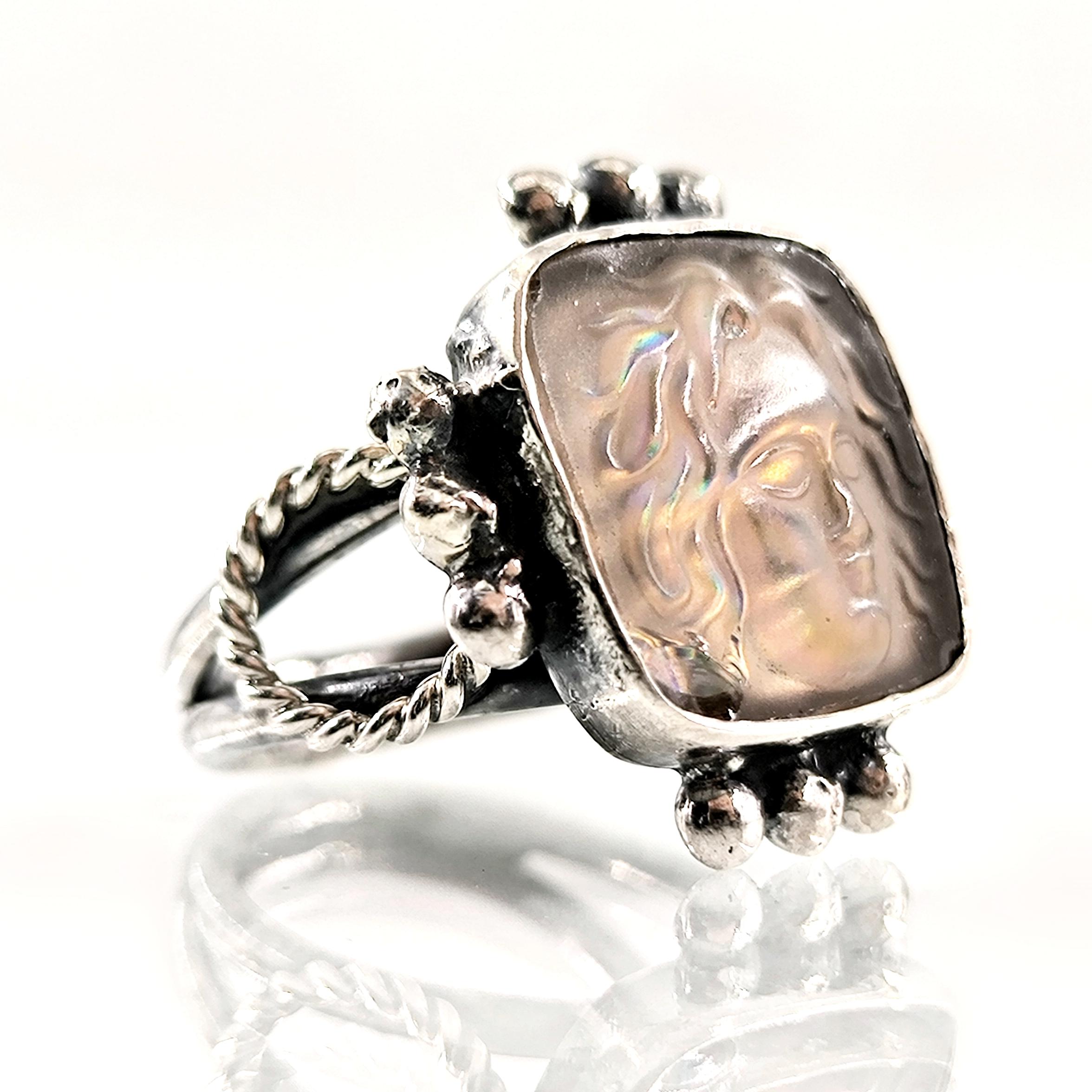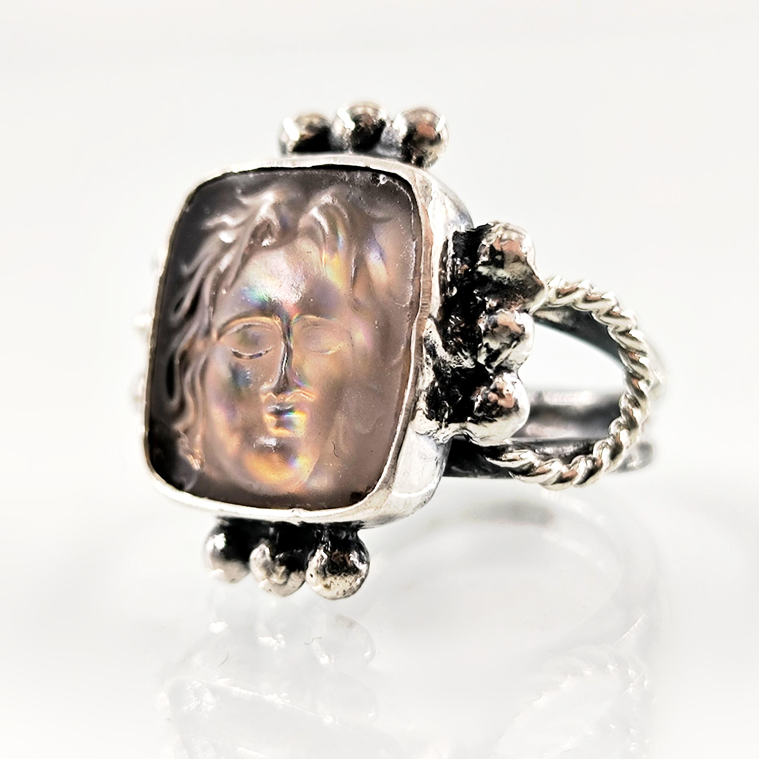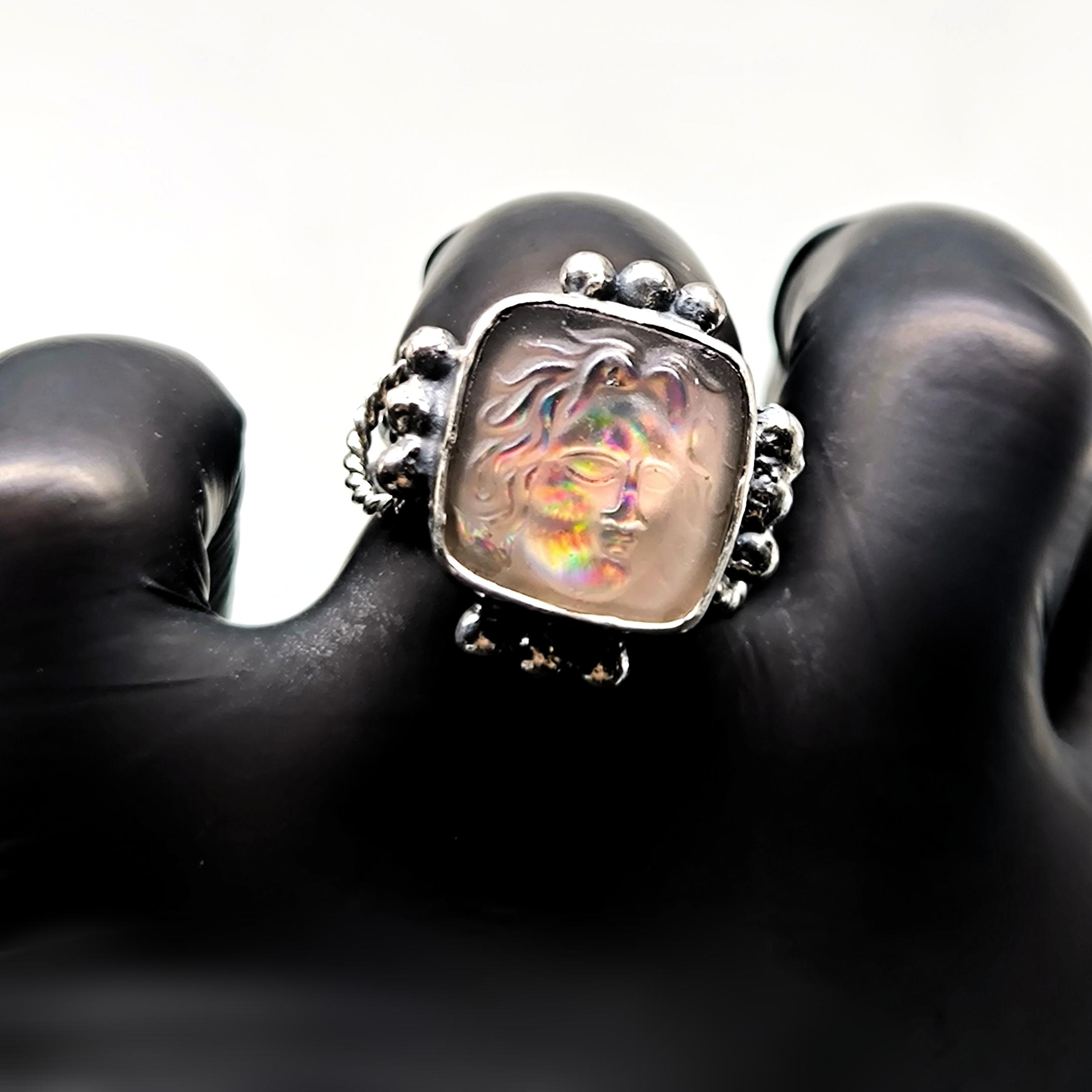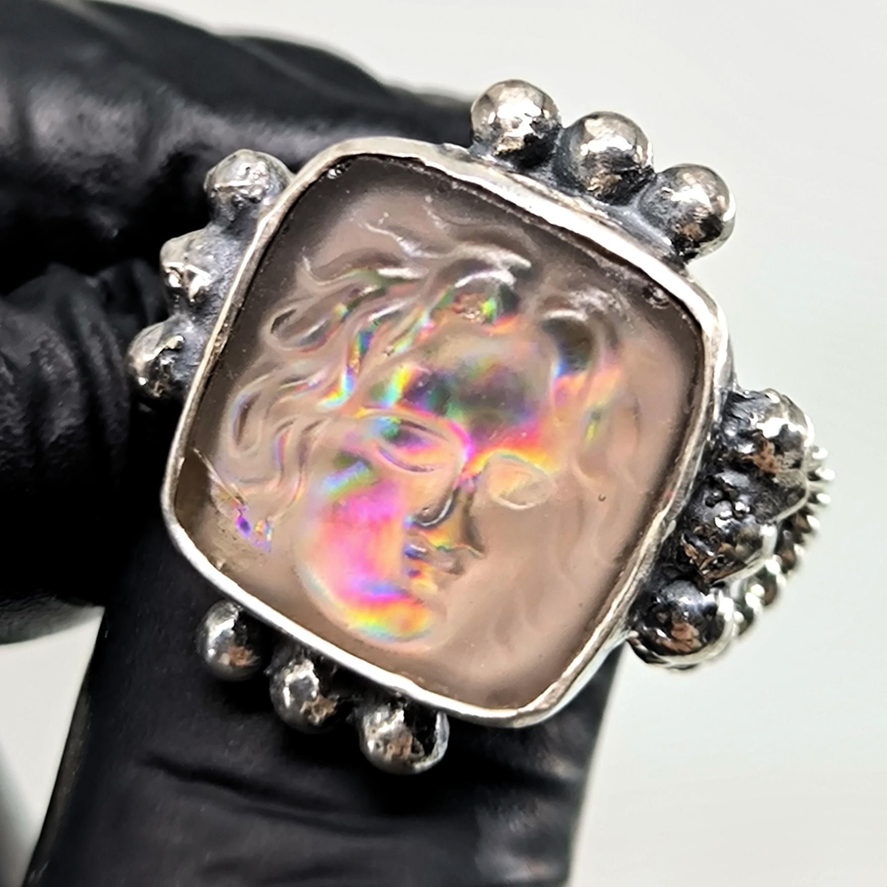 Güneşin her an değişen yüzünü ve ilahi ışığın titreşimini temsil eden Helios, bu yüzükte gökkuşağına dönüşen bir yansıma olarak karşımıza çıkıyor. Antik çağlarda her şeyi gören ve zamanı yöneten güneş tanrısının yüzü, ışıkla temas ettikçe farklı renkler saçan mistik bir aura yaratıyor. Yüzüğe bakıldıkça figür sabit kalmaz; günün saatine, ışığın açısına ve bakışınıza göre başka bir hikâye anlatır. Bu etki, Helios’un döngüsel doğasını ve kozmik gücünü parmak üzerinde yaşayan bir sembole dönüştürür. Antik stil eskitme gümüşten üretilen yüzüğün orta taşı camdır; pres tekniğiyle cam üzerine kabartma Helios figürü işlenmiş, camın altına yerleştirilen özel hologram foya sayesinde taş janjanlı ve gökkuşağı yansımalı bir derinlik kazanmıştır.