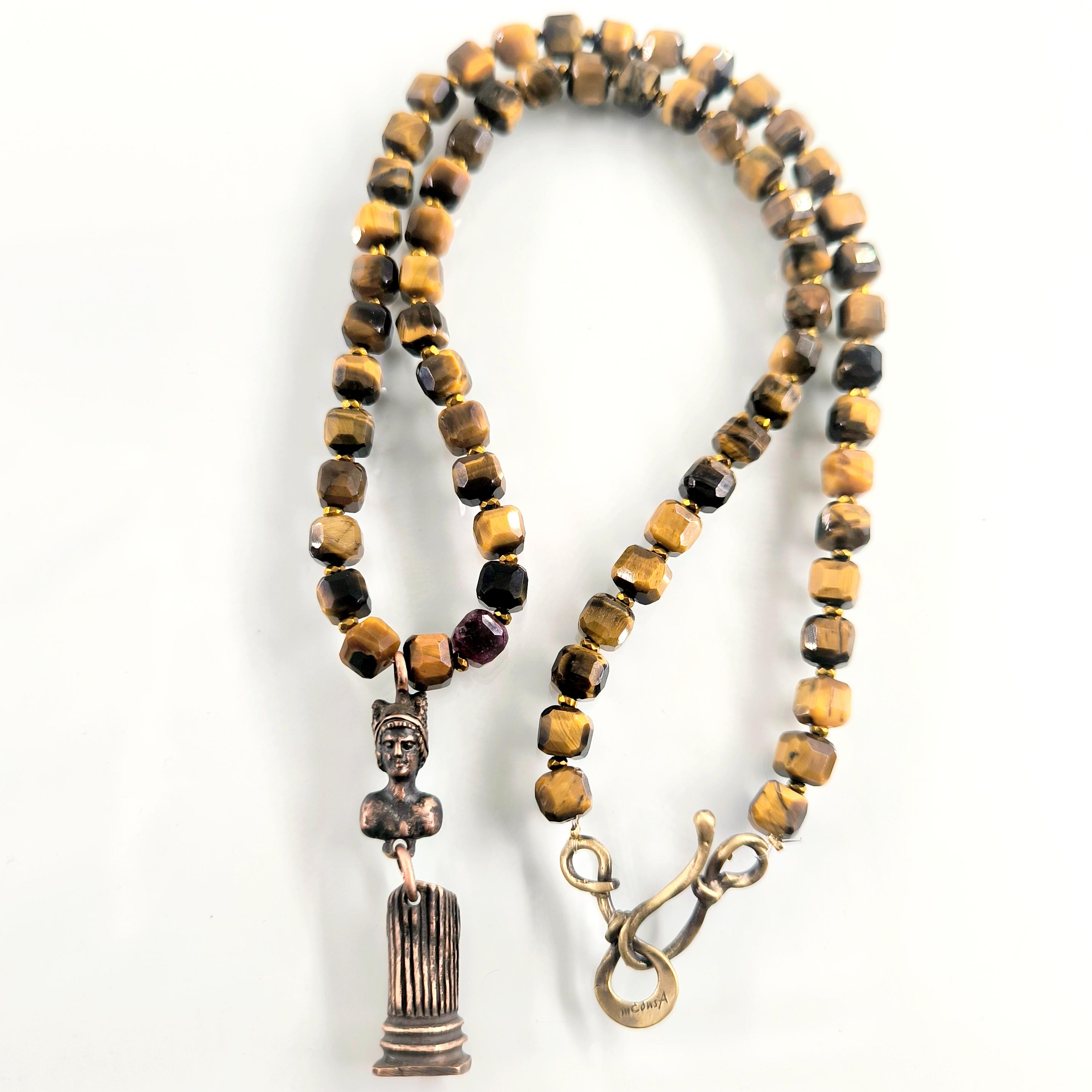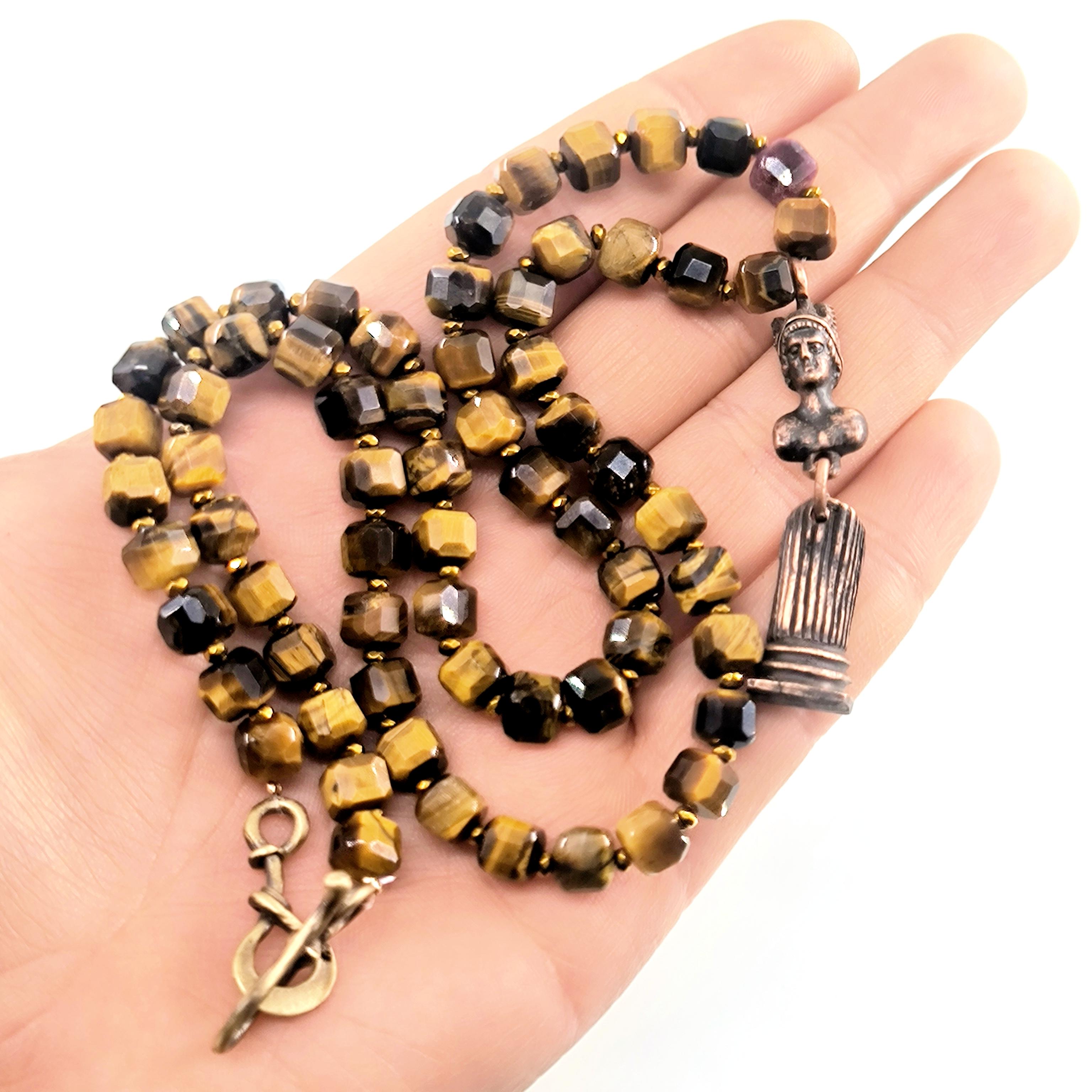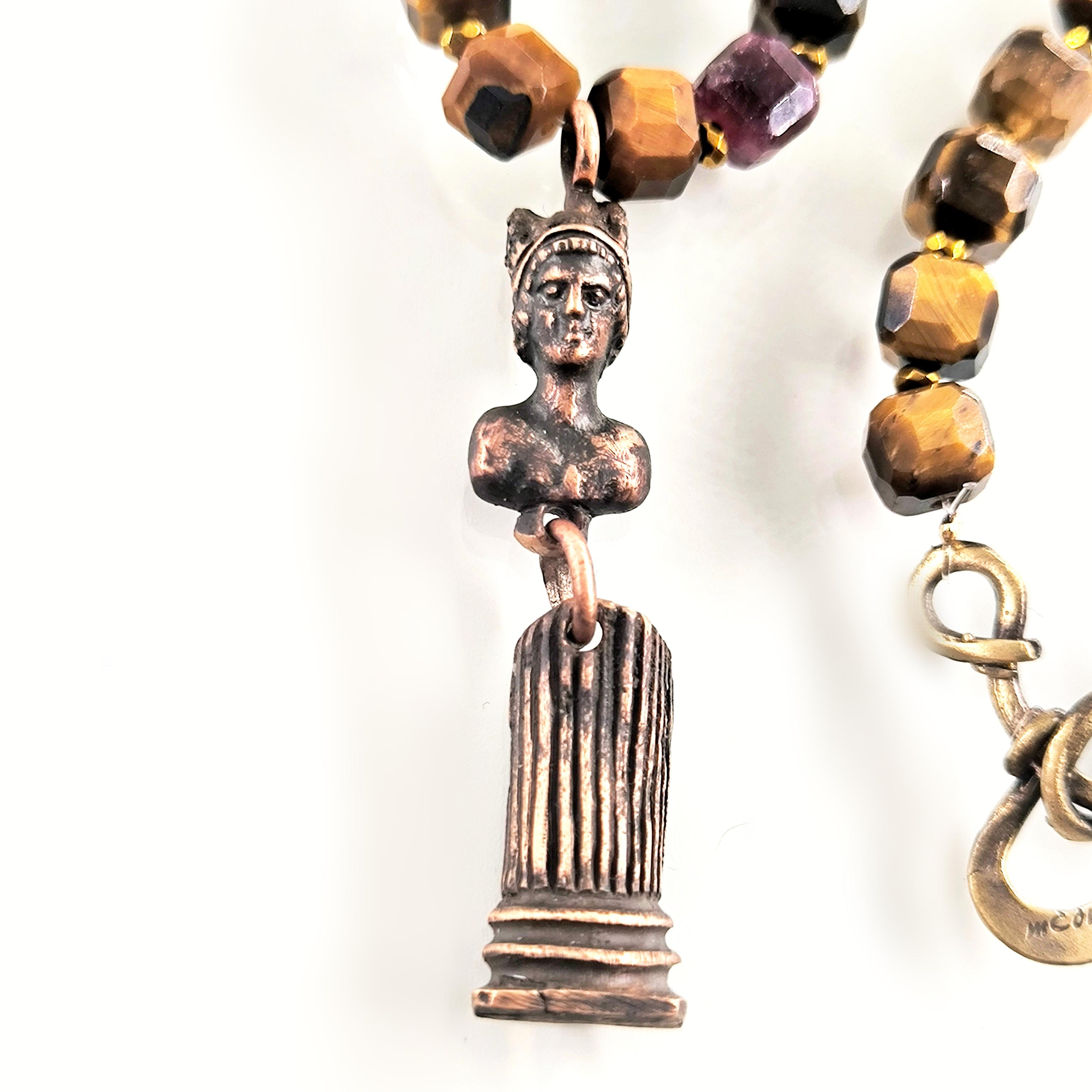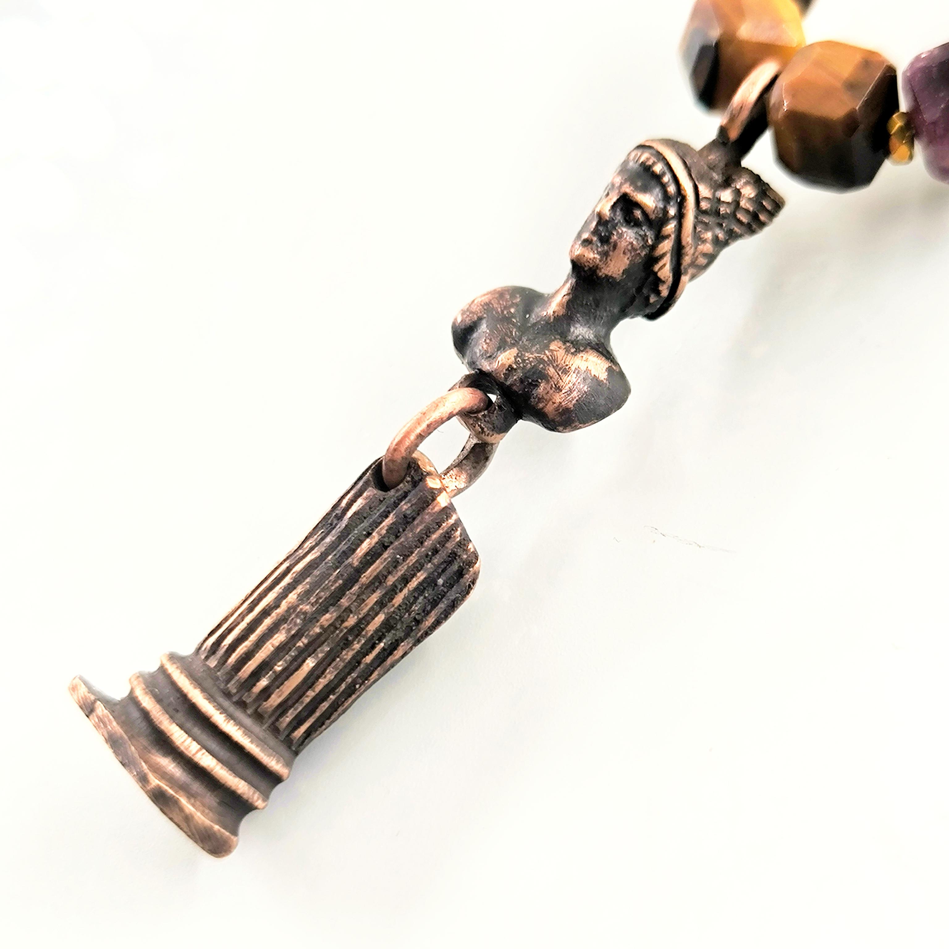 Bu tasarımda antik dünyanın zarafetini ve sembollerini bir araya getirdim. Zincirdeki natürel fasetli kaplan gözü taşları ışıkla birlikte altın tonlarında parlayarak kolyeye güçlü ve sıcak bir enerji veriyor. Kolye ucunda yer alan bronz Hermes figürü; yolculuğun, zekânın ve kadim bilgeliğin sembolü olarak tasarımın ruhunu taşıyor. Altında sallanan Roma sütunu ise medeniyetin ve zamansız mimarinin bir hatırası gibi hareket ederek kolyeye karakter katıyor. Boyunda taşınan küçük bir antik hikâye gibi duran bu parça, mistik ve güçlü bir Medusa tasarımıdır.
