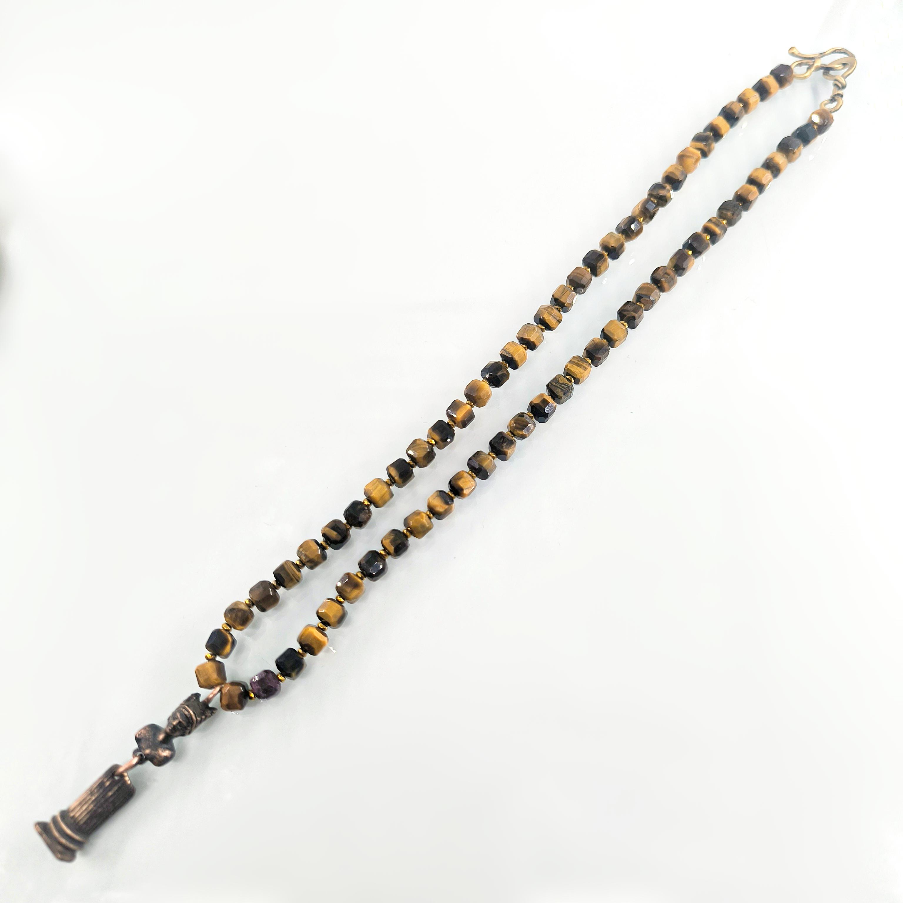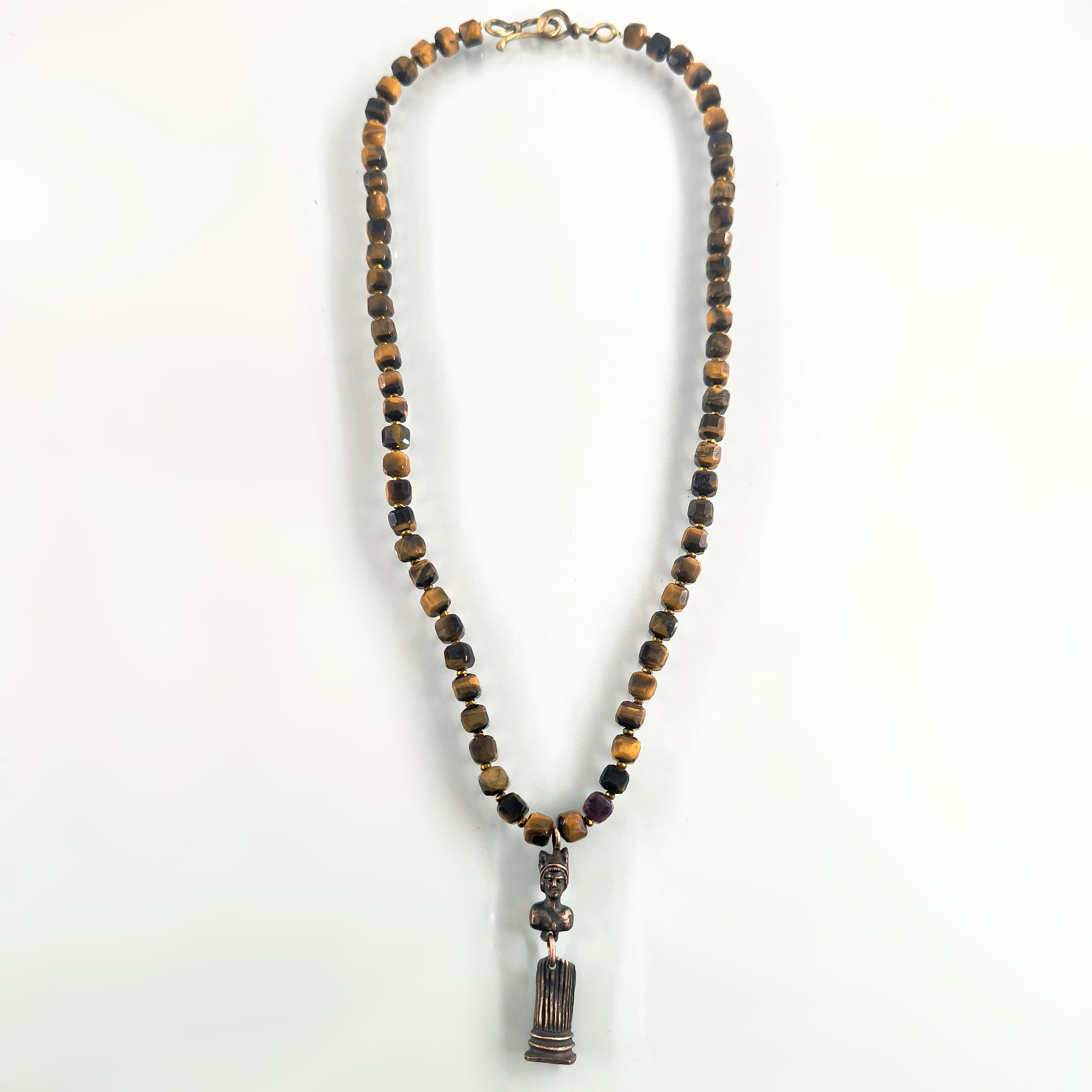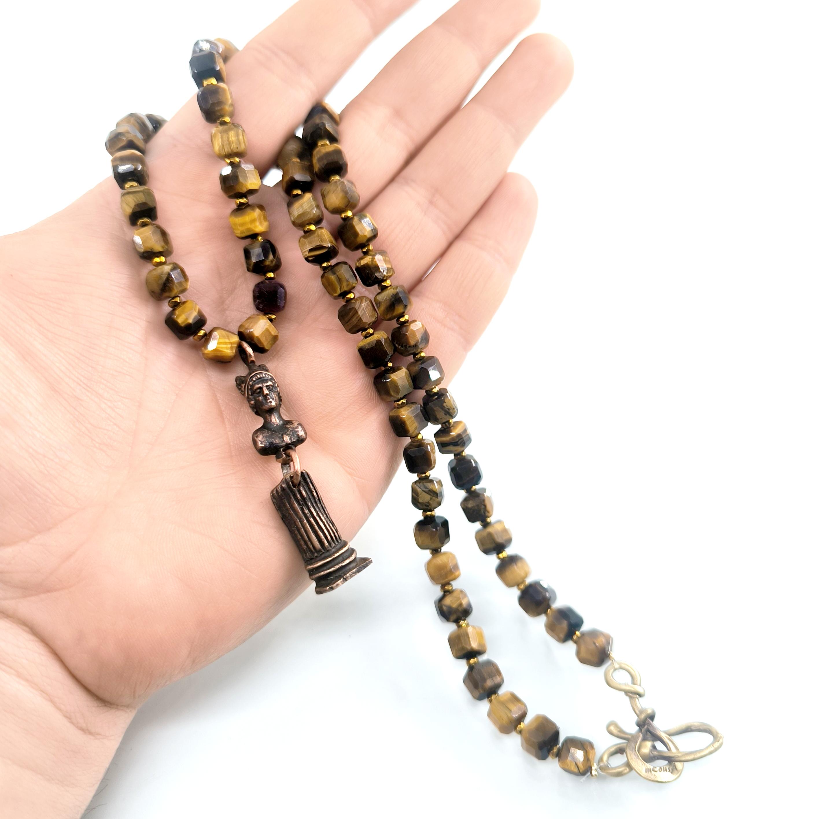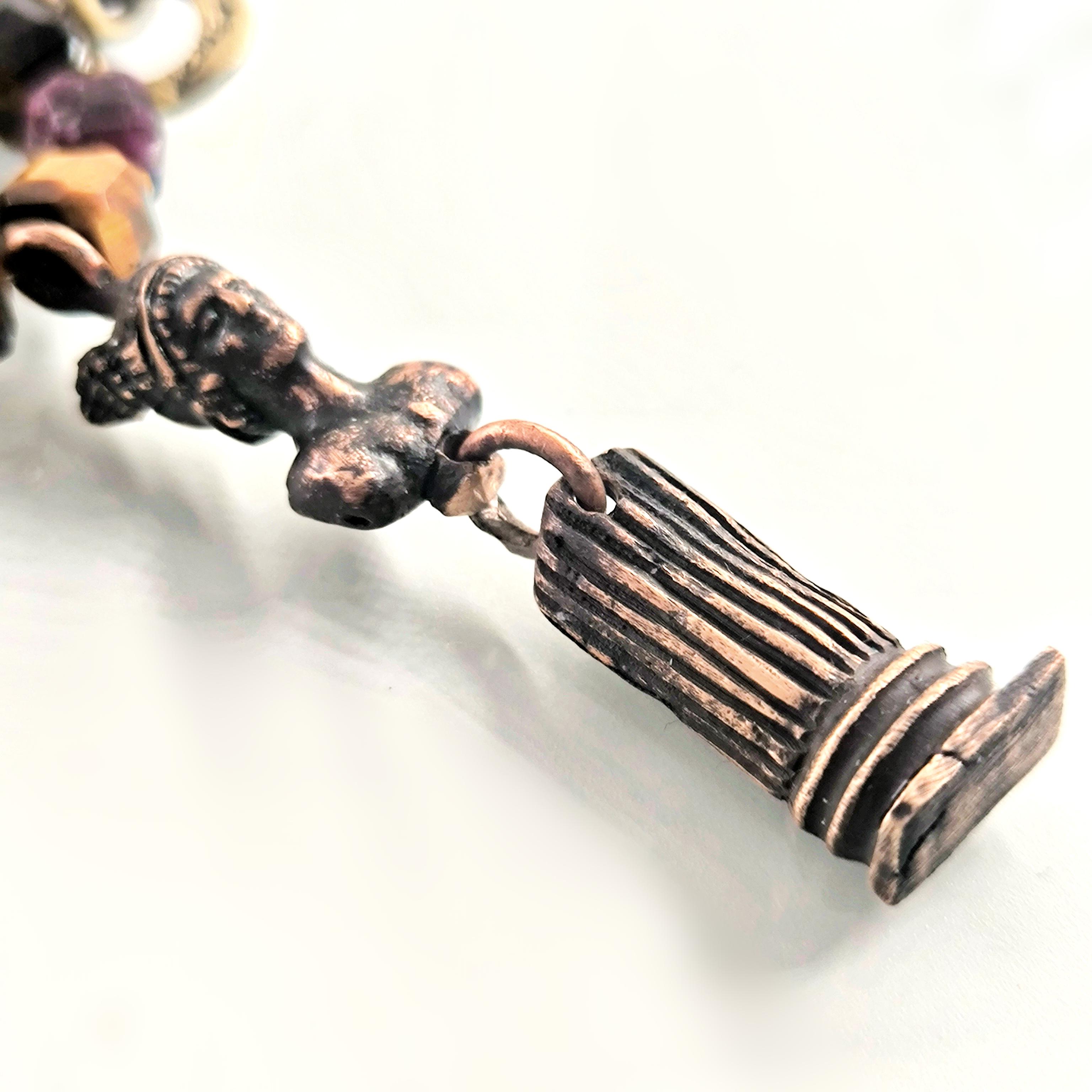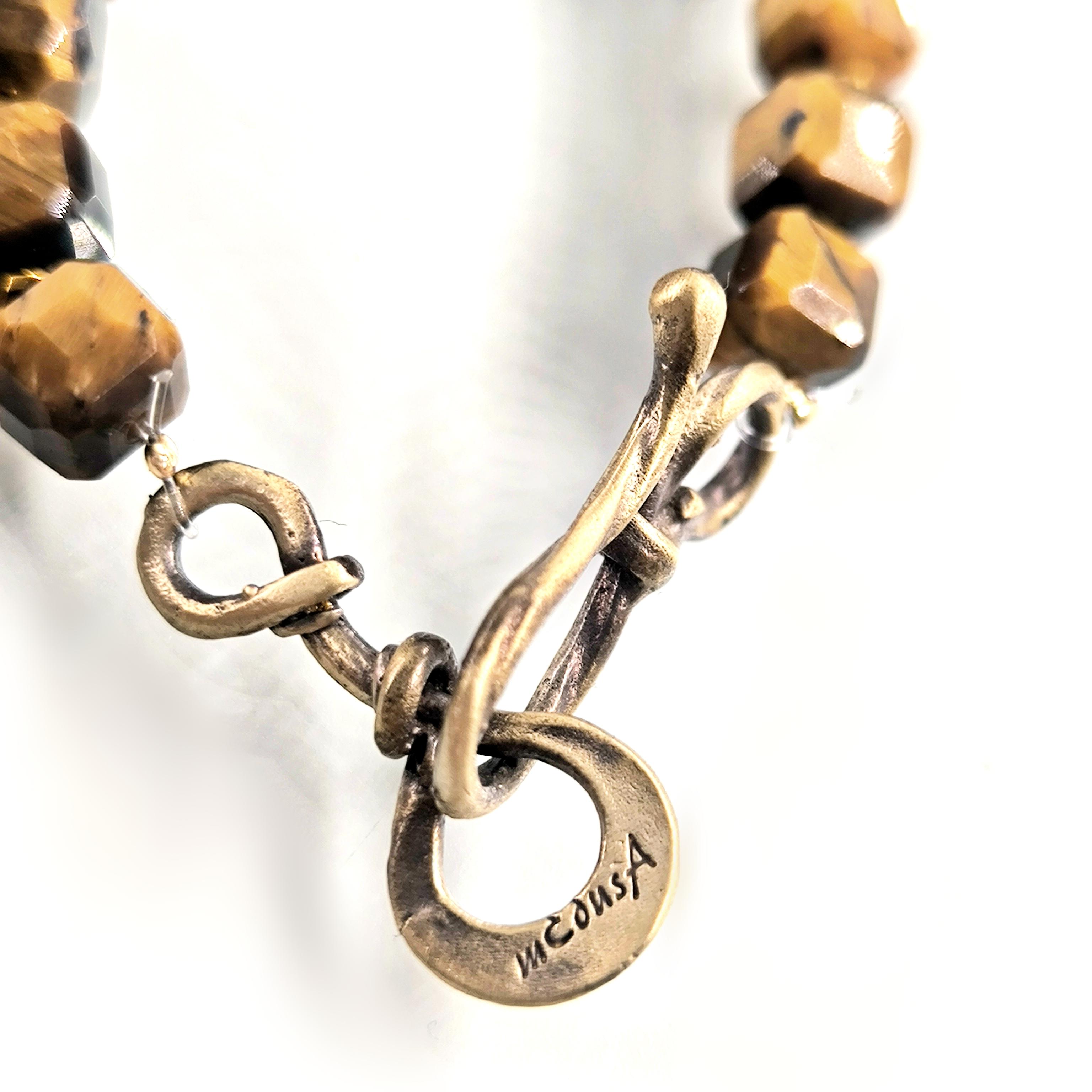 Bu tasarımda antik dünyanın zarafetini ve sembollerini bir araya getirdim. Zincirdeki natürel fasetli kaplan gözü taşları ışıkla birlikte altın tonlarında parlayarak kolyeye güçlü ve sıcak bir enerji veriyor. Kolye ucunda yer alan bronz Hermes figürü; yolculuğun, zekânın ve kadim bilgeliğin sembolü olarak tasarımın ruhunu taşıyor. Altında sallanan Roma sütunu ise medeniyetin ve zamansız mimarinin bir hatırası gibi hareket ederek kolyeye karakter katıyor. Boyunda taşınan küçük bir antik hikâye gibi duran bu parça, mistik ve güçlü bir Medusa tasarımıdır.