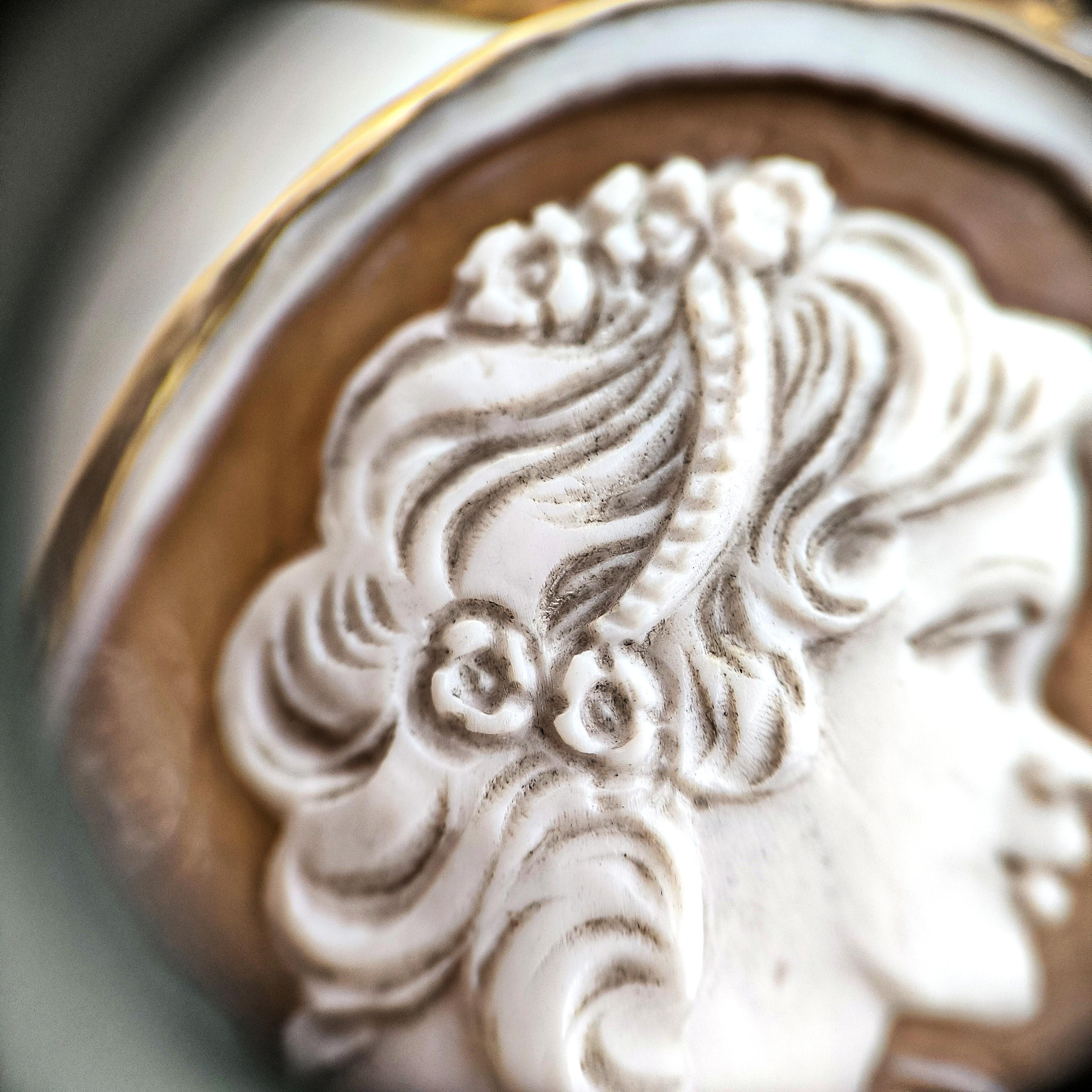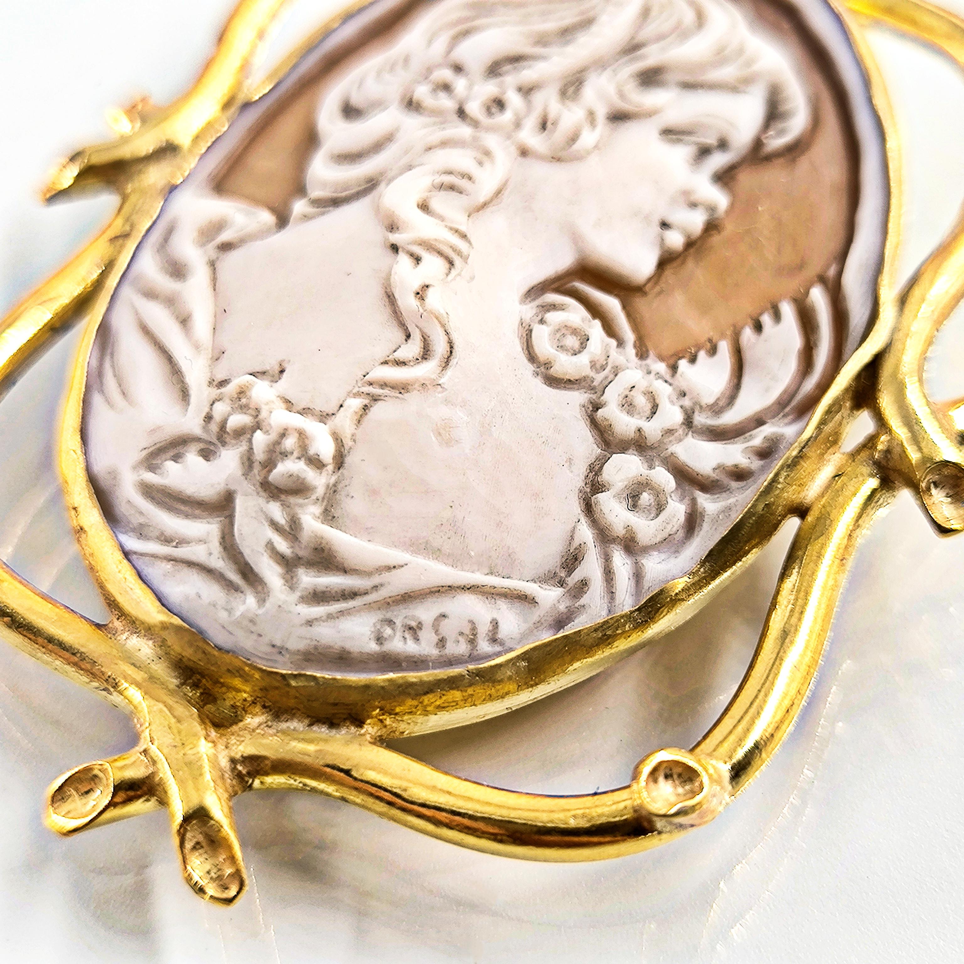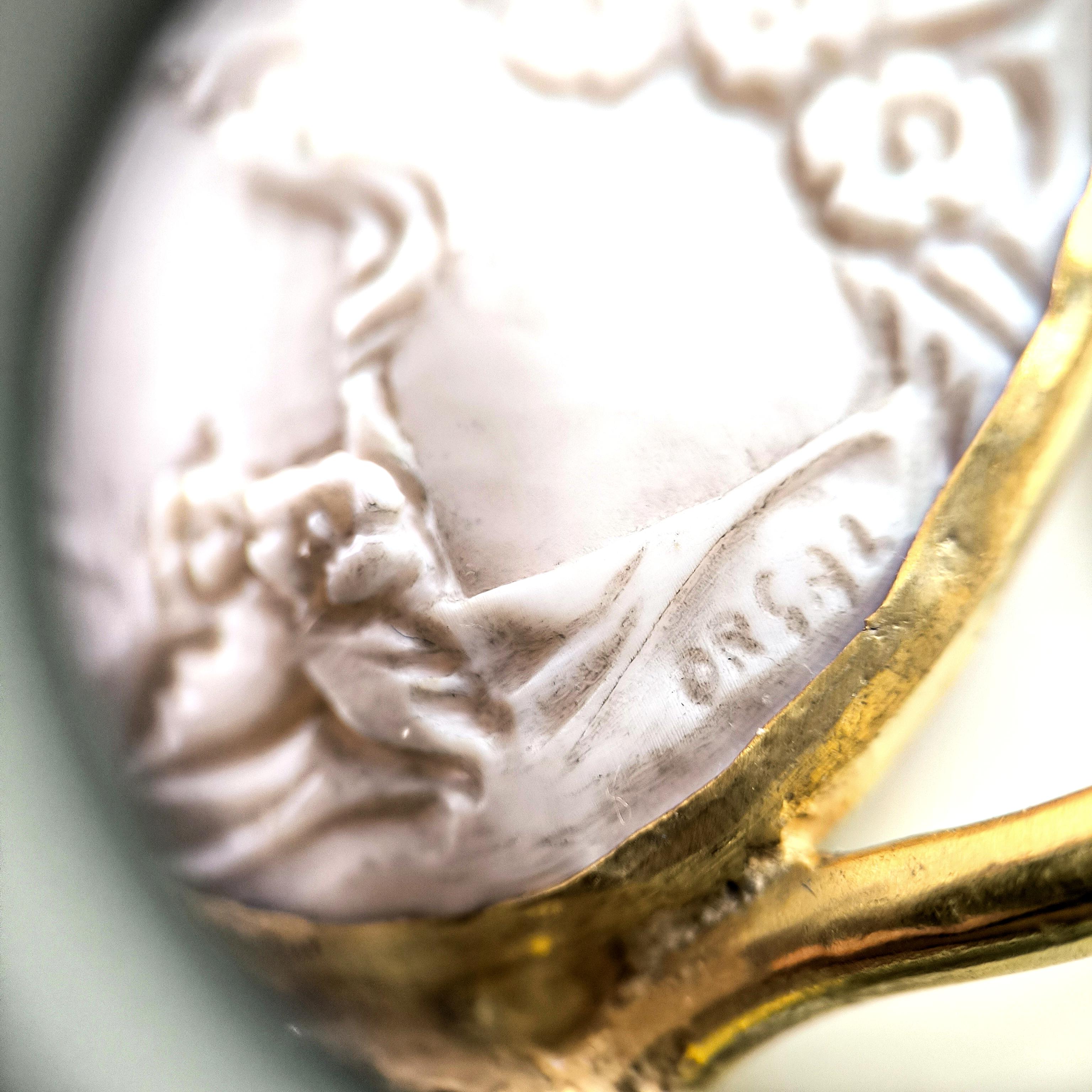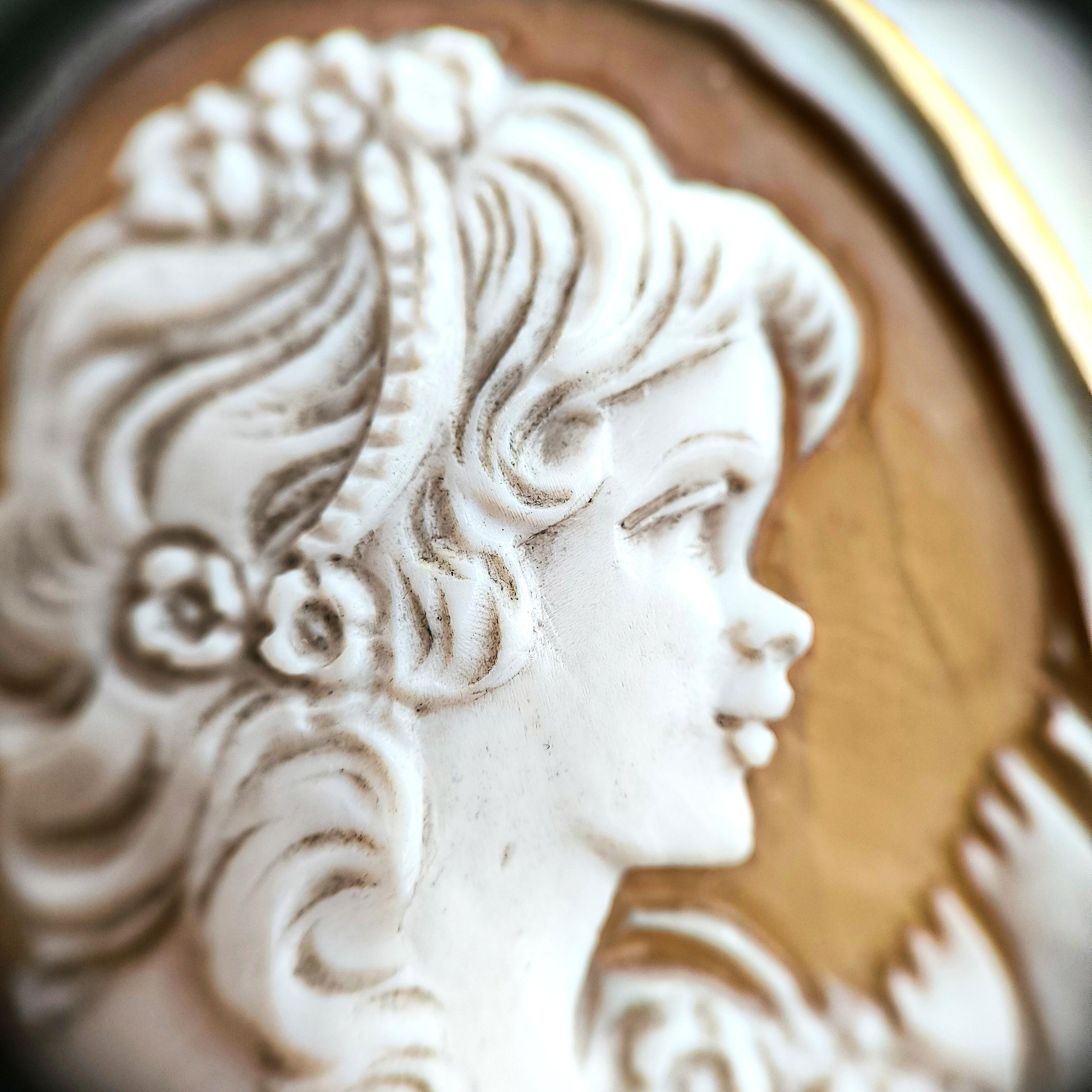 1990’lar yapımı bu zarif cameo, ince oyma detayları ve imzalı yüzeyiyle nadide bir sanat parçası.