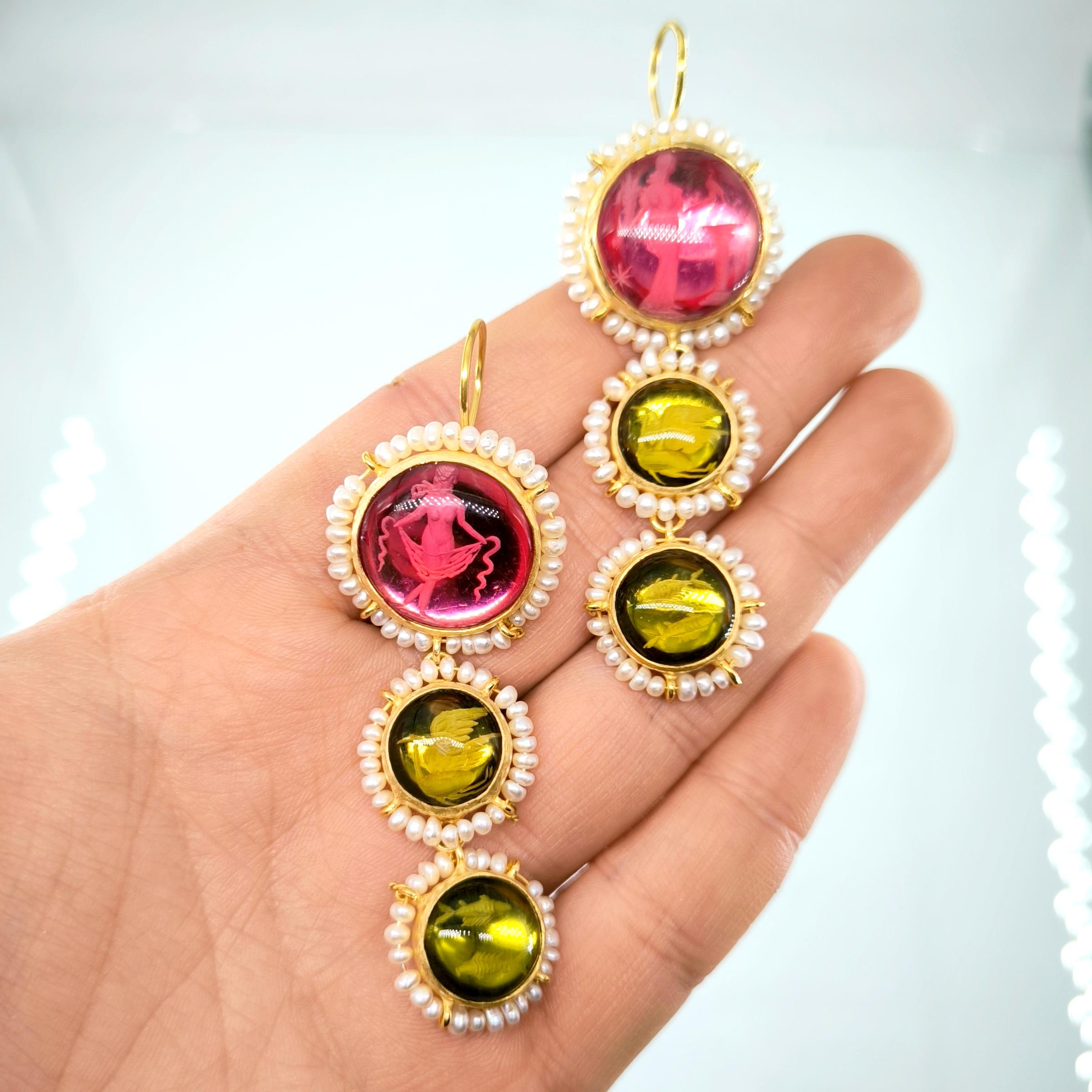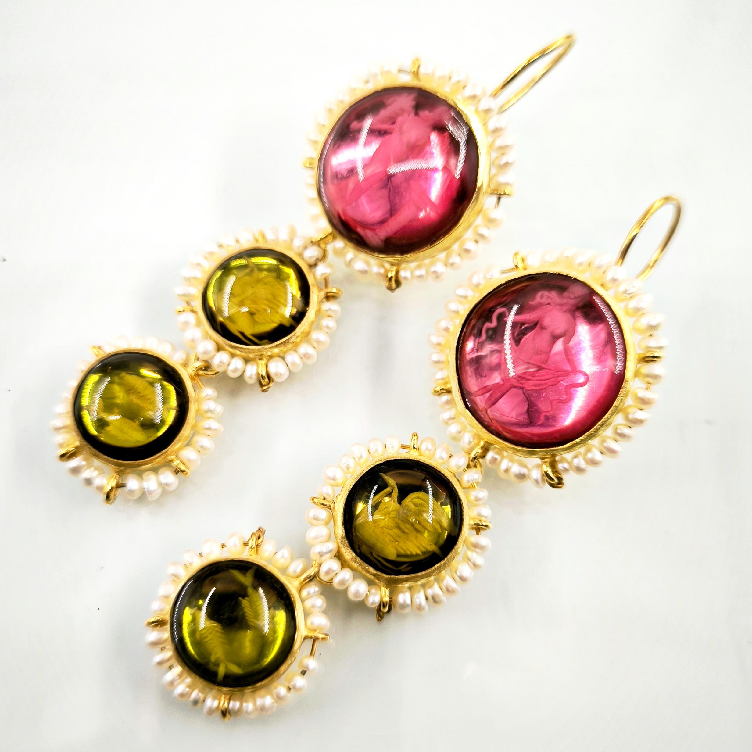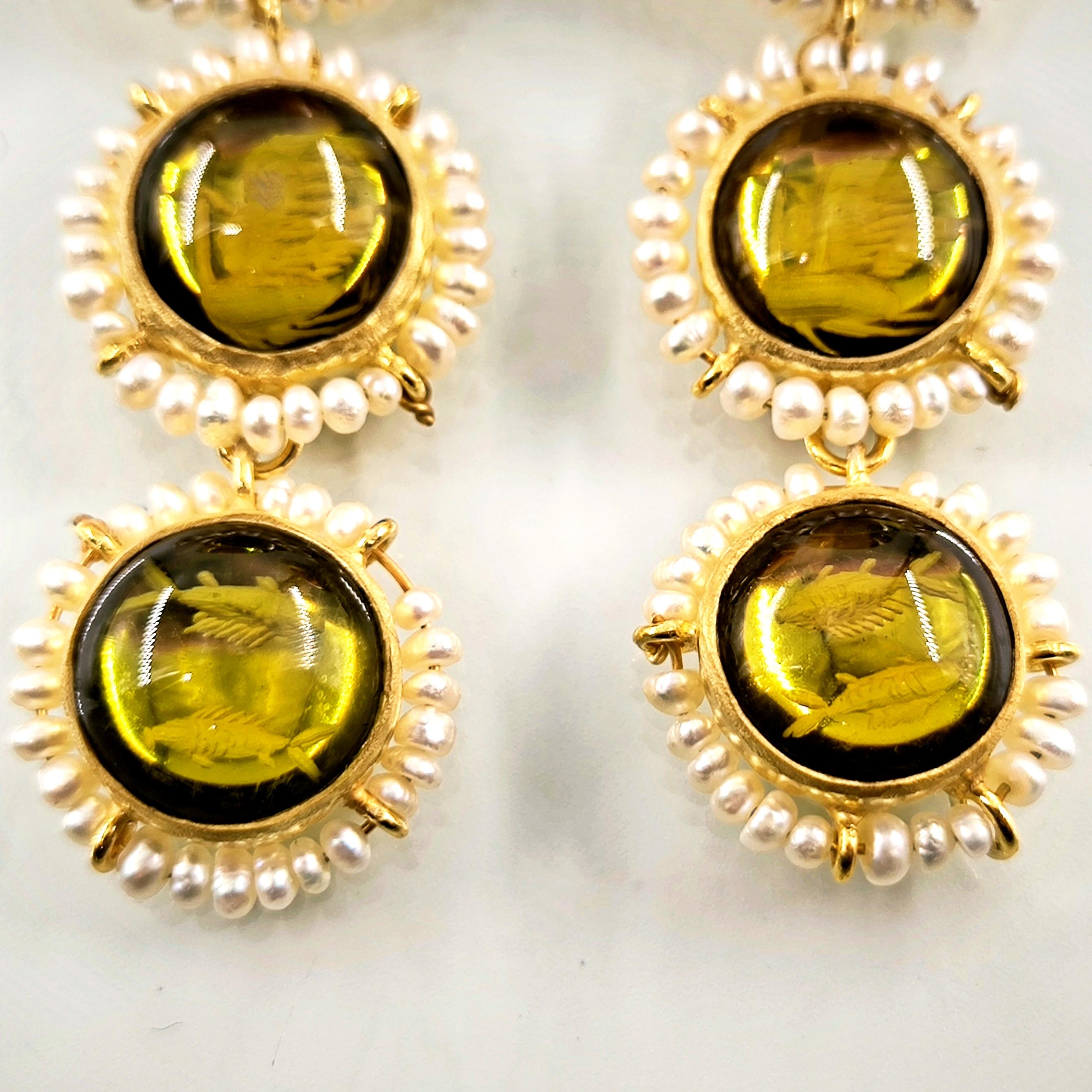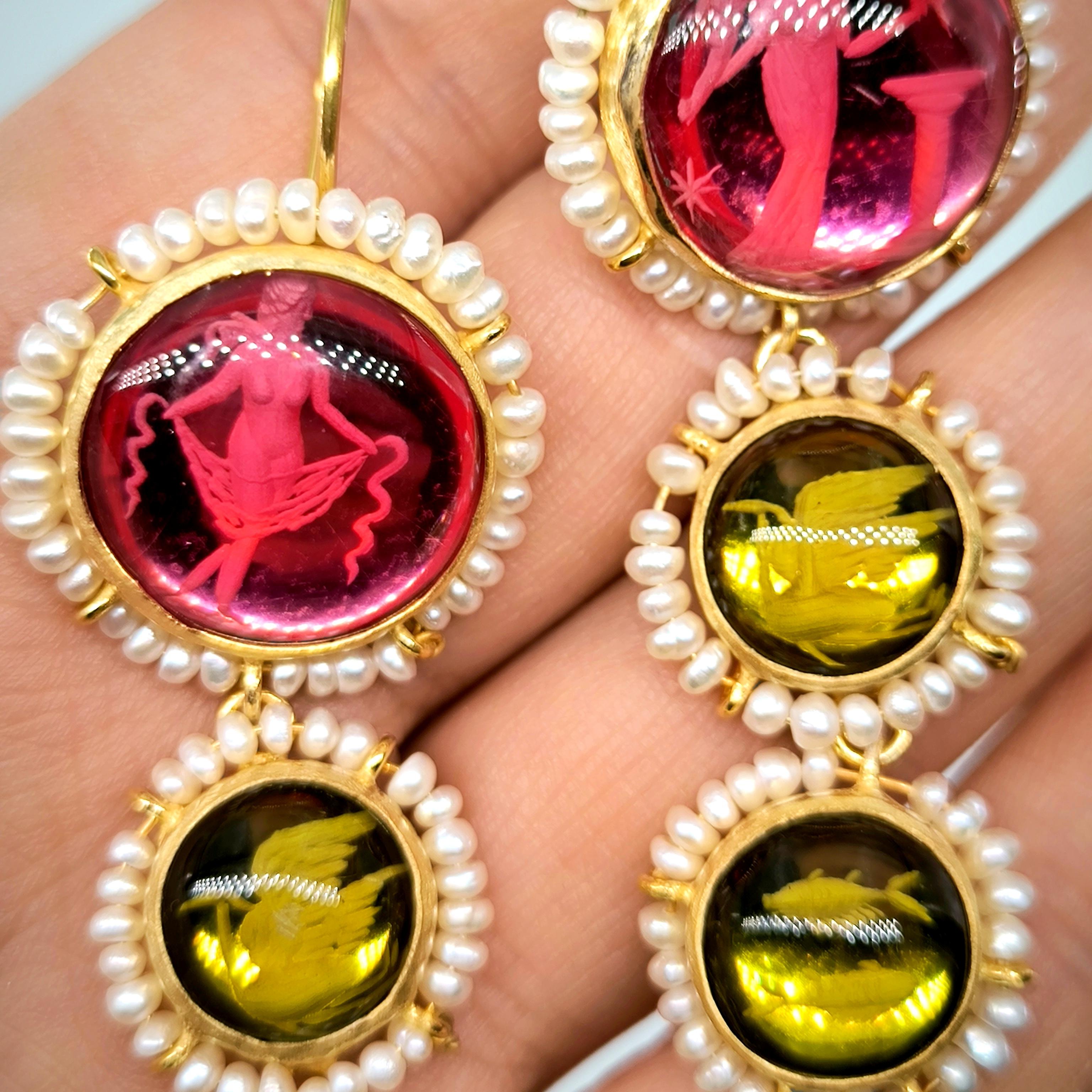 Üst düzey Bir ''mEdusA'' eseri! Sentetik (Lab.) Kehribar taşlar üzeri negatif intaglio'lar çalıştığımız, (Tanrıçalar, balıklar ve Anka kuşlar) etrafını natürel okyanus incileri ile süslediğimiz komple 925 Ayar Gümüş & üzeri 22 K altın kaplama Antik ve Gotik stilde küpelerimiz!