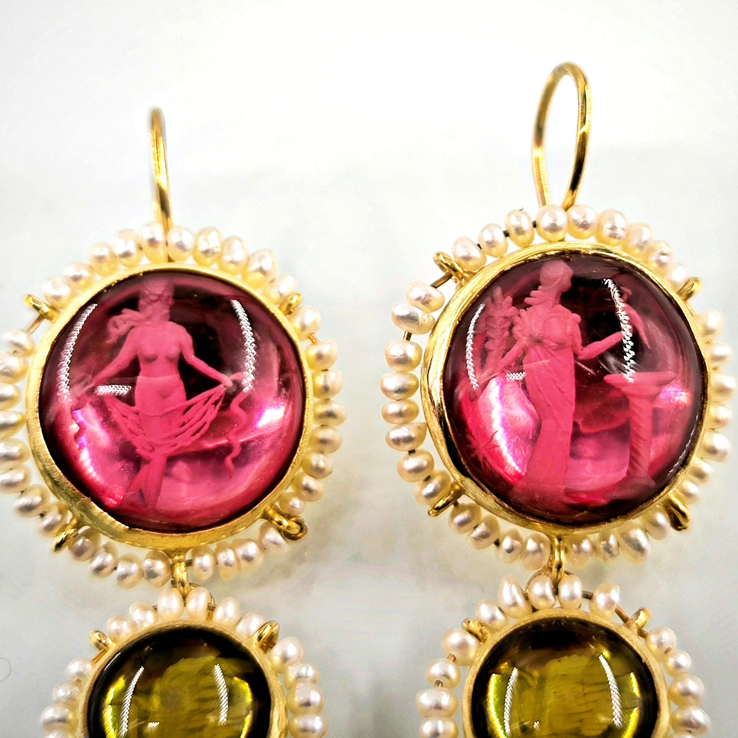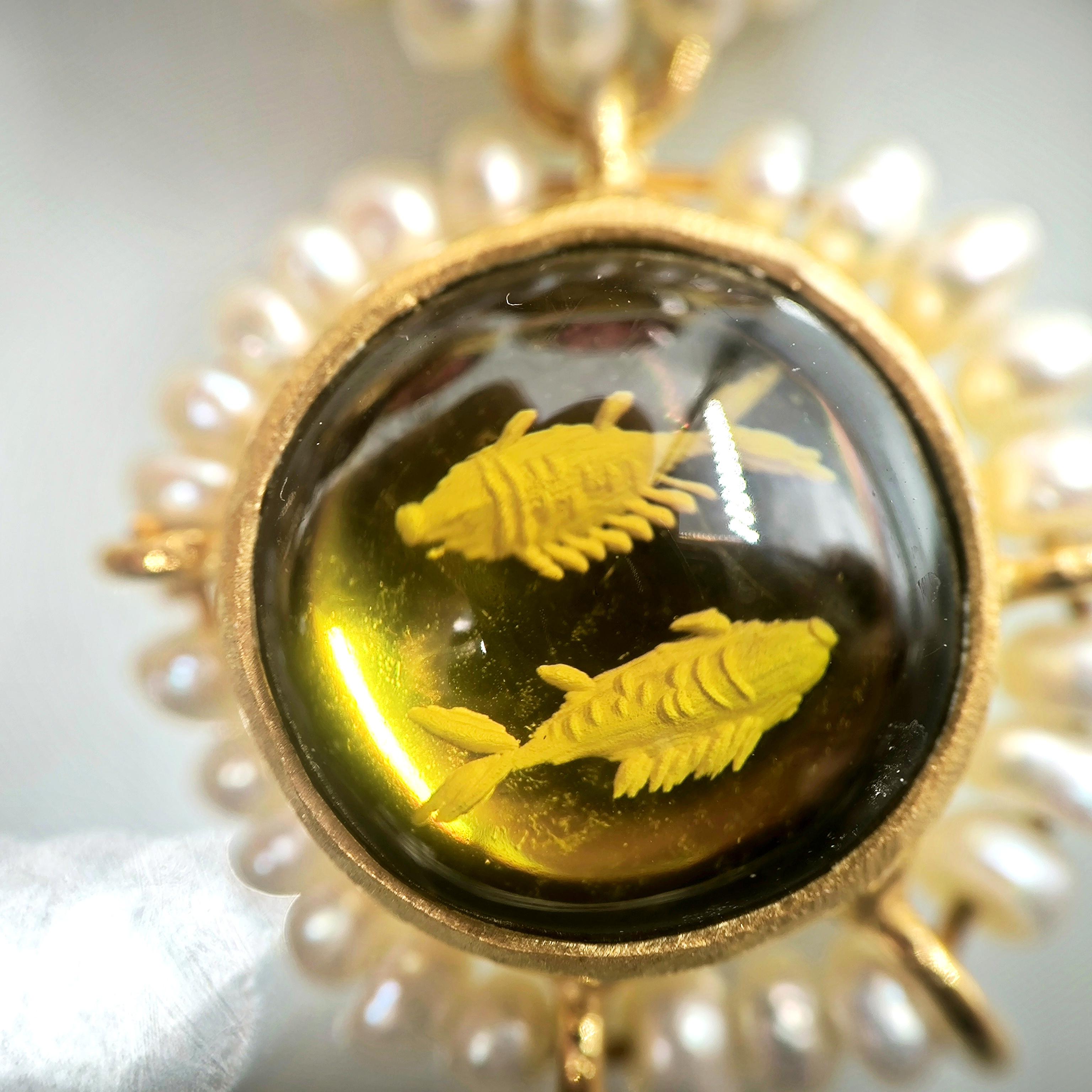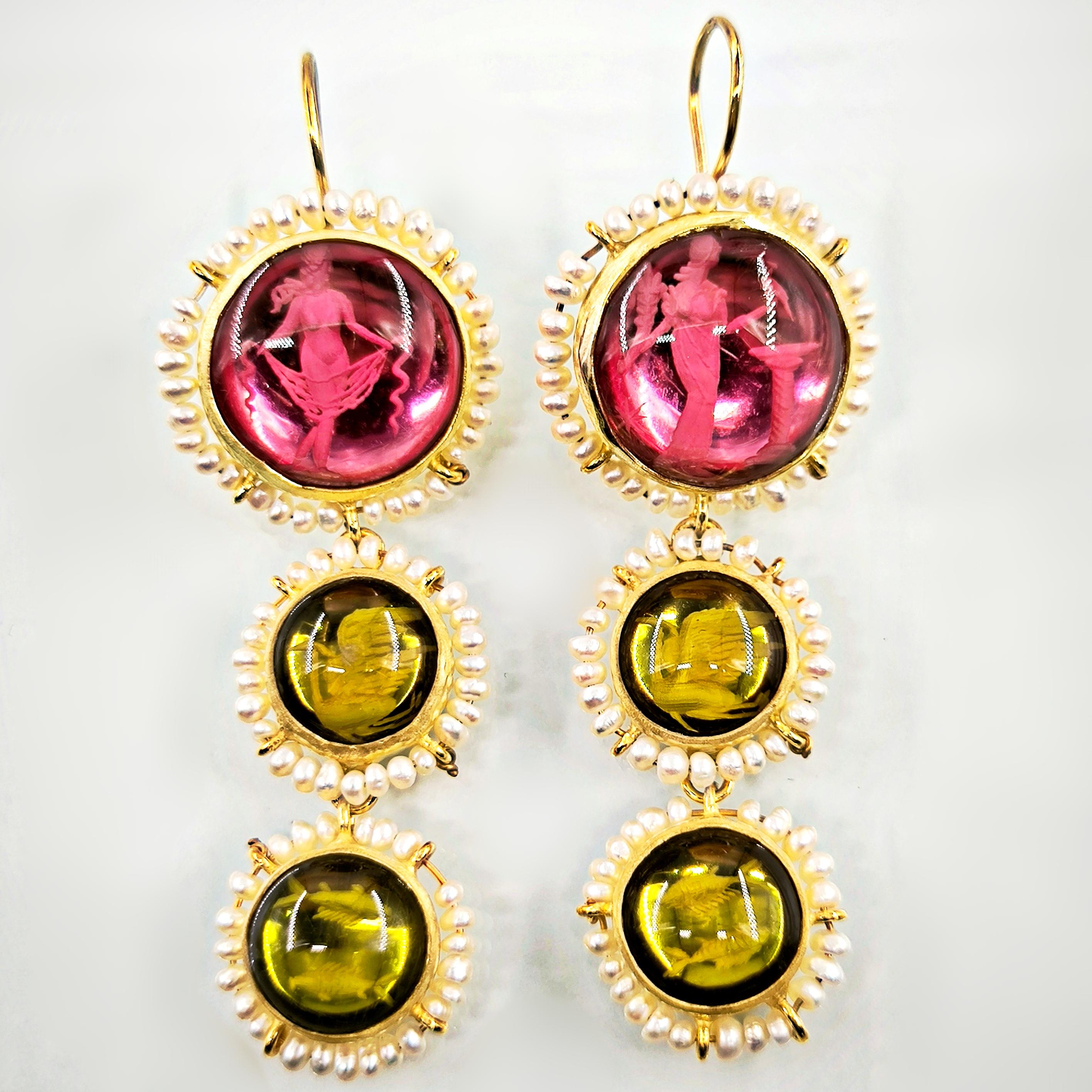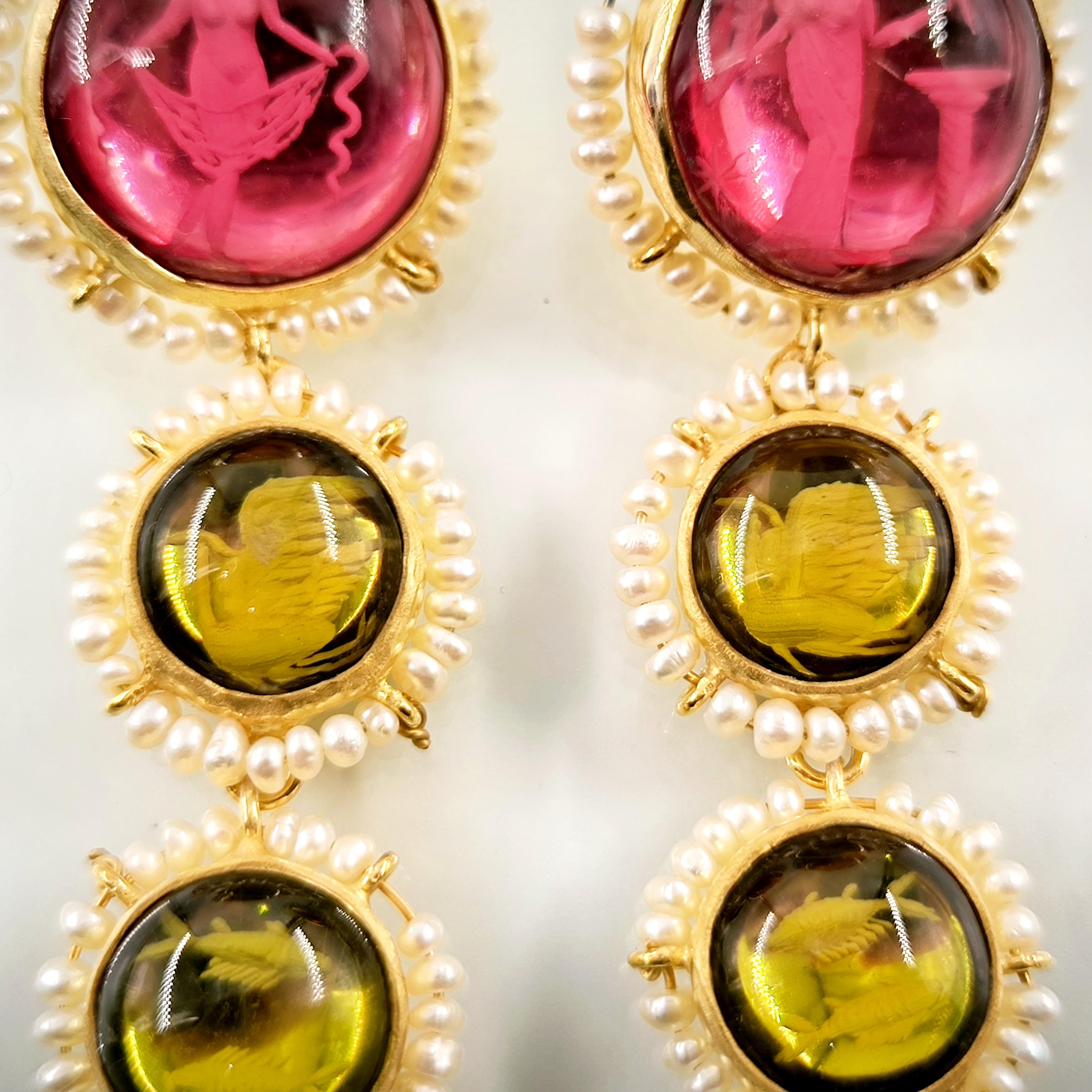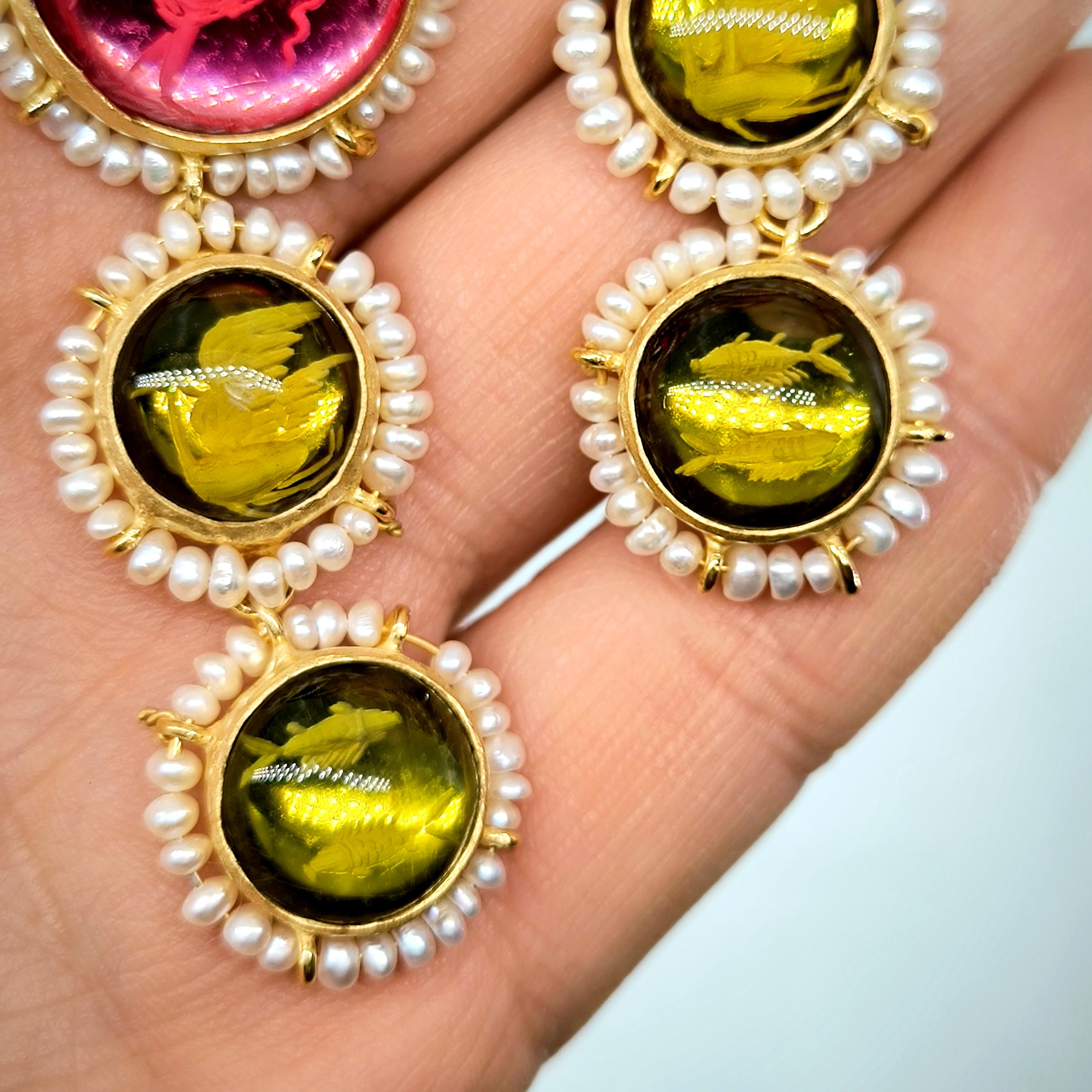 Üst düzey Bir ''mEdusA'' eseri! Sentetik (Lab.) Kehribar taşlar üzeri negatif intaglio'lar çalıştığımız, (Tanrıçalar, balıklar ve Anka kuşlar) etrafını natürel okyanus incileri ile süslediğimiz komple 925 Ayar Gümüş & üzeri 22 K altın kaplama Antik ve Gotik stilde küpelerimiz!