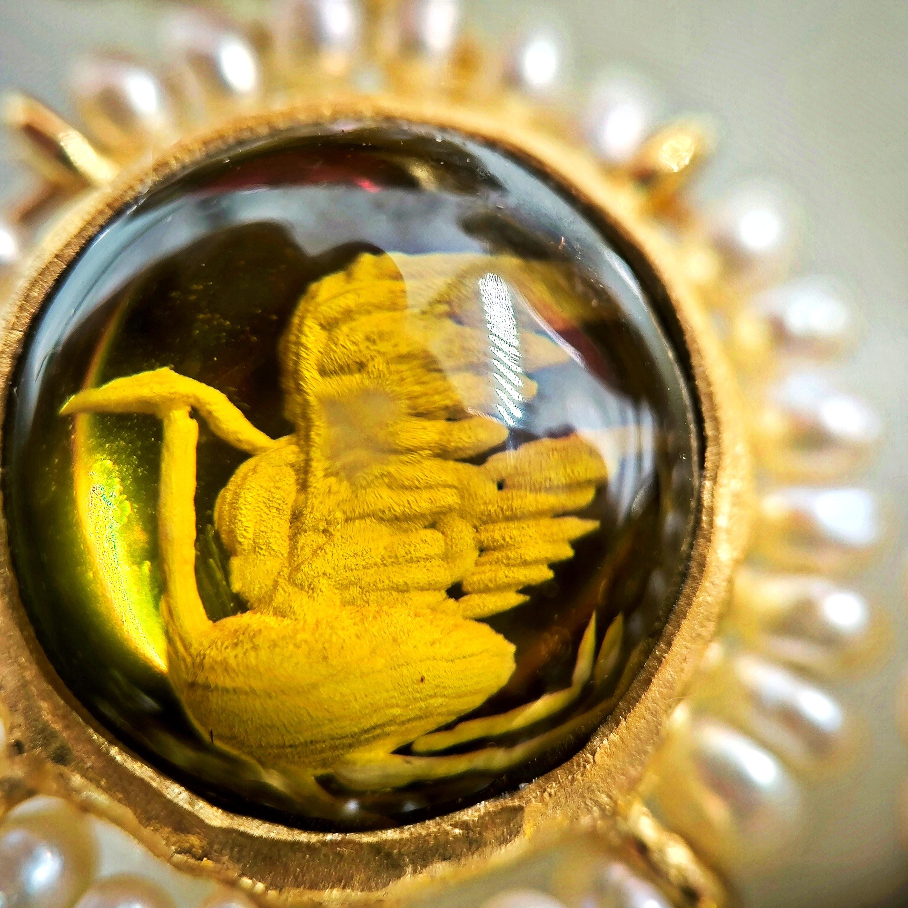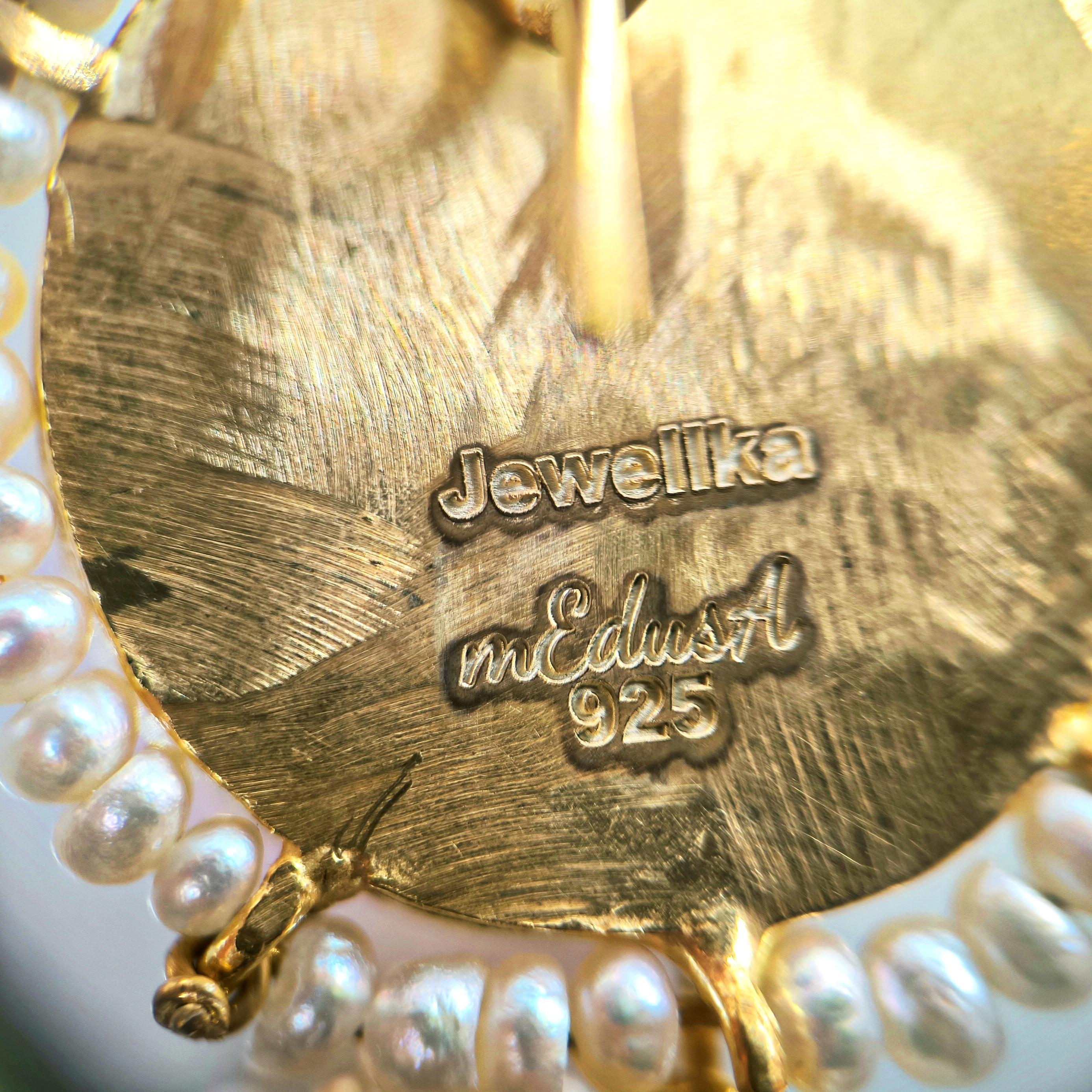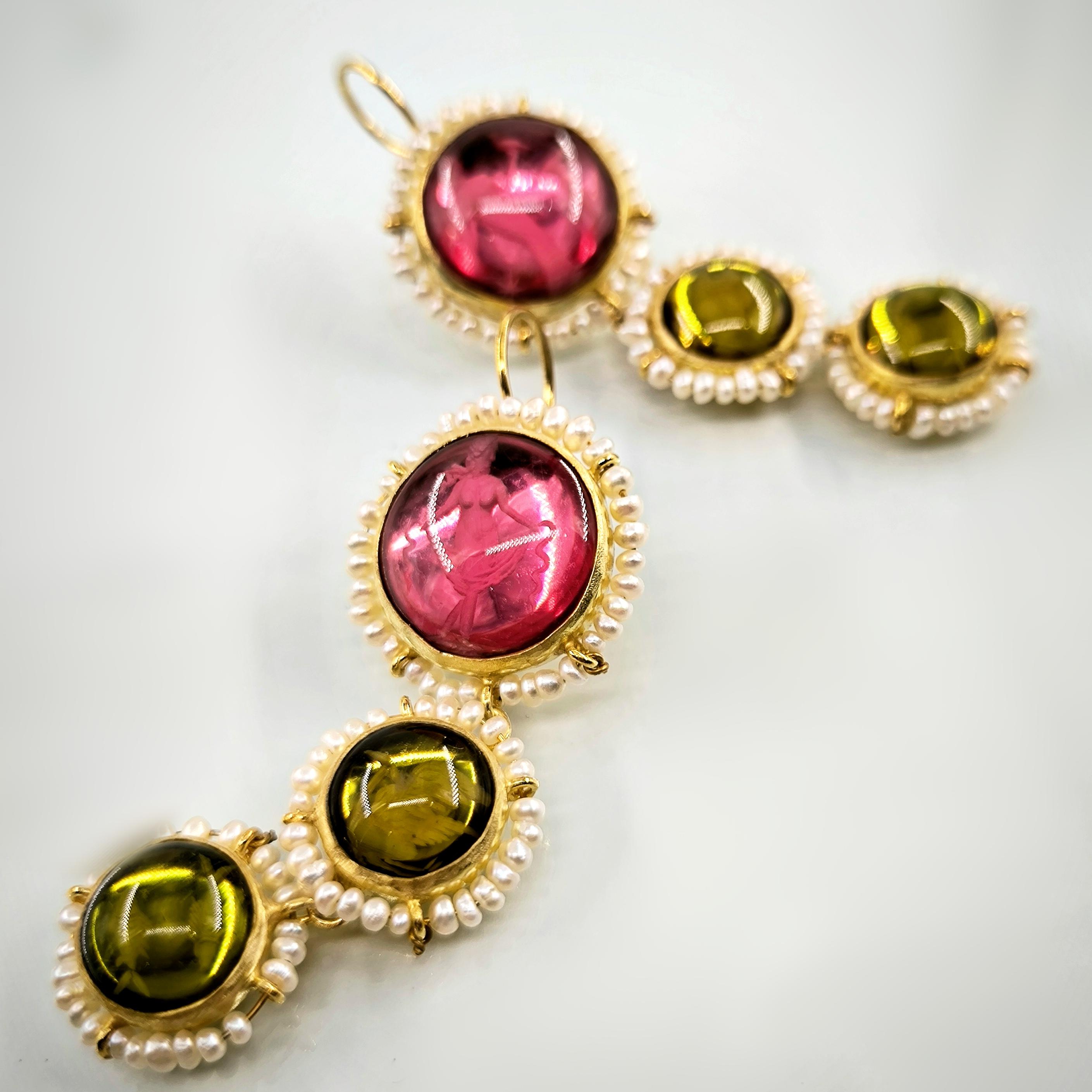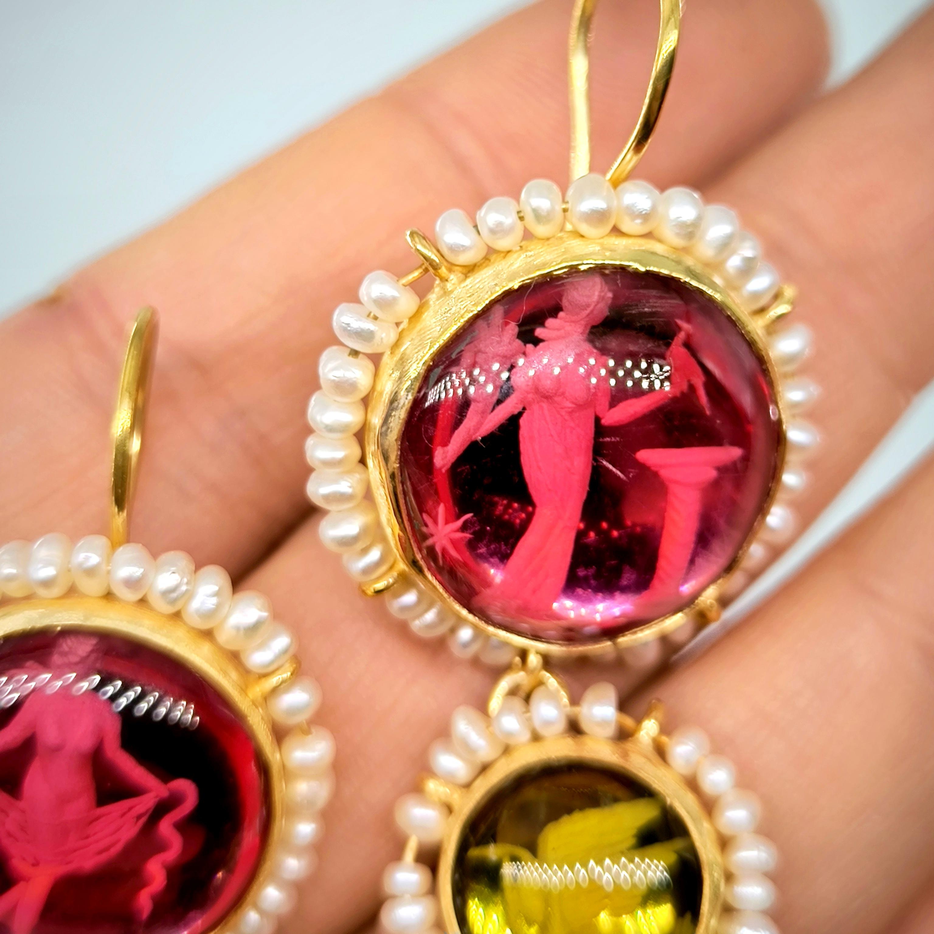 Üst düzey Bir ''mEdusA'' eseri! Sentetik (Lab.) Kehribar taşlar üzeri negatif intaglio'lar çalıştığımız, (Tanrıçalar, balıklar ve Anka kuşlar) etrafını natürel okyanus incileri ile süslediğimiz komple 925 Ayar Gümüş & üzeri 22 K altın kaplama Antik ve Gotik stilde küpelerimiz!
