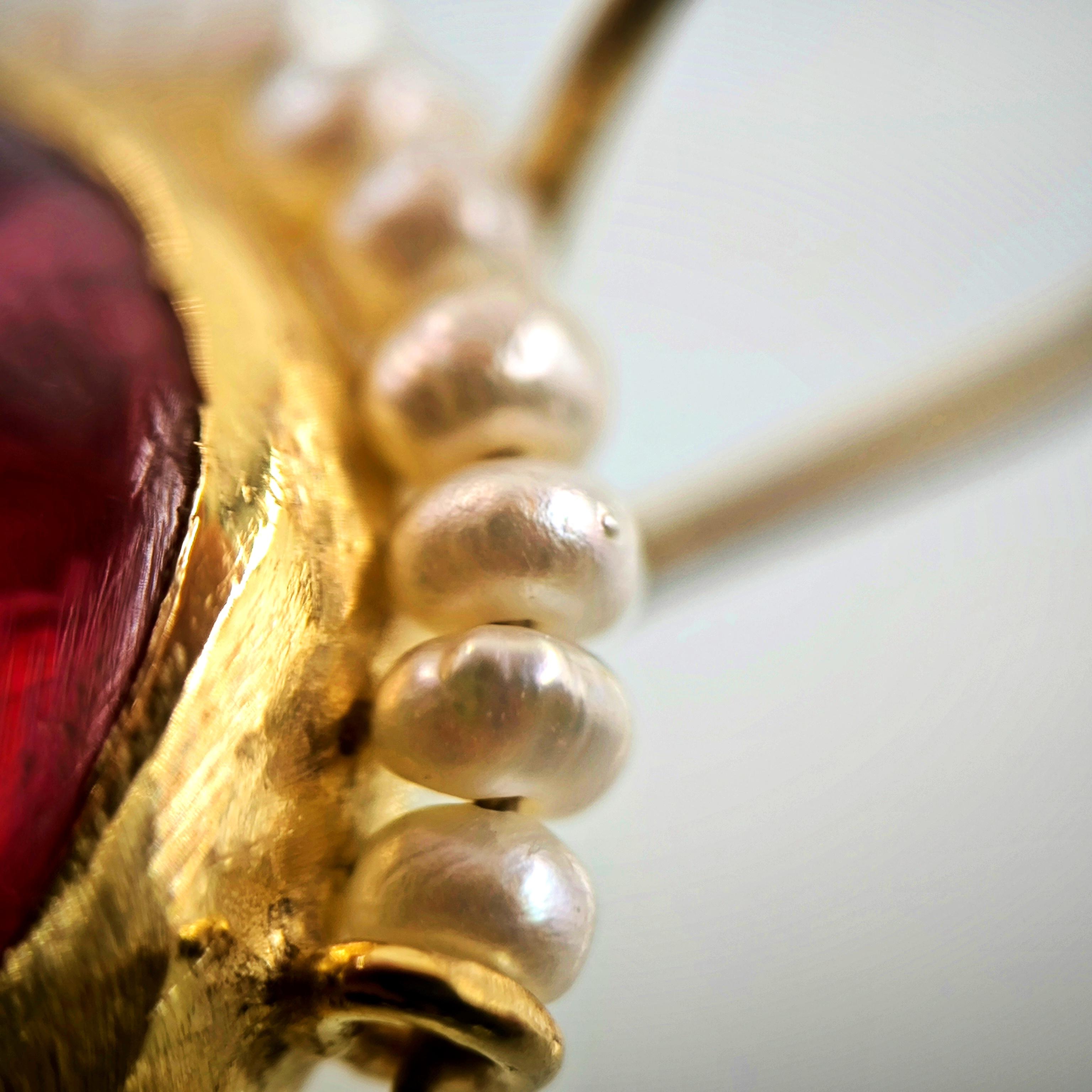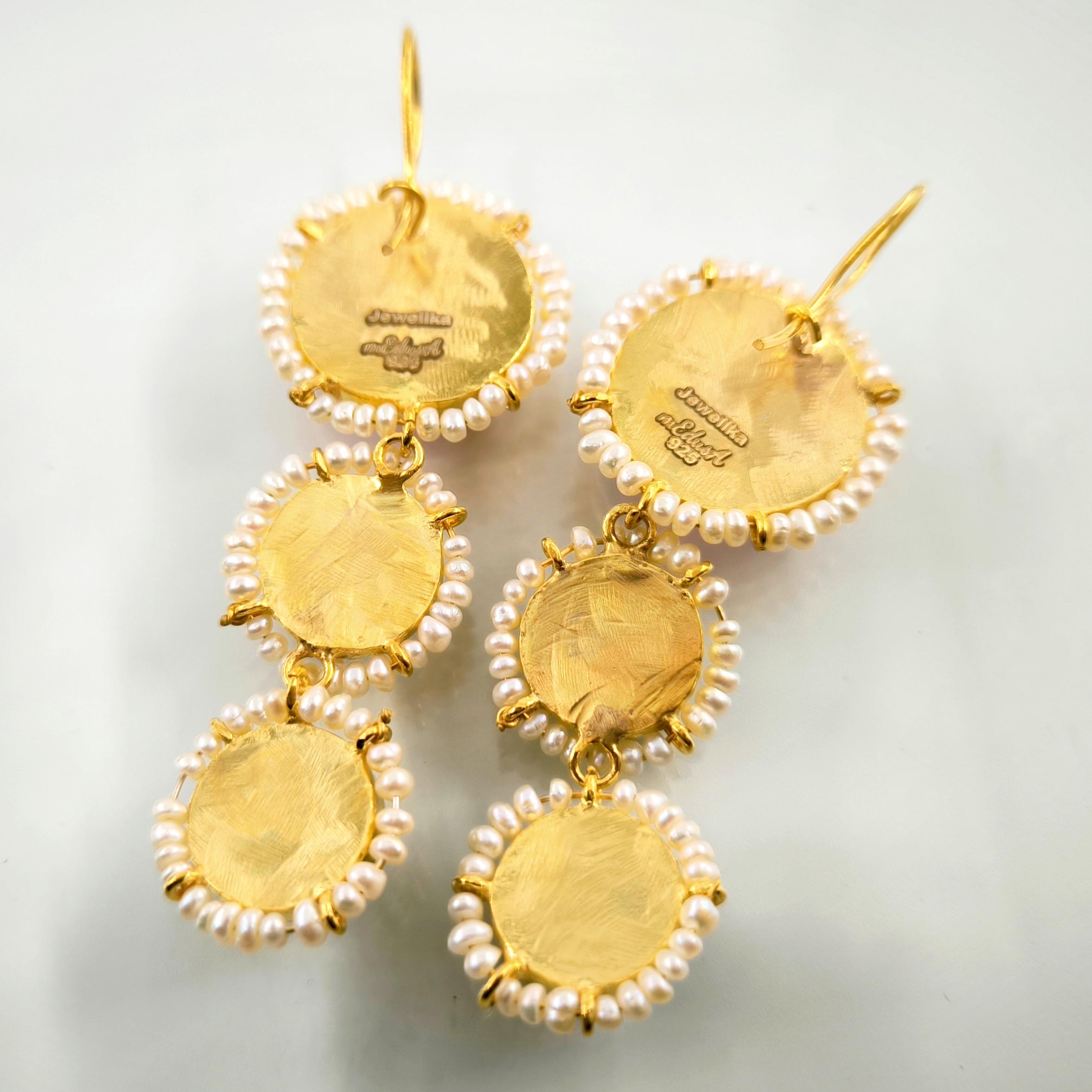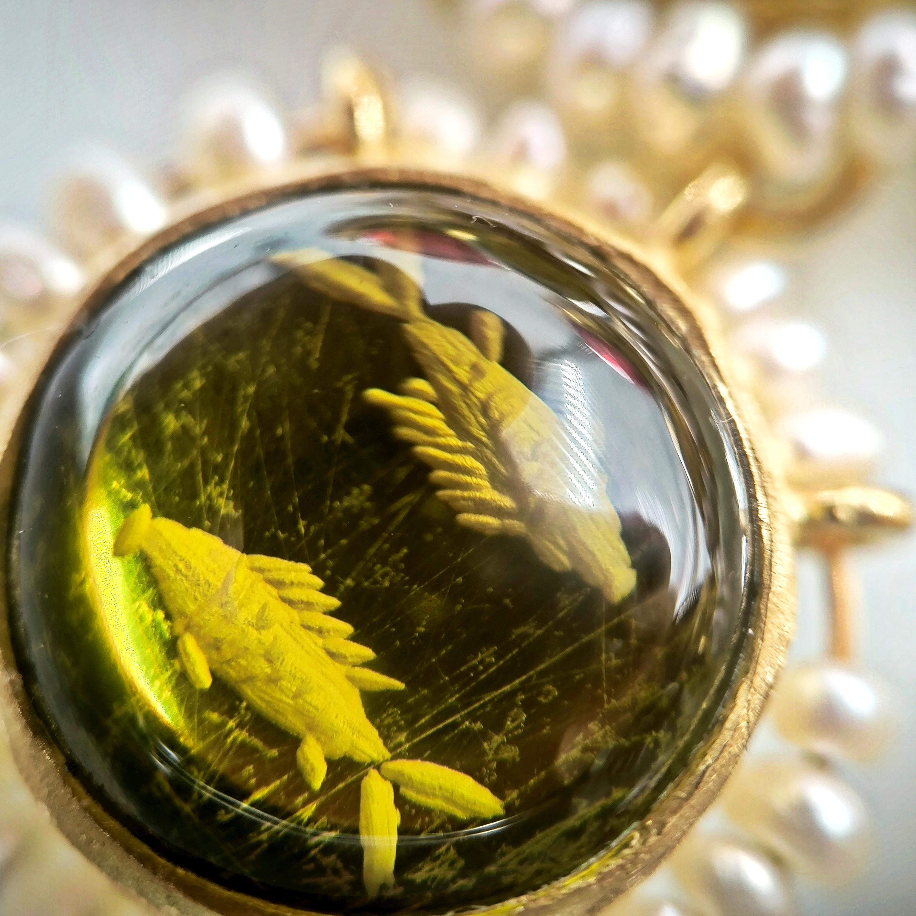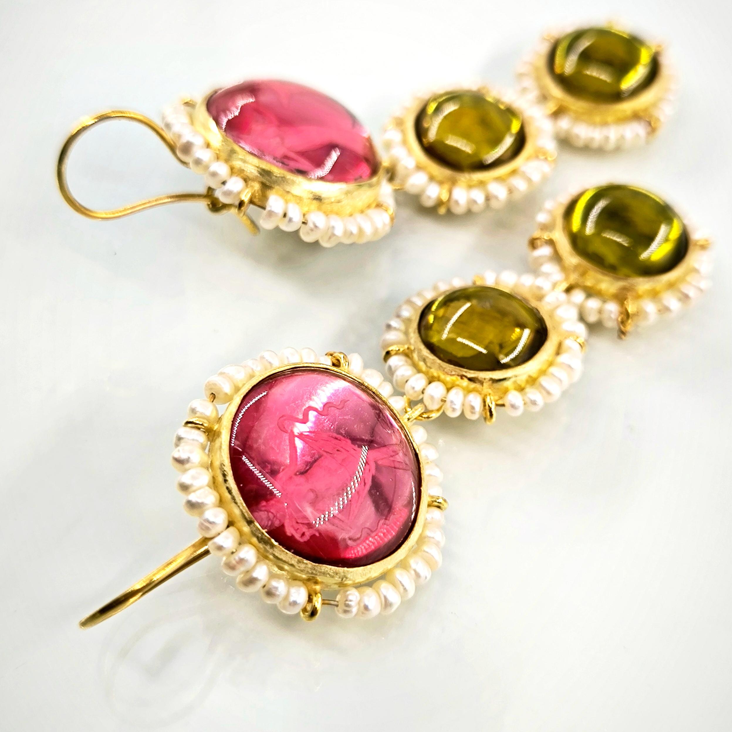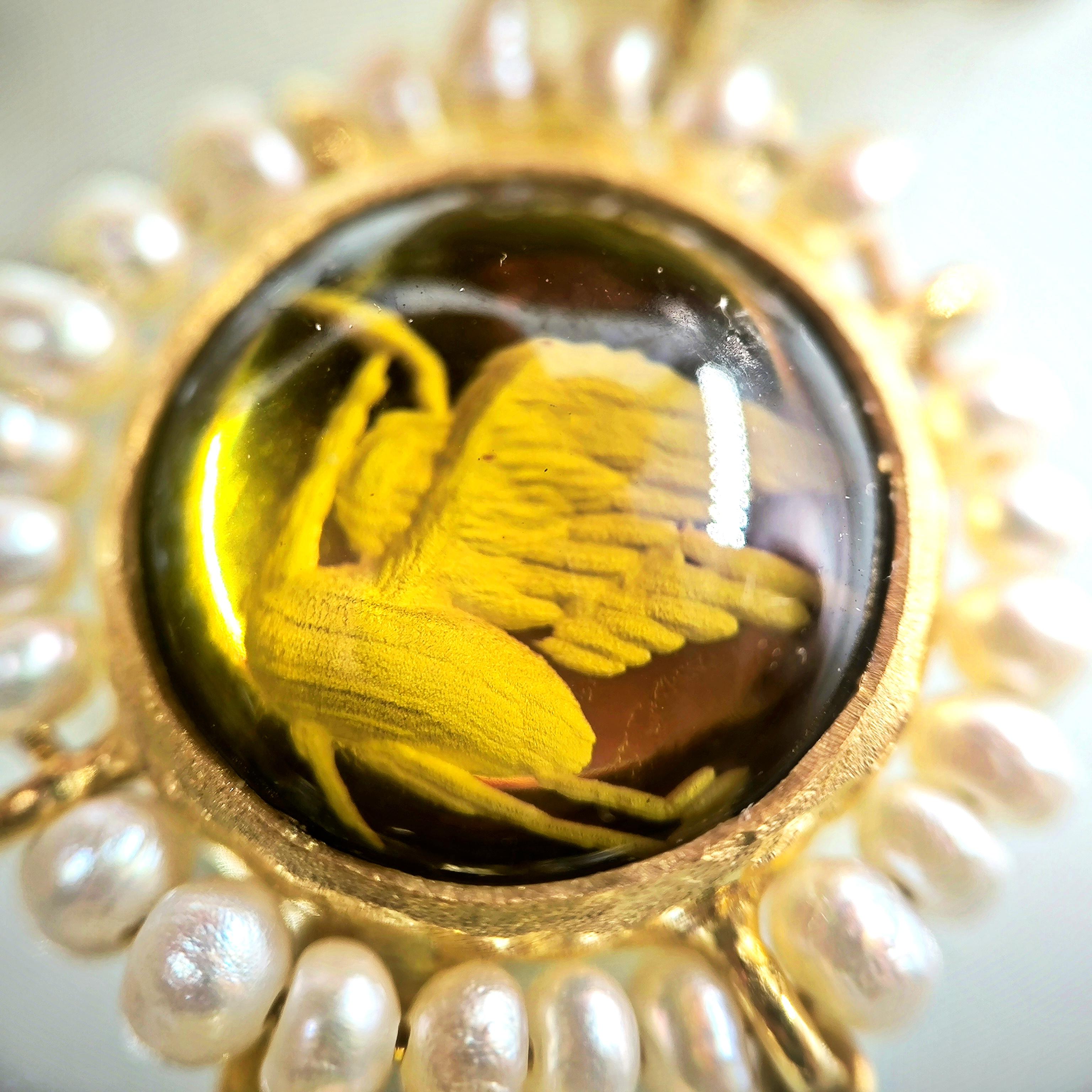Üst düzey Bir ''mEdusA'' eseri! Sentetik (Lab.) Kehribar taşlar üzeri negatif intaglio'lar çalıştığımız, (Tanrıçalar, balıklar ve Anka kuşlar) etrafını natürel okyanus incileri ile süslediğimiz komple 925 Ayar Gümüş & üzeri 22 K altın kaplama Antik ve Gotik stilde küpelerimiz!