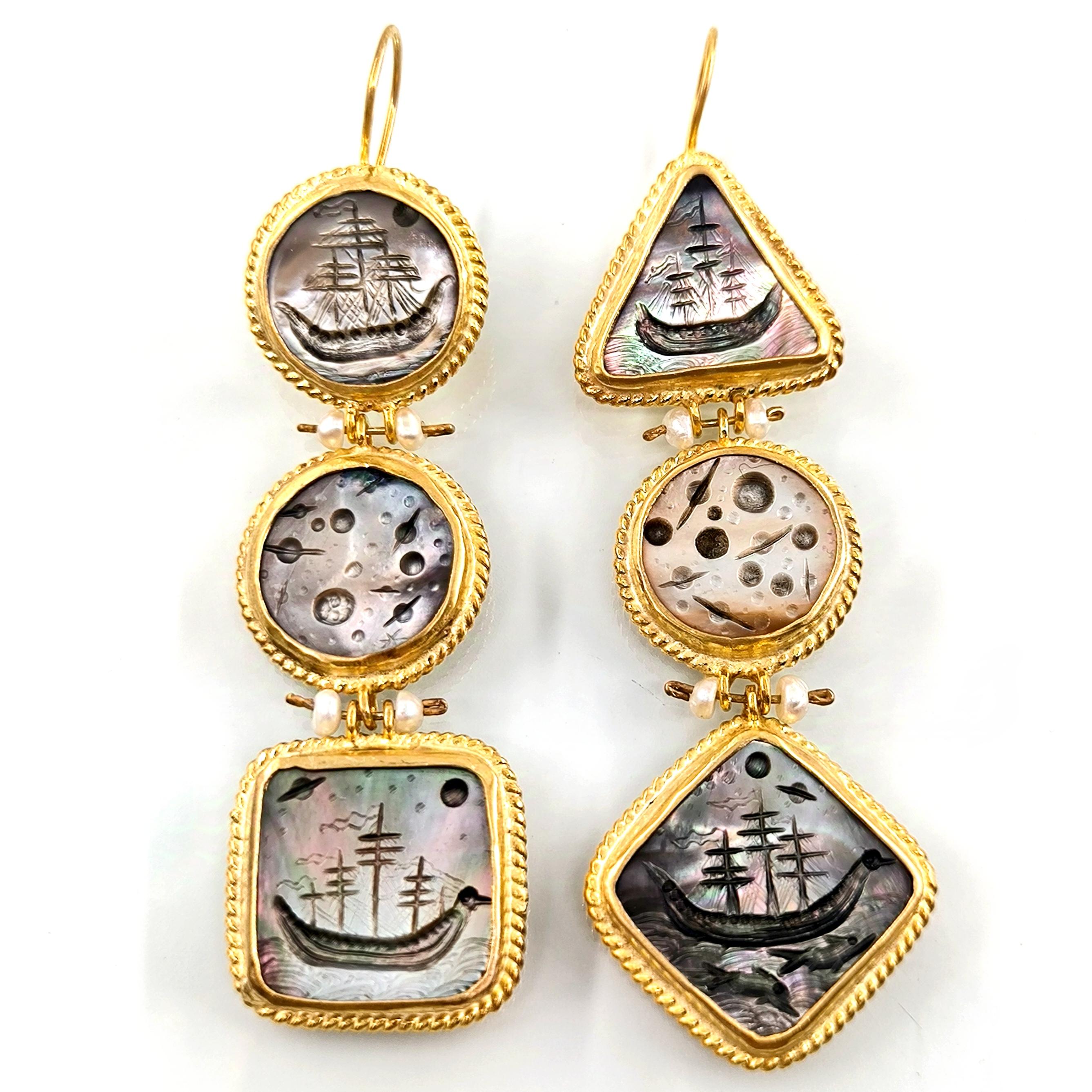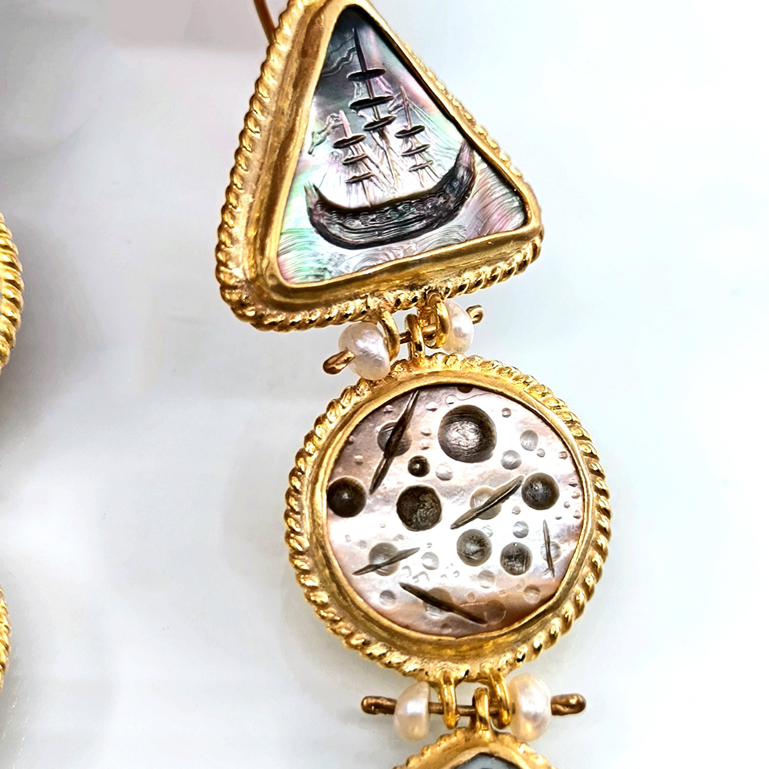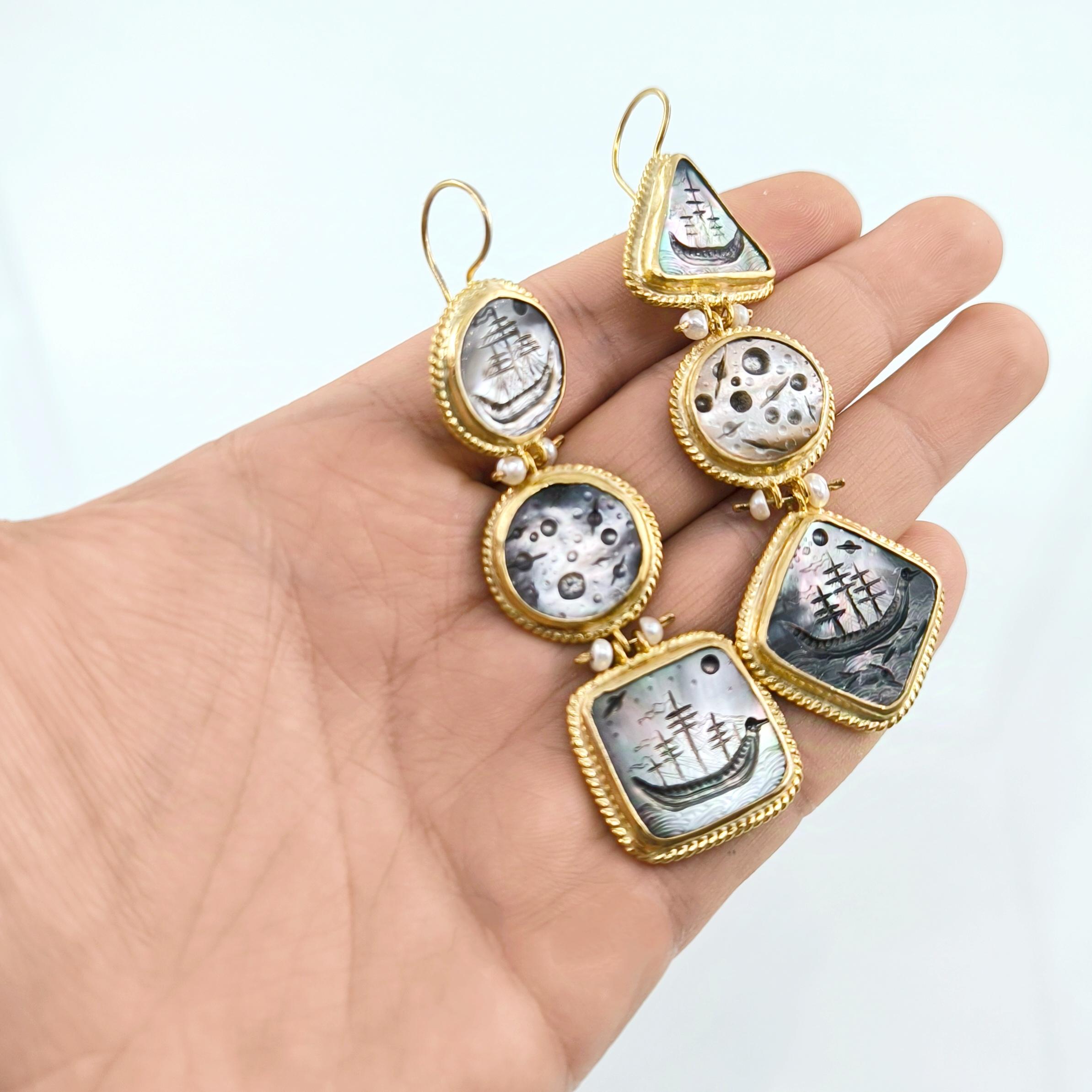 Antik dünyanın en hırçın ve güçlü savaşçıları Kuzey İskandinavya'lı Vikingler! Renkli sedefler üzerine Viking savaş gemileri ve onların günlerce okyanusta gece gökyüzü ışığında ilerleyen ruhlarını yansıttığımız, incilerle süslü tamamı gümüş ve üzeri altın kaplama viking küpelerimiz!!