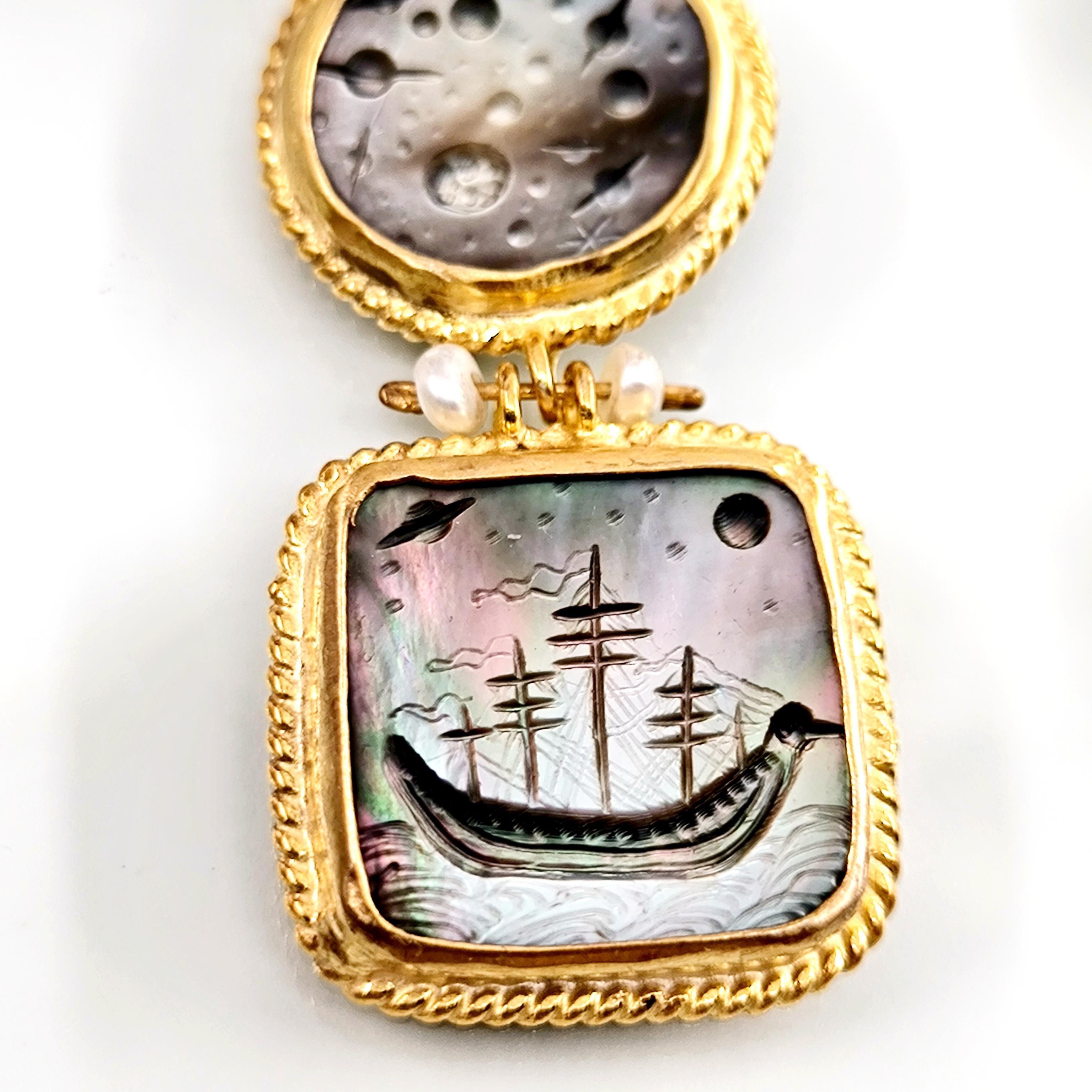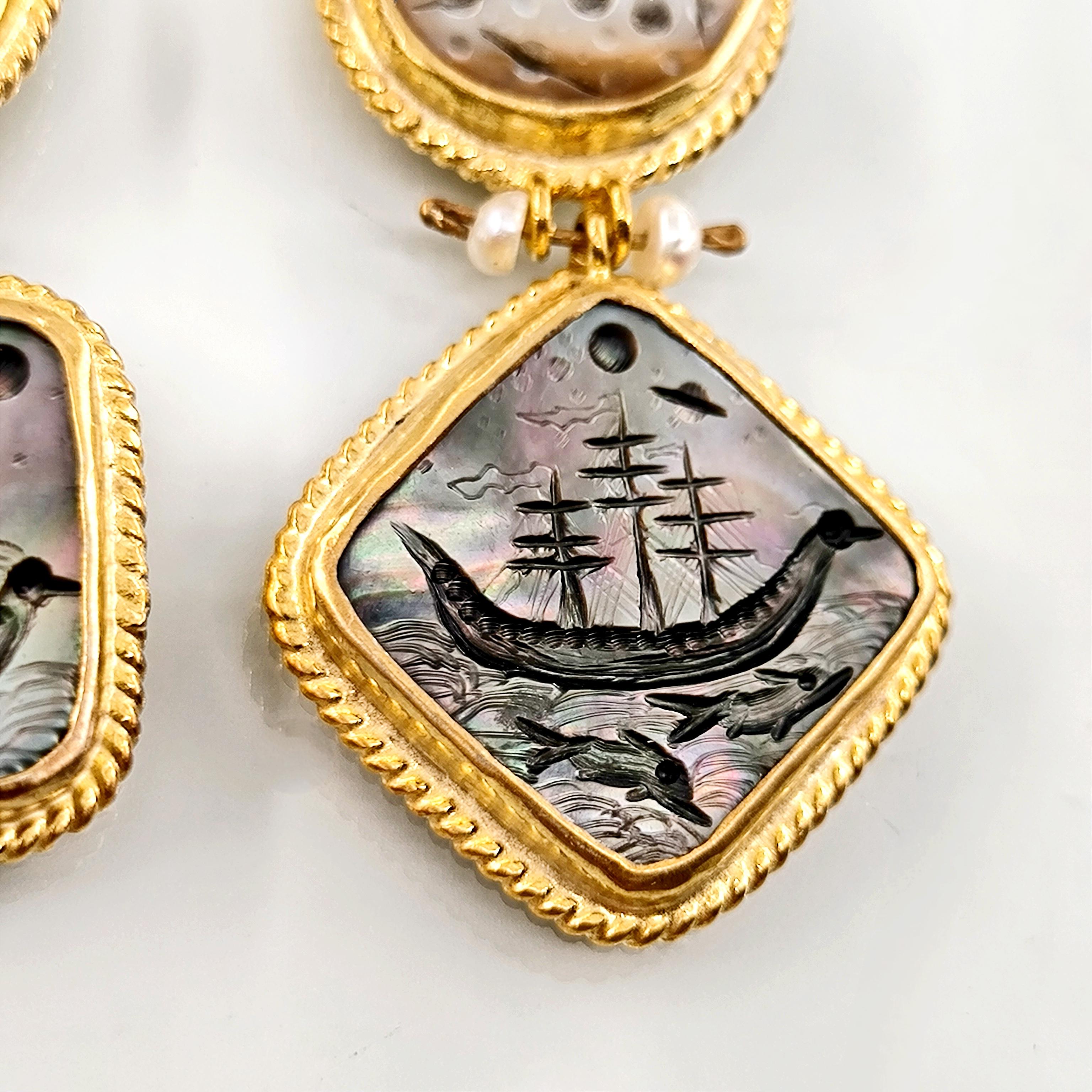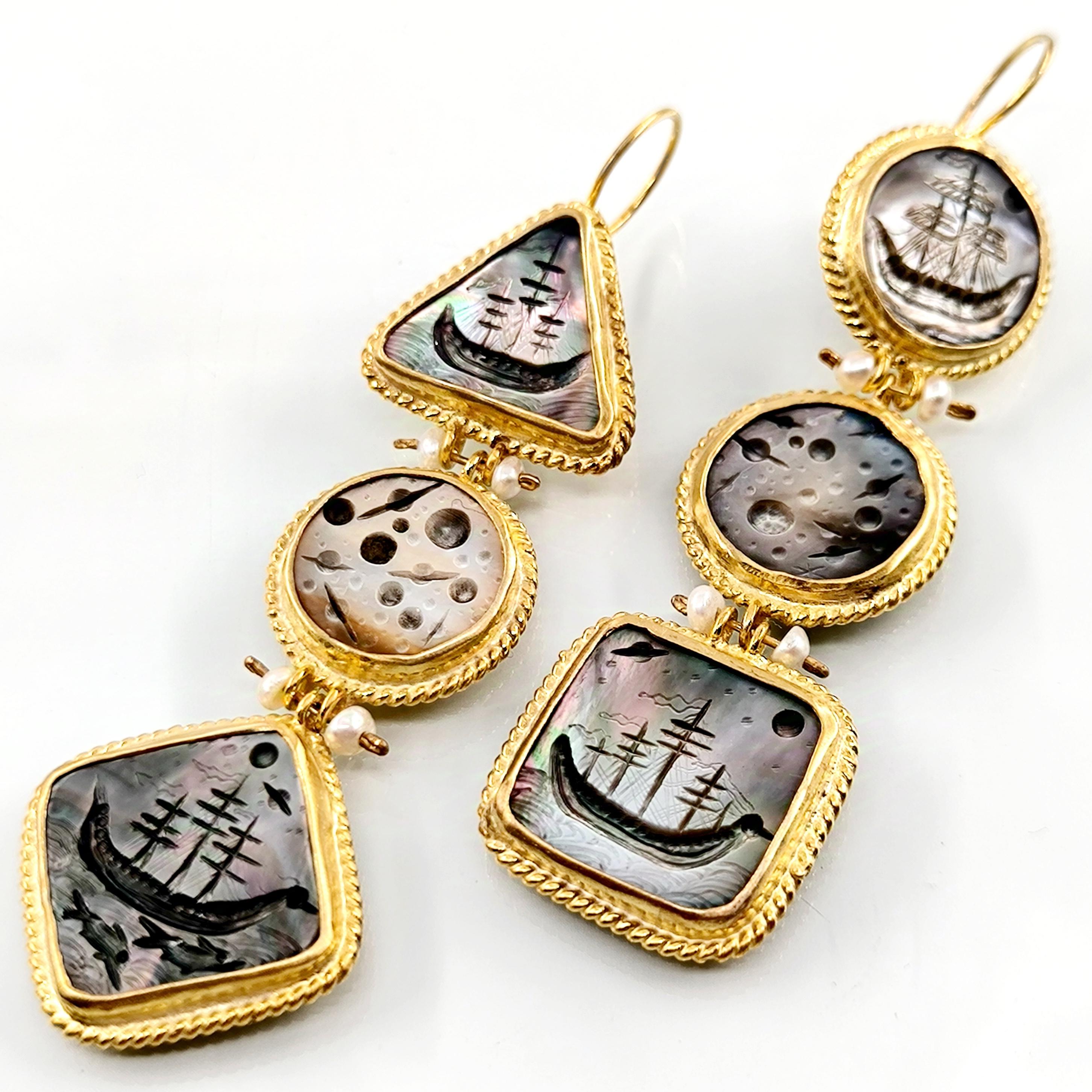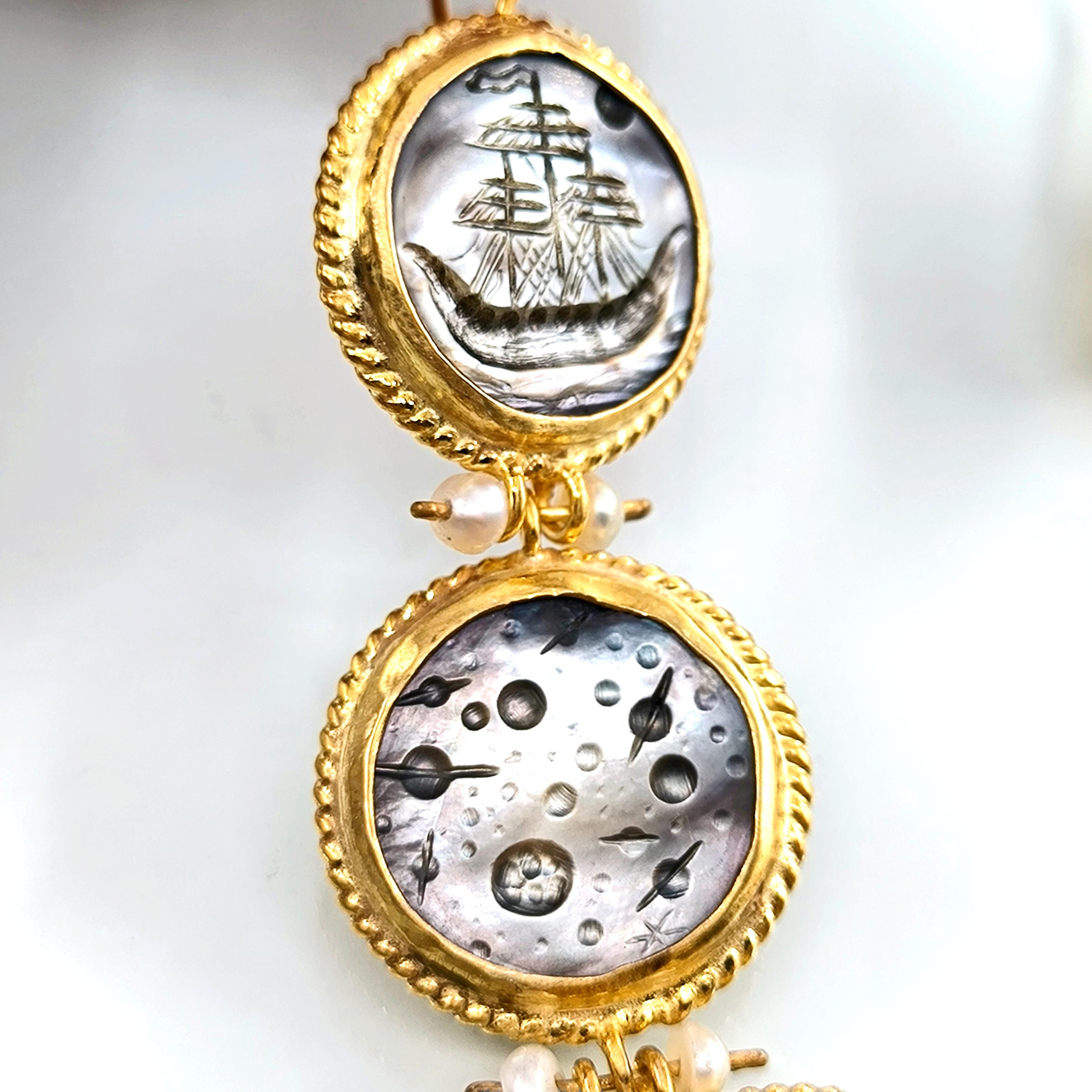 Antik dünyanın en hırçın ve güçlü savaşçıları Kuzey İskandinavya'lı Vikingler! Renkli sedefler üzerine Viking savaş gemileri ve onların günlerce okyanusta gece gökyüzü ışığında ilerleyen ruhlarını yansıttığımız, incilerle süslü tamamı gümüş ve üzeri altın kaplama viking küpelerimiz!!