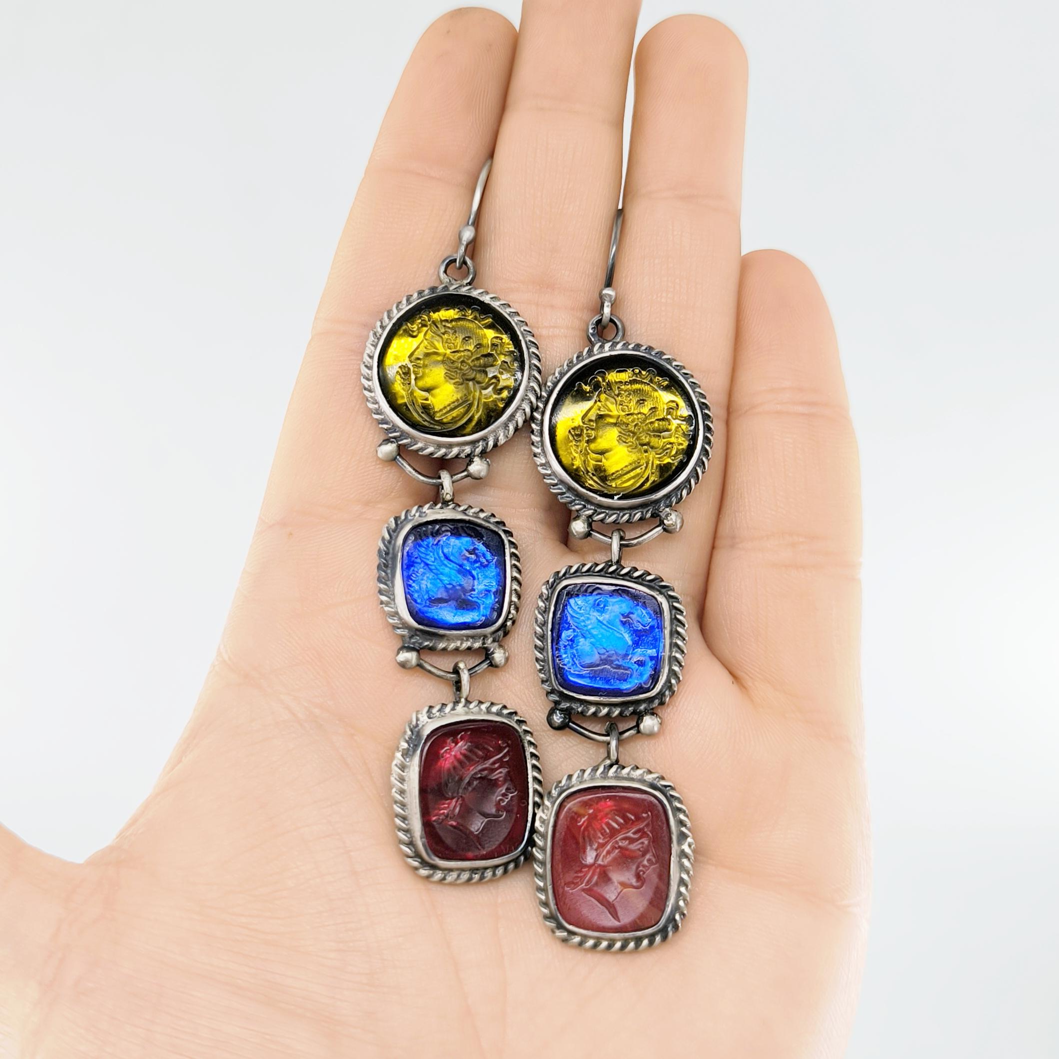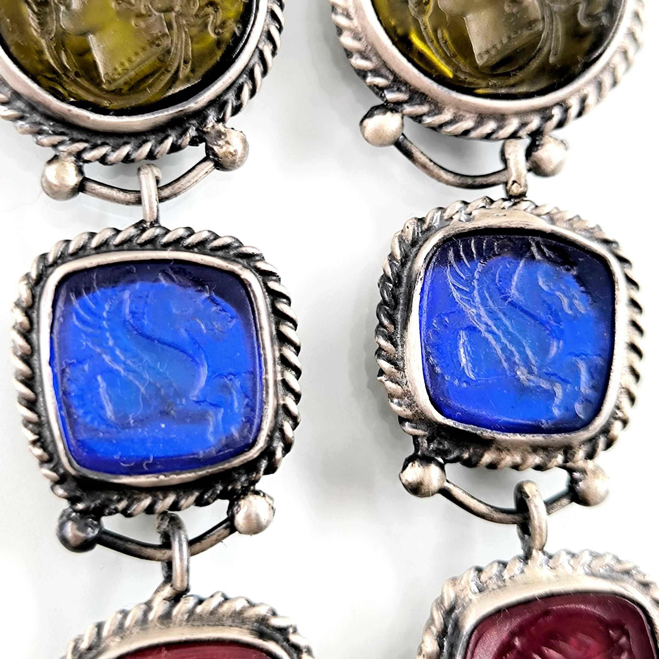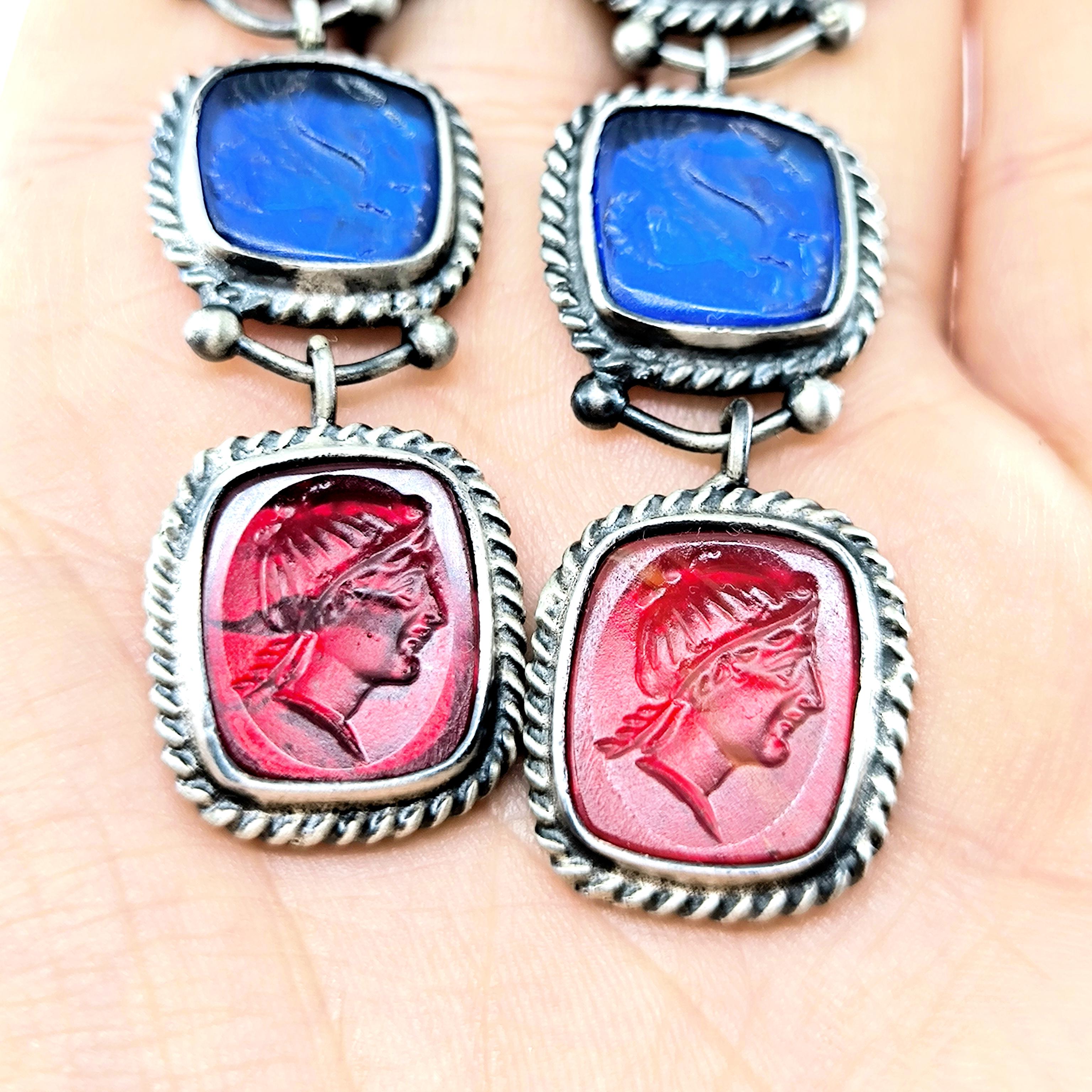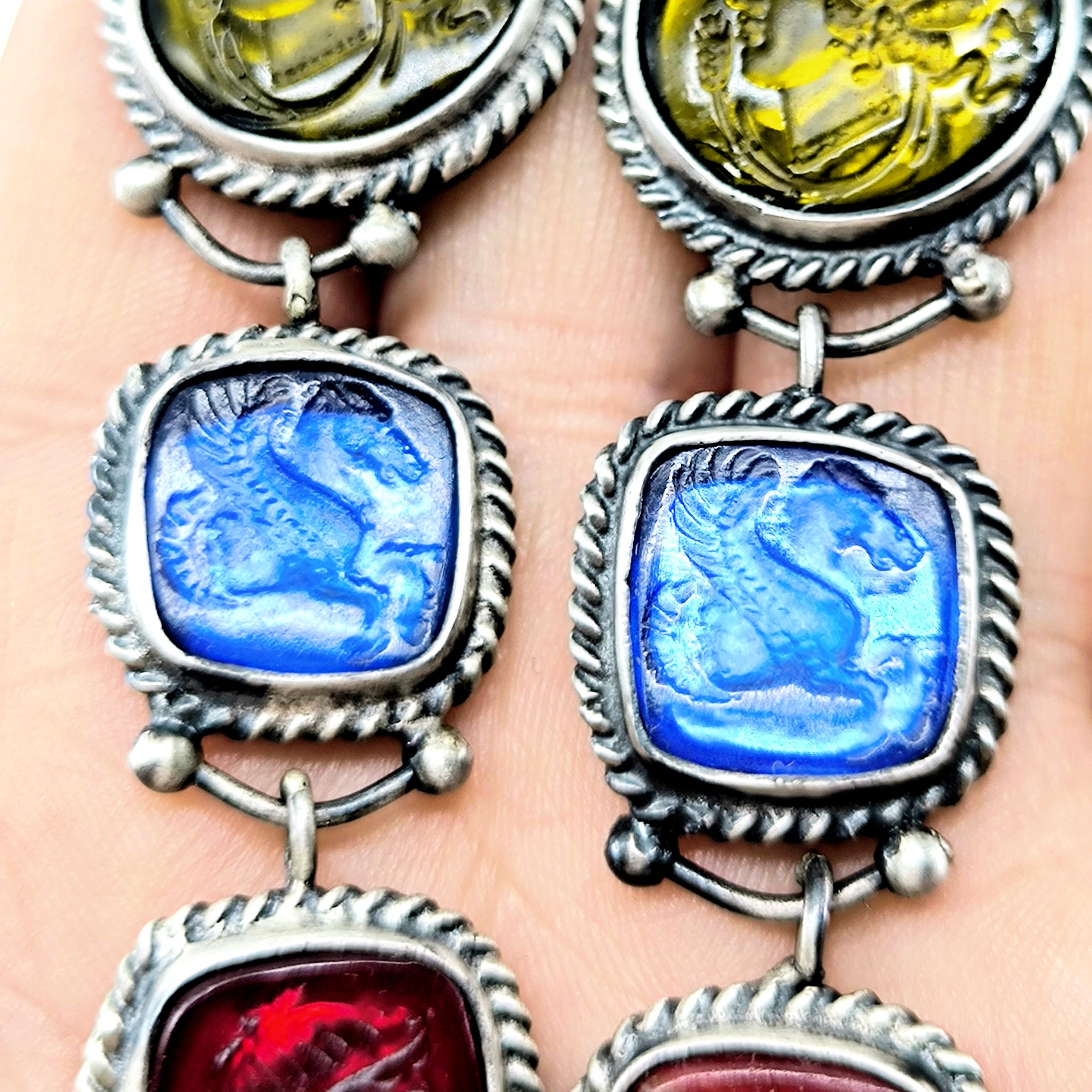 Antik efsaneler, kaderin üç güç tarafından şekillendiğini söyler: Helen’in güzelliği ve büyüleyici cazibesi, Pegasus’un göklere uzanan özgürlüğü ve Roma şövalyesinin sarsılmaz cesareti. Yeşilin bilgelik ve doğuşu, mavinin ruhun derinliği ve kırmızının tutku ateşi bir araya geldiğinde, zamanın ötesinden gelen bir denge doğar. Cam taşların üzerine oyulan bu figürler, her bakışta mitlerin fısıltılarını bugüne taşıyan güçlü sembollerdir. Arkalarına yerleştirilen özel folyo taban, ışığı çoğaltarak janjanlı, göz kamaştırıcı bir yansıma etkisi yaratır; renkler adeta içten parlayarak hareket eder. 925 ayar gümüş sallantılı tasarım, modern zarafeti kadim bir ruhla buluşturan tek ve özel bir koleksiyon parçasıdır.