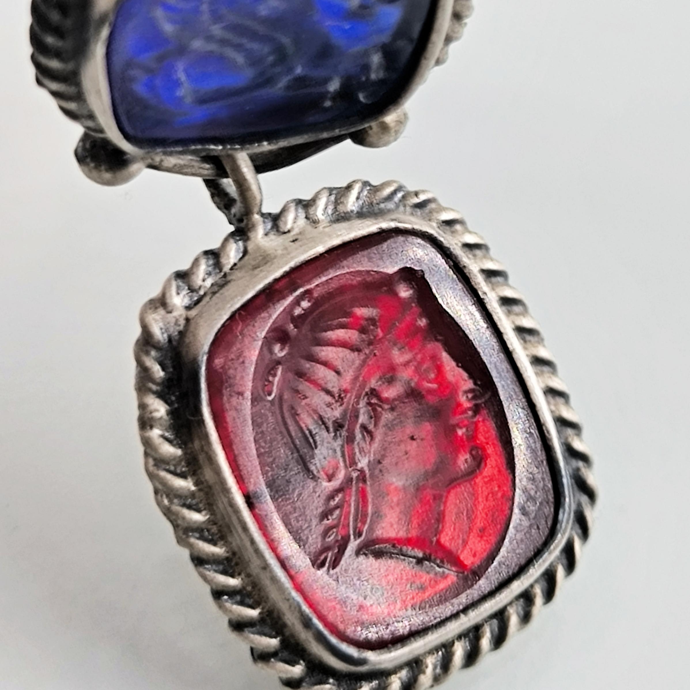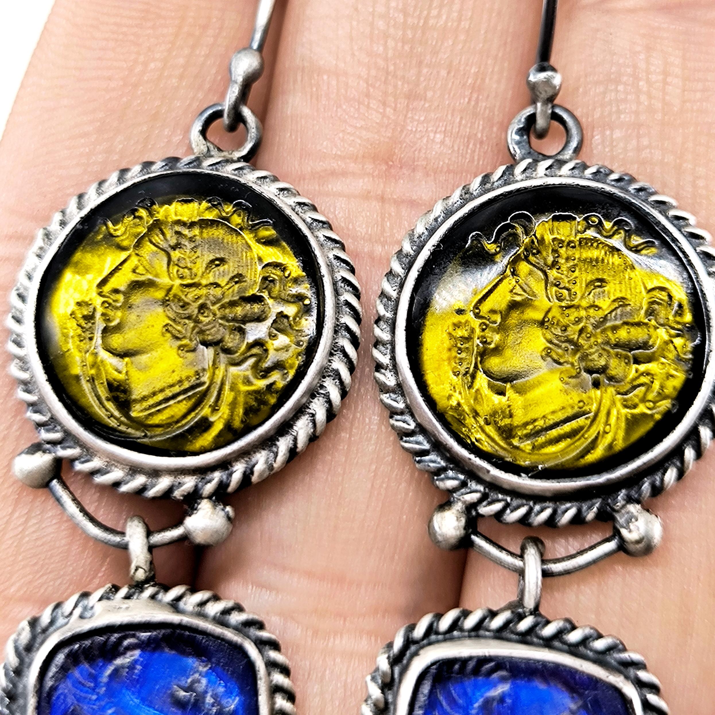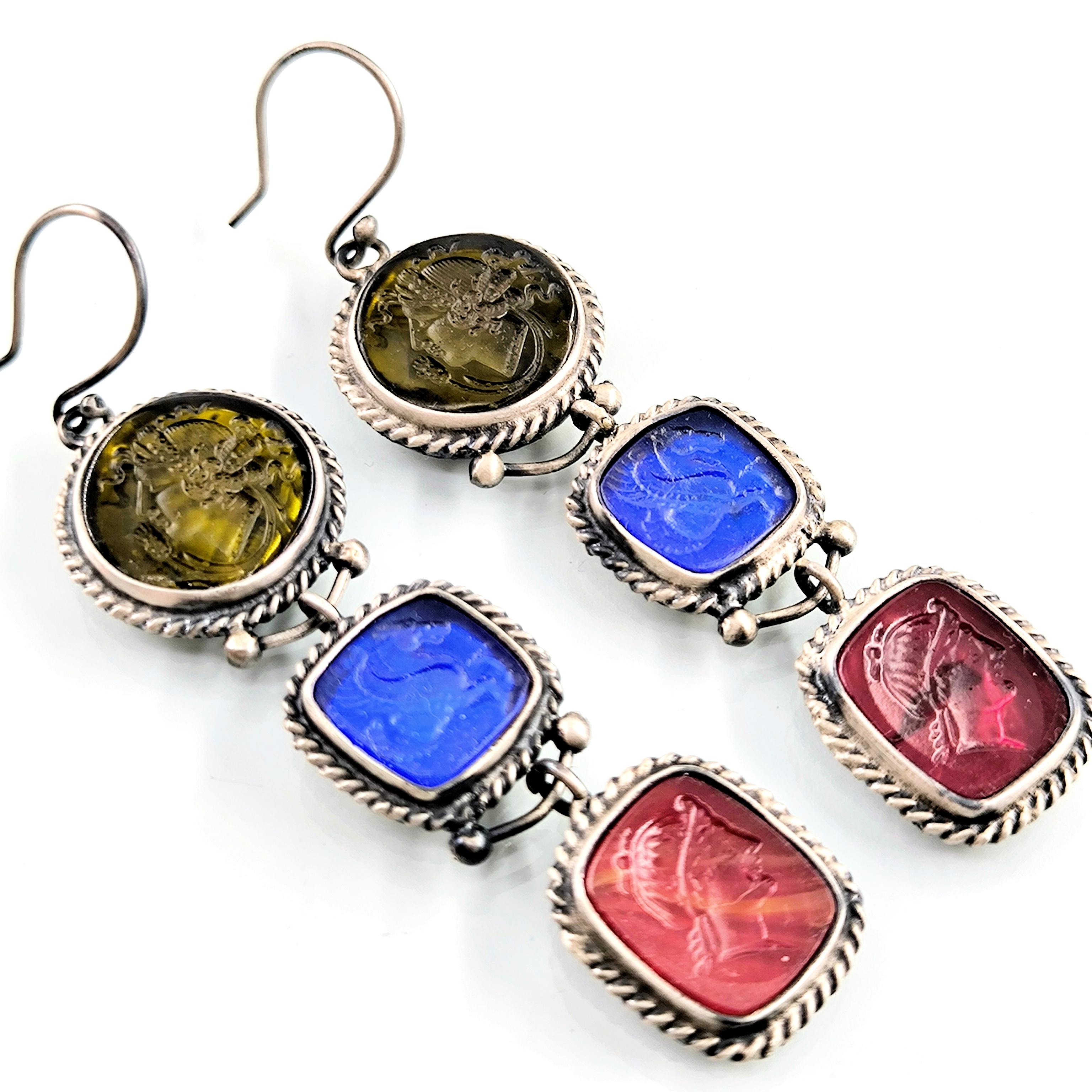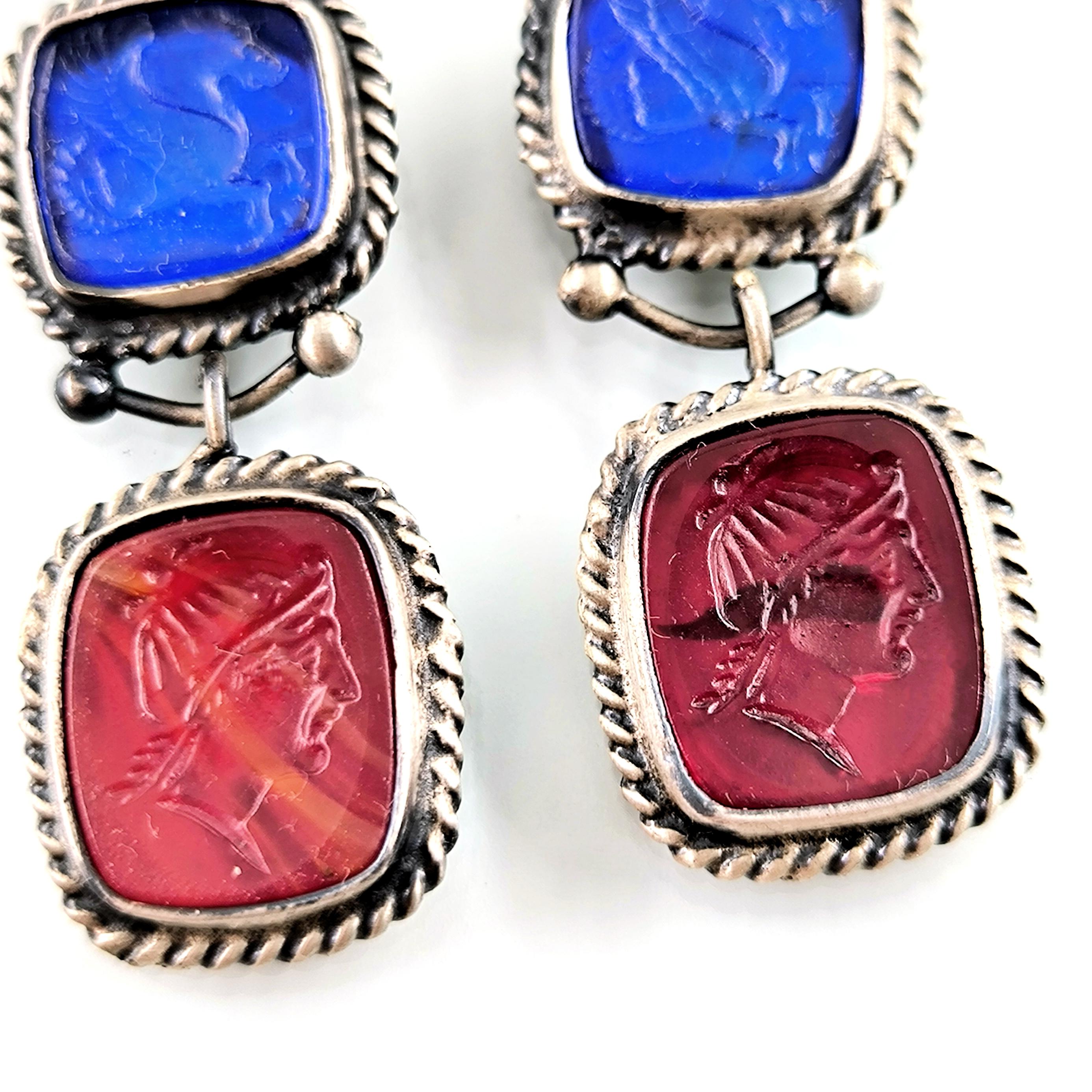 Antik efsaneler, kaderin üç güç tarafından şekillendiğini söyler: Helen’in güzelliği ve büyüleyici cazibesi, Pegasus’un göklere uzanan özgürlüğü ve Roma şövalyesinin sarsılmaz cesareti. Yeşilin bilgelik ve doğuşu, mavinin ruhun derinliği ve kırmızının tutku ateşi bir araya geldiğinde, zamanın ötesinden gelen bir denge doğar. Cam taşların üzerine oyulan bu figürler, her bakışta mitlerin fısıltılarını bugüne taşıyan güçlü sembollerdir. Arkalarına yerleştirilen özel folyo taban, ışığı çoğaltarak janjanlı, göz kamaştırıcı bir yansıma etkisi yaratır; renkler adeta içten parlayarak hareket eder. 925 ayar gümüş sallantılı tasarım, modern zarafeti kadim bir ruhla buluşturan tek ve özel bir koleksiyon parçasıdır.