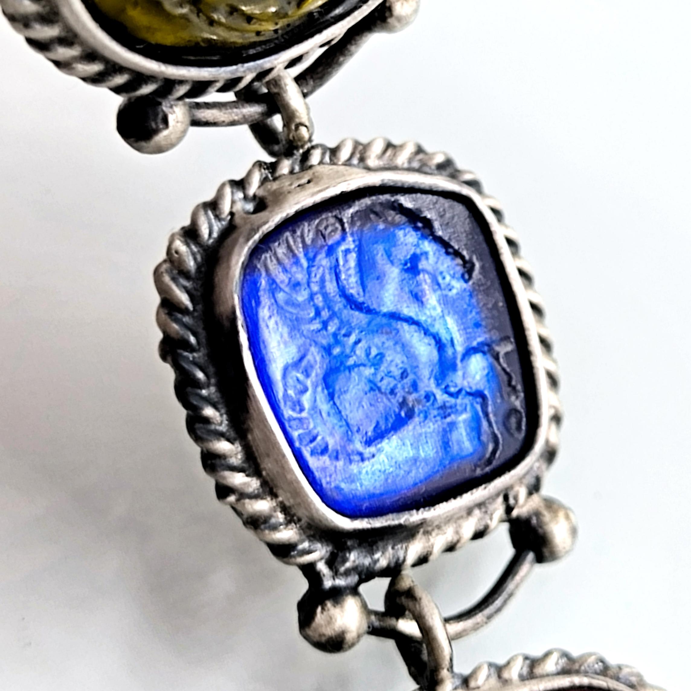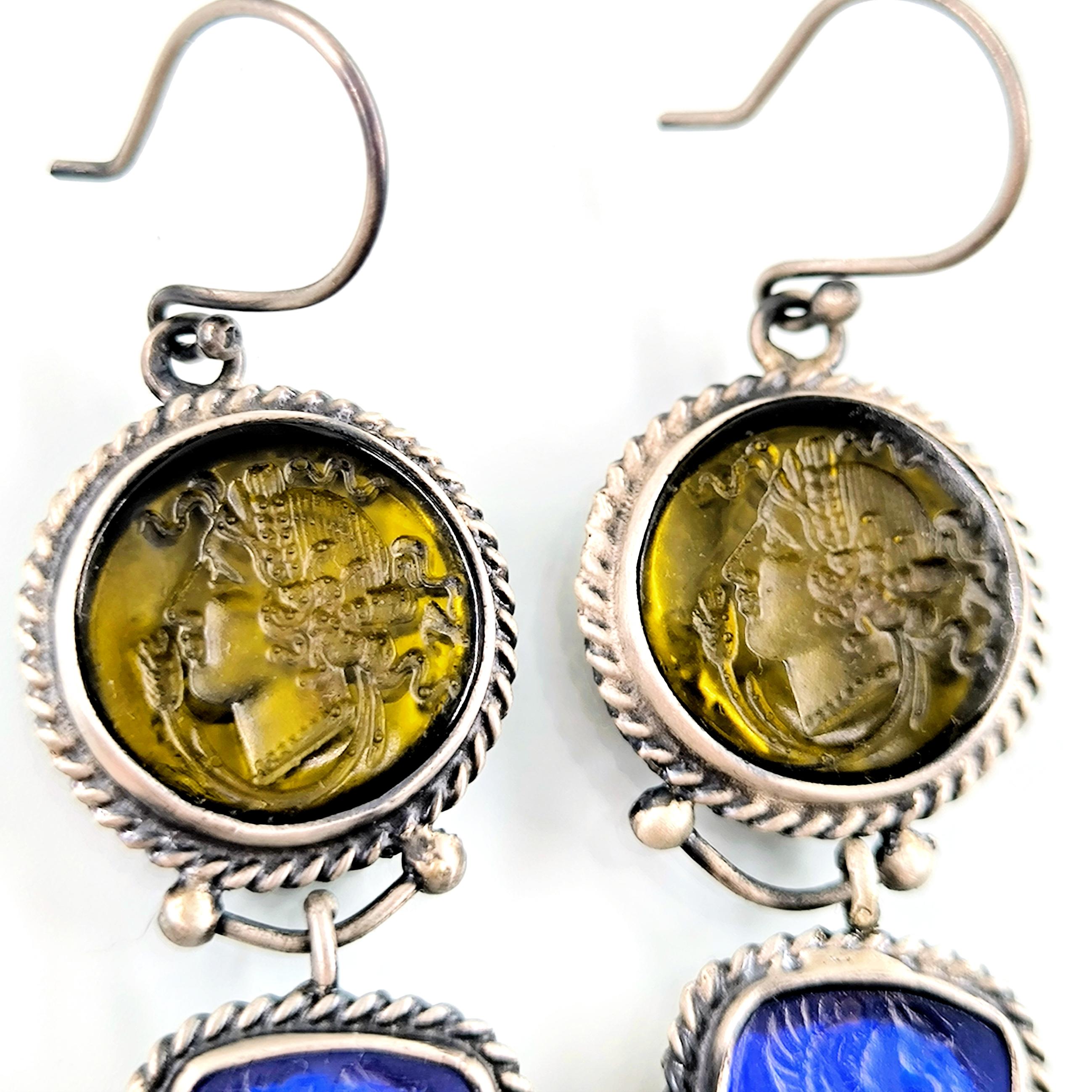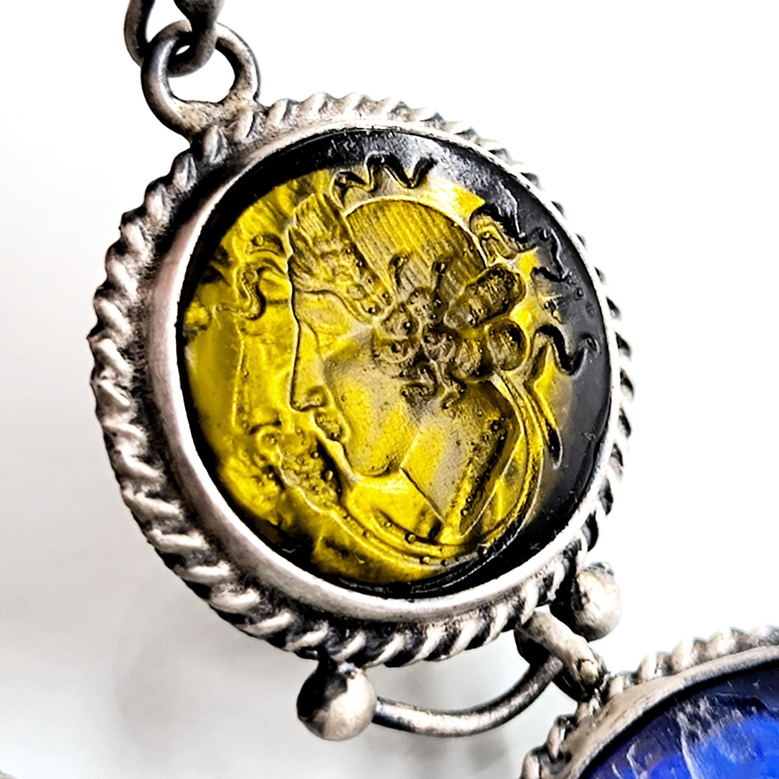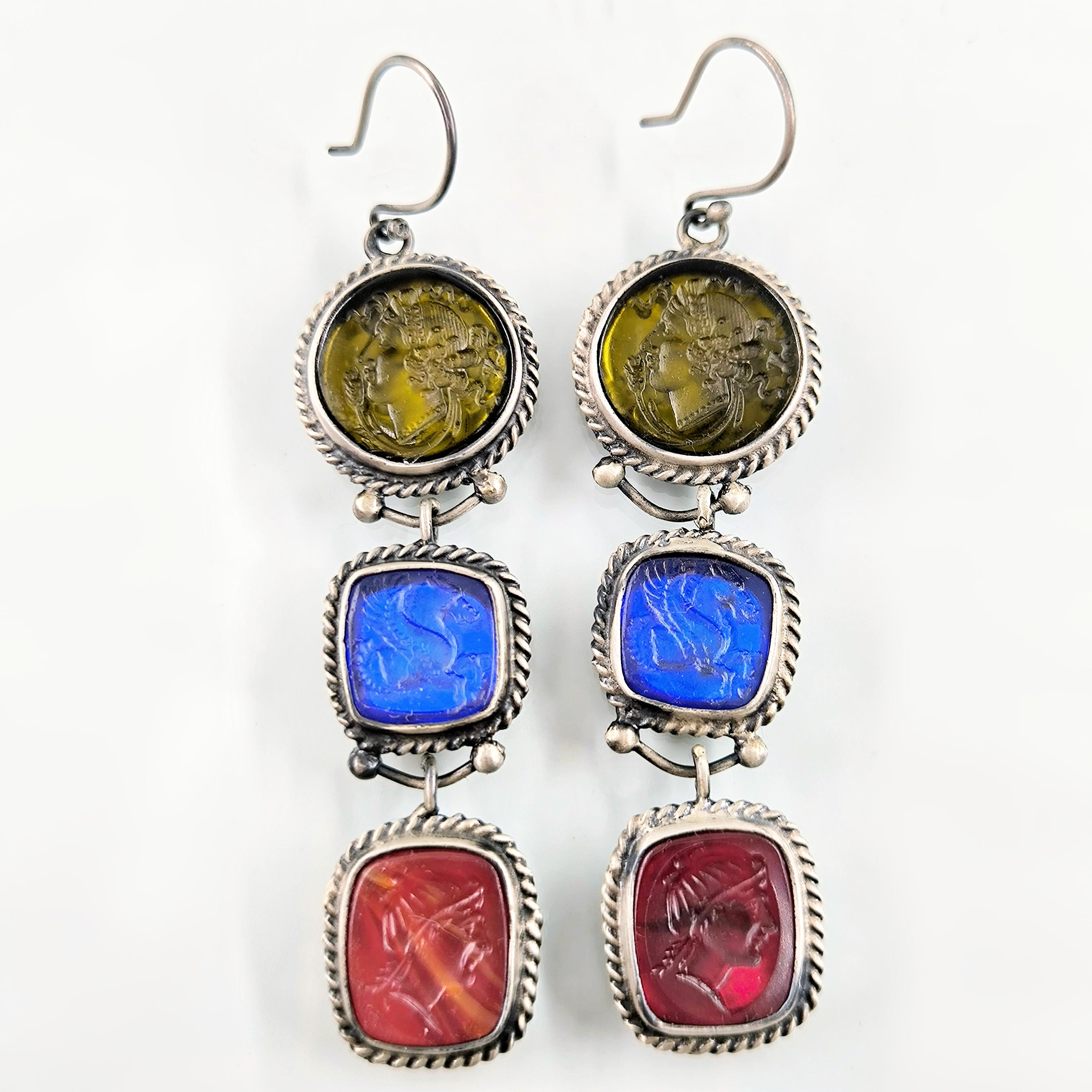Antik efsaneler, kaderin üç güç tarafından şekillendiğini söyler: Helen’in güzelliği ve büyüleyici cazibesi, Pegasus’un göklere uzanan özgürlüğü ve Roma şövalyesinin sarsılmaz cesareti. Yeşilin bilgelik ve doğuşu, mavinin ruhun derinliği ve kırmızının tutku ateşi bir araya geldiğinde, zamanın ötesinden gelen bir denge doğar. Cam taşların üzerine oyulan bu figürler, her bakışta mitlerin fısıltılarını bugüne taşıyan güçlü sembollerdir. Arkalarına yerleştirilen özel folyo taban, ışığı çoğaltarak janjanlı, göz kamaştırıcı bir yansıma etkisi yaratır; renkler adeta içten parlayarak hareket eder. 925 ayar gümüş sallantılı tasarım, modern zarafeti kadim bir ruhla buluşturan tek ve özel bir koleksiyon parçasıdır.