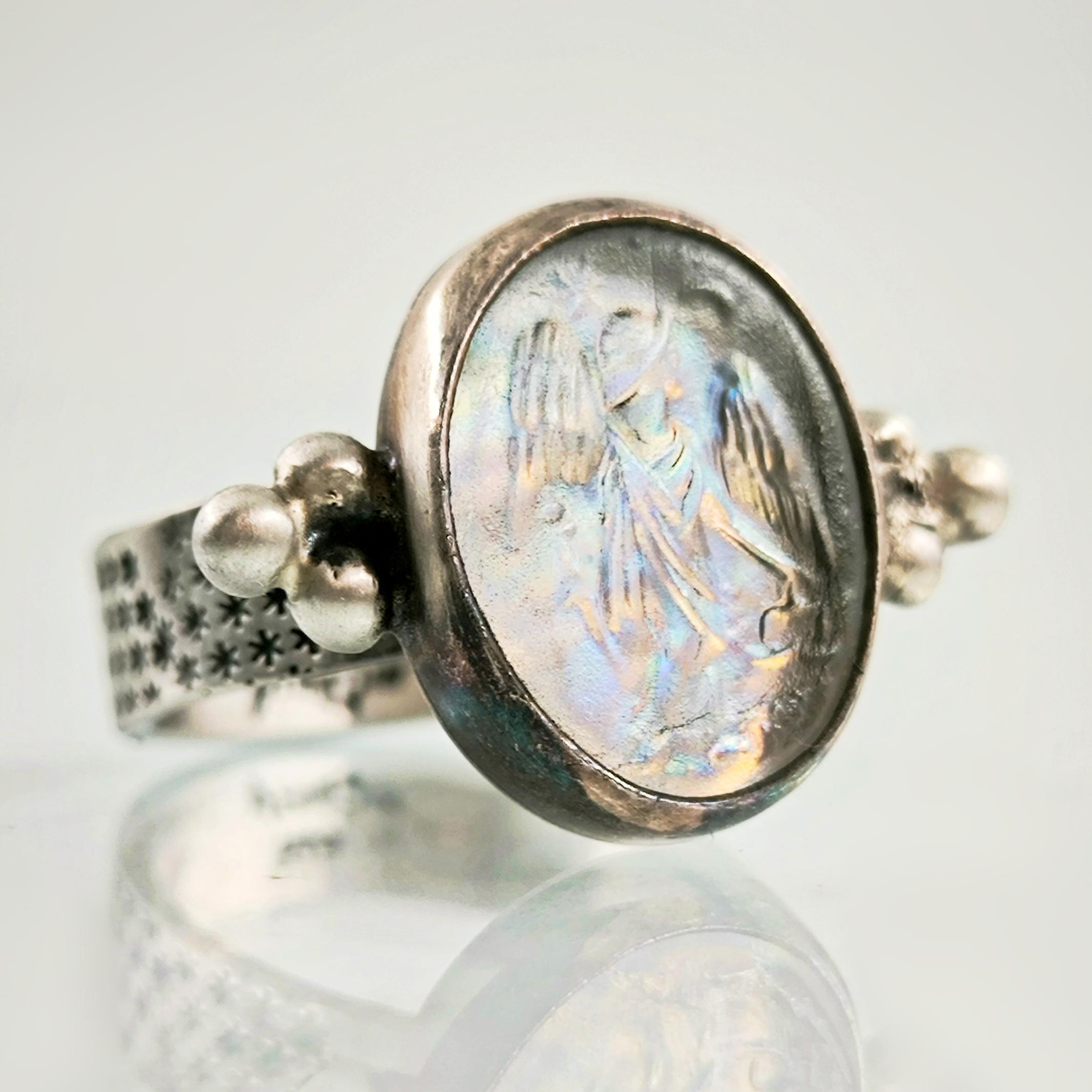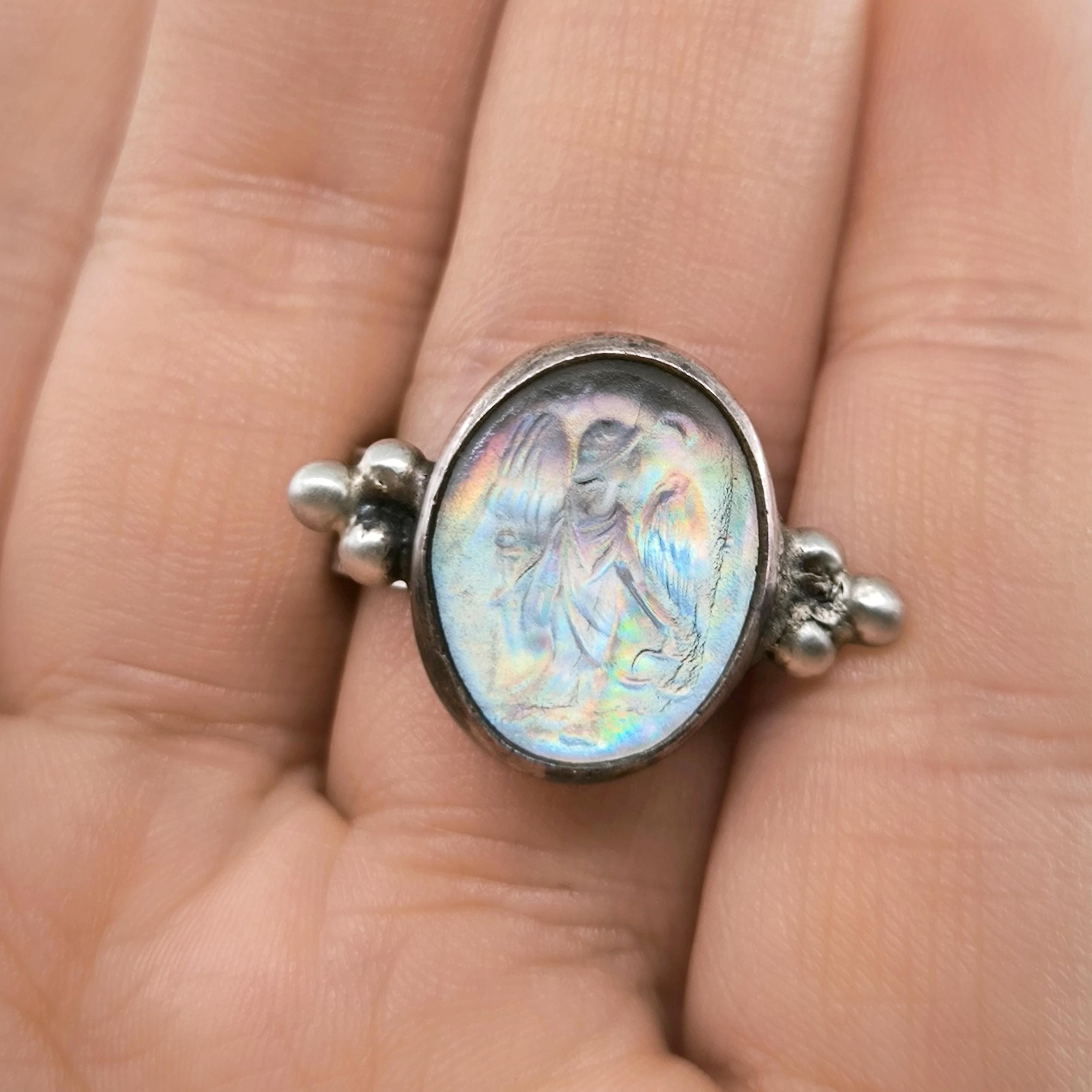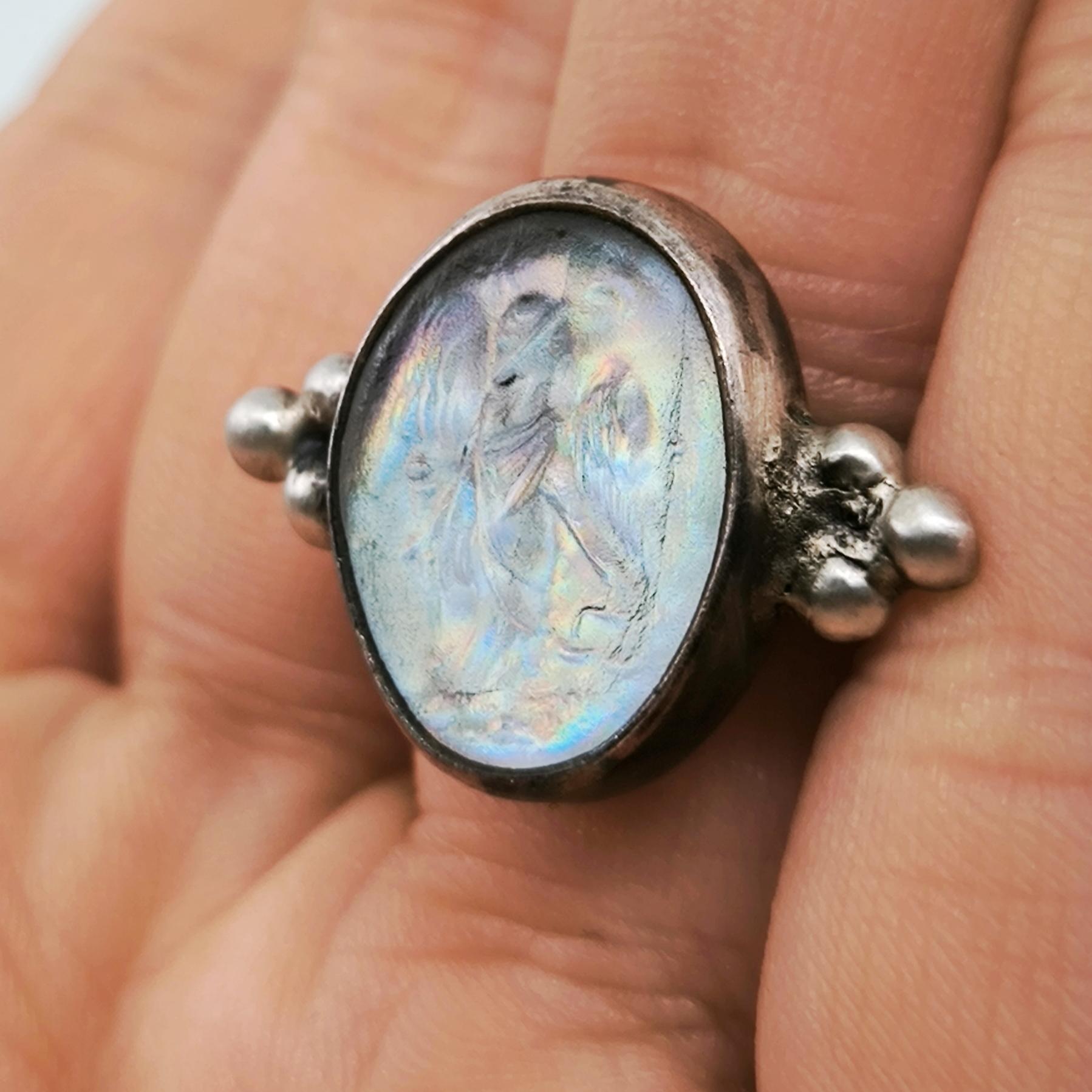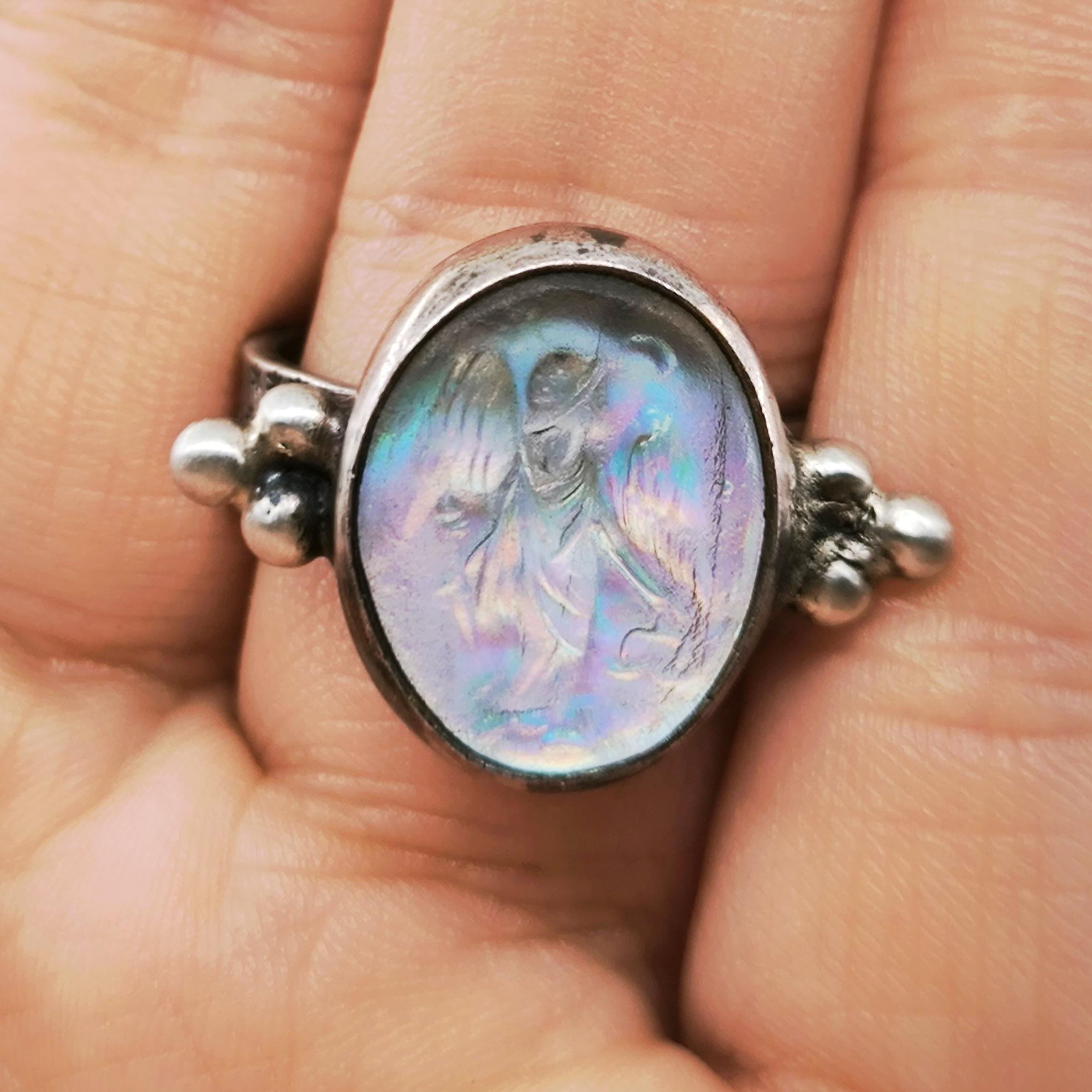 925 ayar gümüşten ustalıkla işlenmiş bu yüzük, şeffaf cam üzerine kabartma tekniğiyle işlenmiş kadim bir kanatlı tanrıça figürü taşır. Altına yerleştirilen holografik folyo, tıpkı opal taşların ışık oyunları gibi her açıdan farklı renkler yansıtır. Antik çağın mistik ruhunu modern bir dokunuşla buluşturan bu parça, hem tarihsel hem de sanatsal bir değere sahiptir.