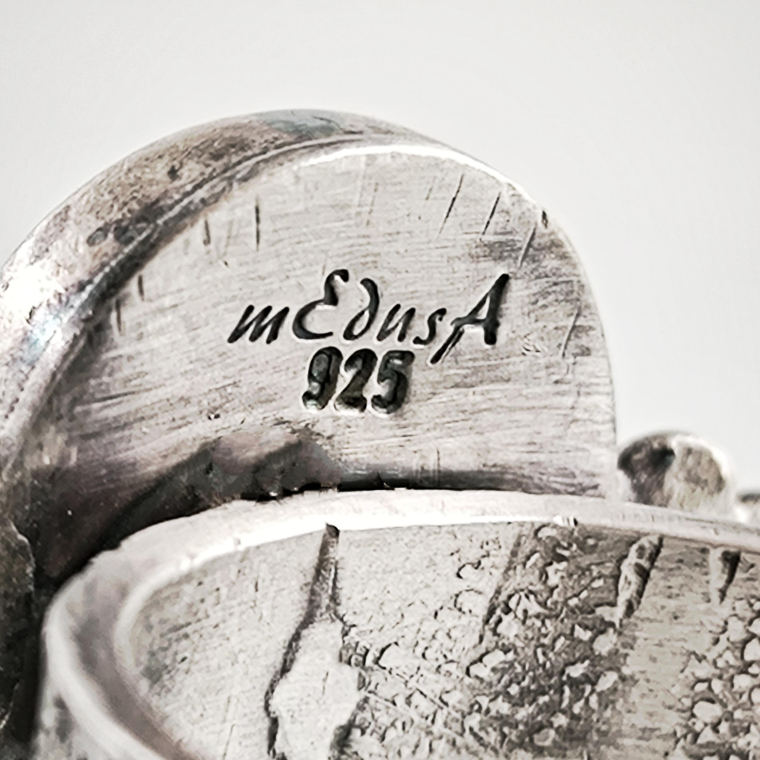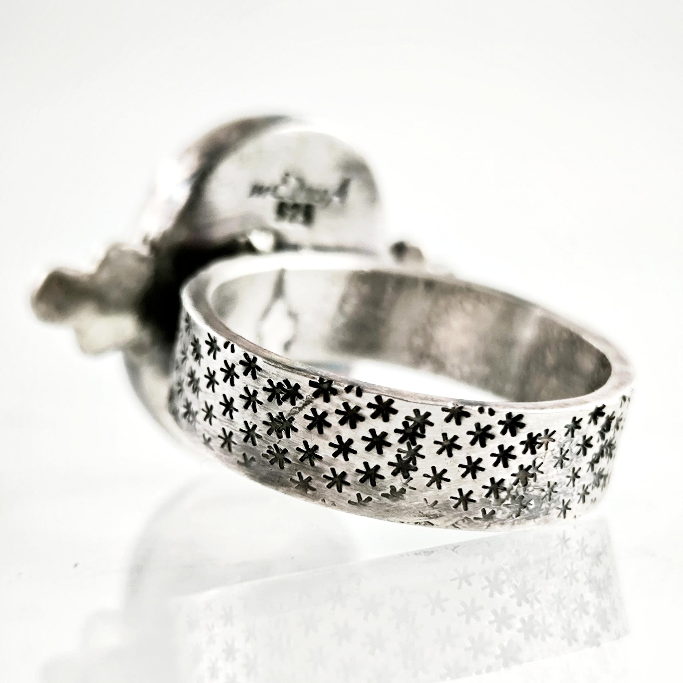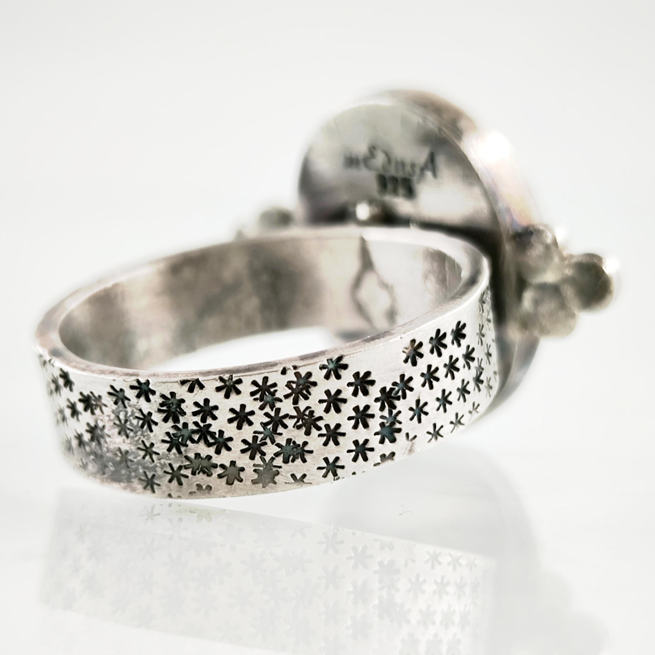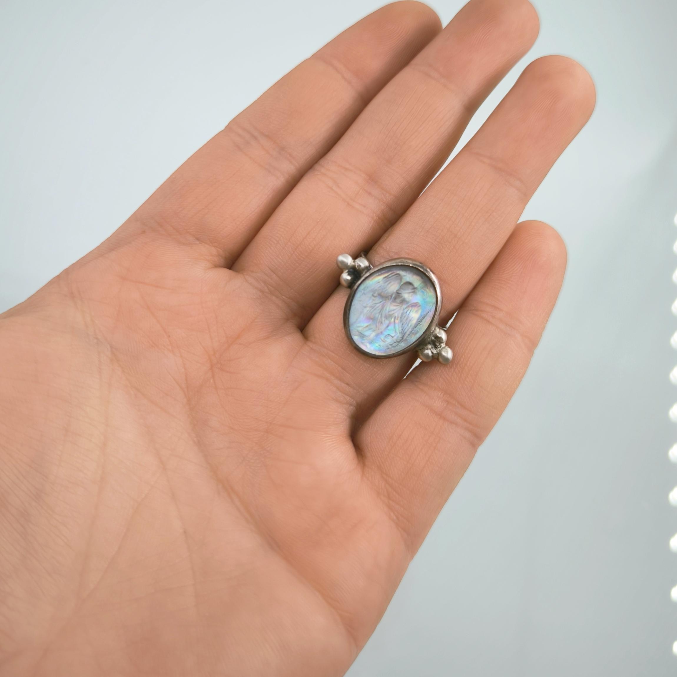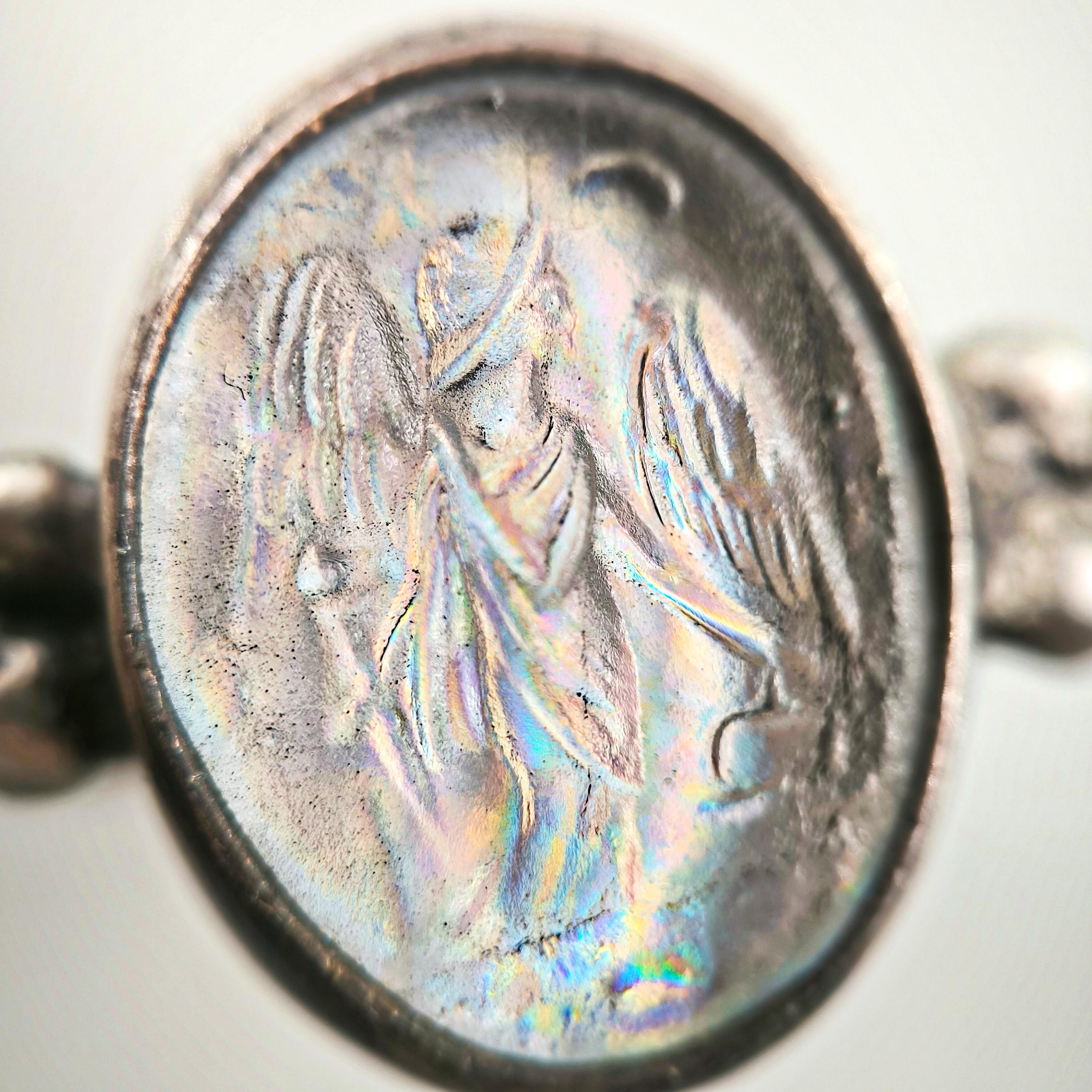 925 ayar gümüşten ustalıkla işlenmiş bu yüzük, şeffaf cam üzerine kabartma tekniğiyle işlenmiş kadim bir kanatlı tanrıça figürü taşır. Altına yerleştirilen holografik folyo, tıpkı opal taşların ışık oyunları gibi her açıdan farklı renkler yansıtır. Antik çağın mistik ruhunu modern bir dokunuşla buluşturan bu parça, hem tarihsel hem de sanatsal bir değere sahiptir.