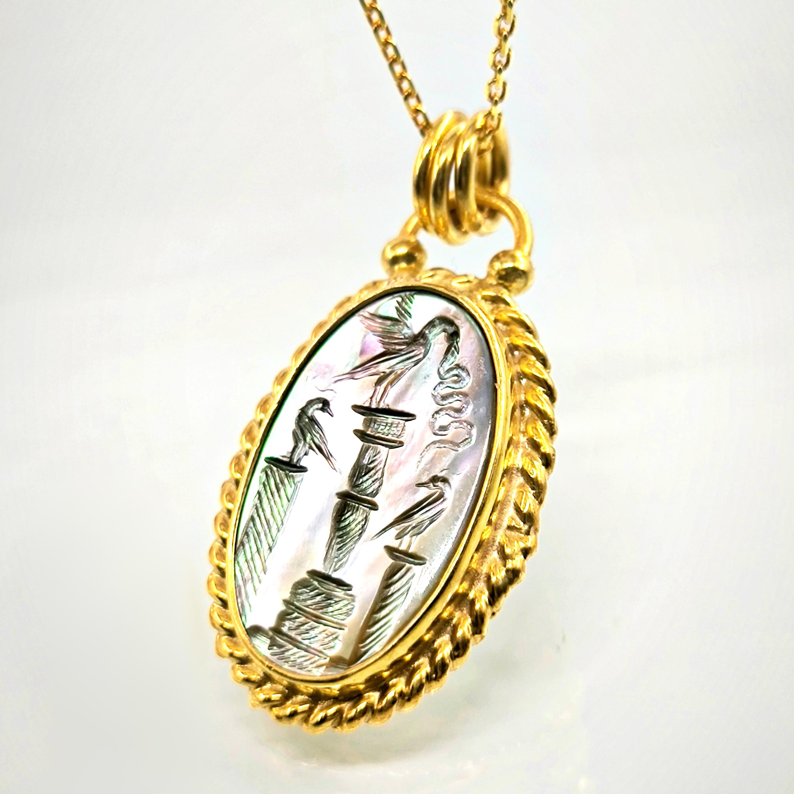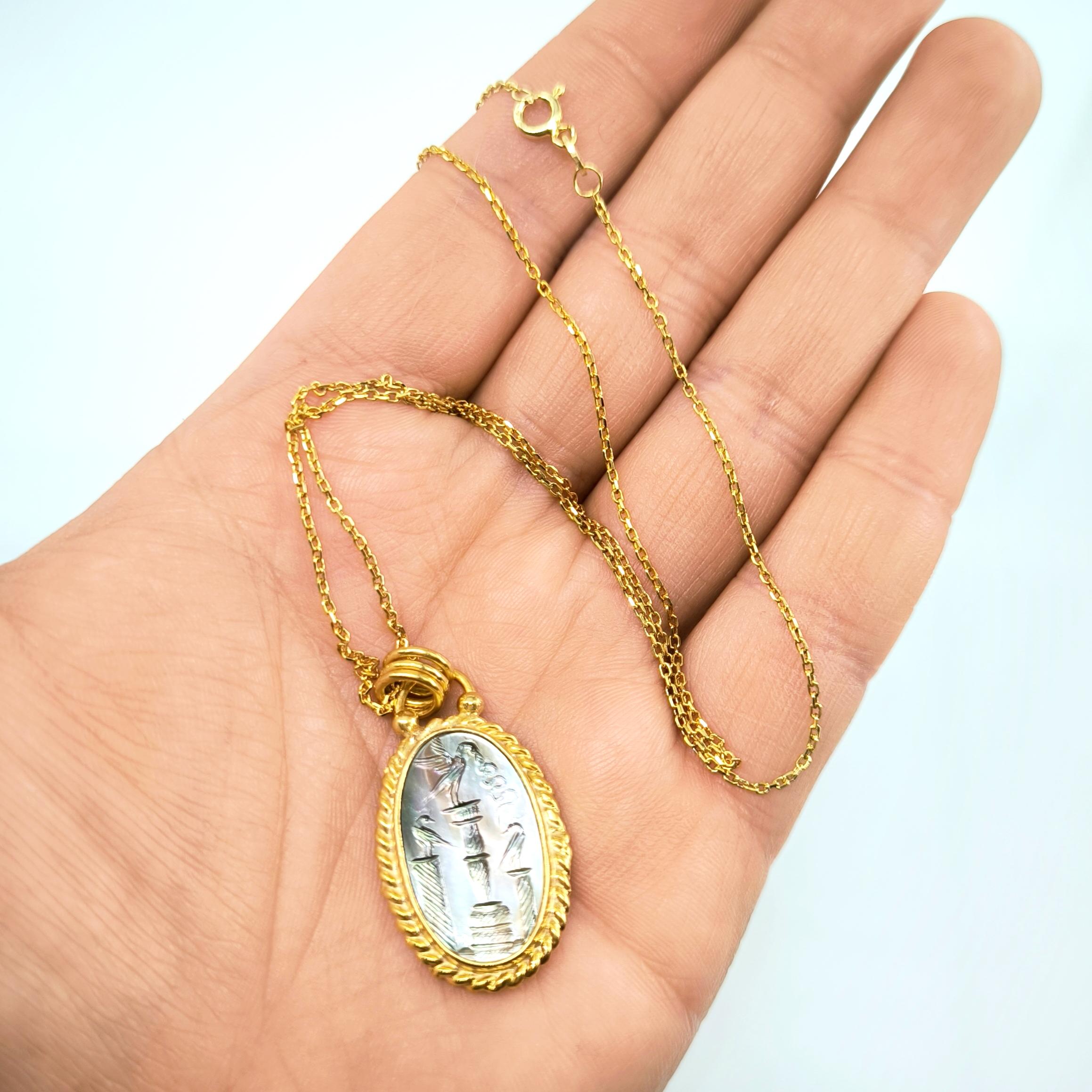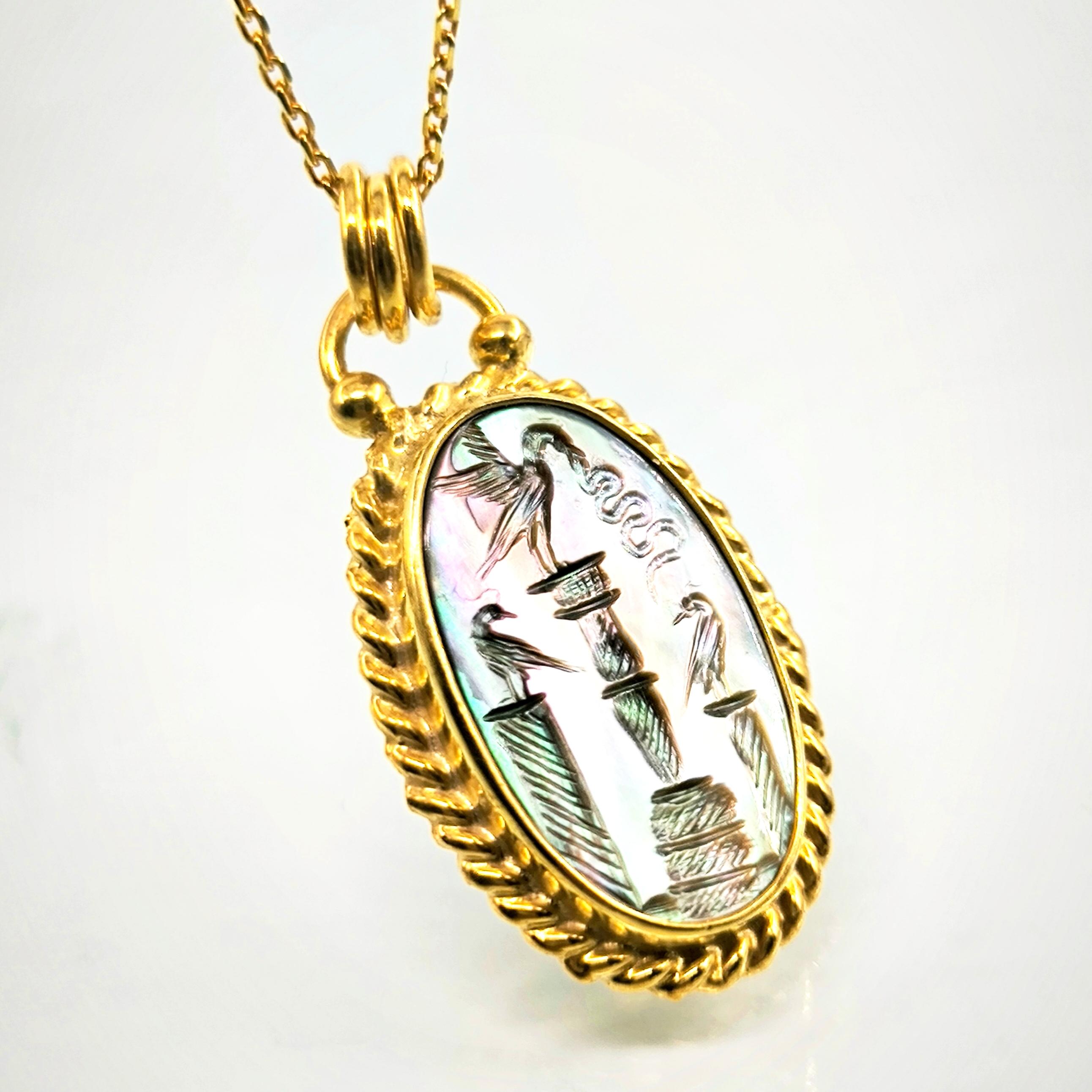 Bu tasarımda antik sembollerin anlatım gücünü zarif bir mücevher formunda yeniden yorumladım. Tamamı 925 ayar gümüşten hazırlanıp 22 ayar altınla kaplanan çerçeve, merkezdeki doğal sedef taşın büyüleyici renk oyununu kusursuz şekilde taşır. Sedef üzerine işlenen intaglio sahnede üç sütun üzerinde duran kuşlar yer alırken, ortadaki kuşun yakaladığı yılan doğadaki dengeyi ve kadim bilgeliği simgeler. Işığa tutulduğunda sedefin yüzeyinde beliren pastel tonlar, sahneye canlı ve derin bir karakter kazandırır. Antik sanatın ruhunu taşıyan bu kolye, boyunda taşınan zarif bir tılsım ve gerçek bir koleksiyon parçası niteliğindedir.