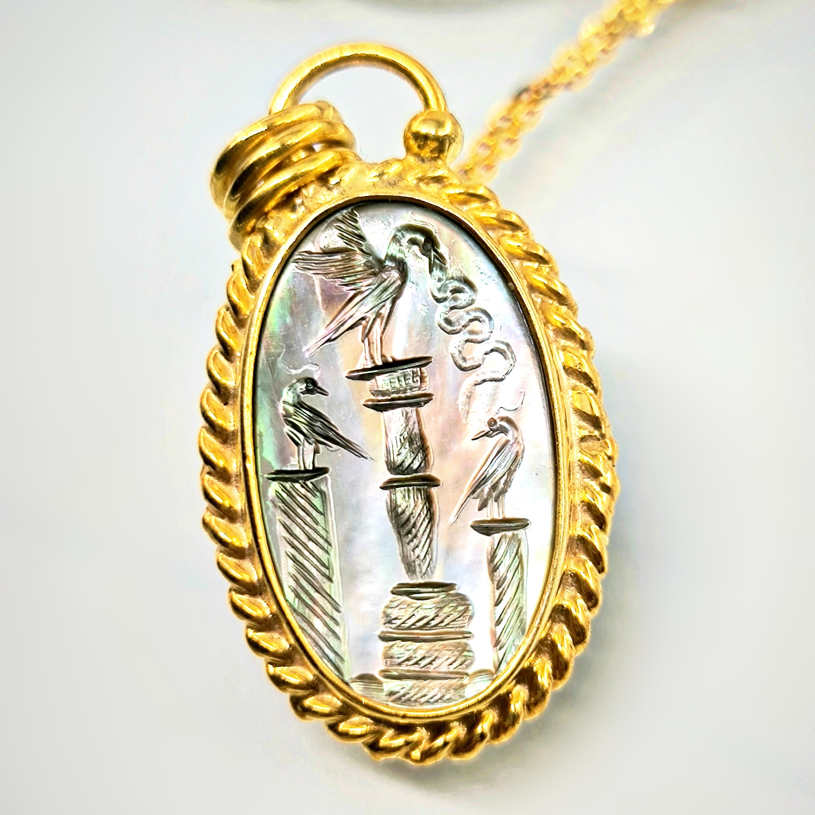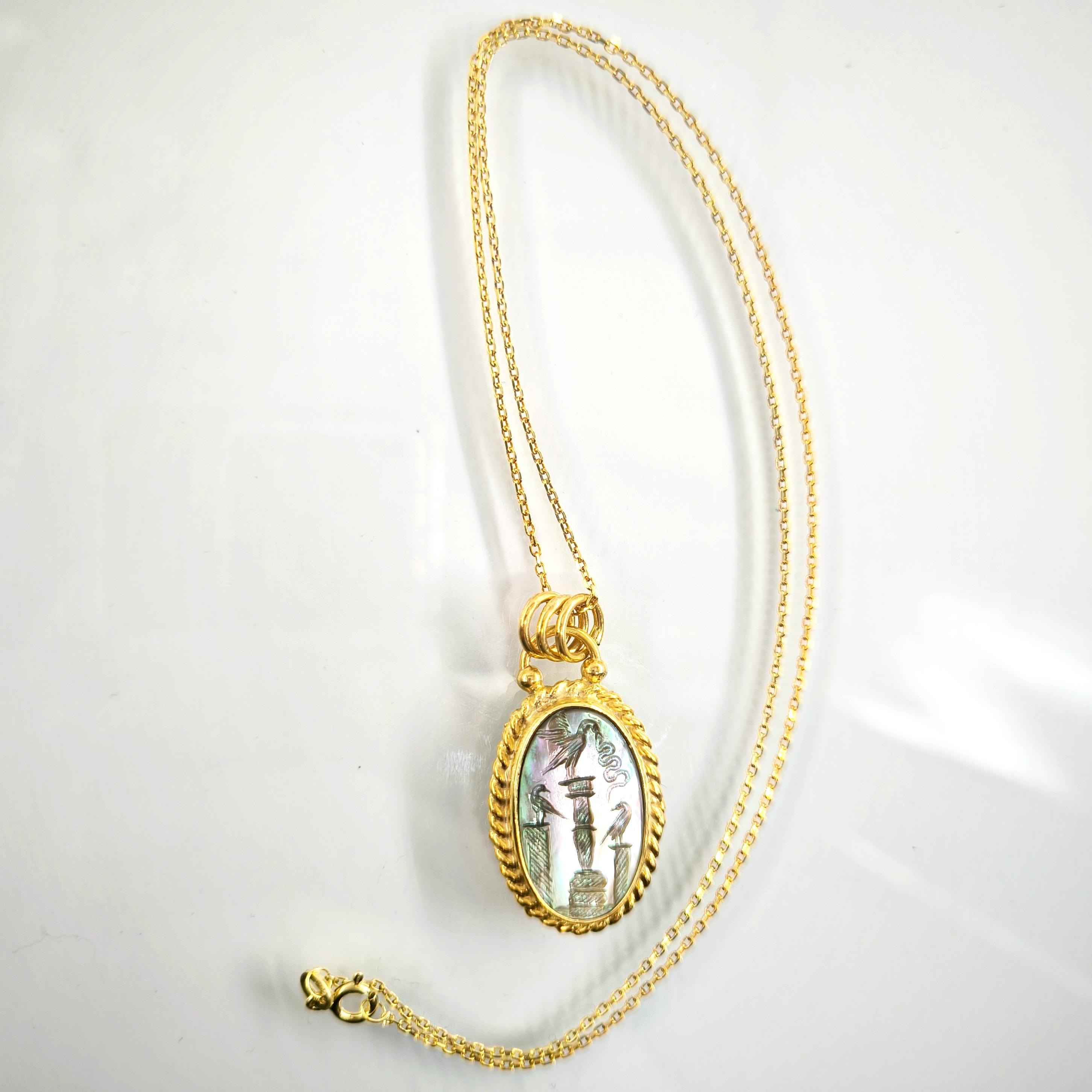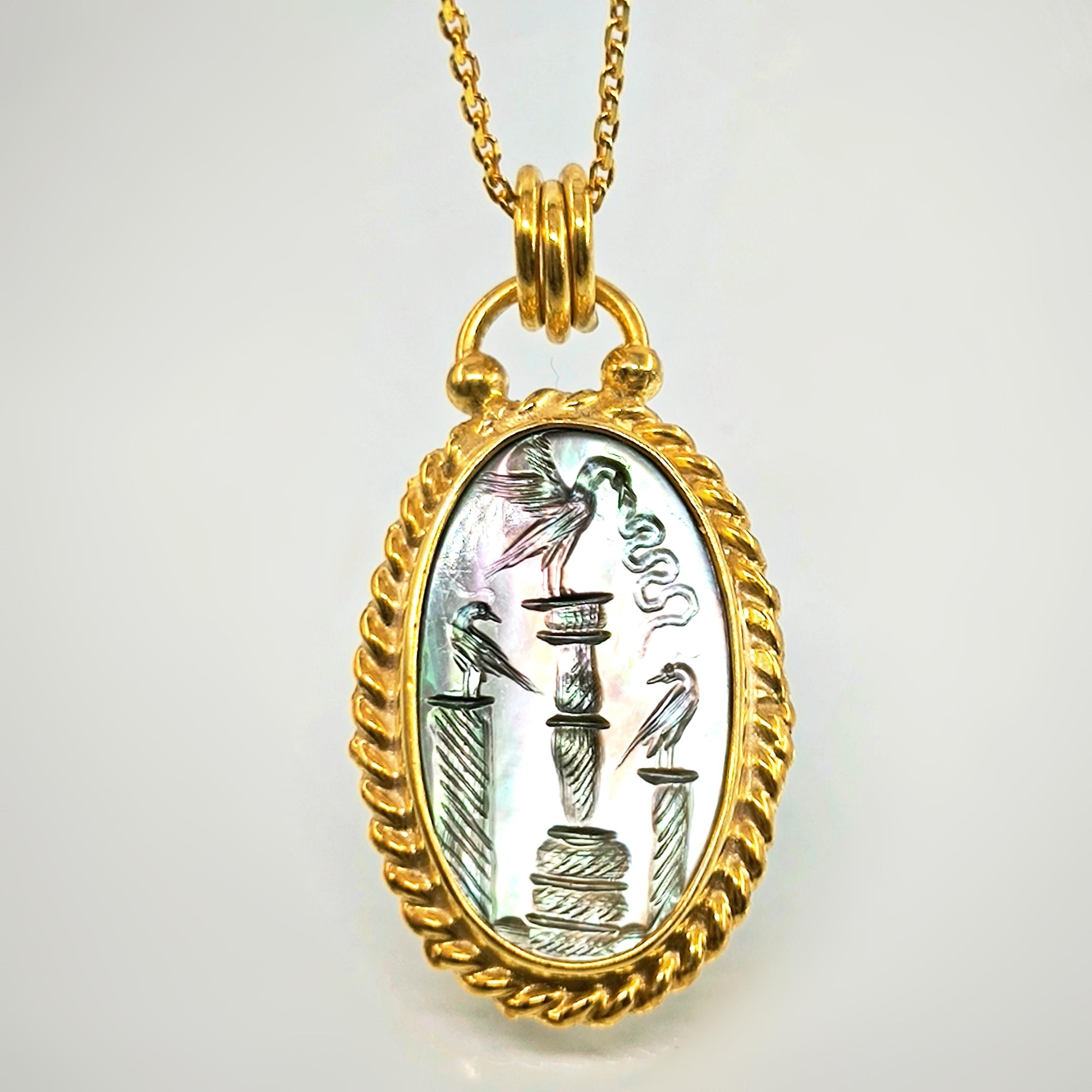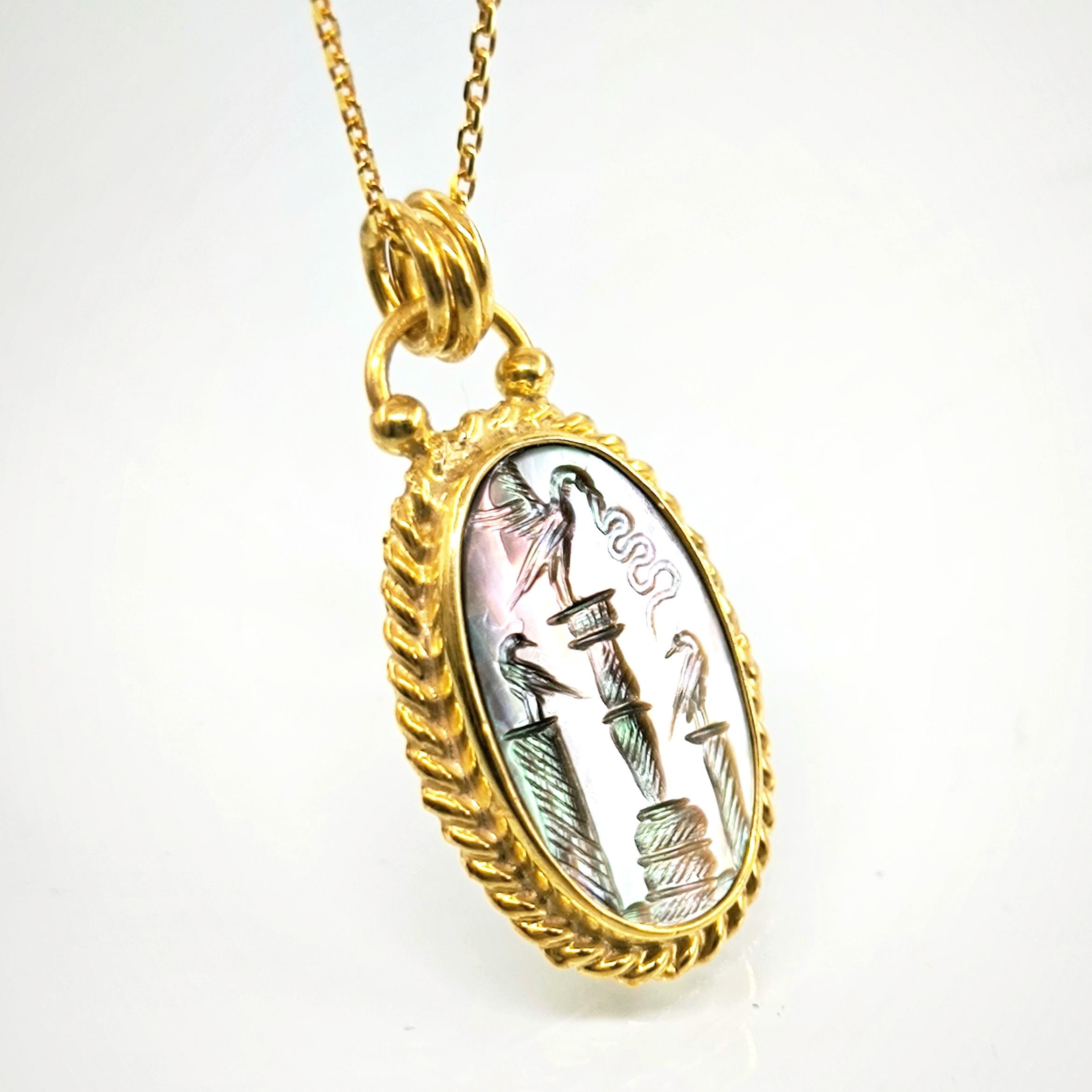 Bu tasarımda antik sembollerin anlatım gücünü zarif bir mücevher formunda yeniden yorumladım. Tamamı 925 ayar gümüşten hazırlanıp 22 ayar altınla kaplanan çerçeve, merkezdeki doğal sedef taşın büyüleyici renk oyununu kusursuz şekilde taşır. Sedef üzerine işlenen intaglio sahnede üç sütun üzerinde duran kuşlar yer alırken, ortadaki kuşun yakaladığı yılan doğadaki dengeyi ve kadim bilgeliği simgeler. Işığa tutulduğunda sedefin yüzeyinde beliren pastel tonlar, sahneye canlı ve derin bir karakter kazandırır. Antik sanatın ruhunu taşıyan bu kolye, boyunda taşınan zarif bir tılsım ve gerçek bir koleksiyon parçası niteliğindedir.