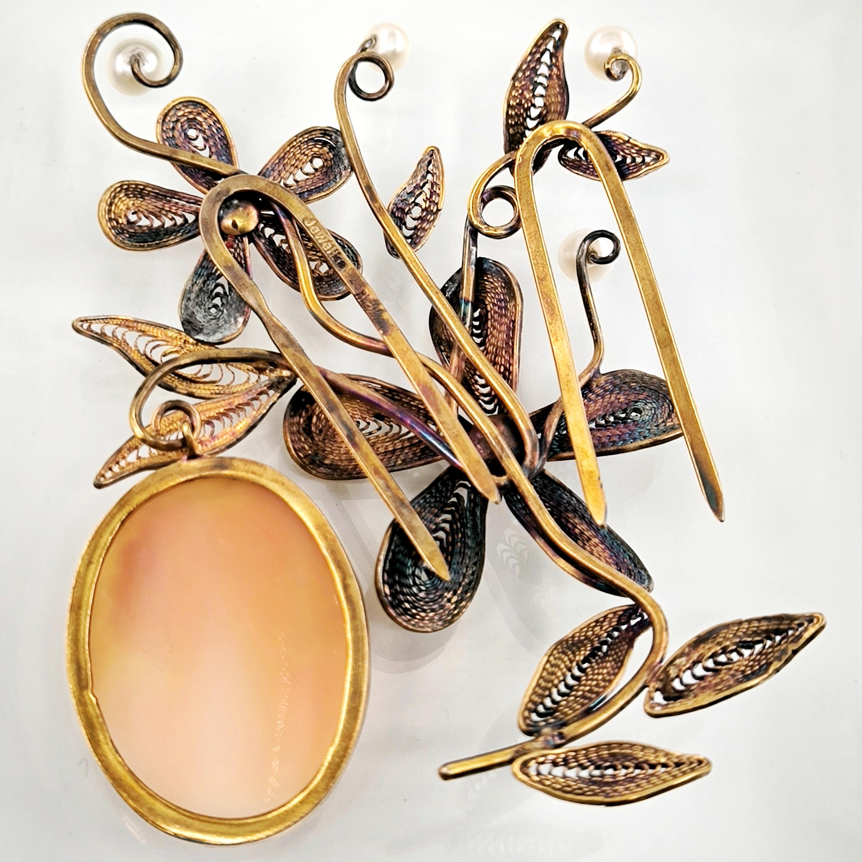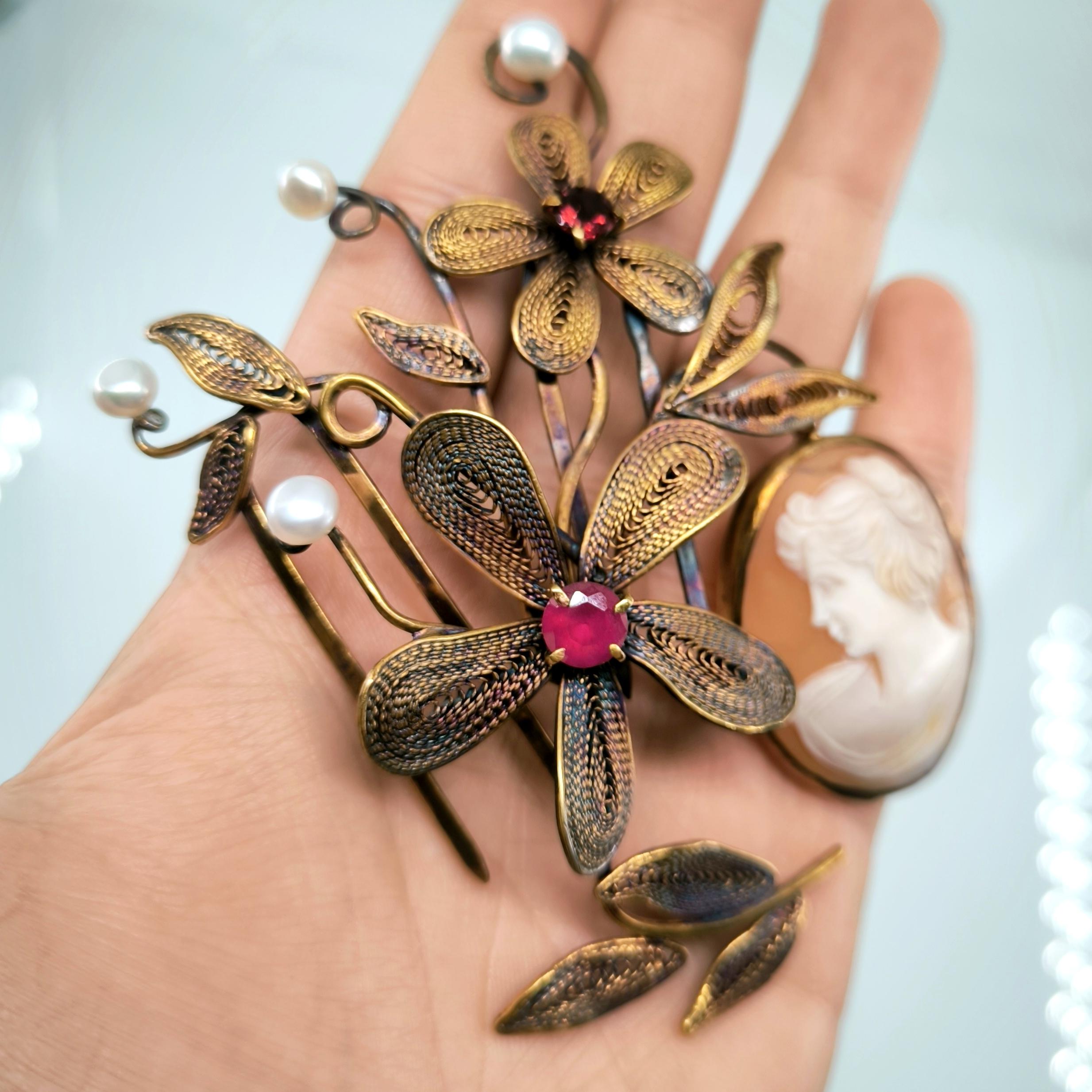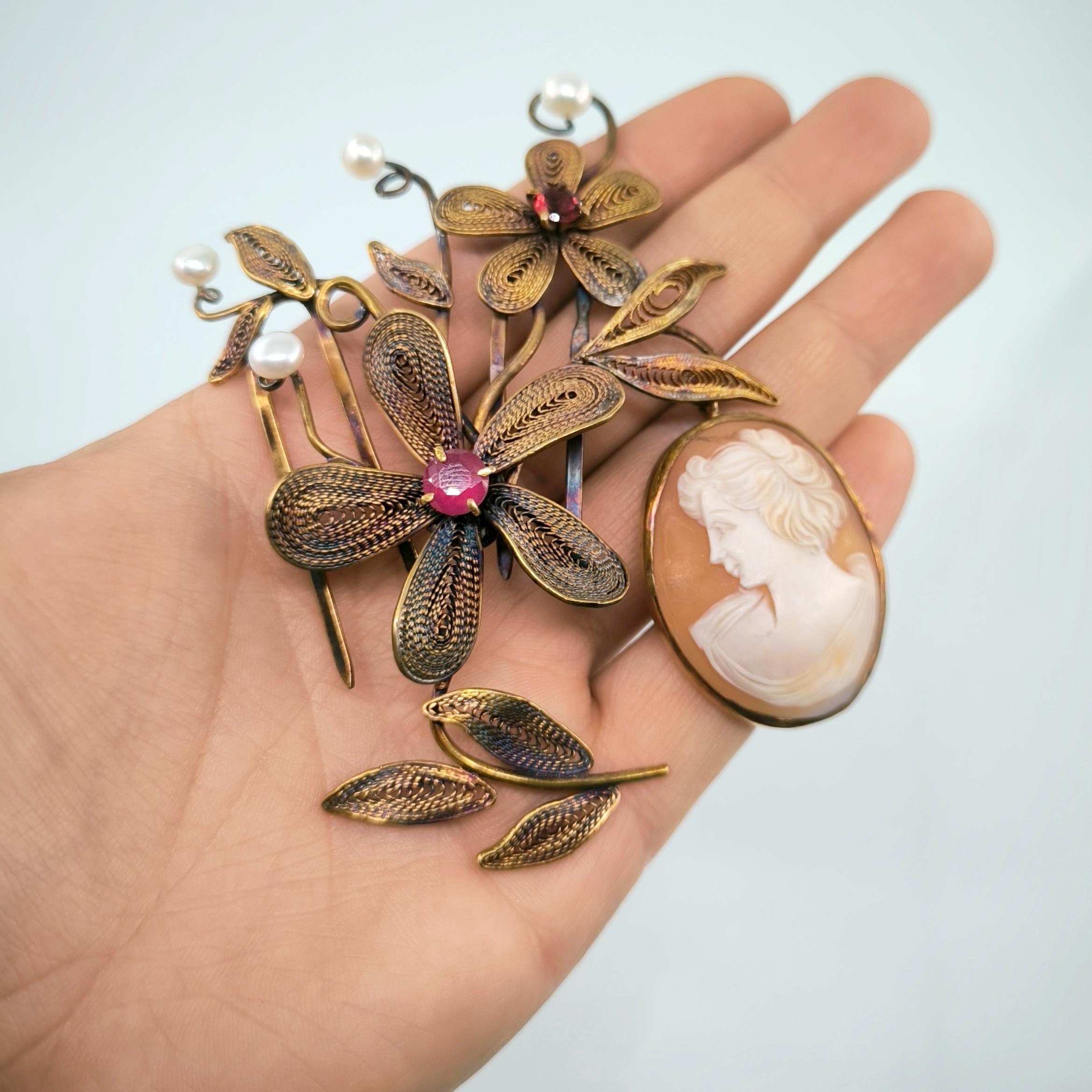 Viktorya dönemindeki sosyete ve asillerin en gözde takısı Cameolar! Deniz kabuğu Üzerine "Leydi" kabartması çalışılmış, gerçek bir Antika mücevher! Eski cameo bir gerdanlıktan çıkarıp mEdusA dokunuşu ve telkari işçiliğimiz ile muntazam bir cameo saç tokasına dönüştürdük! Tamamı 925 Ayar gümüş olup üzeri altın kaplama eşsiz ve aykırı, marjinal mücevherimiz, cameo saç tokamız! Cameo sallantı formunda tasarlanmıştır, tokamız üzerindeki inciler natürel incilerdir.