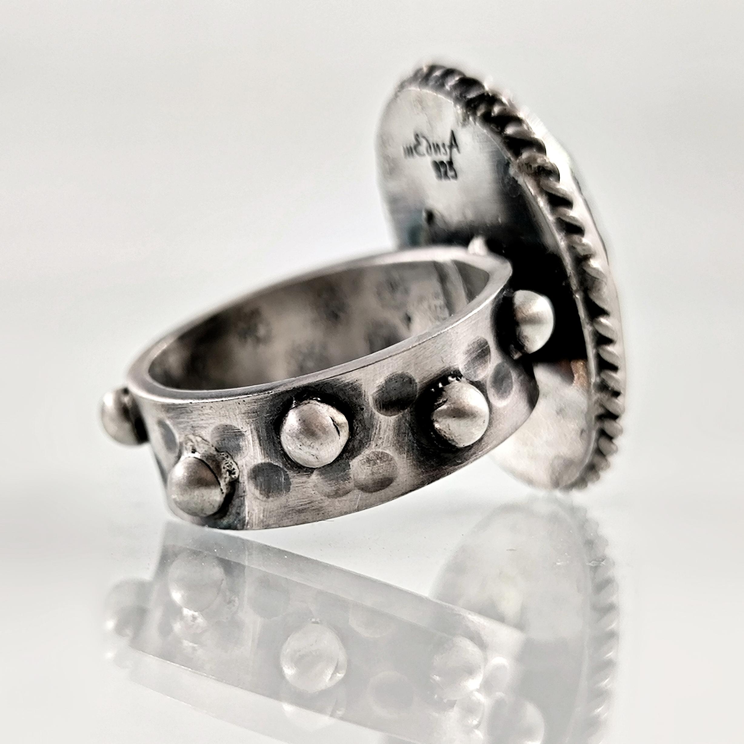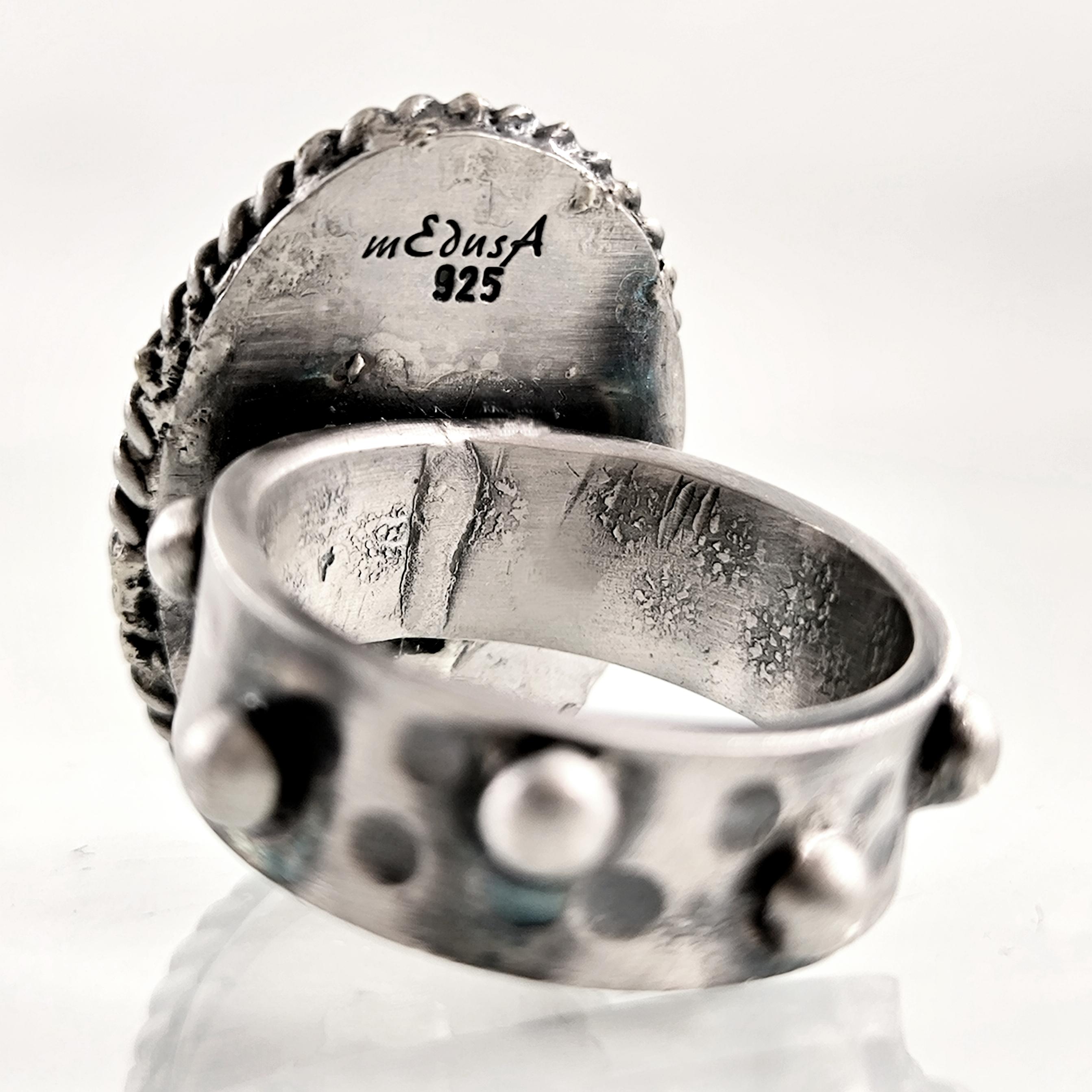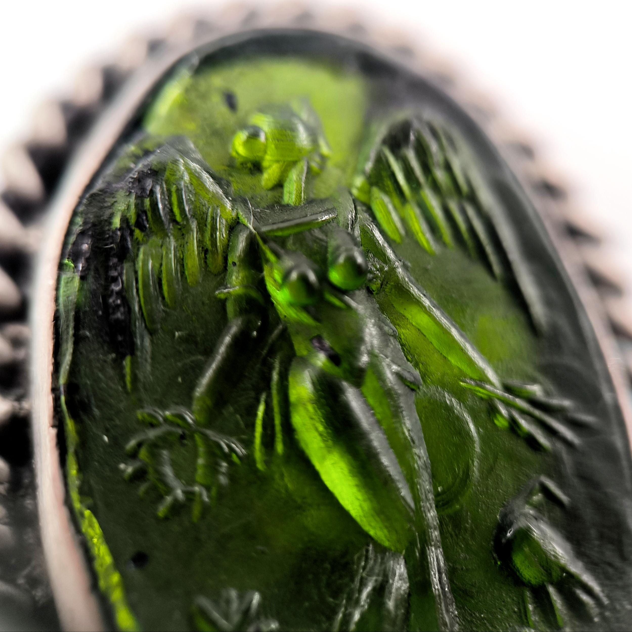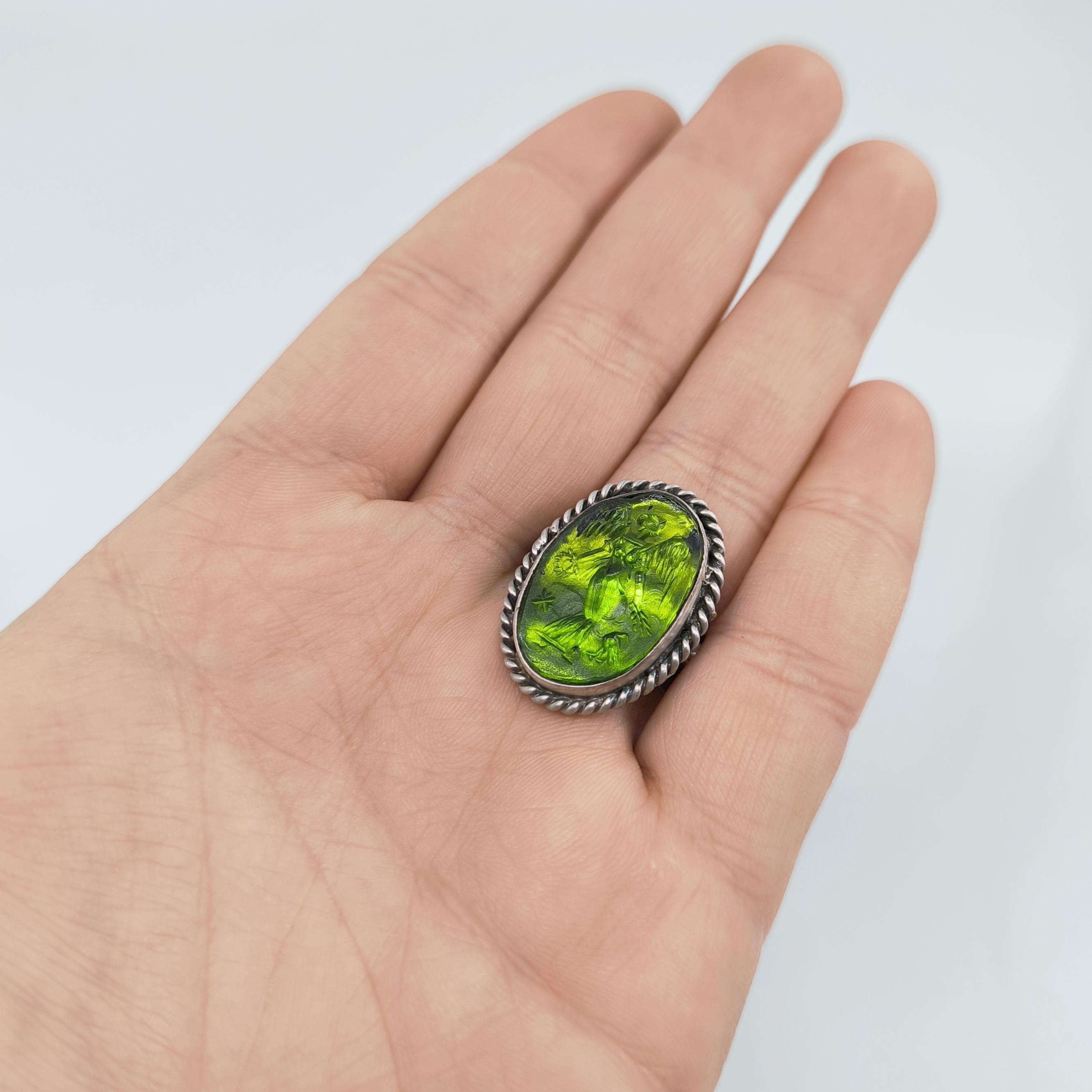 925 ayar gümüş üzerine, özel pres tekniğimle şekillendirdiğim cam yüzeyde kanatlı tanrıça figürü yer alıyor. Antik dünyanın zafer ve koruyucu güç sembollerinden esinlenerek işlediğim bu figür, camın arkasına eklediğim özel foya sayesinde ışıkla buluştuğunda yanar dönerli, büyüleyici bir derinlik kazanıyor. Klasik mitoloji ile modern ustalığın birleştiği bu parça, hem koleksiyon değeri hem de güçlü estetik duruşuyla dikkat çekiyor.