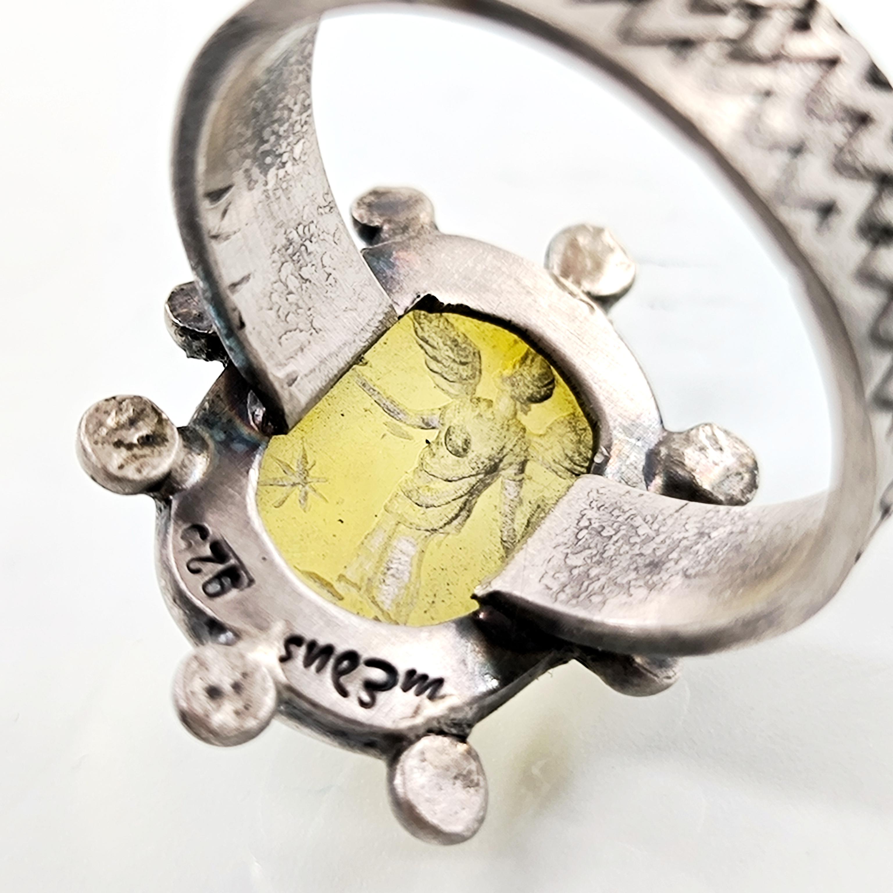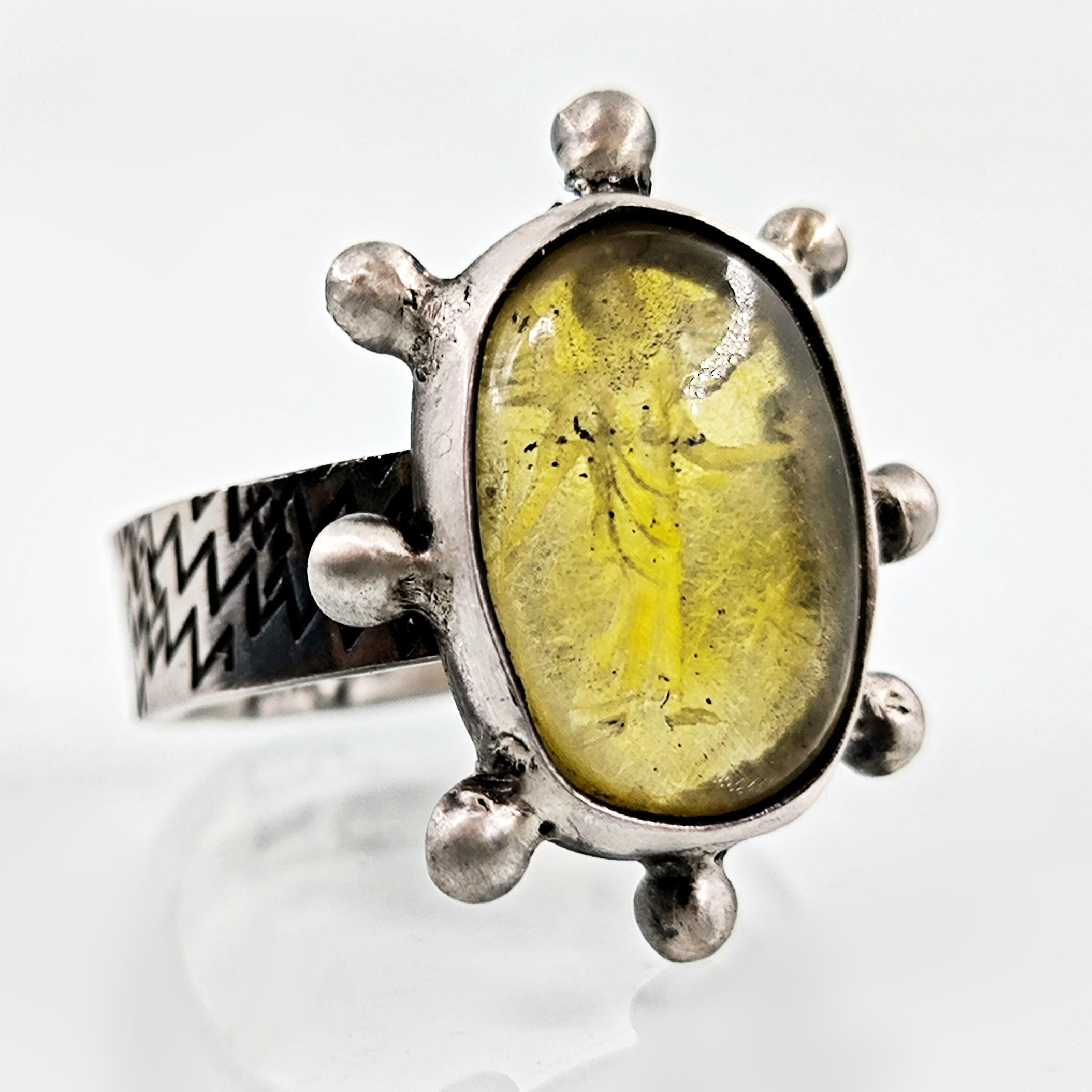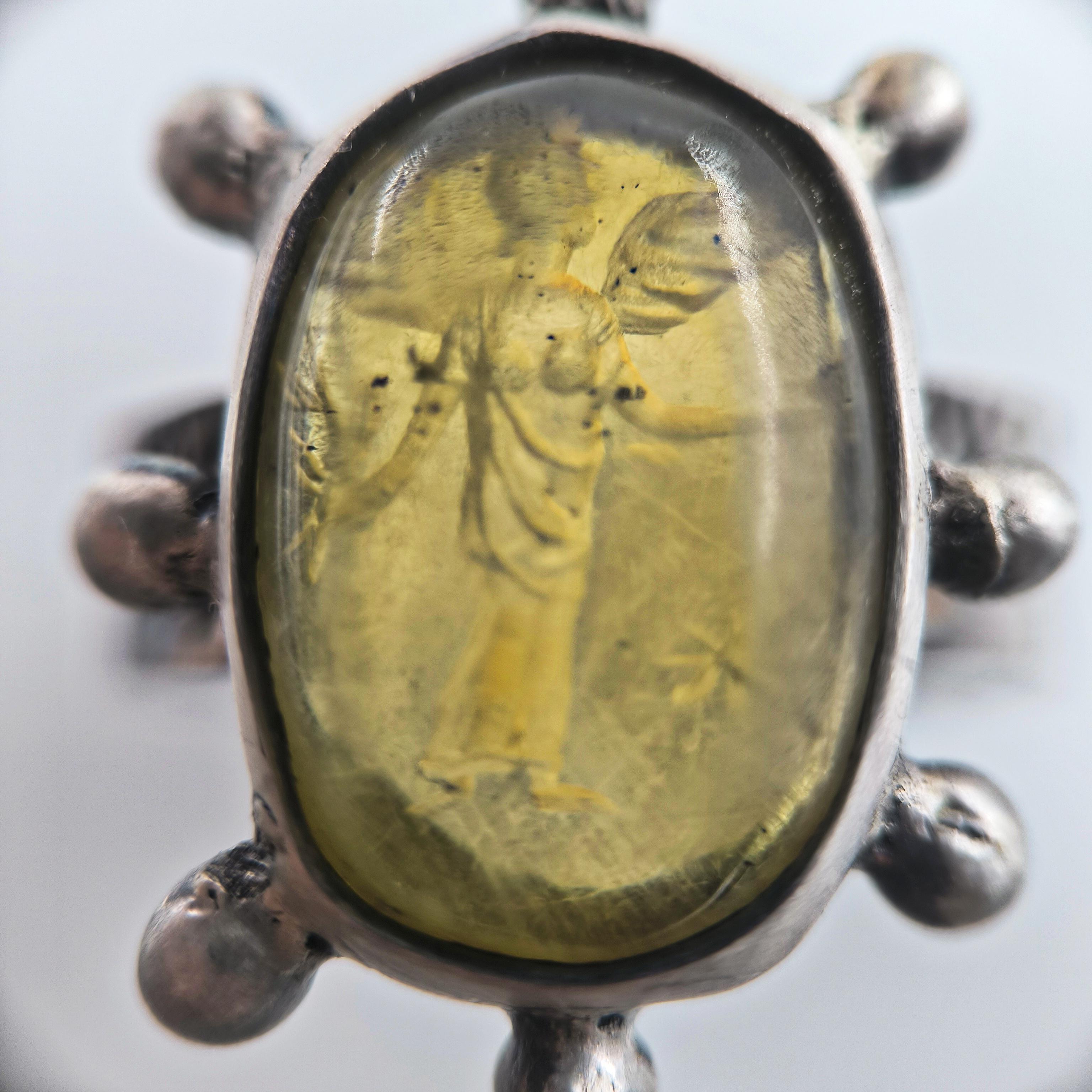 KANATLI TANRIÇA TASVİRLİ DAMLA KEHRİBAR ANTİK STİL 925 AYAR GÜMÜŞ YÜZÜK