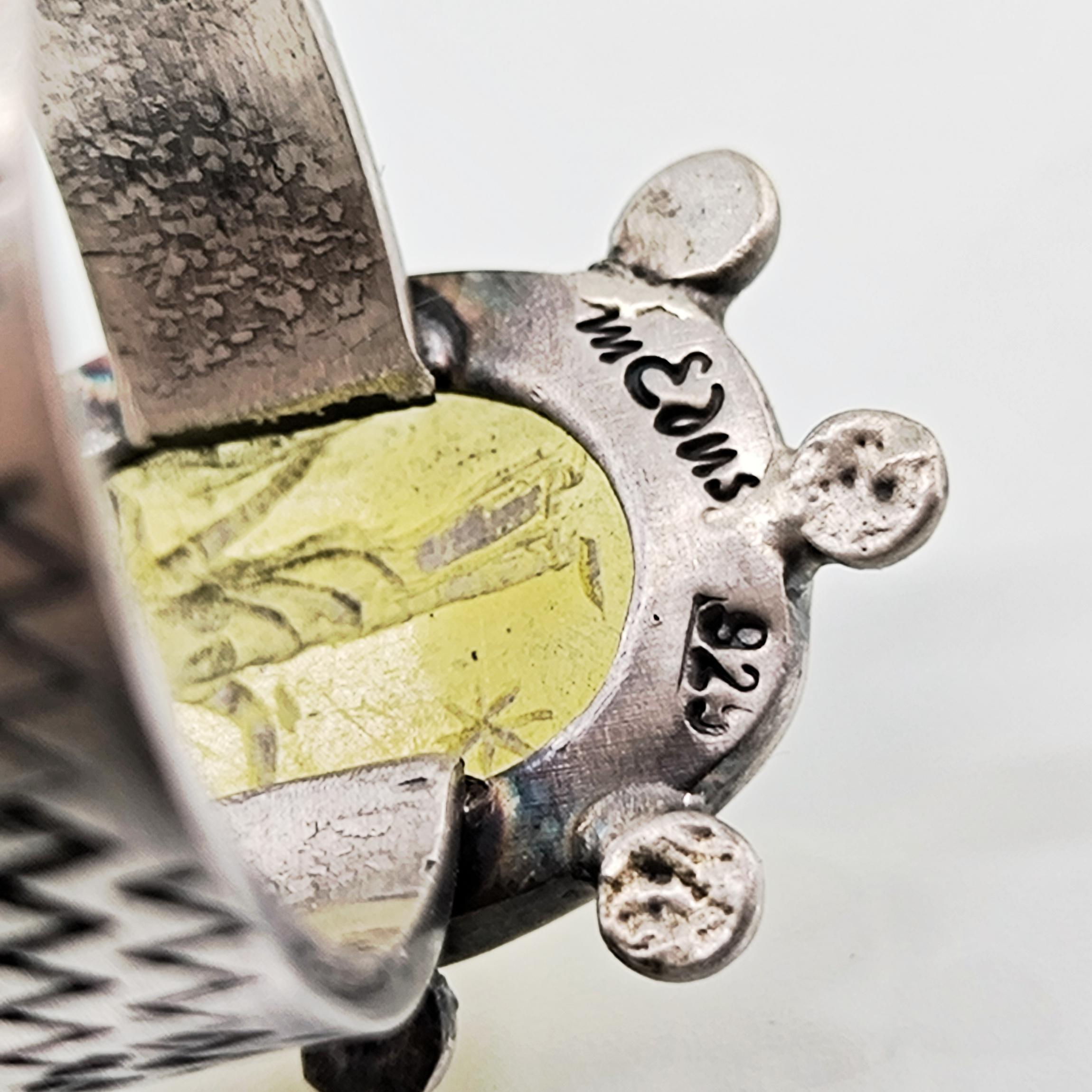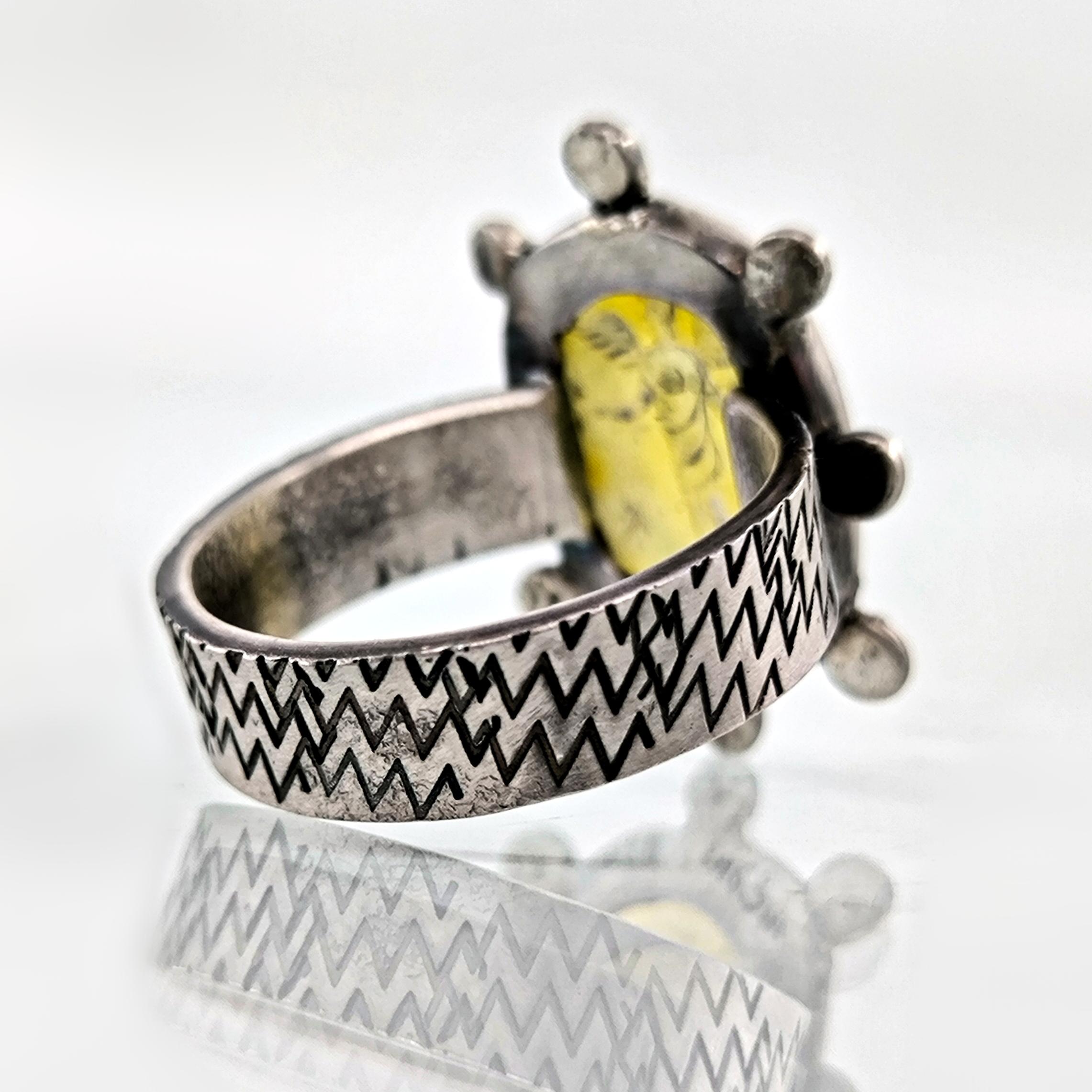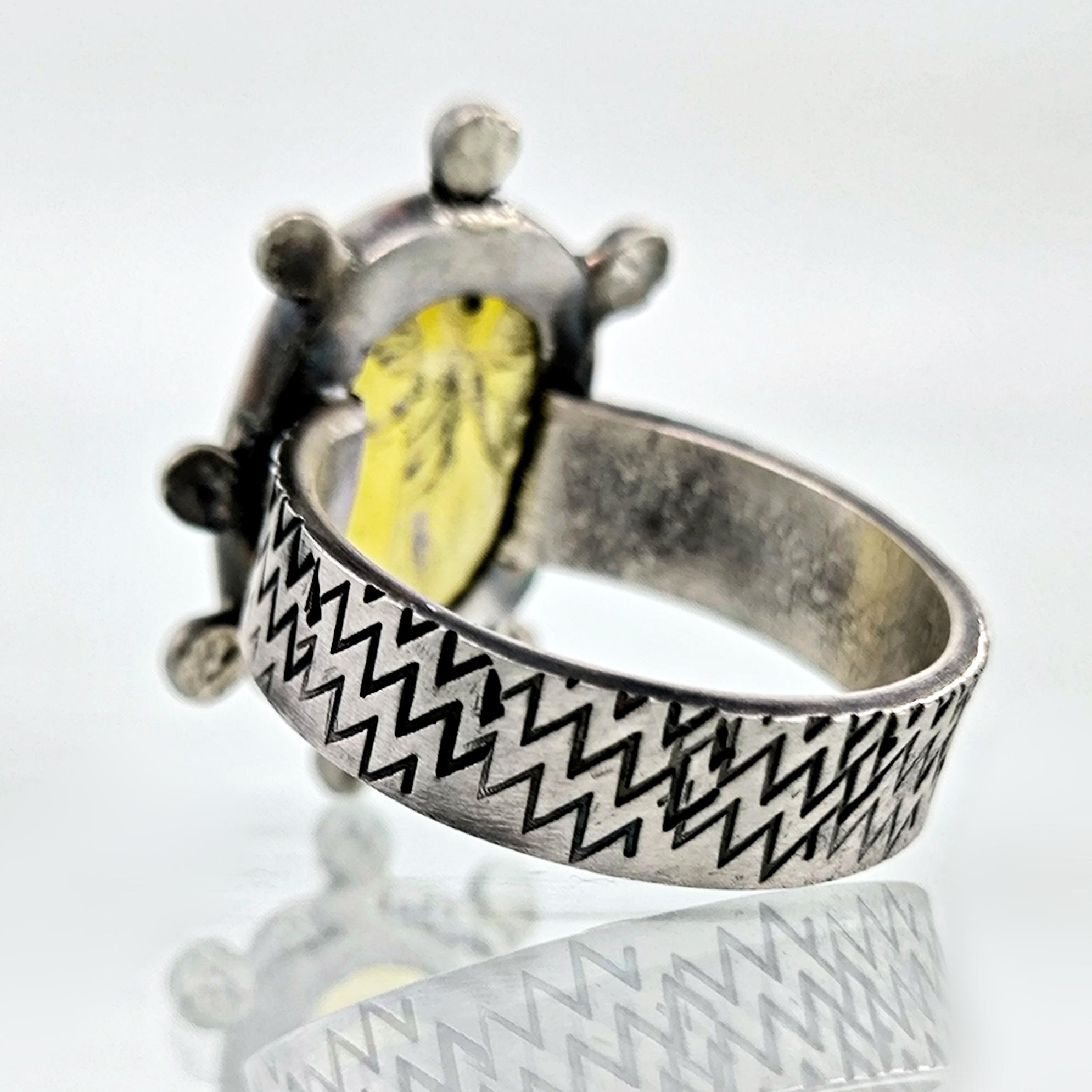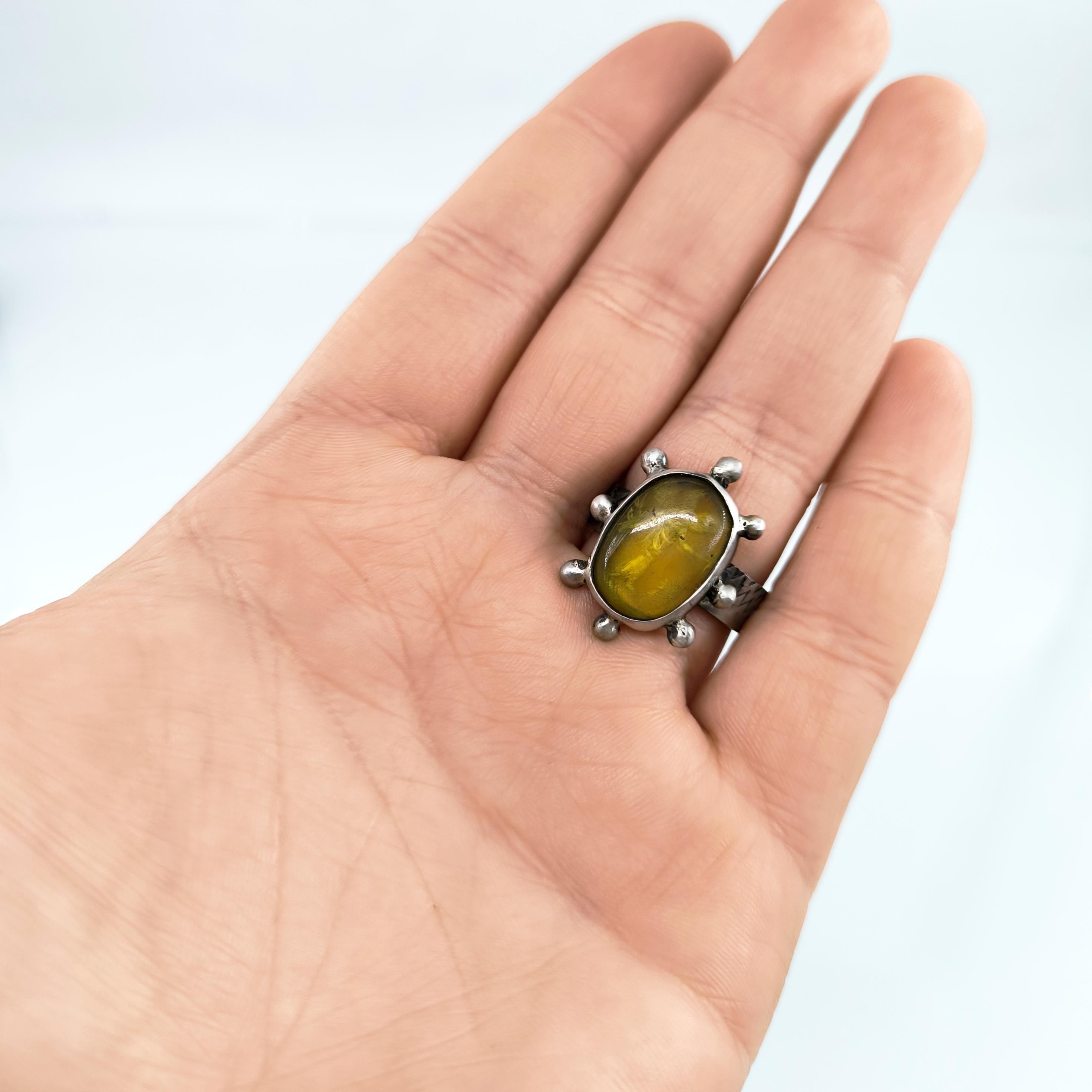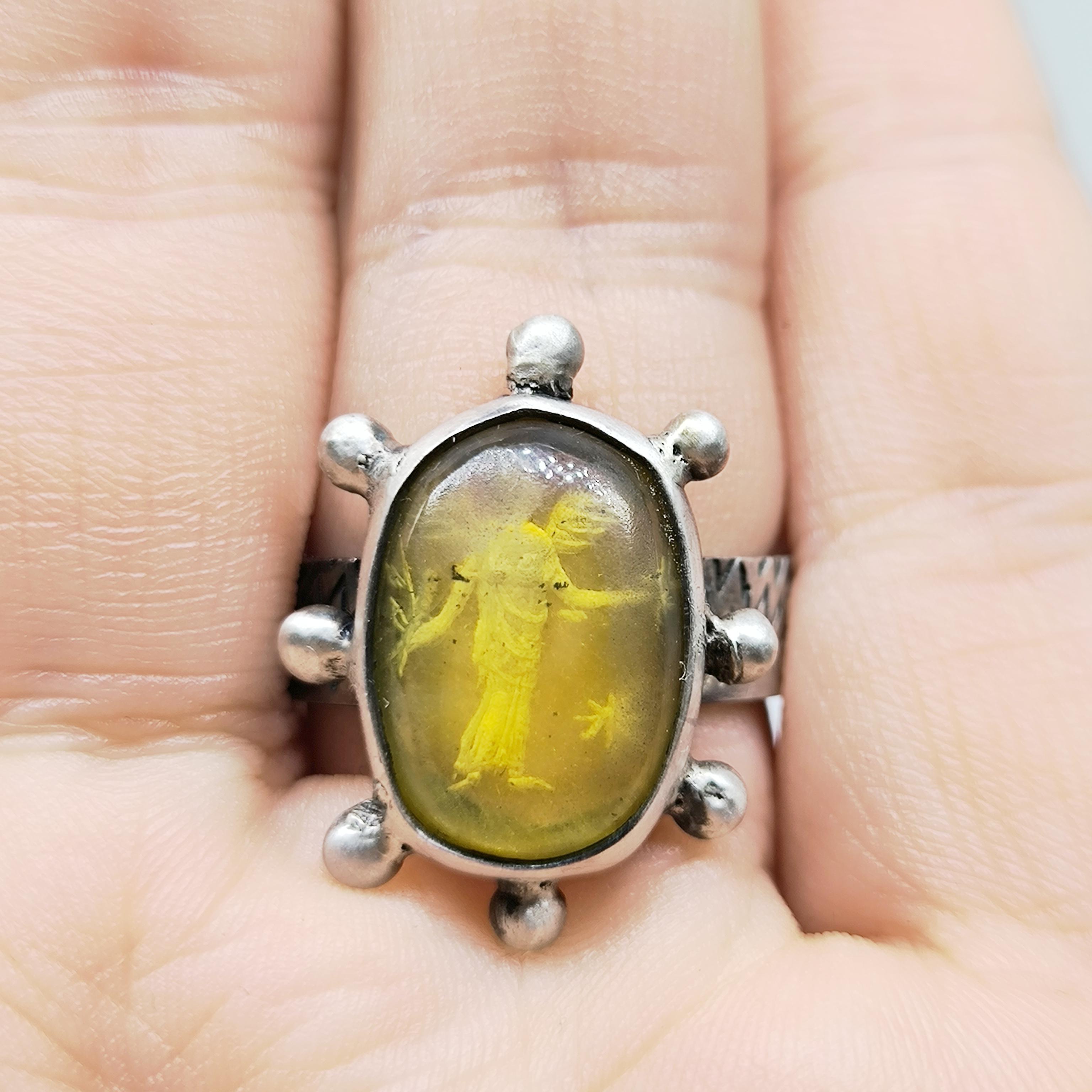 Mitolojinin görkemli dünyasından ilham alan bu yüzük, arka yüzüne negatif intaglio tekniğiyle oyulmuş kanatlı tanrıça figürüyle adeta tanrısal bir zarafeti taşır. Altın sarısının sıcaklığıyla parlayan doğal damla kehribar, ışığı yakaladığında figürün ince detaylarını ortaya çıkarır. 925 ayar gümüş gövdesi ve antik formda tasarlanmış yuvarlak başlı süslemeleriyle, binlerce yıl öncesinin mistik takı geleneğini günümüze taşır. Gücü, korumayı ve ilahi rehberliği simgeleyen bu özel parça, hem koleksiyon değeri hem de ruhani anlamıyla eşsizdir.