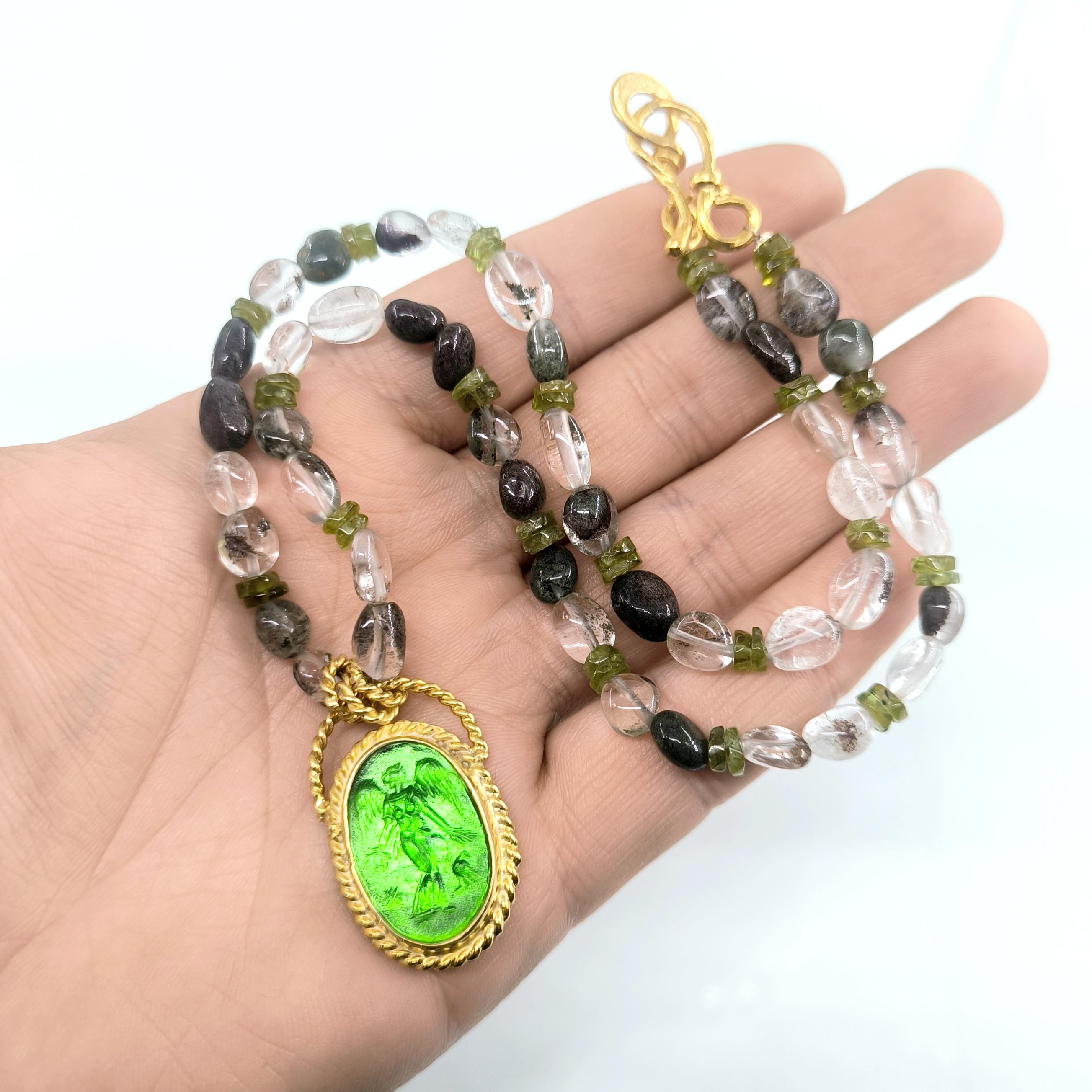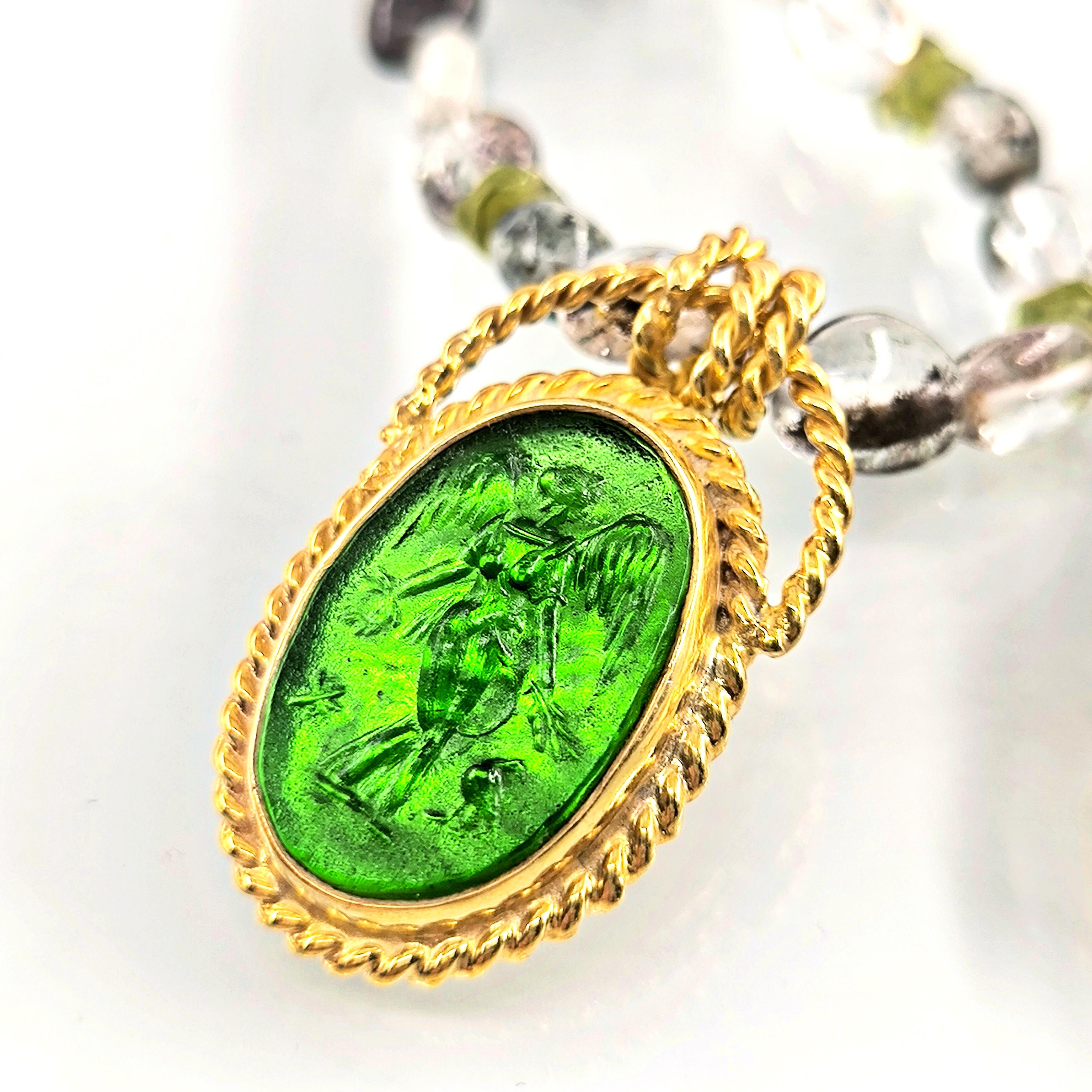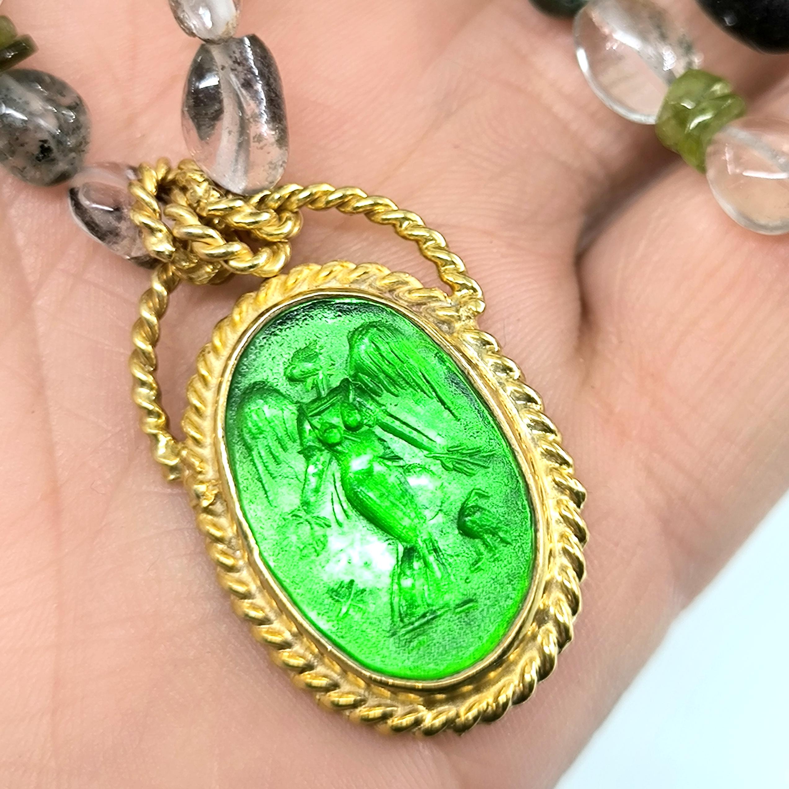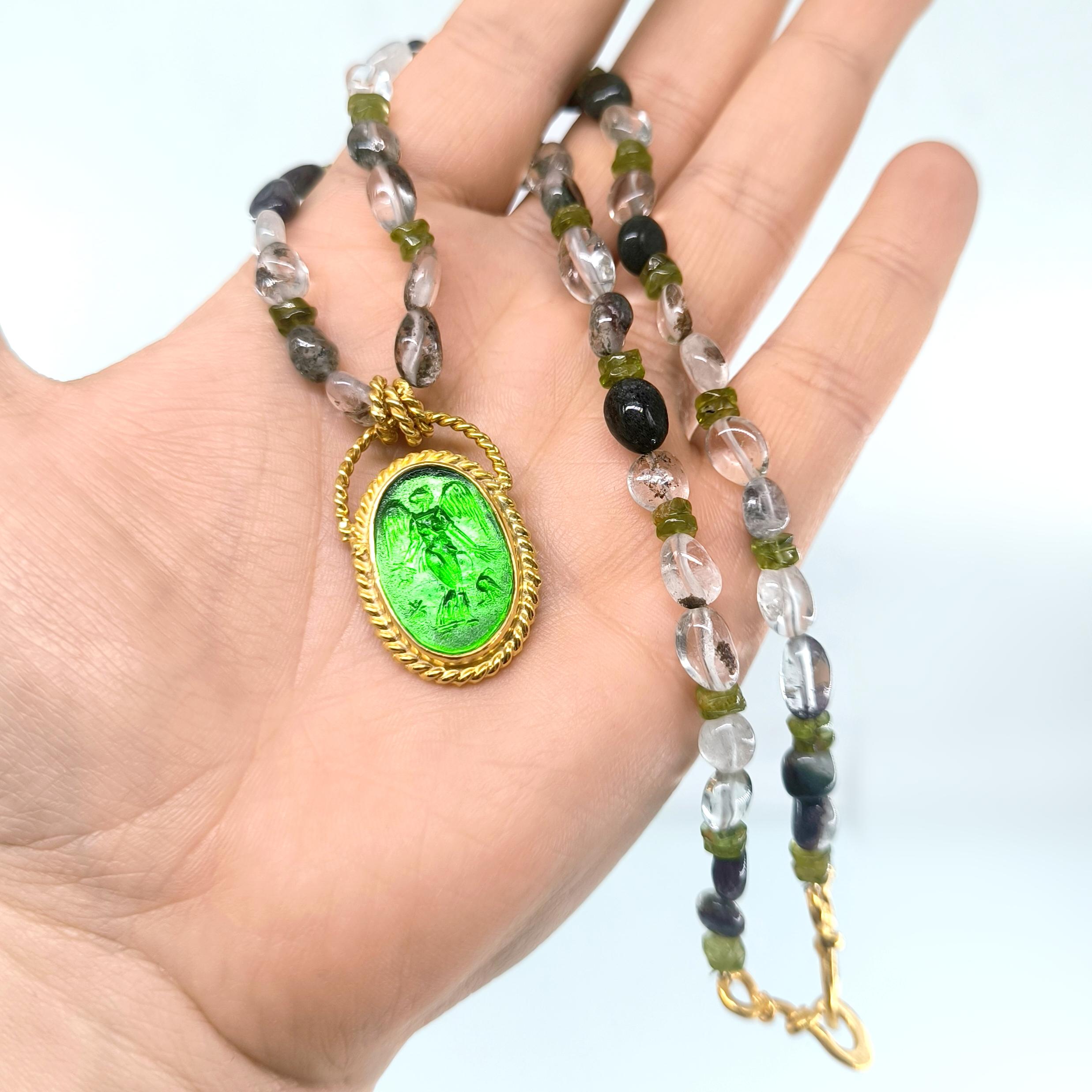 Bu tasarımda doğanın iç dünyasını taşıyan taşlarla kadim sembolleri bir araya getirdim. Zincirdeki natürel garden kuvarslar, içlerinde sakladıkları doğal izlerle adeta küçük evrenler gibi görünürken aralarındaki zebercet taşlar tasarıma canlı bir ışık katıyor. Kolye ucunda yer alan yeşil cam üzerindeki kanatlı tanrıça figürü, özgürlüğün ve ilahi koruyuculuğun kadim bir sembolüdür. Taşın altına yerleştirilen özel foya sayesinde ışıkla birlikte büyüleyici bir parıltı ve derinlik oluşur. 22 ayar Altın kaplama tamamı 925 ayar gümüş çerçevesiyle tamamlanan bu parça, boyunda taşınan mistik ve zarif bir sanat eseri gibidir.