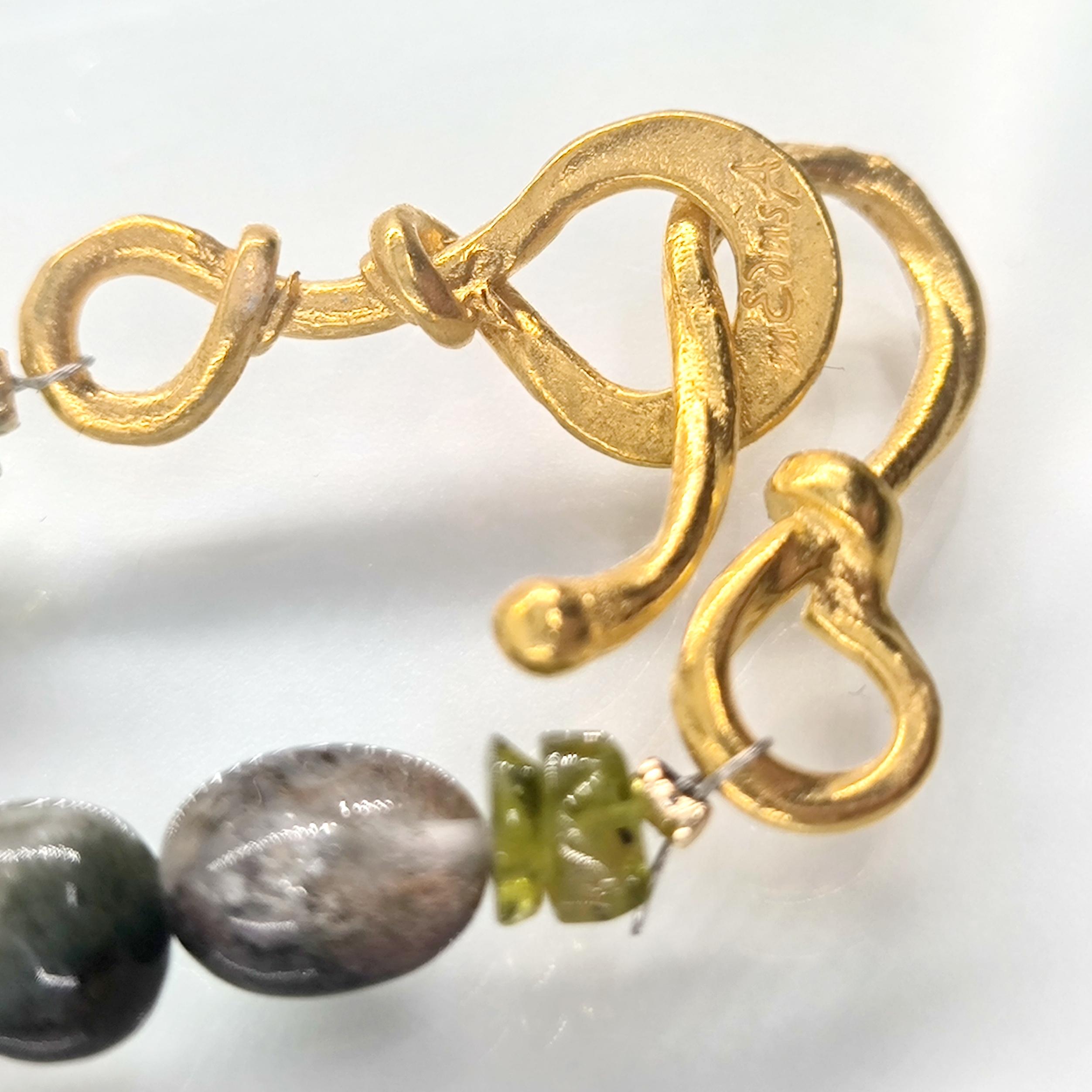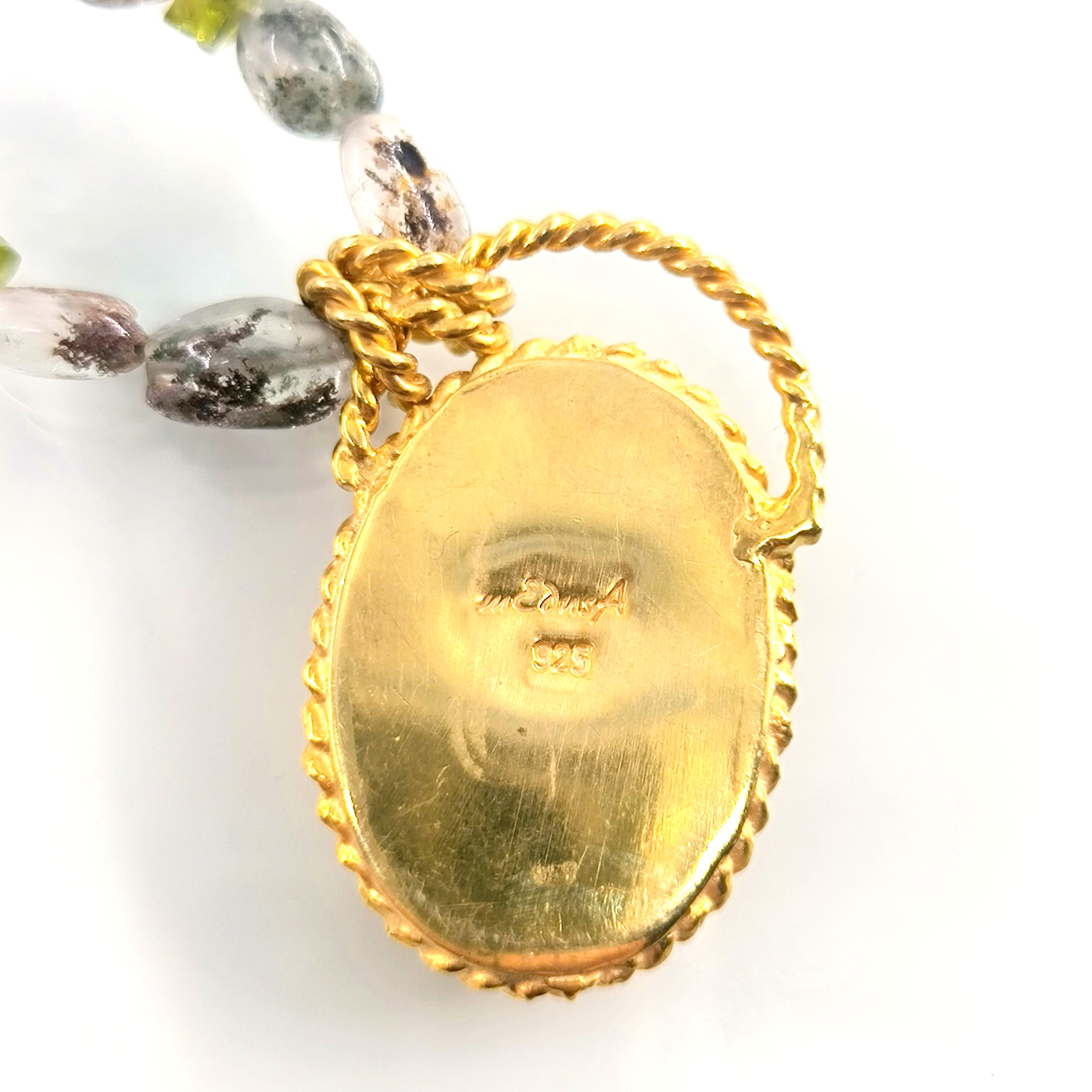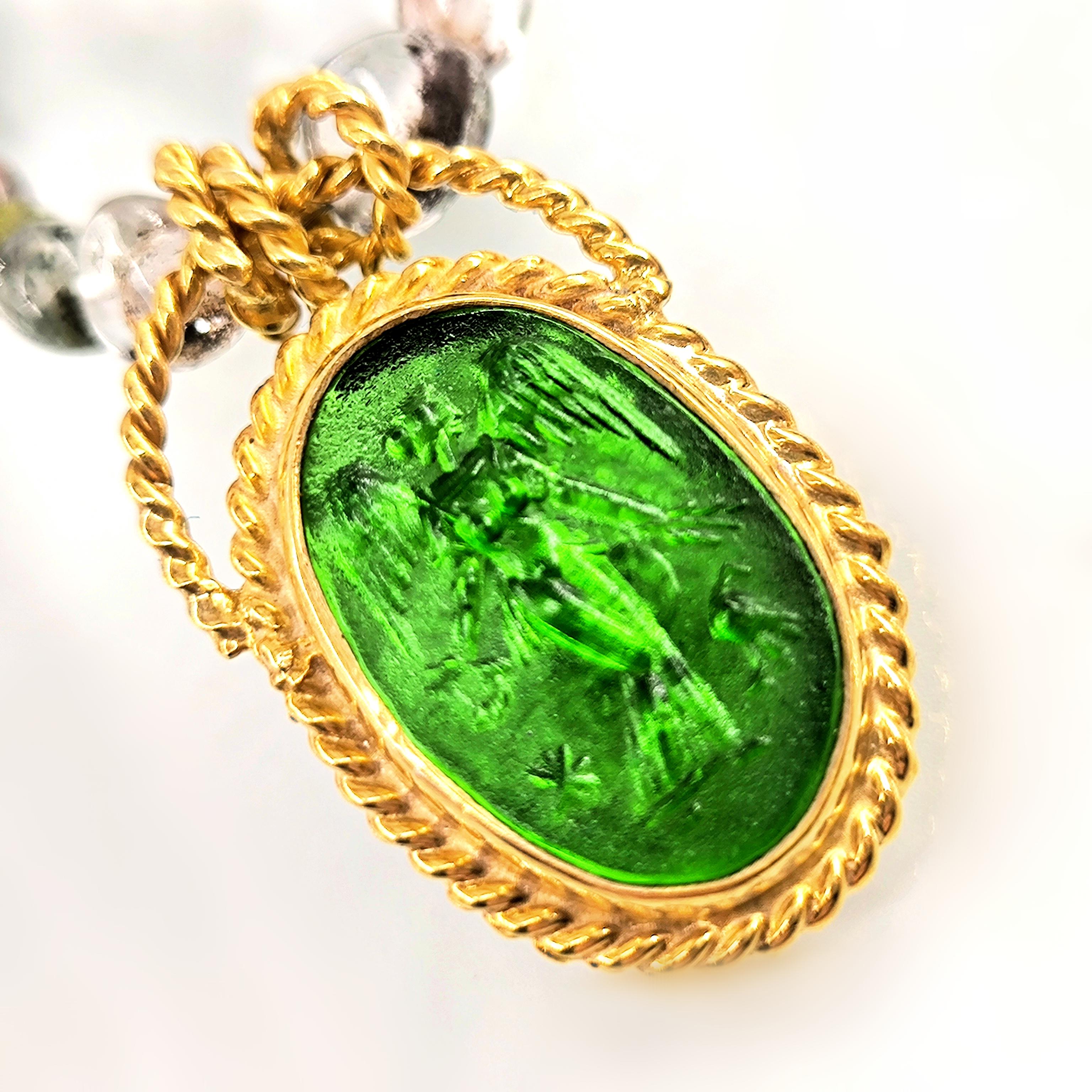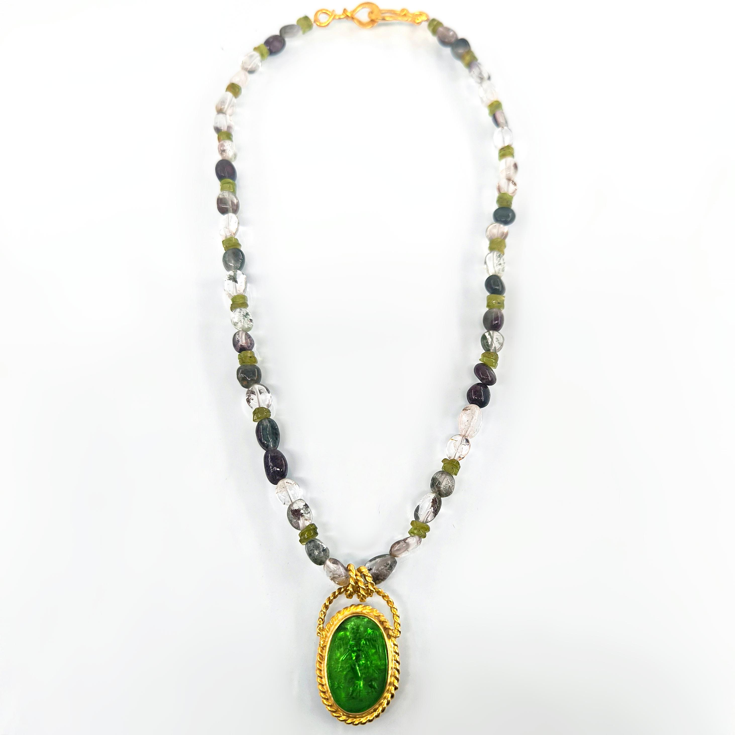 Bu tasarımda doğanın iç dünyasını taşıyan taşlarla kadim sembolleri bir araya getirdim. Zincirdeki natürel garden kuvarslar, içlerinde sakladıkları doğal izlerle adeta küçük evrenler gibi görünürken aralarındaki zebercet taşlar tasarıma canlı bir ışık katıyor. Kolye ucunda yer alan yeşil cam üzerindeki kanatlı tanrıça figürü, özgürlüğün ve ilahi koruyuculuğun kadim bir sembolüdür. Taşın altına yerleştirilen özel foya sayesinde ışıkla birlikte büyüleyici bir parıltı ve derinlik oluşur. 22 ayar Altın kaplama tamamı 925 ayar gümüş çerçevesiyle tamamlanan bu parça, boyunda taşınan mistik ve zarif bir sanat eseri gibidir.