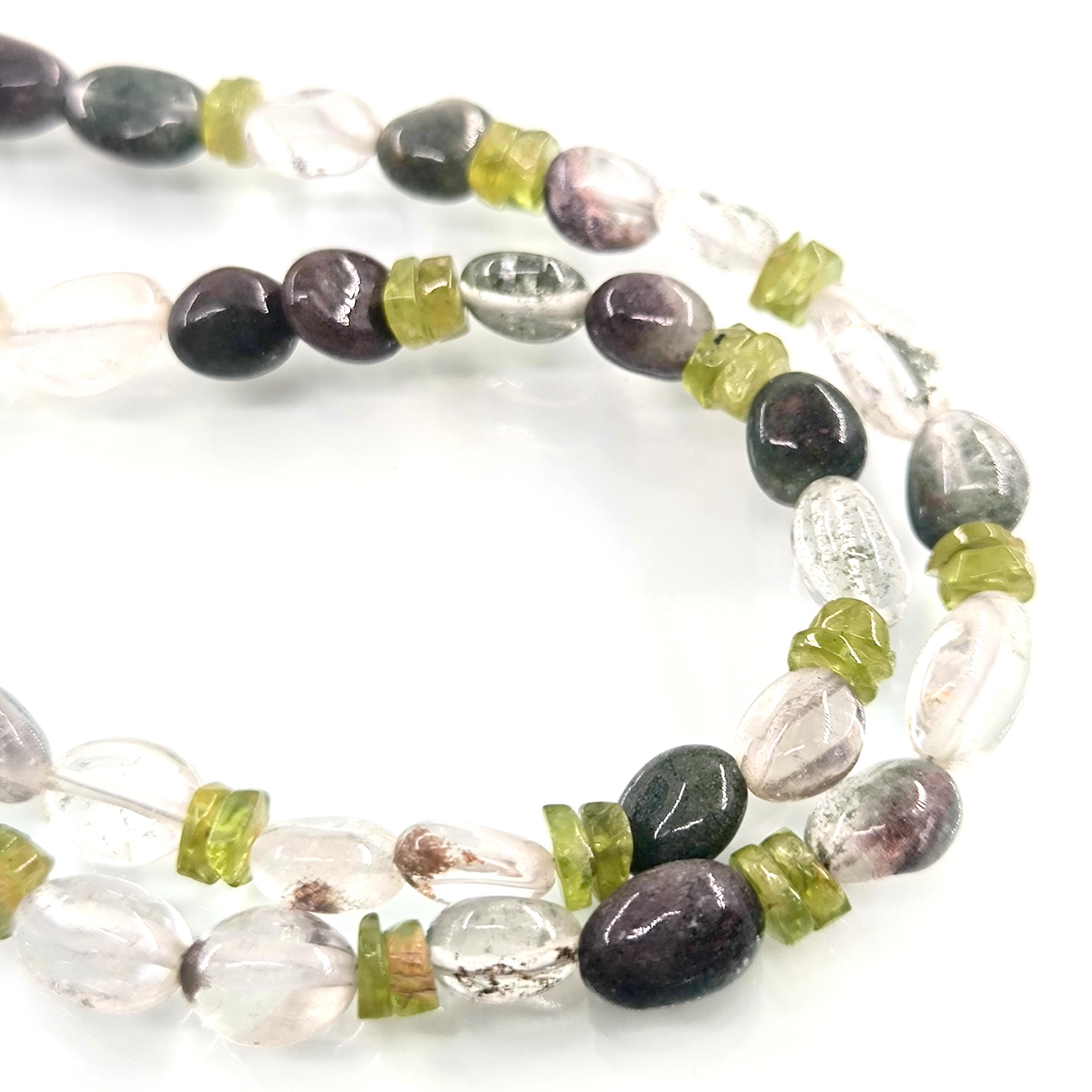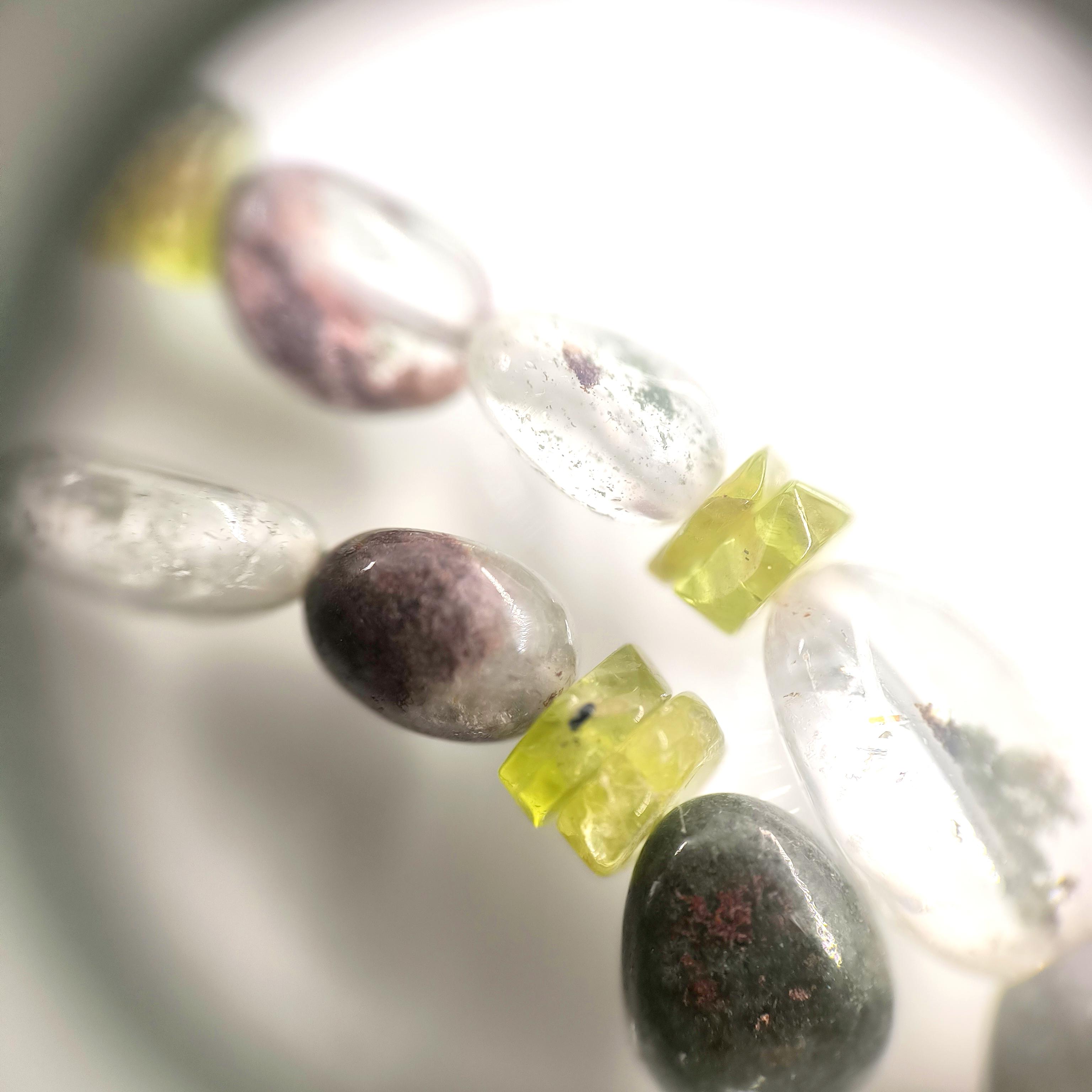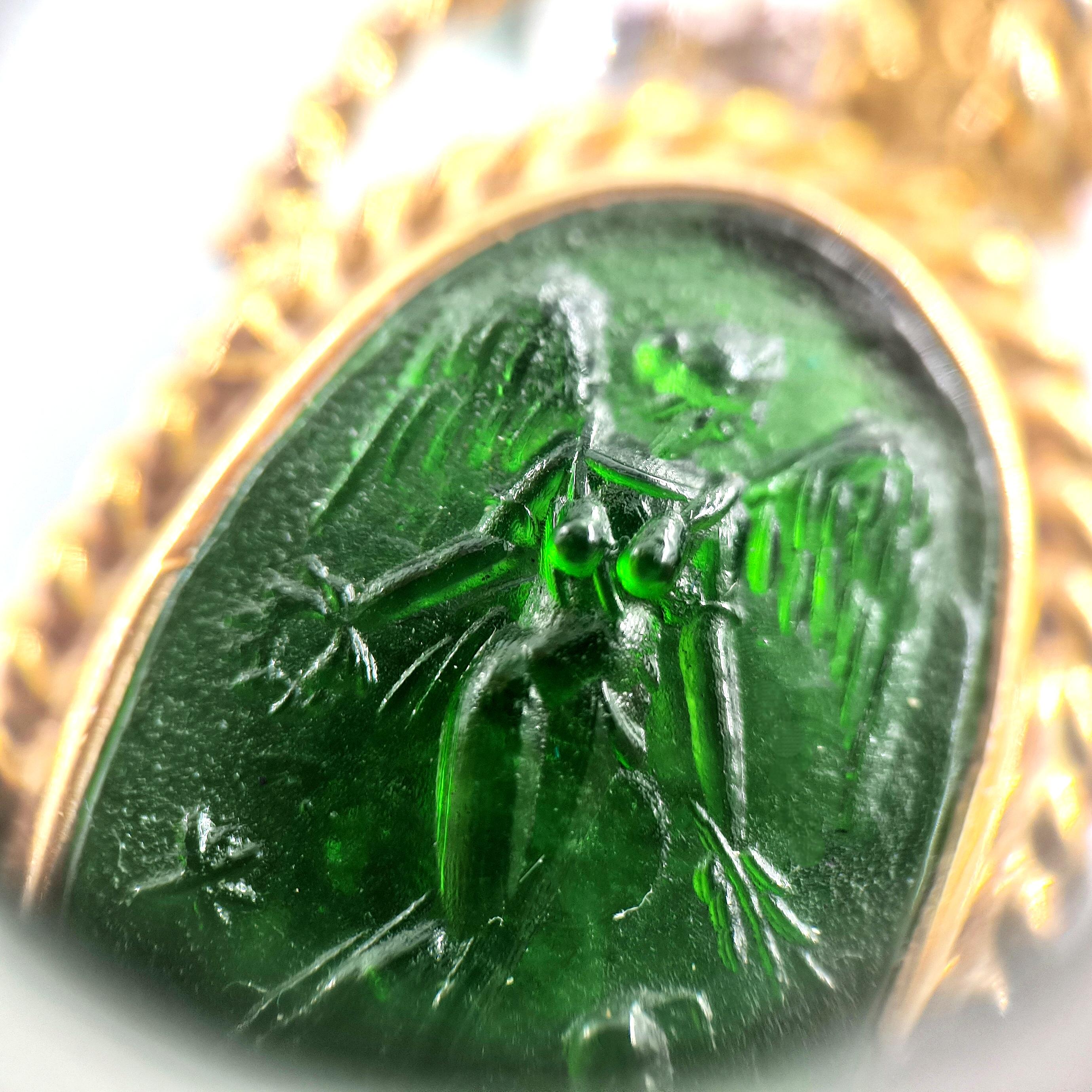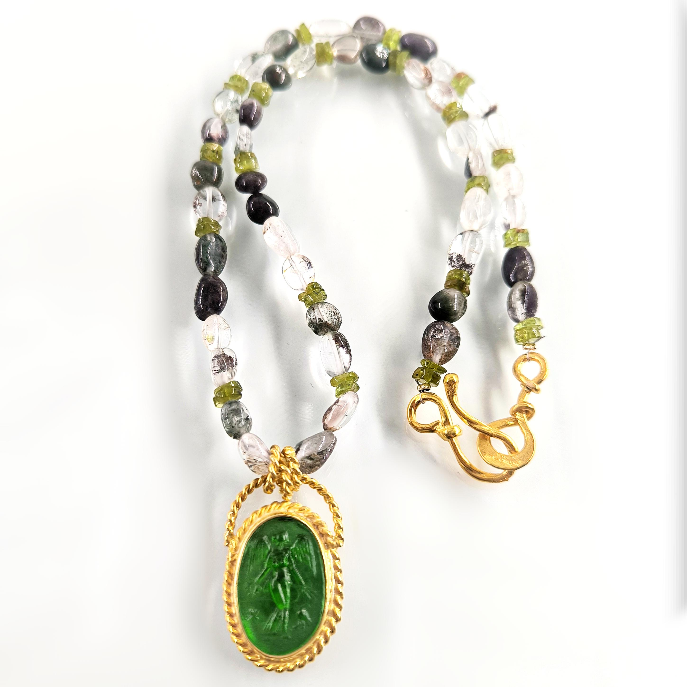 Bu tasarımda doğanın iç dünyasını taşıyan taşlarla kadim sembolleri bir araya getirdim. Zincirdeki natürel garden kuvarslar, içlerinde sakladıkları doğal izlerle adeta küçük evrenler gibi görünürken aralarındaki zebercet taşlar tasarıma canlı bir ışık katıyor. Kolye ucunda yer alan yeşil cam üzerindeki kanatlı tanrıça figürü, özgürlüğün ve ilahi koruyuculuğun kadim bir sembolüdür. Taşın altına yerleştirilen özel foya sayesinde ışıkla birlikte büyüleyici bir parıltı ve derinlik oluşur. 22 ayar Altın kaplama tamamı 925 ayar gümüş çerçevesiyle tamamlanan bu parça, boyunda taşınan mistik ve zarif bir sanat eseri gibidir.