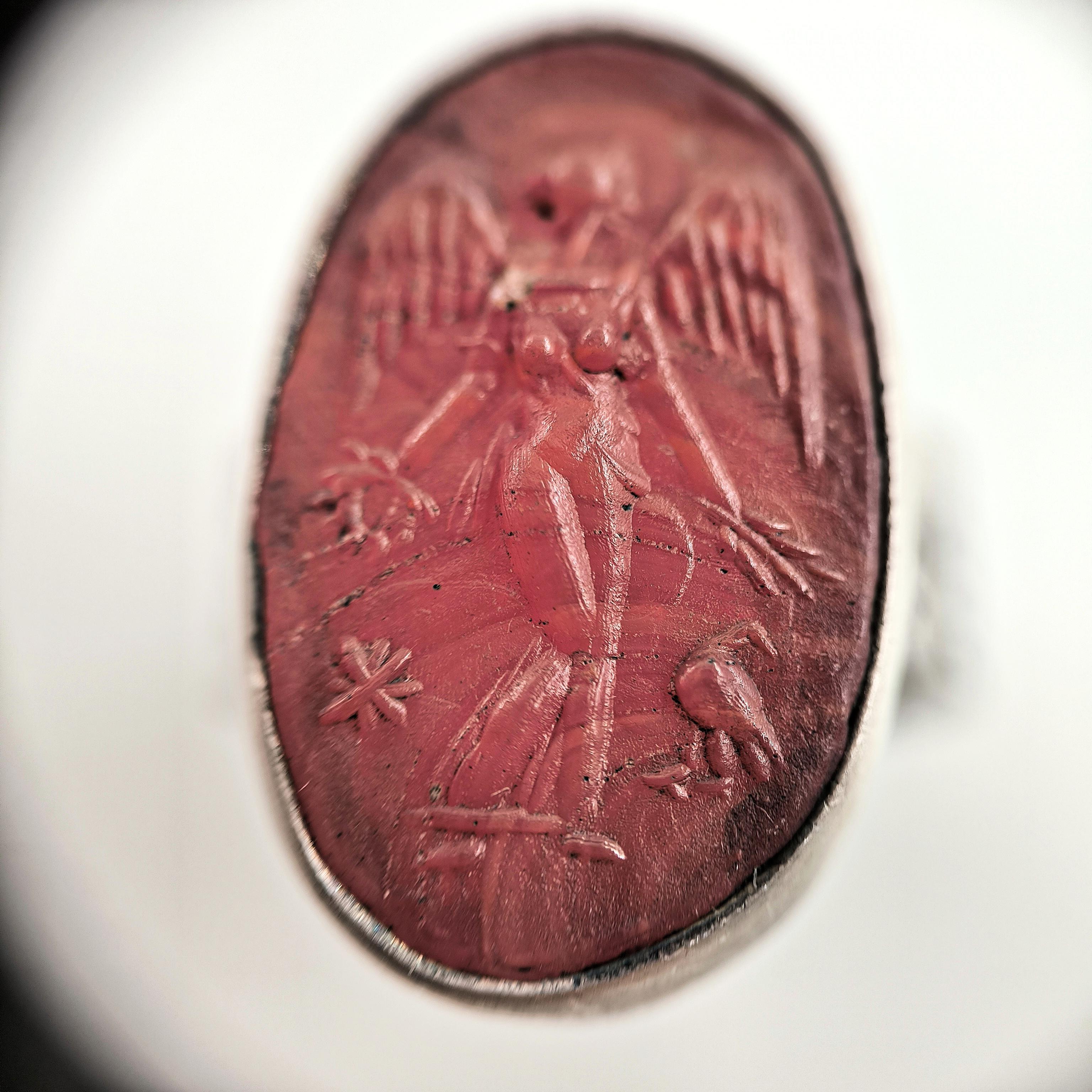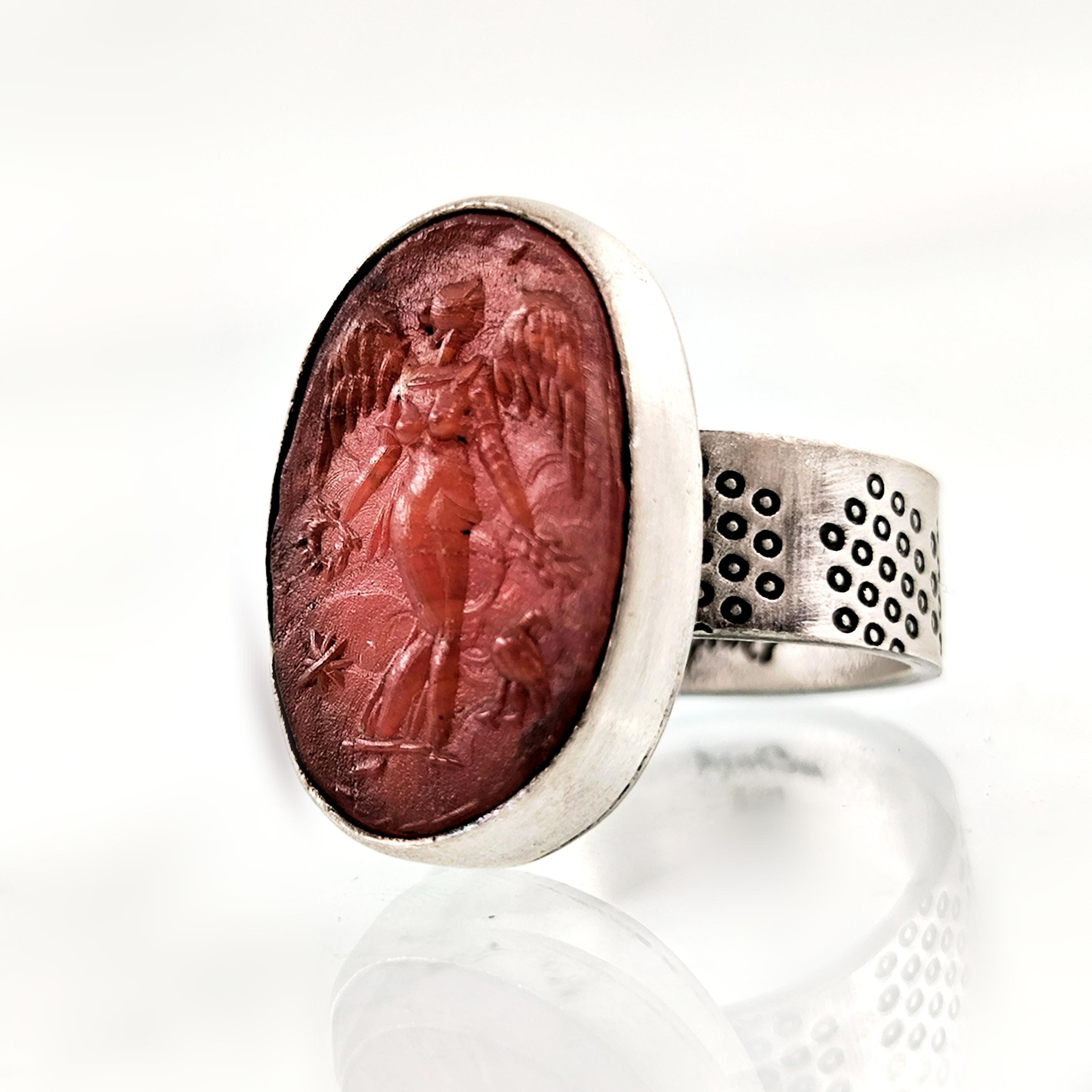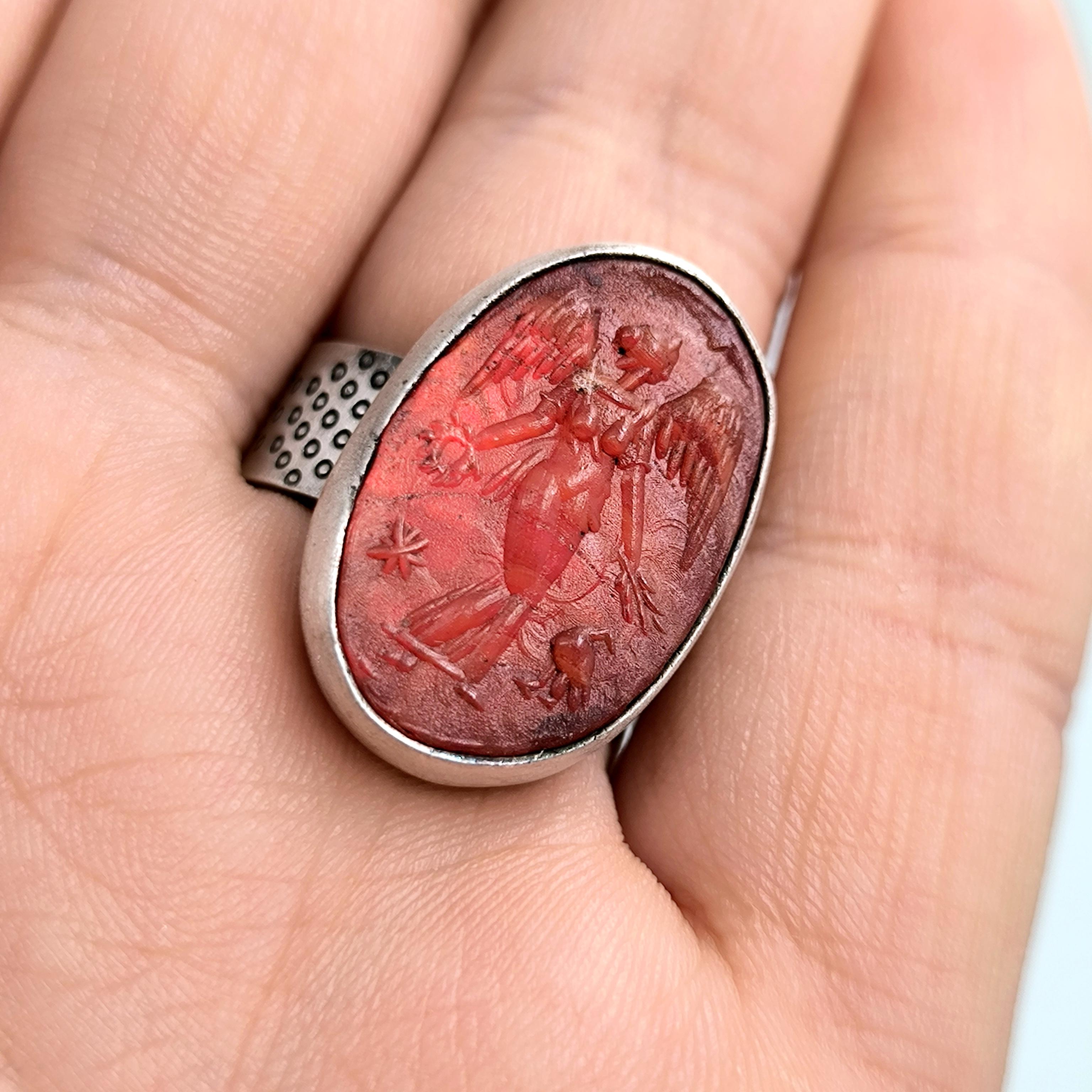 Özel presleme tekniğimle cam üzerine işlediğim bu eser, 925 ayar gümüşle çerçevelenmiş, yüzeyinde betimlenen kanatlı tanrıça figürü, kadim uygarlıkların güç, bilgelik ve zafer sembolünü taşırken; kırmızı camın derin tonu, ona hem ihtişam hem de tutku dolu bir aura katmaktadır. Tek ve eşsiz olan bu parça, tarihî ve mitolojik bir öyküyü parmağınızda taşımanızı sağlar.