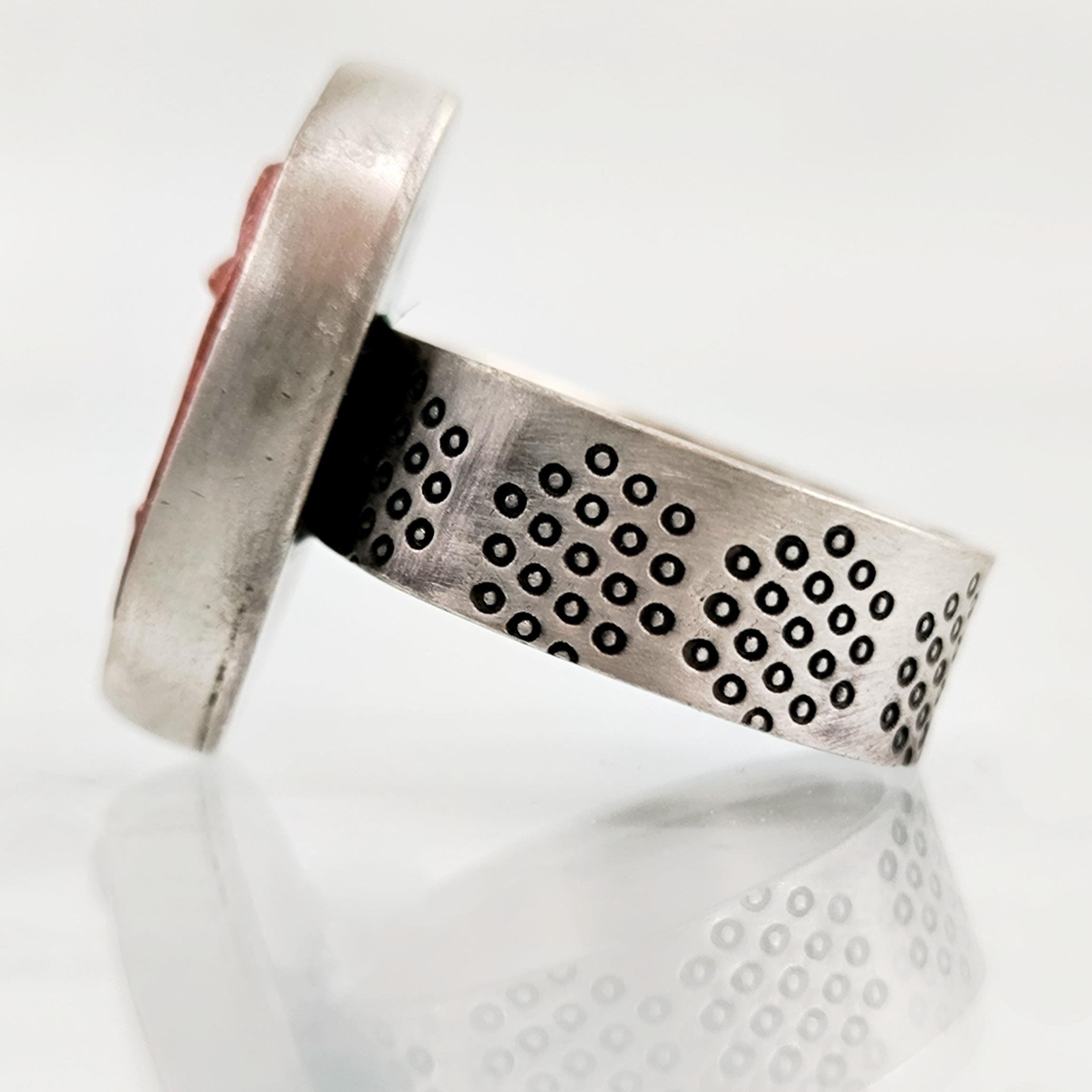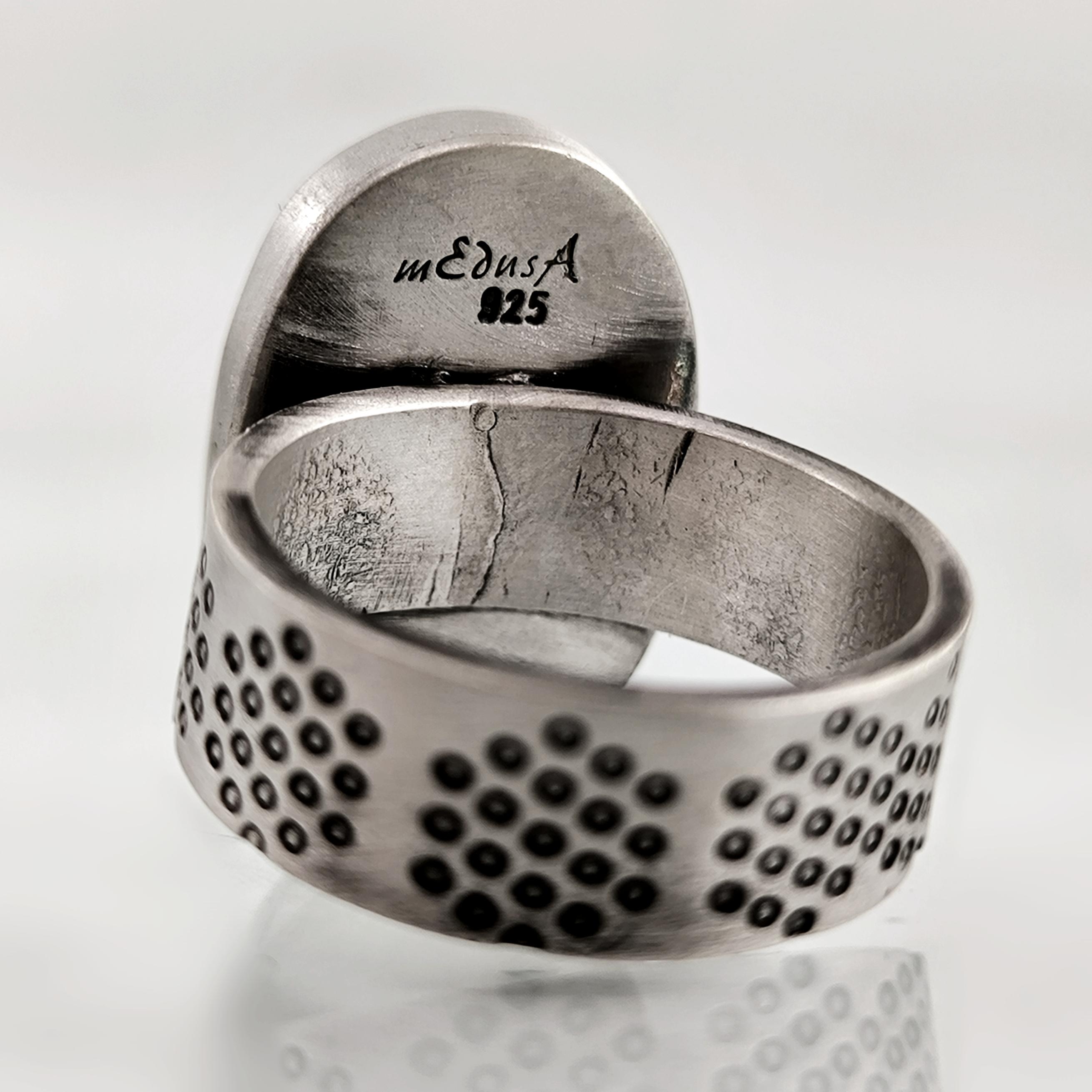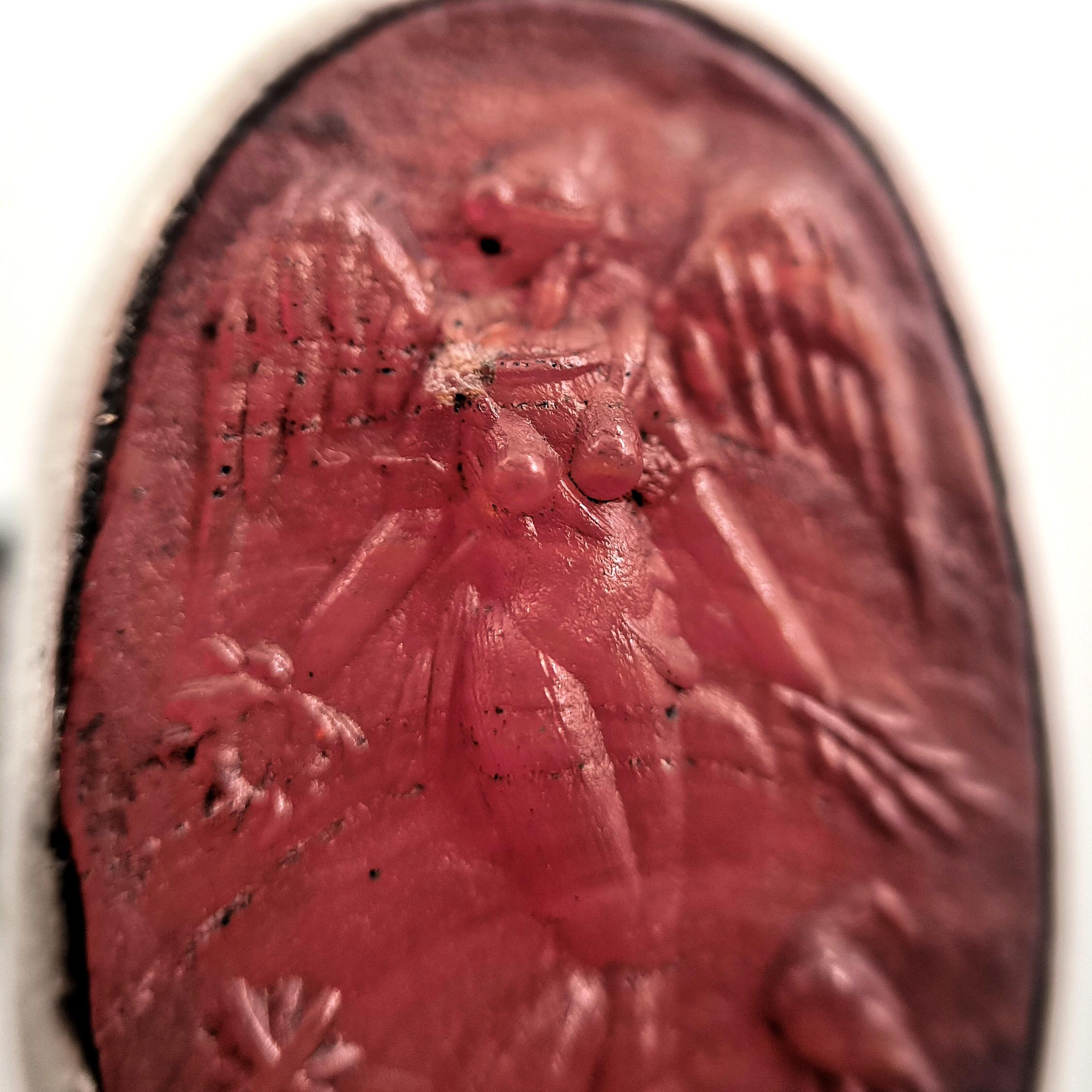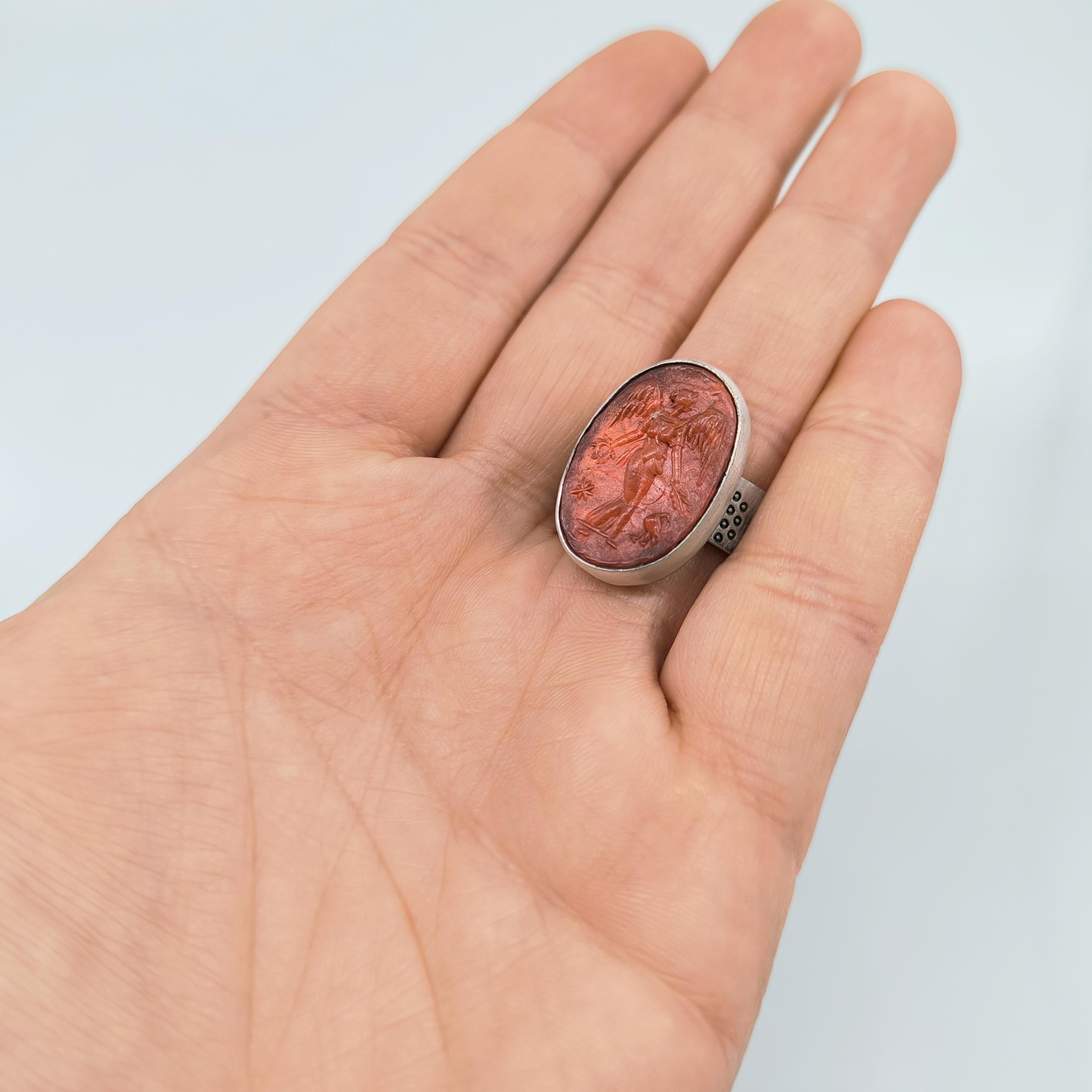 Özel presleme tekniğimle cam üzerine işlediğim bu eser, 925 ayar gümüşle çerçevelenmiş, yüzeyinde betimlenen kanatlı tanrıça figürü, kadim uygarlıkların güç, bilgelik ve zafer sembolünü taşırken; kırmızı camın derin tonu, ona hem ihtişam hem de tutku dolu bir aura katmaktadır. Tek ve eşsiz olan bu parça, tarihî ve mitolojik bir öyküyü parmağınızda taşımanızı sağlar.