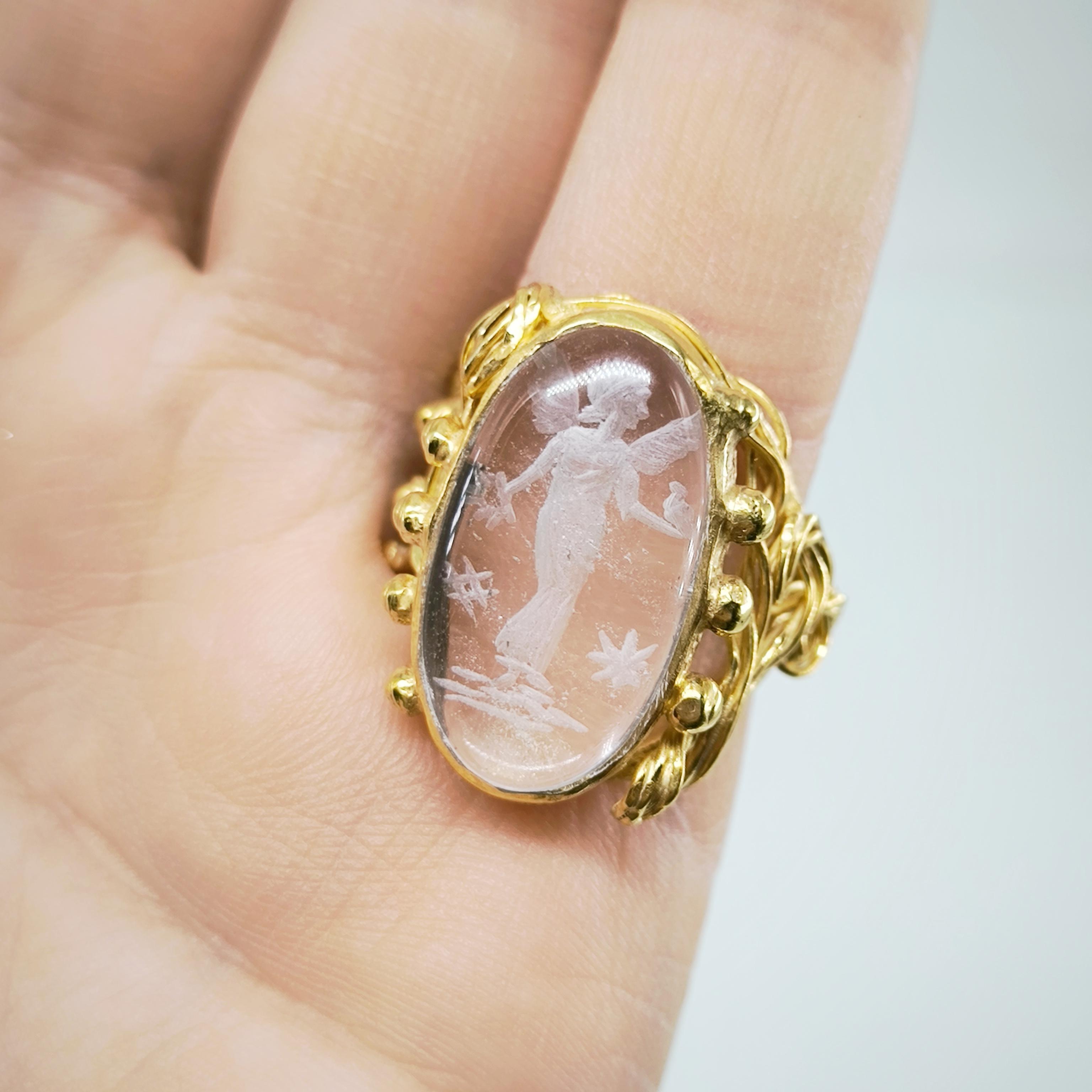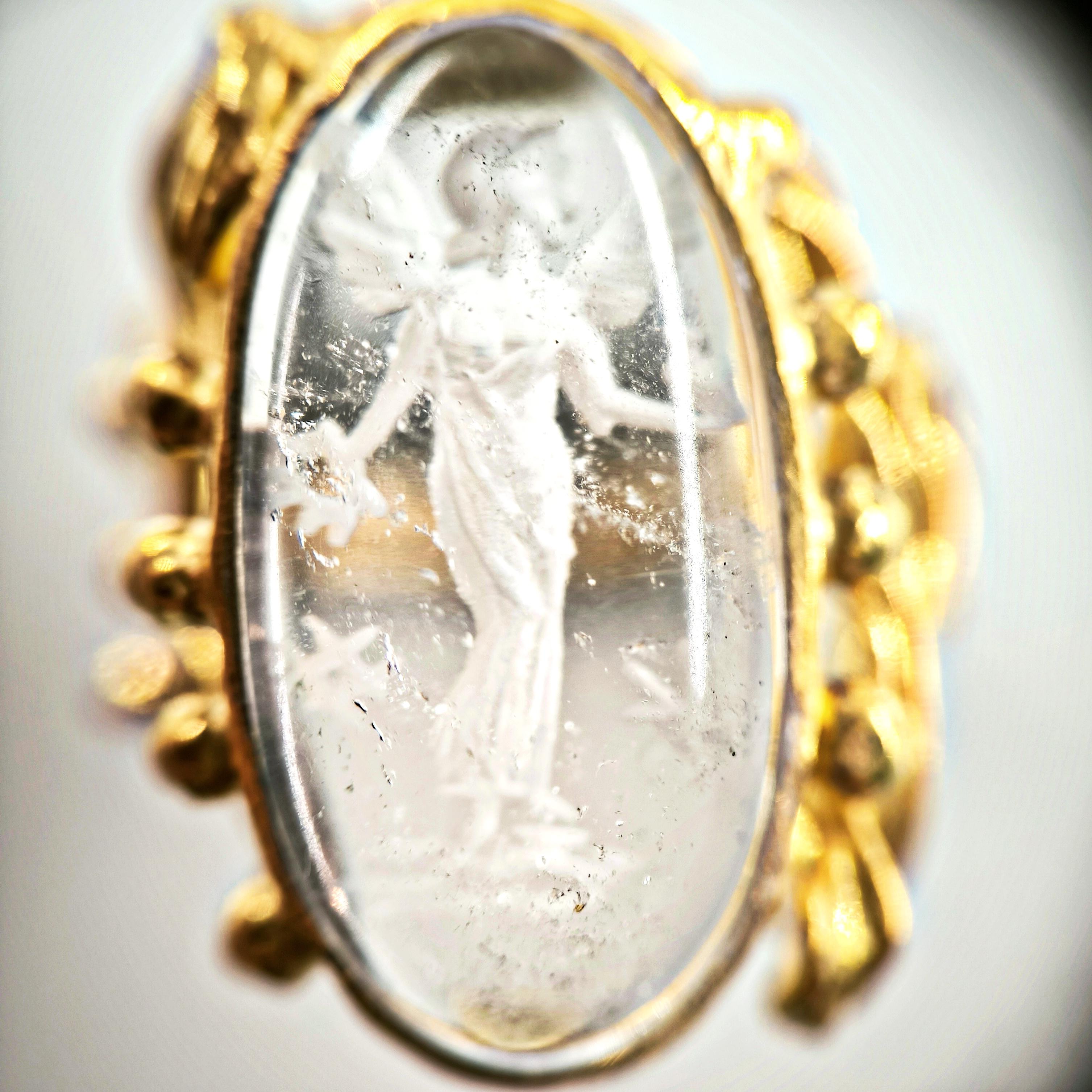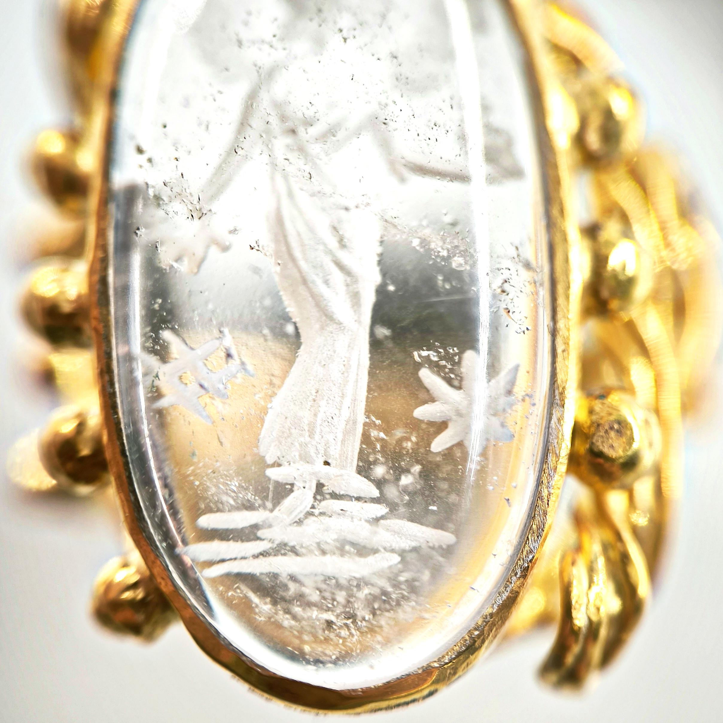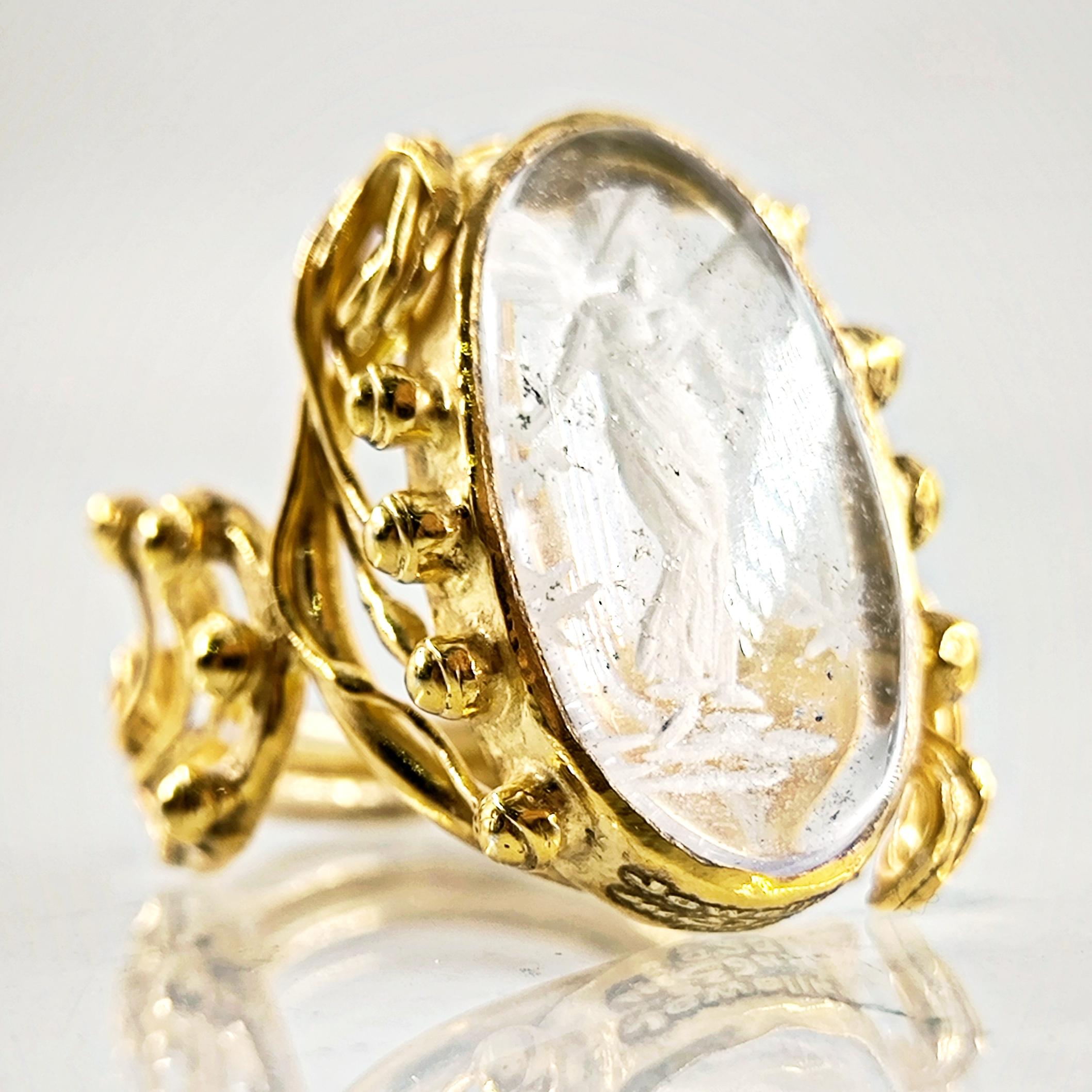 Kuvars taşın derinliklerine işlenmiş negatif intaglio tekniğiyle zarif bir kanatlı tanrıça figürü… Her detayı ustalıkla oyulmuş bu eser, antik çağlardan günümüze uzanan mistik bir hikâyeyi parmaklarınızda taşır. Özenle hazırlanmış 925 ayar gümüş yüzük, altın kaplama ile tamamlanarak göz alıcı bir ihtişam kazanmıştır. Hem sanat değeri hem de ruhani anlamı ile zamansız bir mücevherdir; gücü, korumayı ve ilahi zarafeti simgeler.