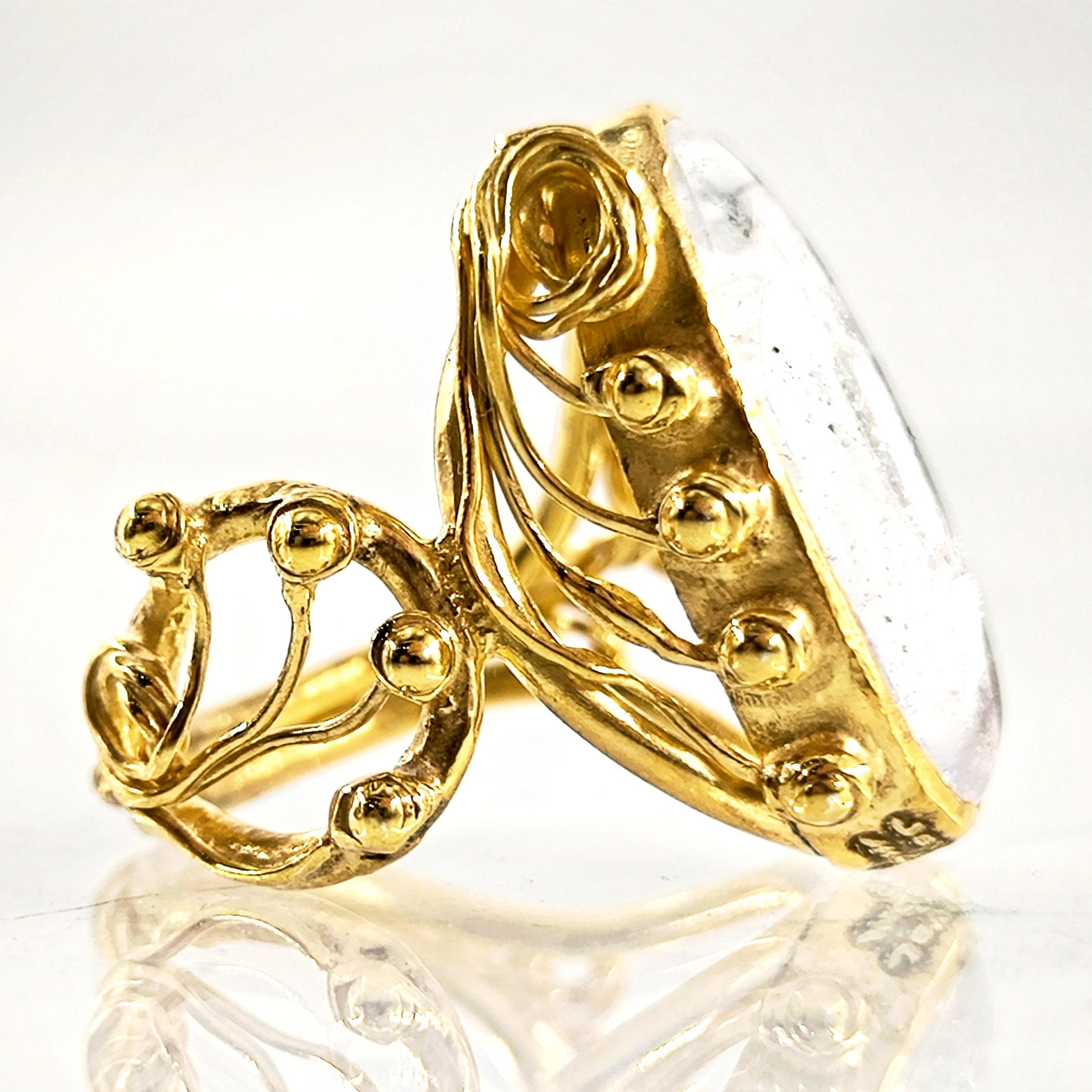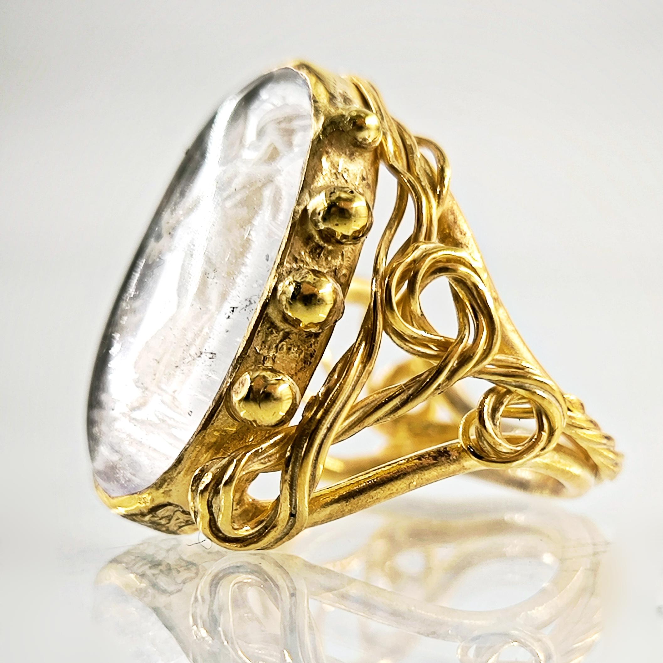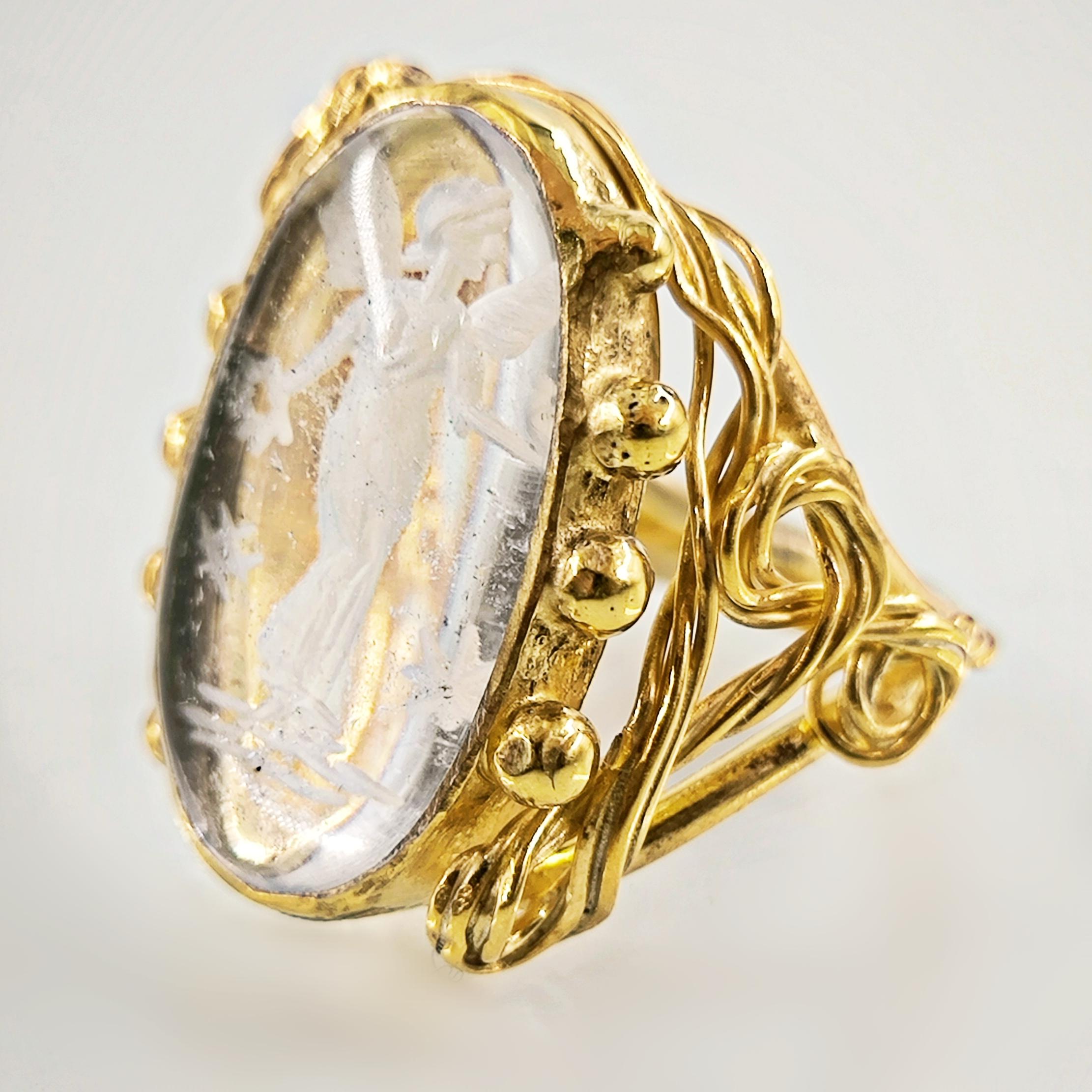 Kuvars taşın derinliklerine işlenmiş negatif intaglio tekniğiyle zarif bir kanatlı tanrıça figürü… Her detayı ustalıkla oyulmuş bu eser, antik çağlardan günümüze uzanan mistik bir hikâyeyi parmaklarınızda taşır. Özenle hazırlanmış 925 ayar gümüş yüzük, altın kaplama ile tamamlanarak göz alıcı bir ihtişam kazanmıştır. Hem sanat değeri hem de ruhani anlamı ile zamansız bir mücevherdir; gücü, korumayı ve ilahi zarafeti simgeler.