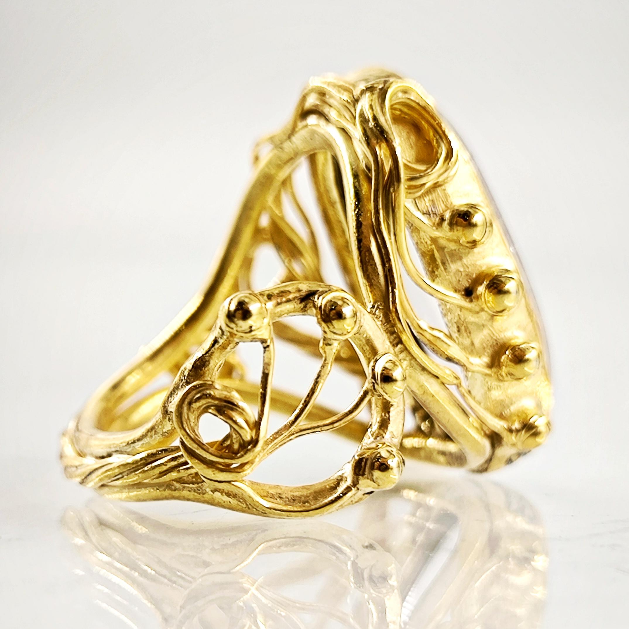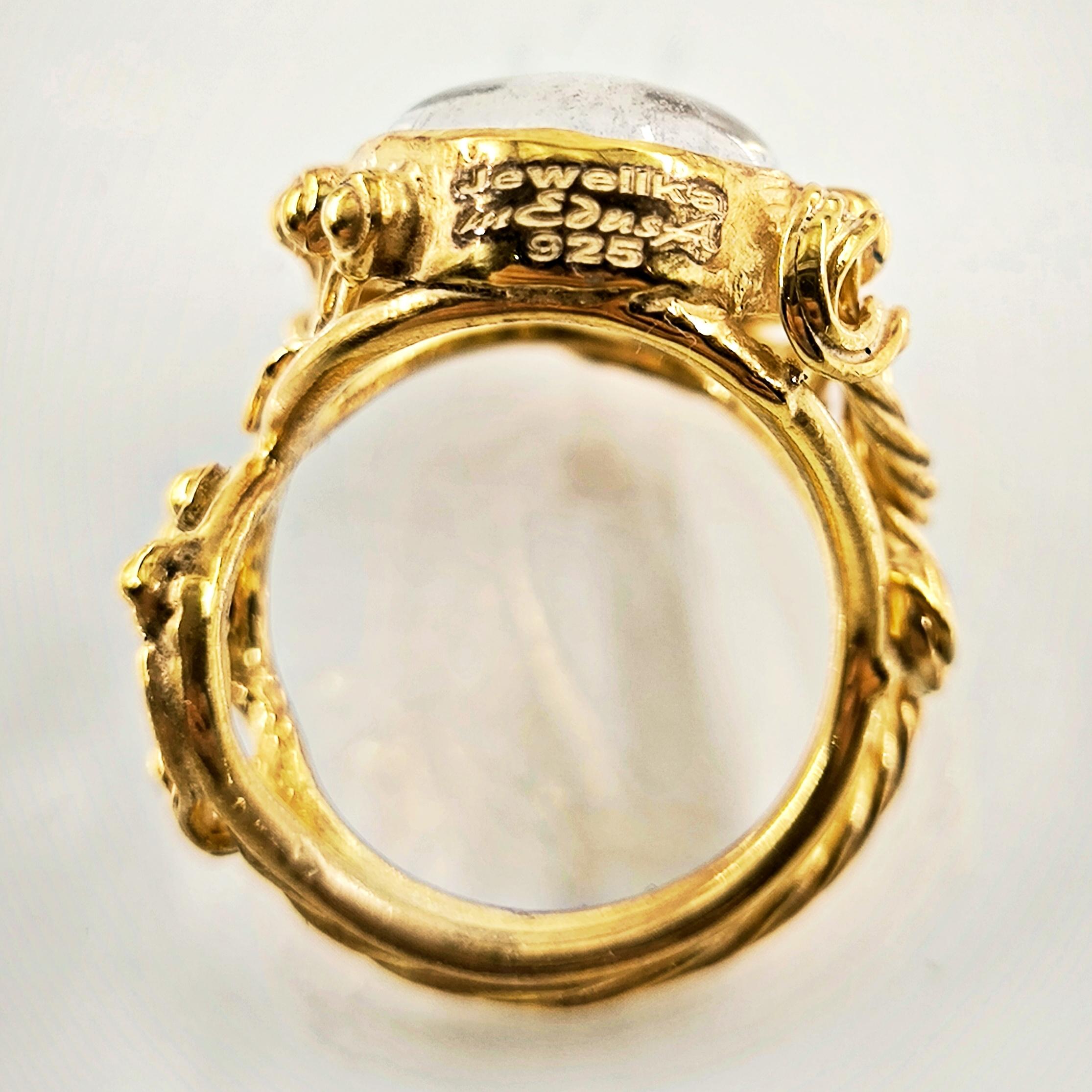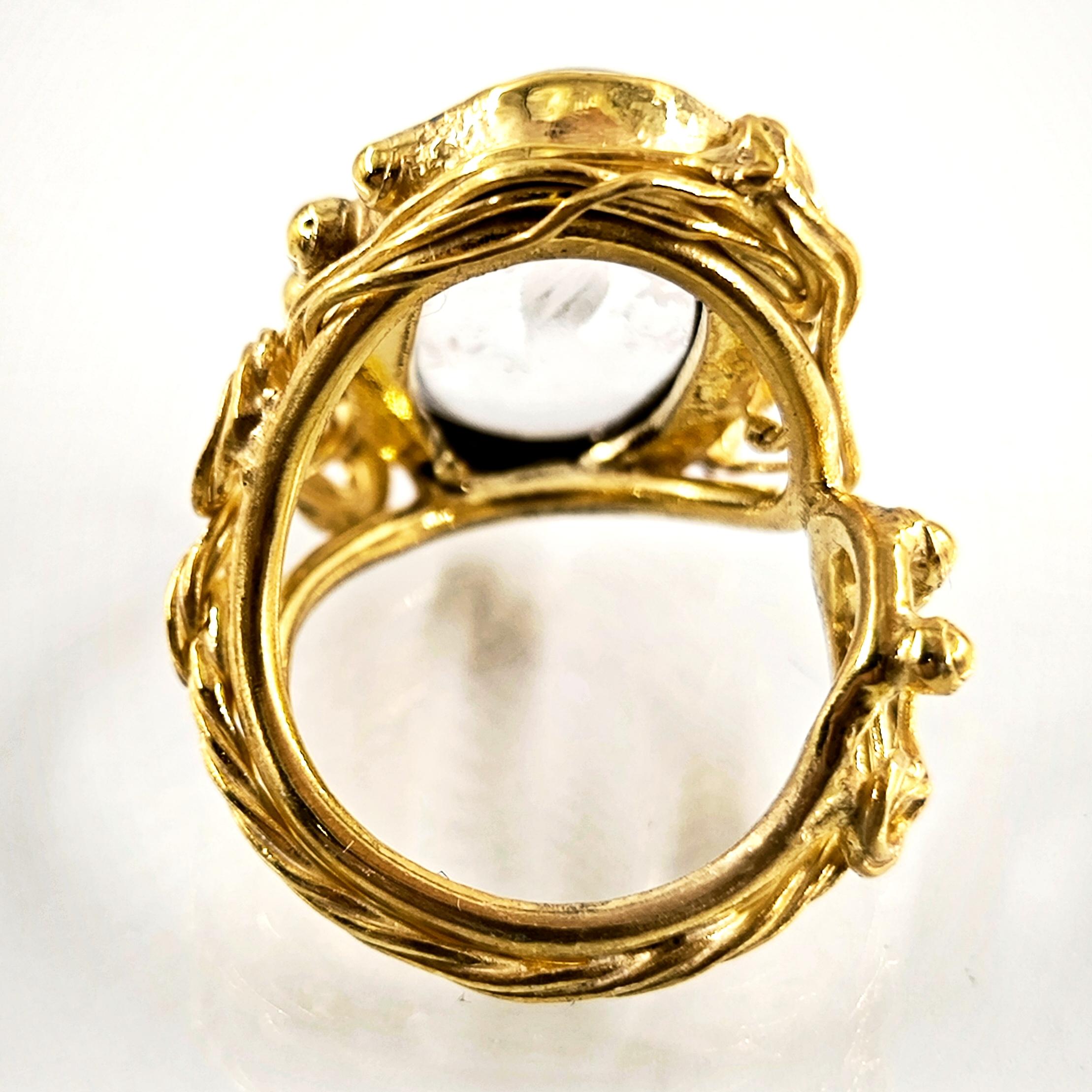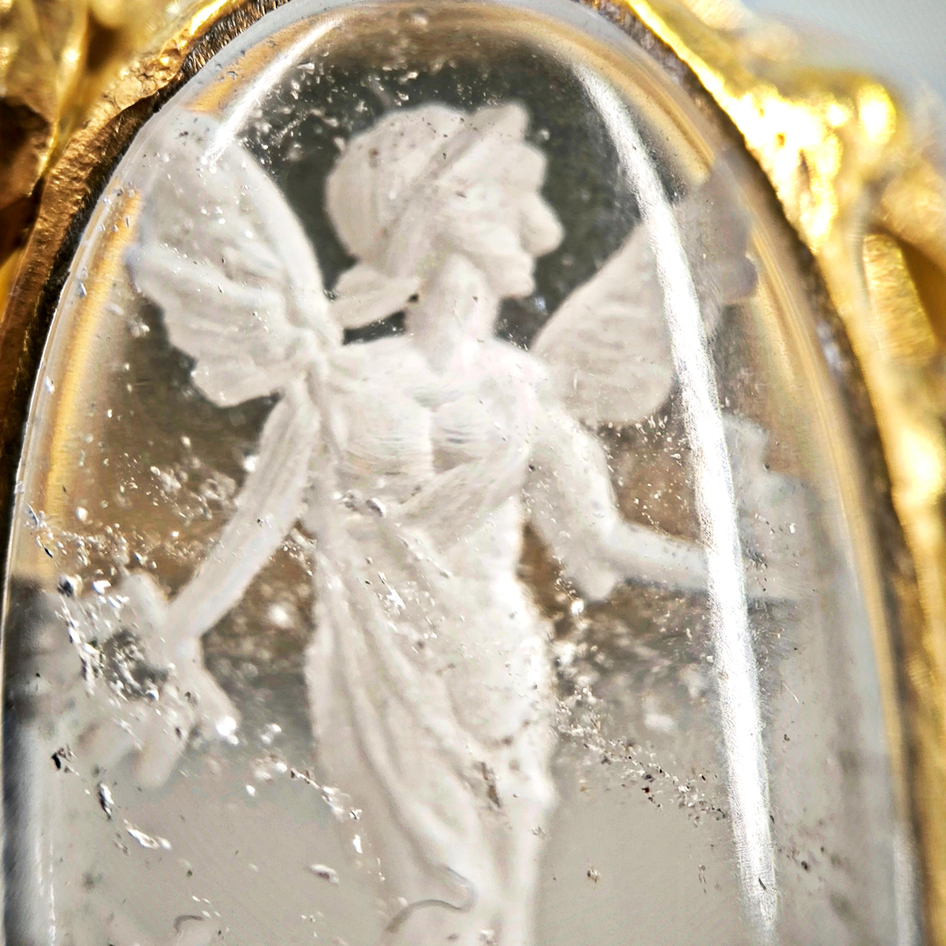 Kuvars taşın derinliklerine işlenmiş negatif intaglio tekniğiyle zarif bir kanatlı tanrıça figürü… Her detayı ustalıkla oyulmuş bu eser, antik çağlardan günümüze uzanan mistik bir hikâyeyi parmaklarınızda taşır. Özenle hazırlanmış 925 ayar gümüş yüzük, altın kaplama ile tamamlanarak göz alıcı bir ihtişam kazanmıştır. Hem sanat değeri hem de ruhani anlamı ile zamansız bir mücevherdir; gücü, korumayı ve ilahi zarafeti simgeler.