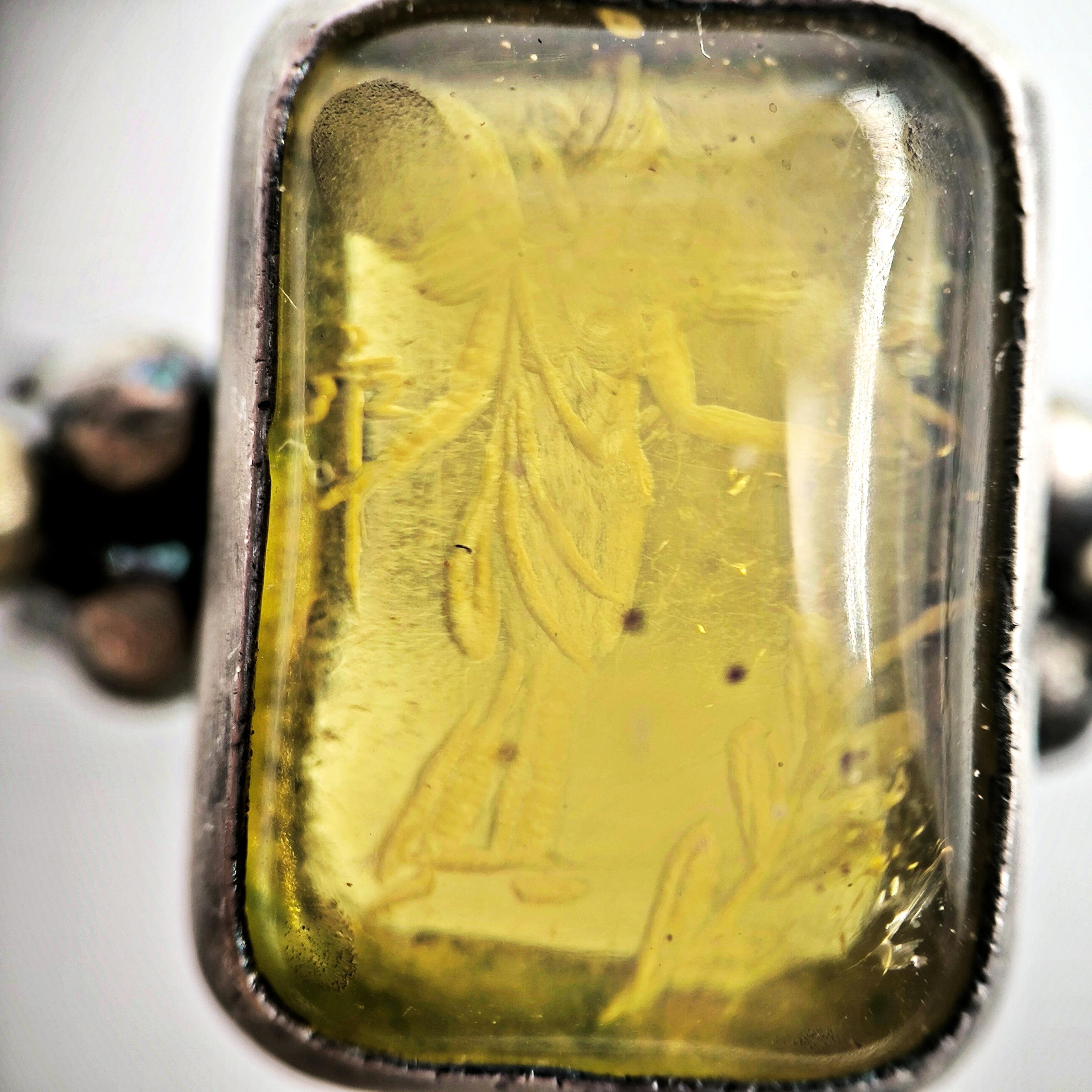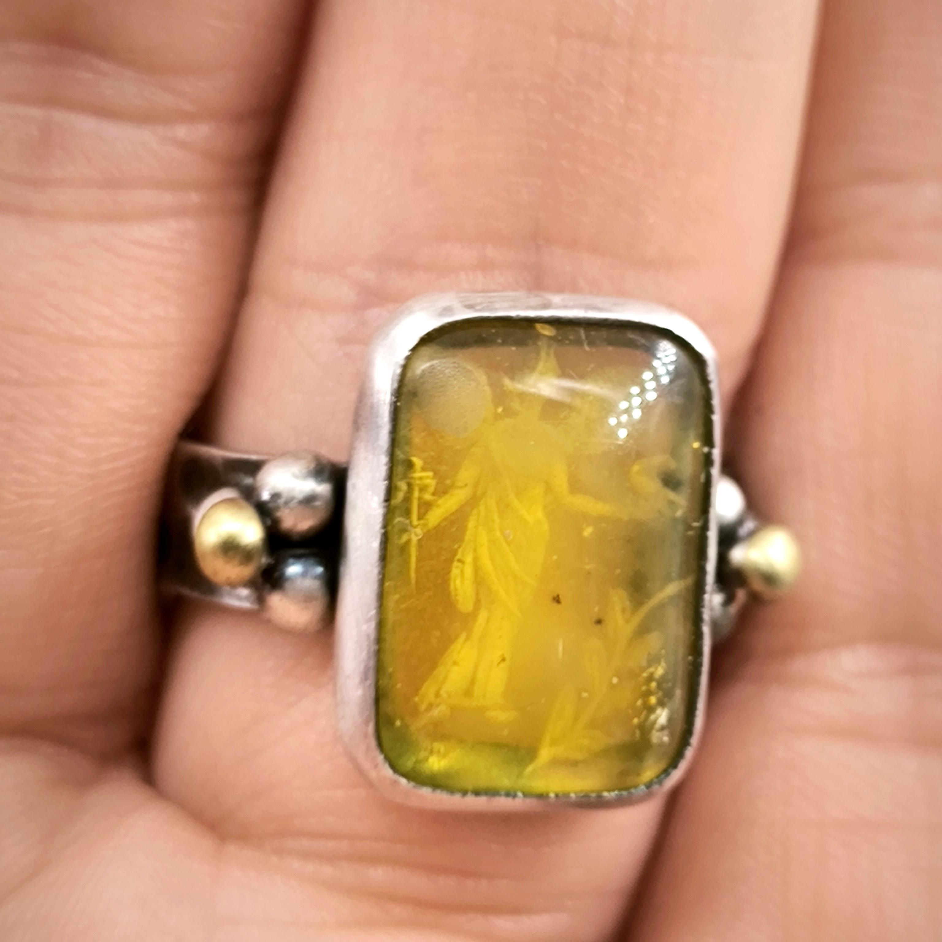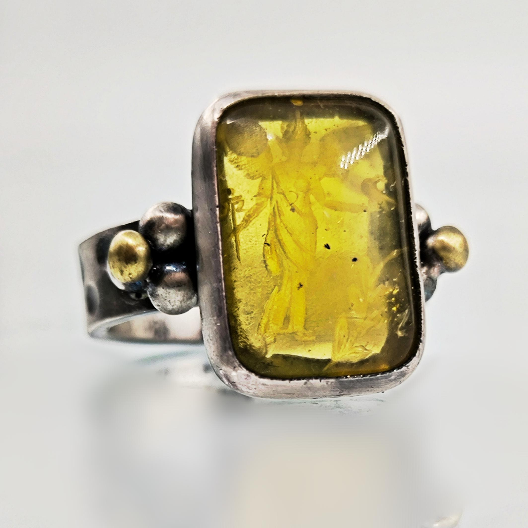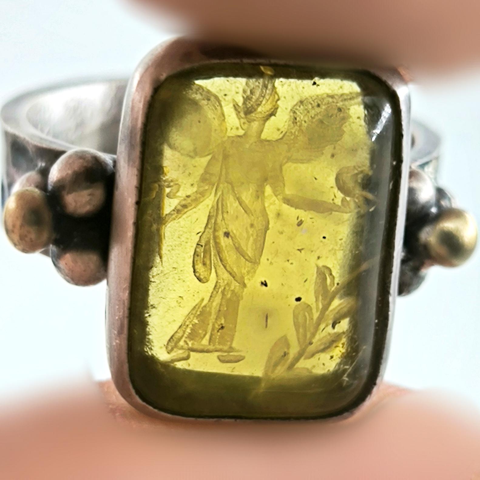 KANATLI TANRIÇA TASVİRLİ DAMLA KEHRİBAR ANTİK STİL 925 AYAR GÜMÜŞ YÜZÜK