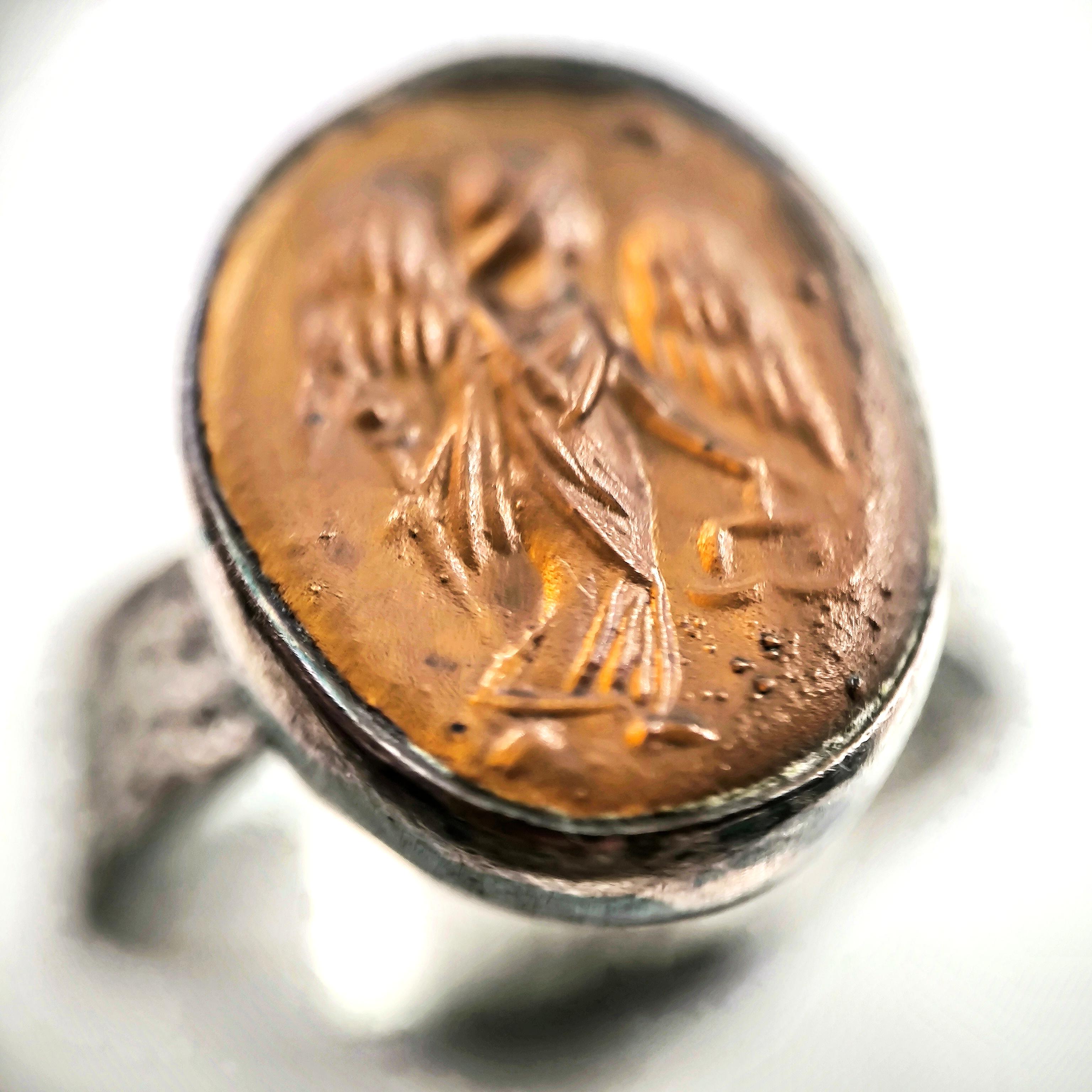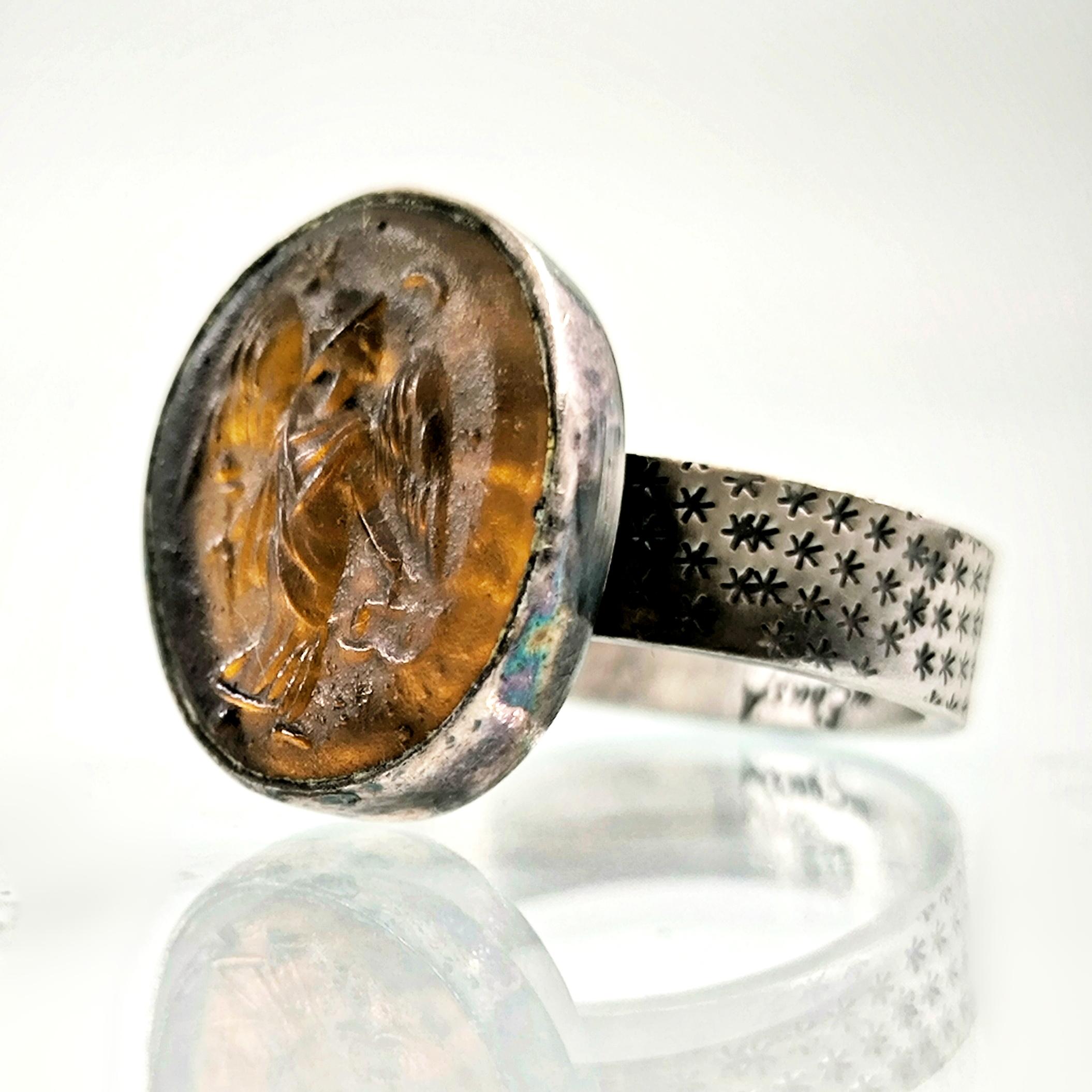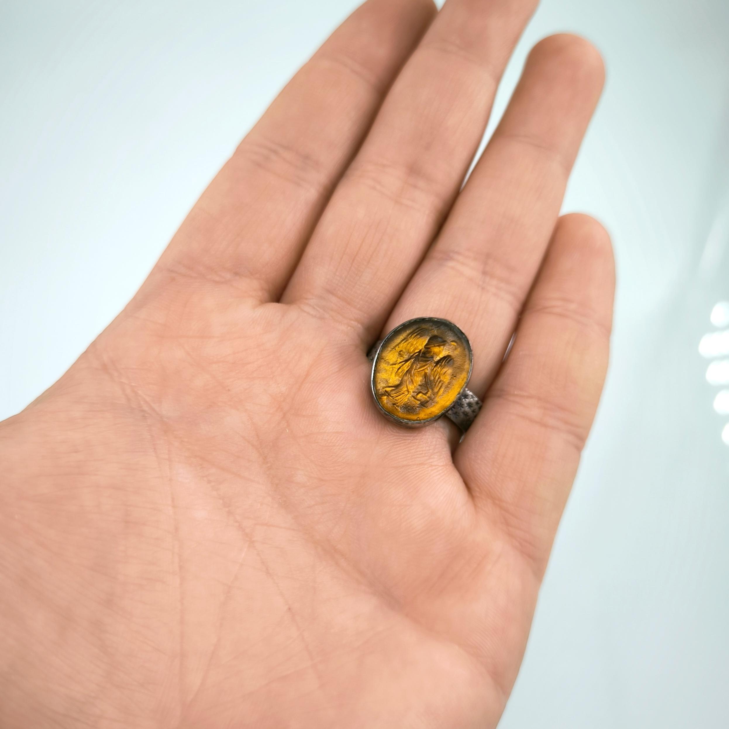 Bal rengi tonlarında antik cam üzerine işlenmiş kabartma figür, Roma mitolojisinin Zafer Tanrıçası Victoria’yı betimliyor. Kanatlarının zarif hareketi ve elindeki zafer sembolleri, antik dünyanın görkemini bugüne taşıyor. Yüzüğün altına yerleştirilen ince folyo, ışığı kırarak cama janjanlı ve derin bir ışıltı kazandırıyor. 925 ayar gümüş gövde, el işçiliğinin izlerini gururla taşıyor.