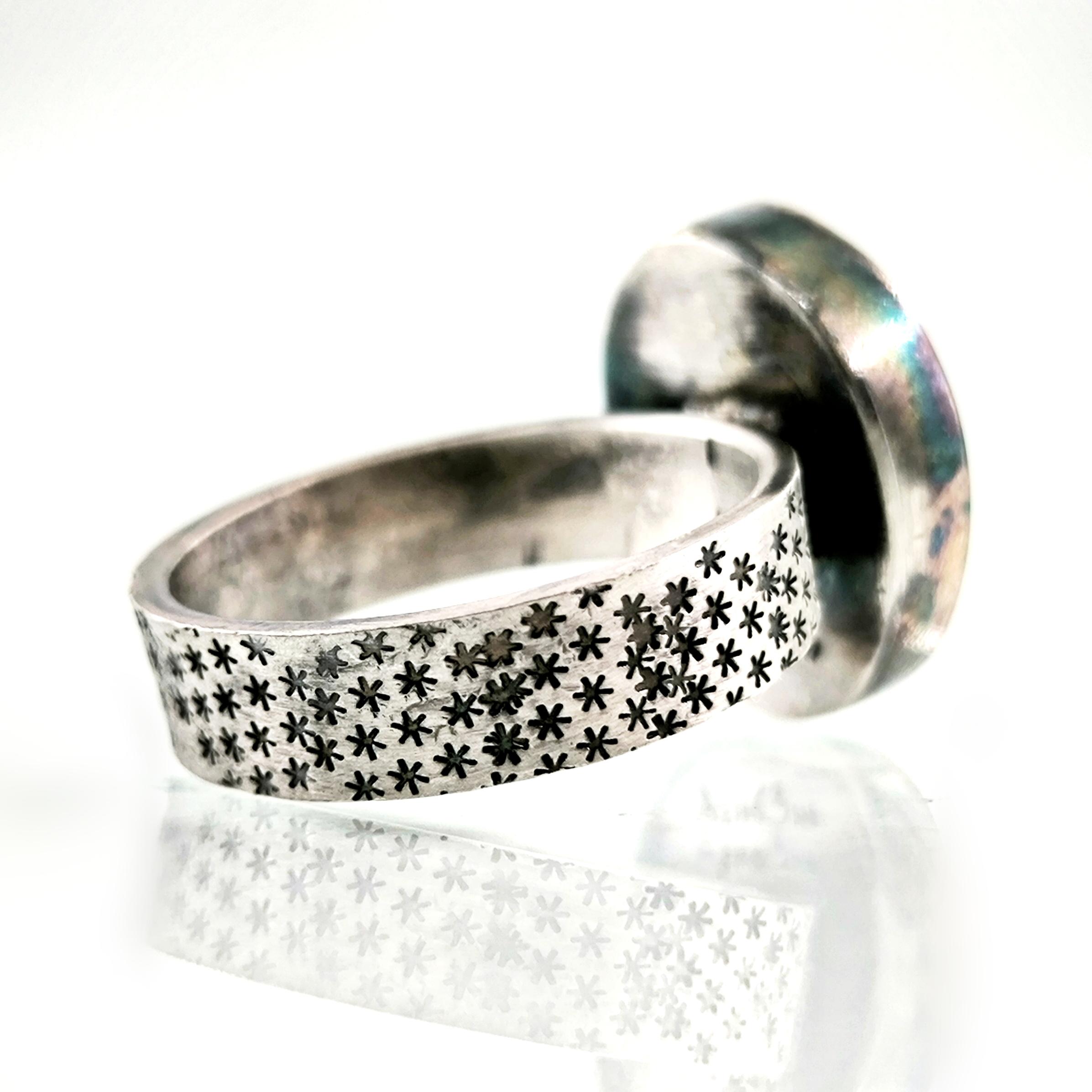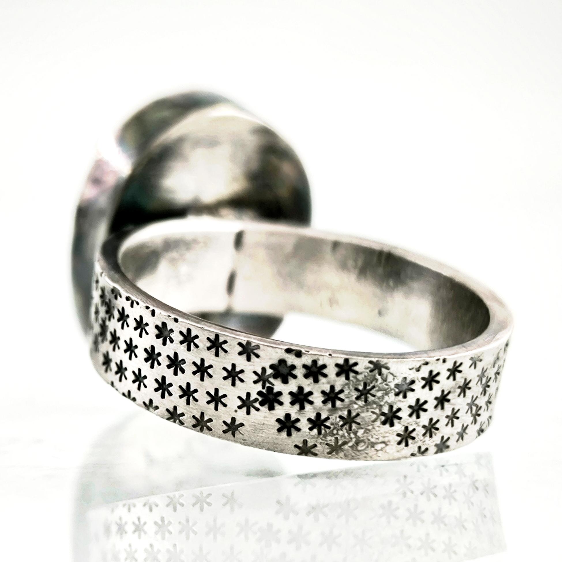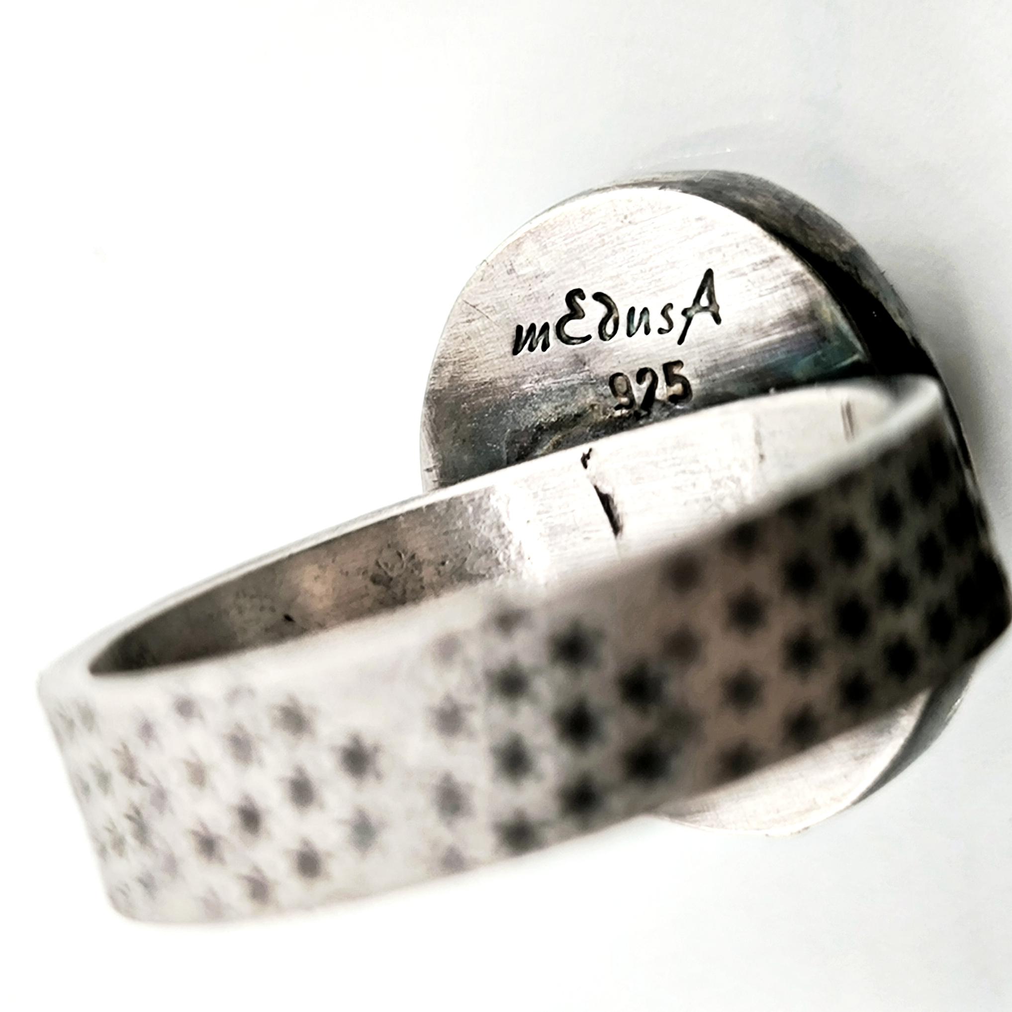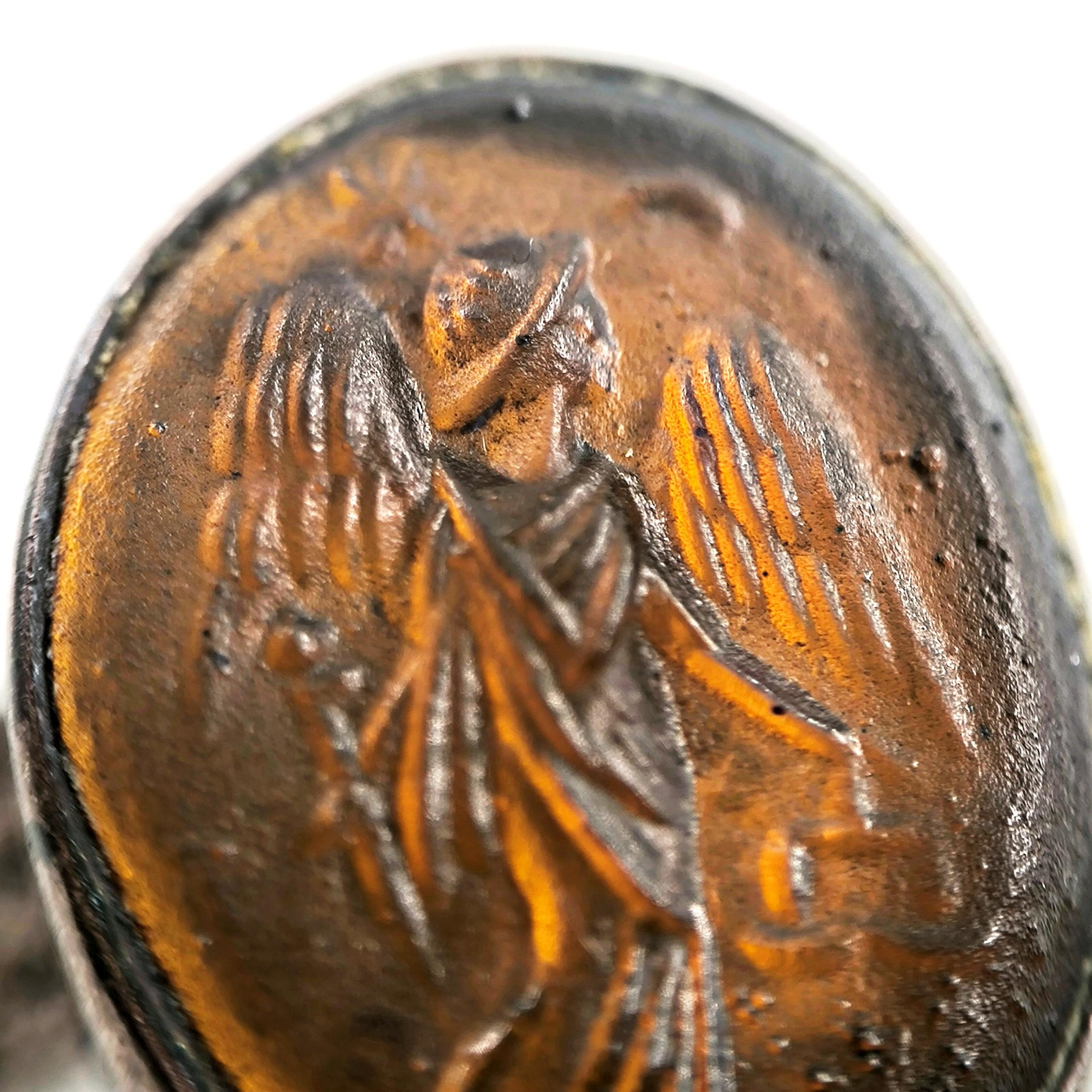 Bal rengi tonlarında antik cam üzerine işlenmiş kabartma figür, Roma mitolojisinin Zafer Tanrıçası Victoria’yı betimliyor. Kanatlarının zarif hareketi ve elindeki zafer sembolleri, antik dünyanın görkemini bugüne taşıyor. Yüzüğün altına yerleştirilen ince folyo, ışığı kırarak cama janjanlı ve derin bir ışıltı kazandırıyor. 925 ayar gümüş gövde, el işçiliğinin izlerini gururla taşıyor.