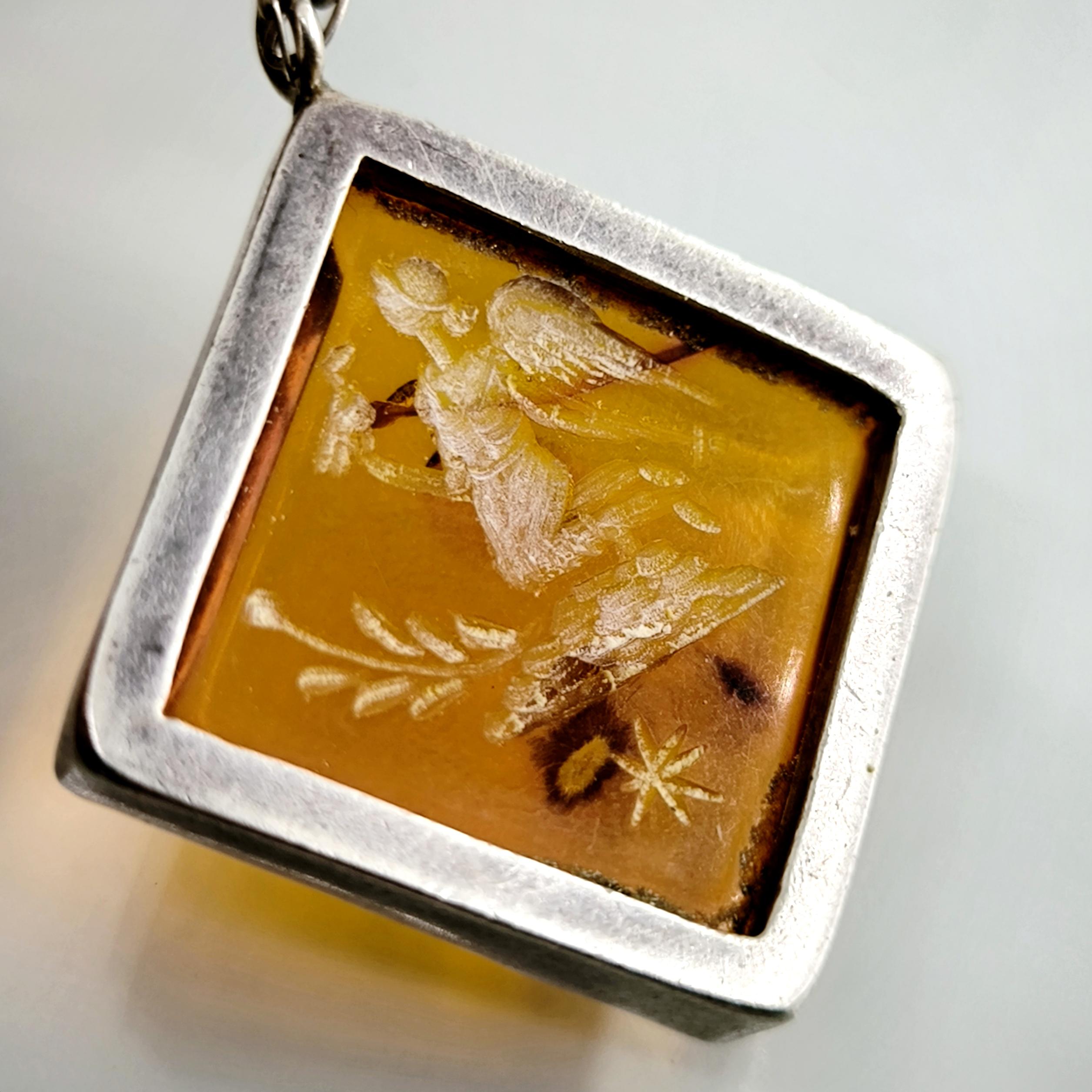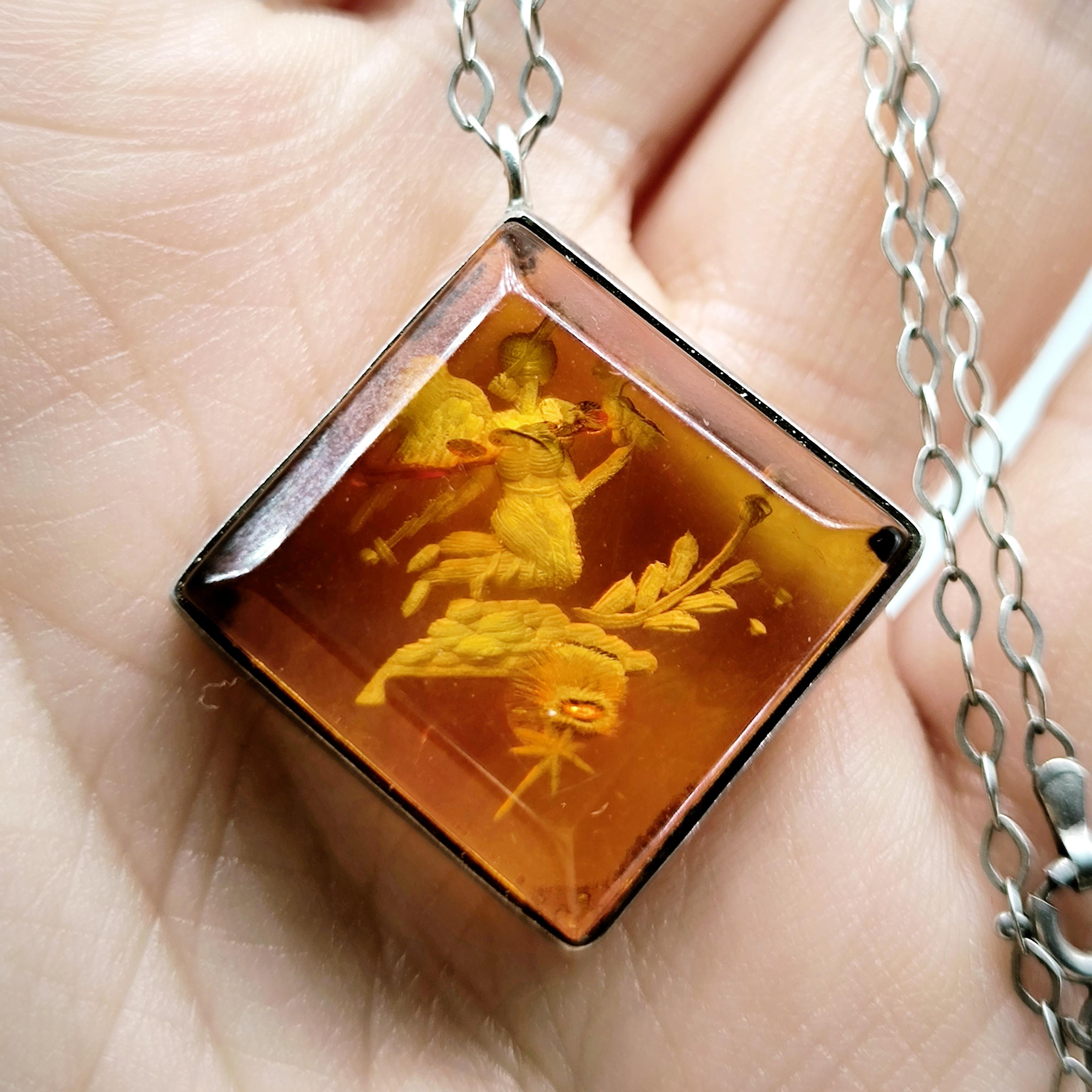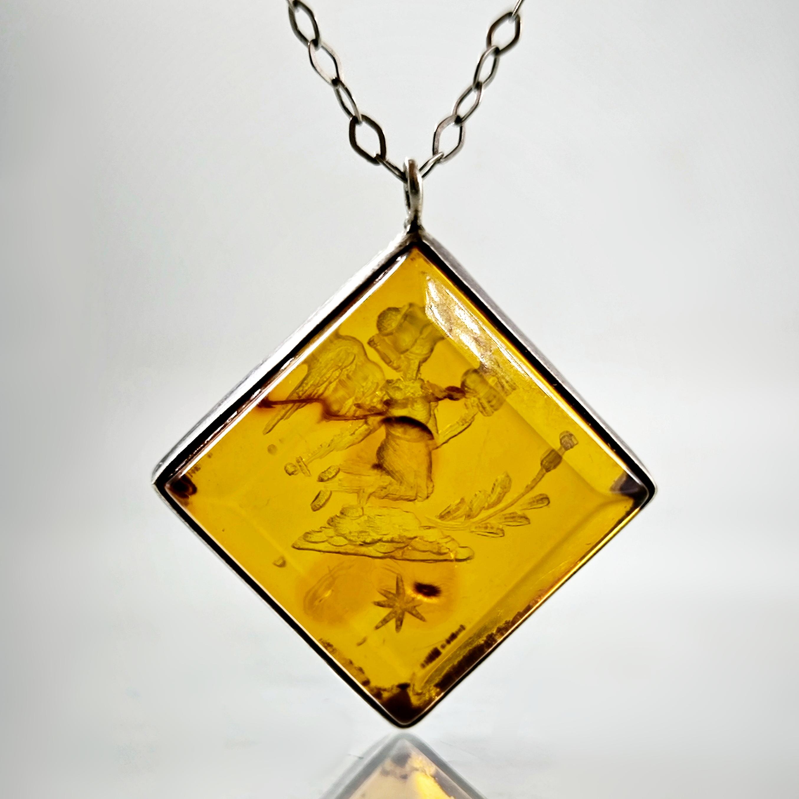 Adeta yağlı boya tablo görselliğinde mEdusA eseri kehribar kolye! 1960'lardan bir kehribar üzerine 925 Ayar Gümüş çerçeve ve zincir kombini yaptığımız, Kehribara negatif intaglio tekniği ile ''Melek'' intagliosu çalıştığımız çok güzel bir mEdusA eseri kolye!