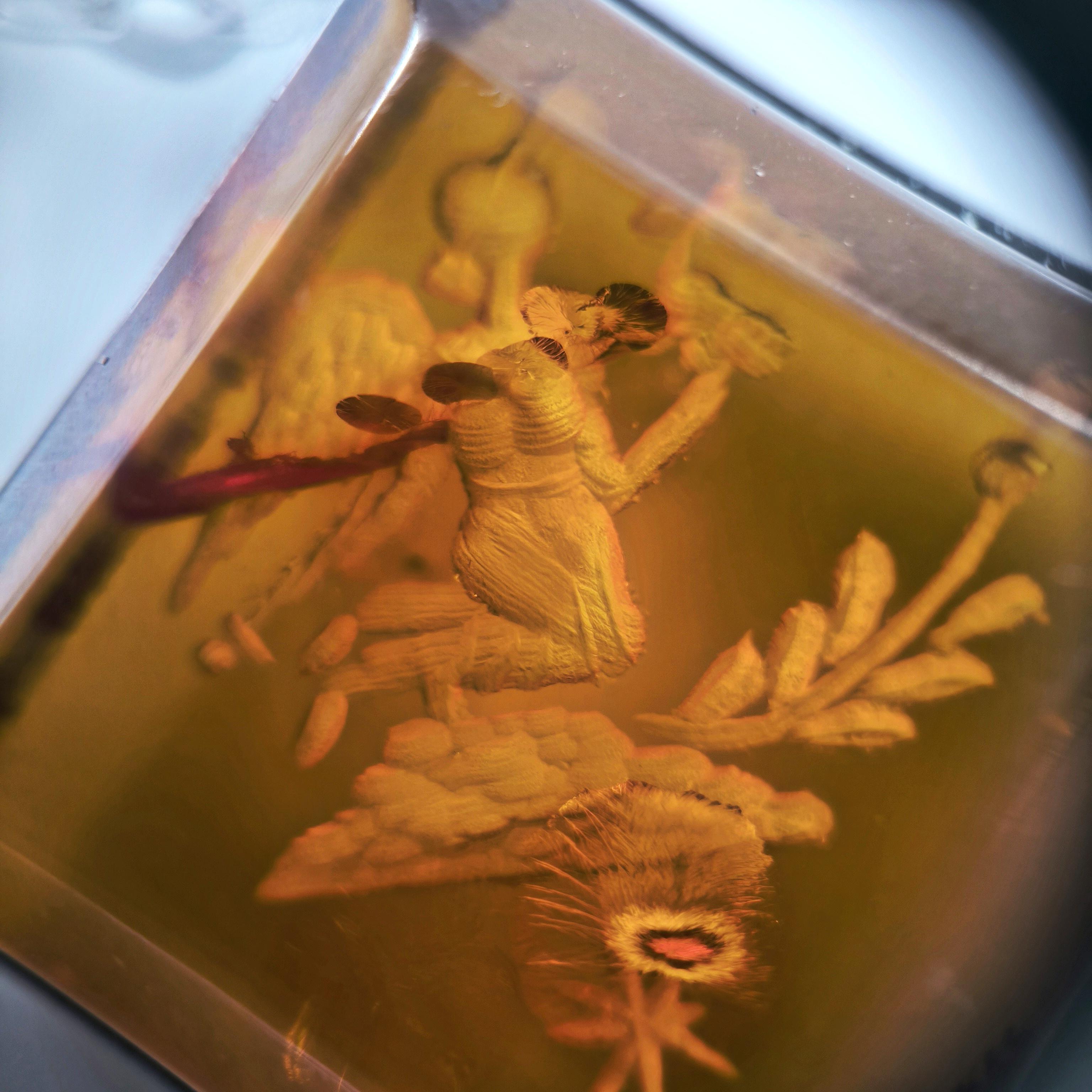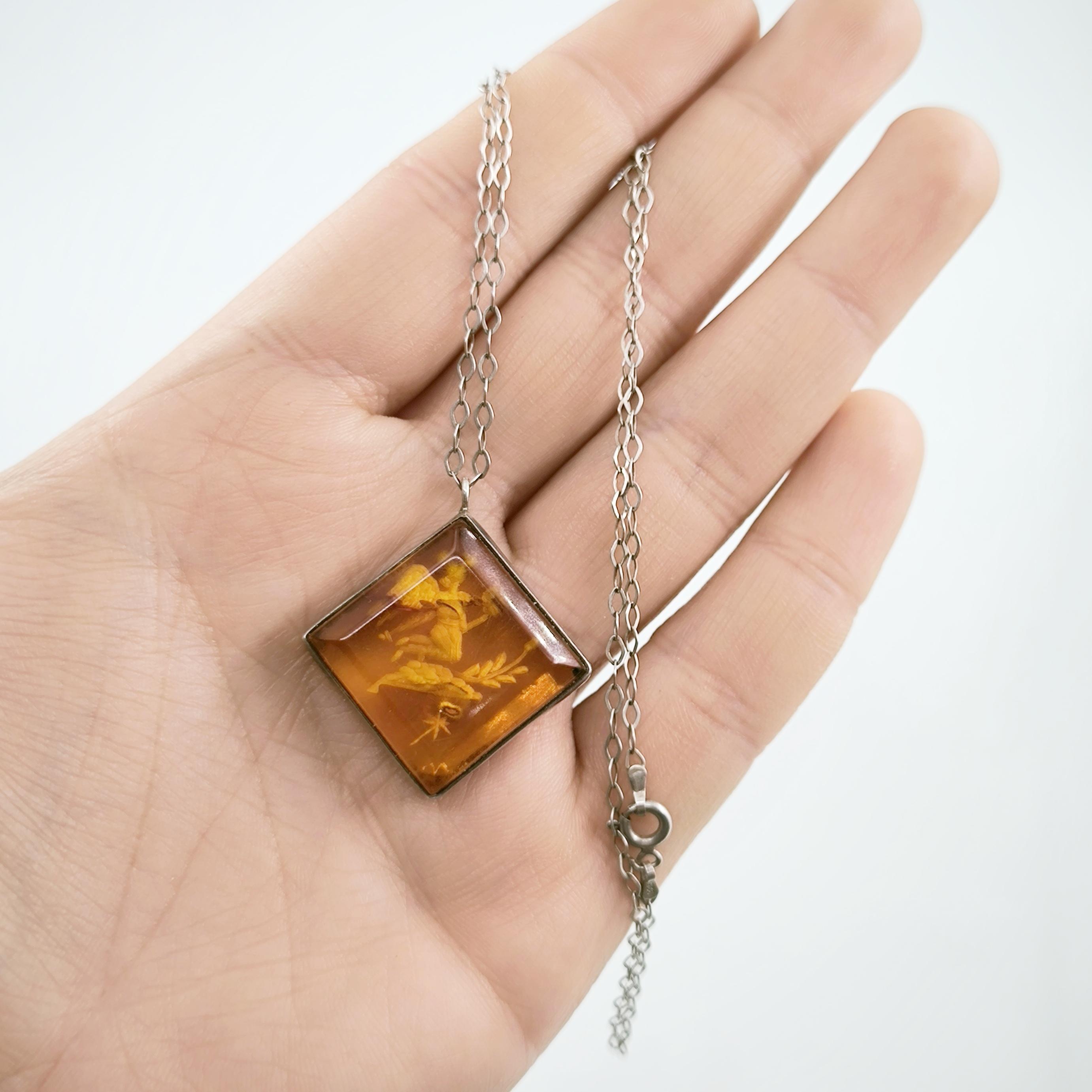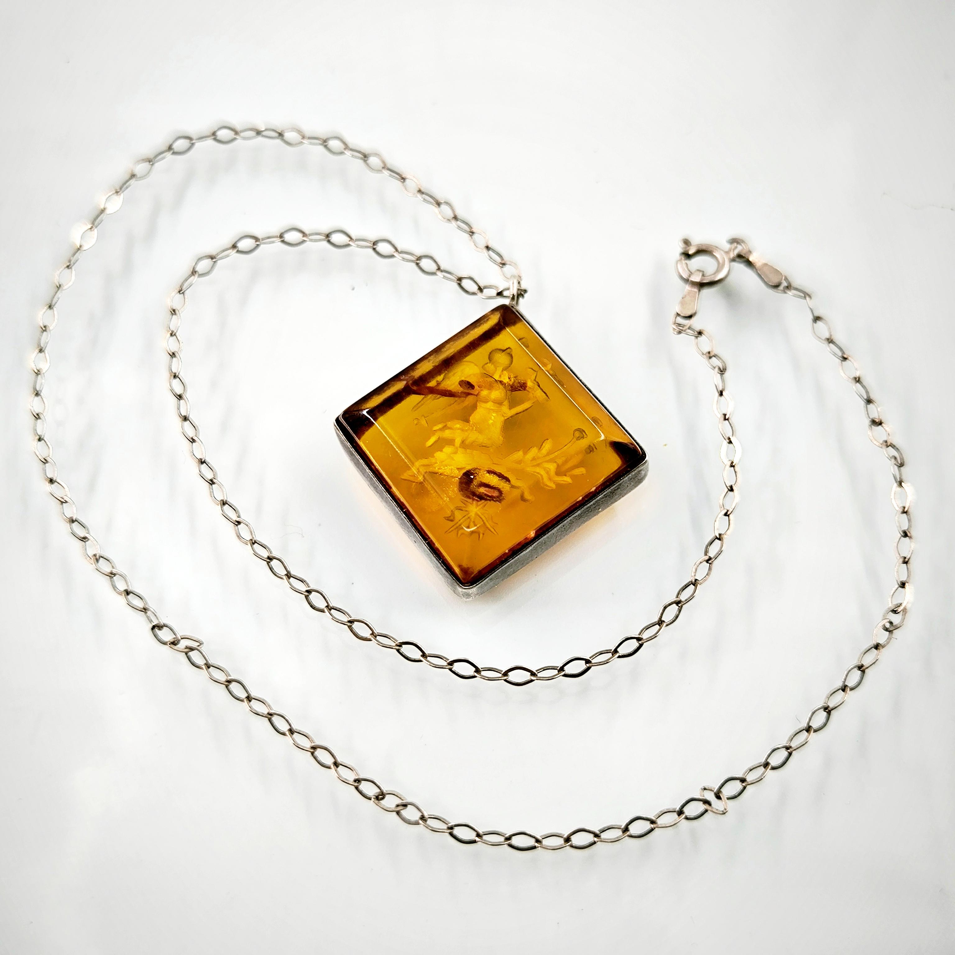Adeta yağlı boya tablo görselliğinde mEdusA eseri kehribar kolye! 1960'lardan bir kehribar üzerine 925 Ayar Gümüş çerçeve ve zincir kombini yaptığımız, Kehribara negatif intaglio tekniği ile ''Melek'' intagliosu çalıştığımız çok güzel bir mEdusA eseri kolye!