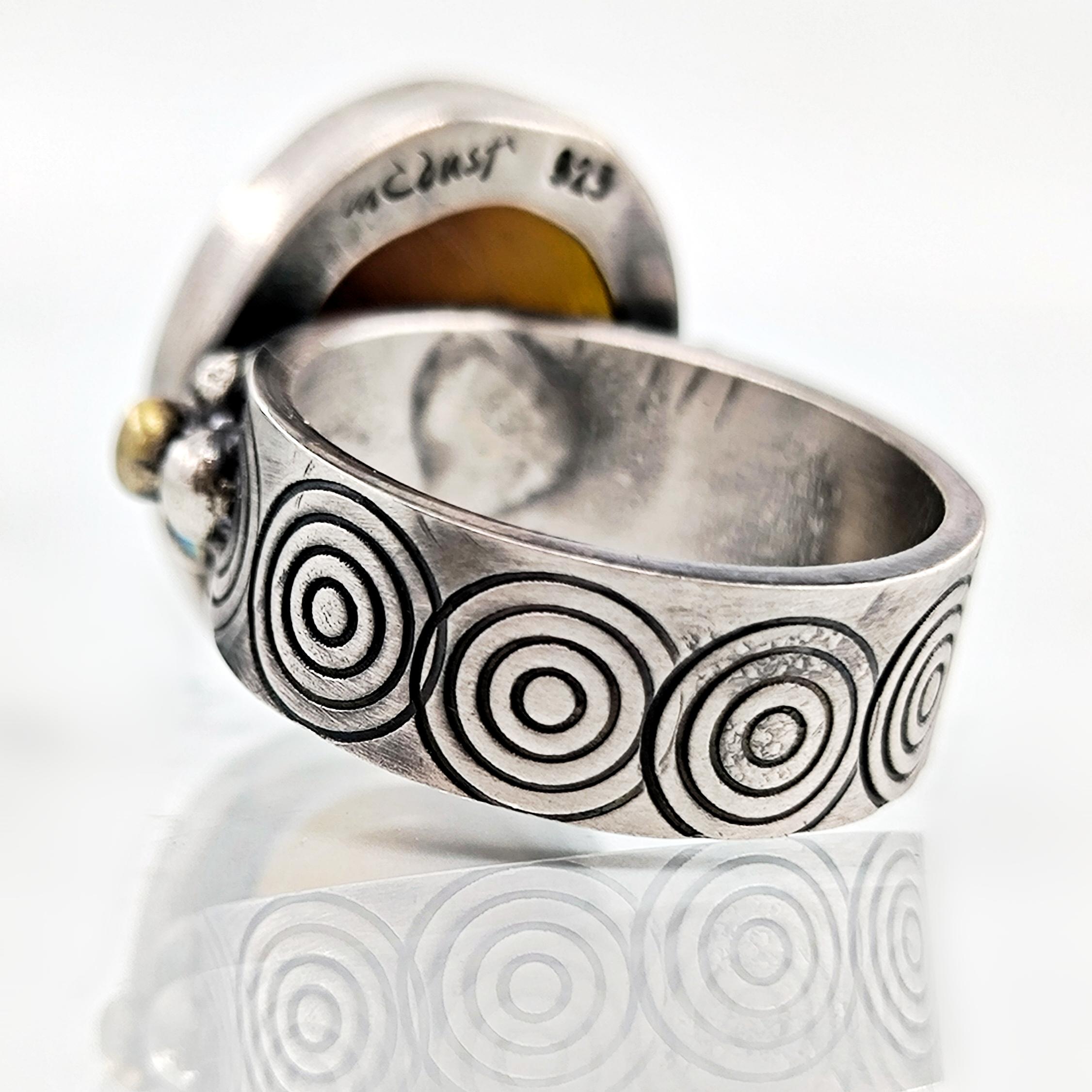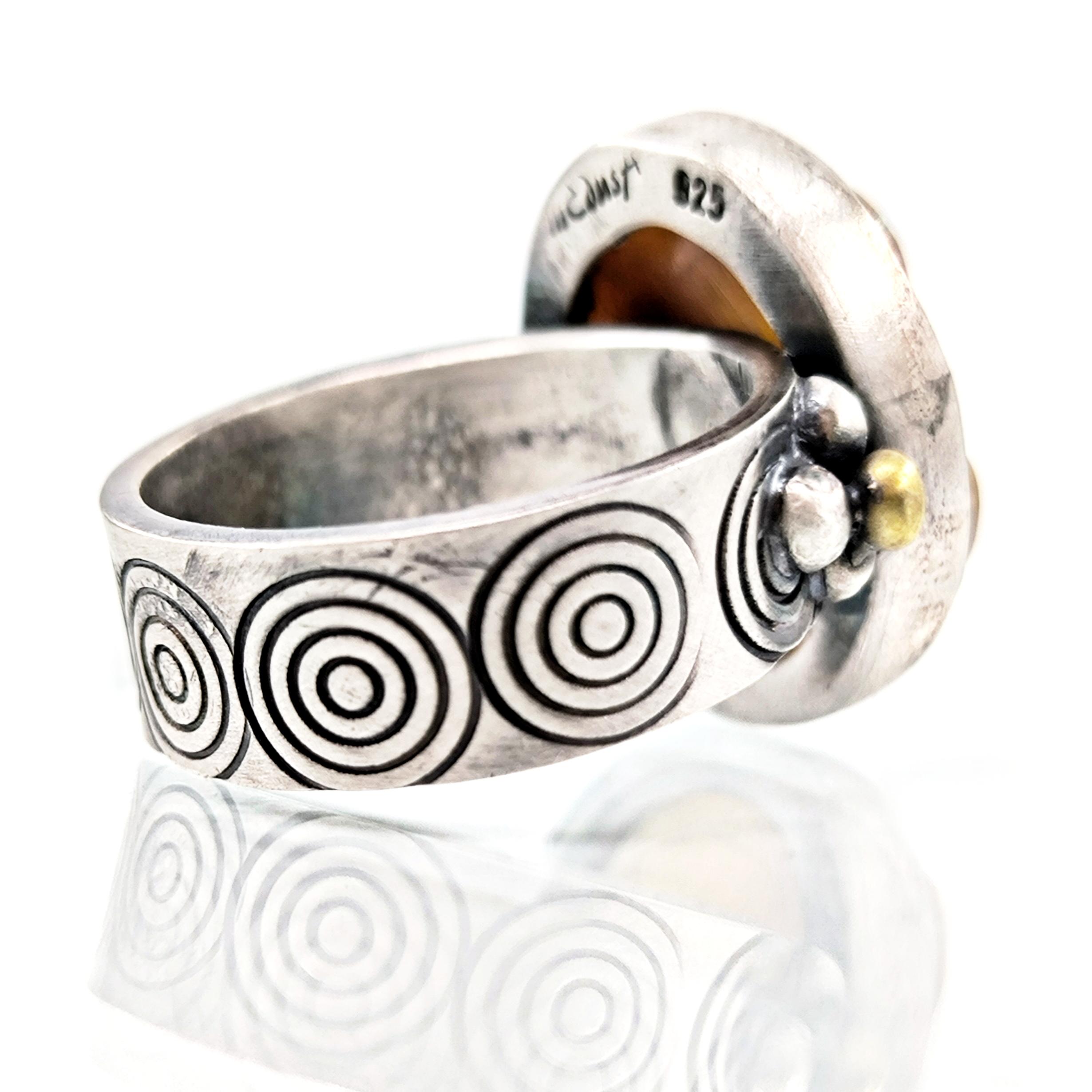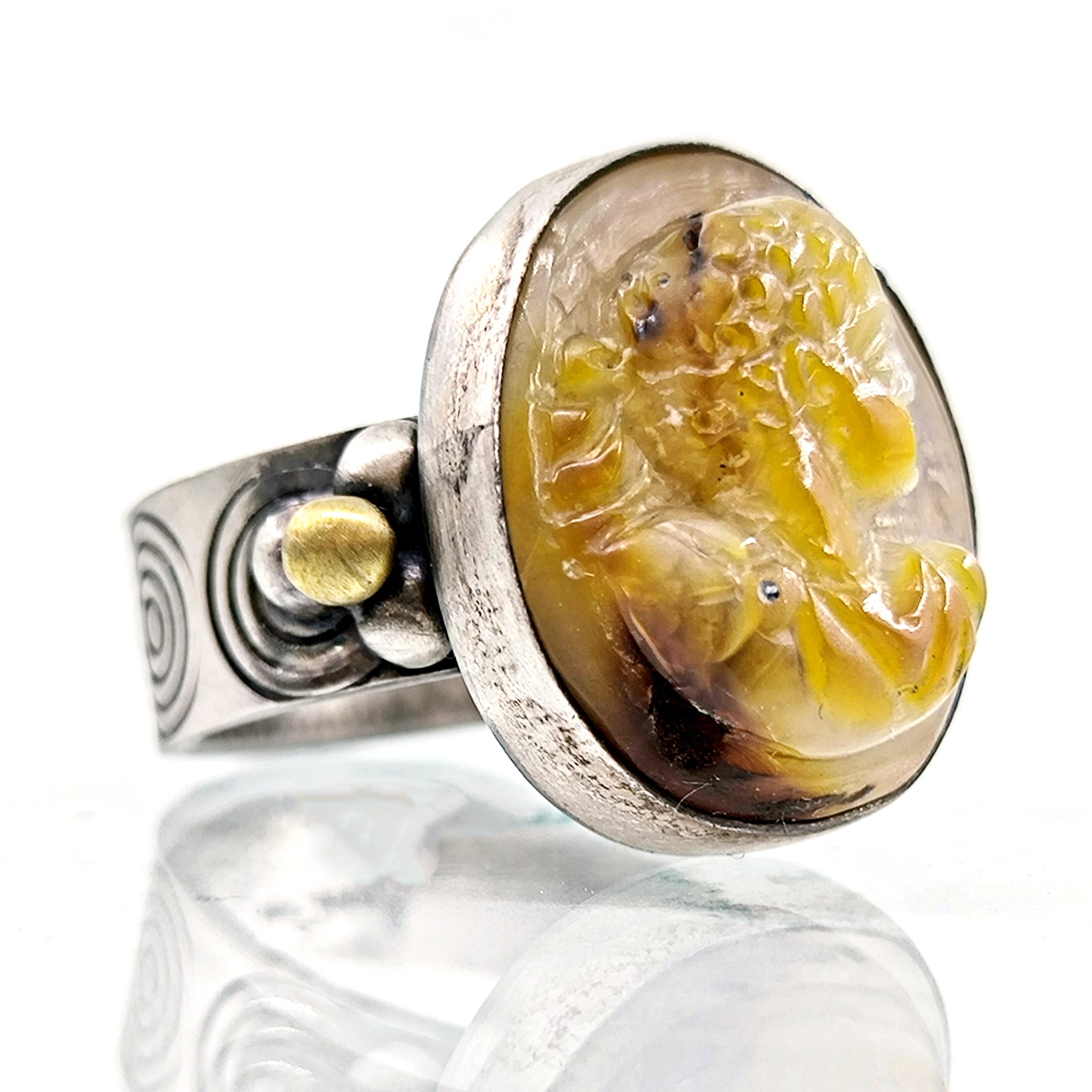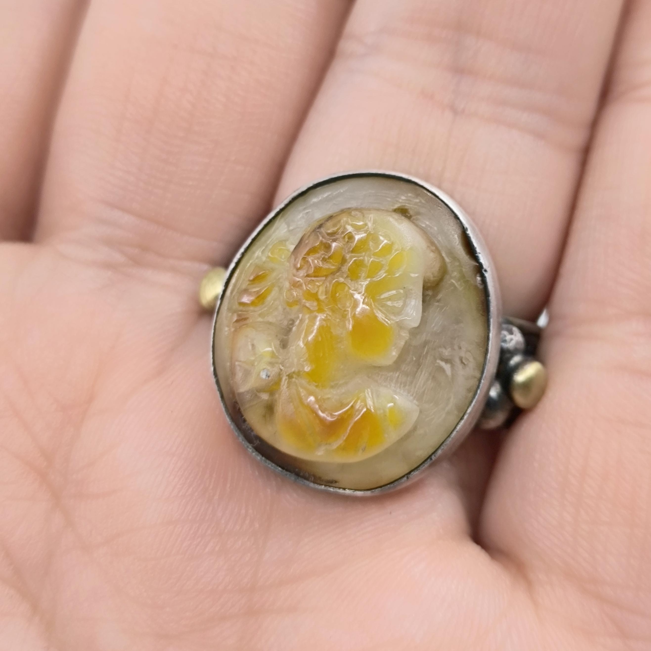 Kadim Roma’nın bilgelik timsali Marcus Aurelius’un portresini andıran bu yüzük, gerçek kehribar üzerine ustalıkla oyulmuş kabartmasıyla geçmişin görkemini parmaklarınıza taşır. Kıvırcık saçlar, belirgin sakal hatları ve derin bakışlar, imparatorun hem savaş meydanlarındaki kudretini hem de felsefi düşüncelerindeki derinliği yansıtır. 925 ayar gümüş çerçevesi ve bronz detaylarıyla antik dönem estetiğini günümüze taşıyan bu parça, yalnızca bir takı değil, tarihten gelen bir mirastır.