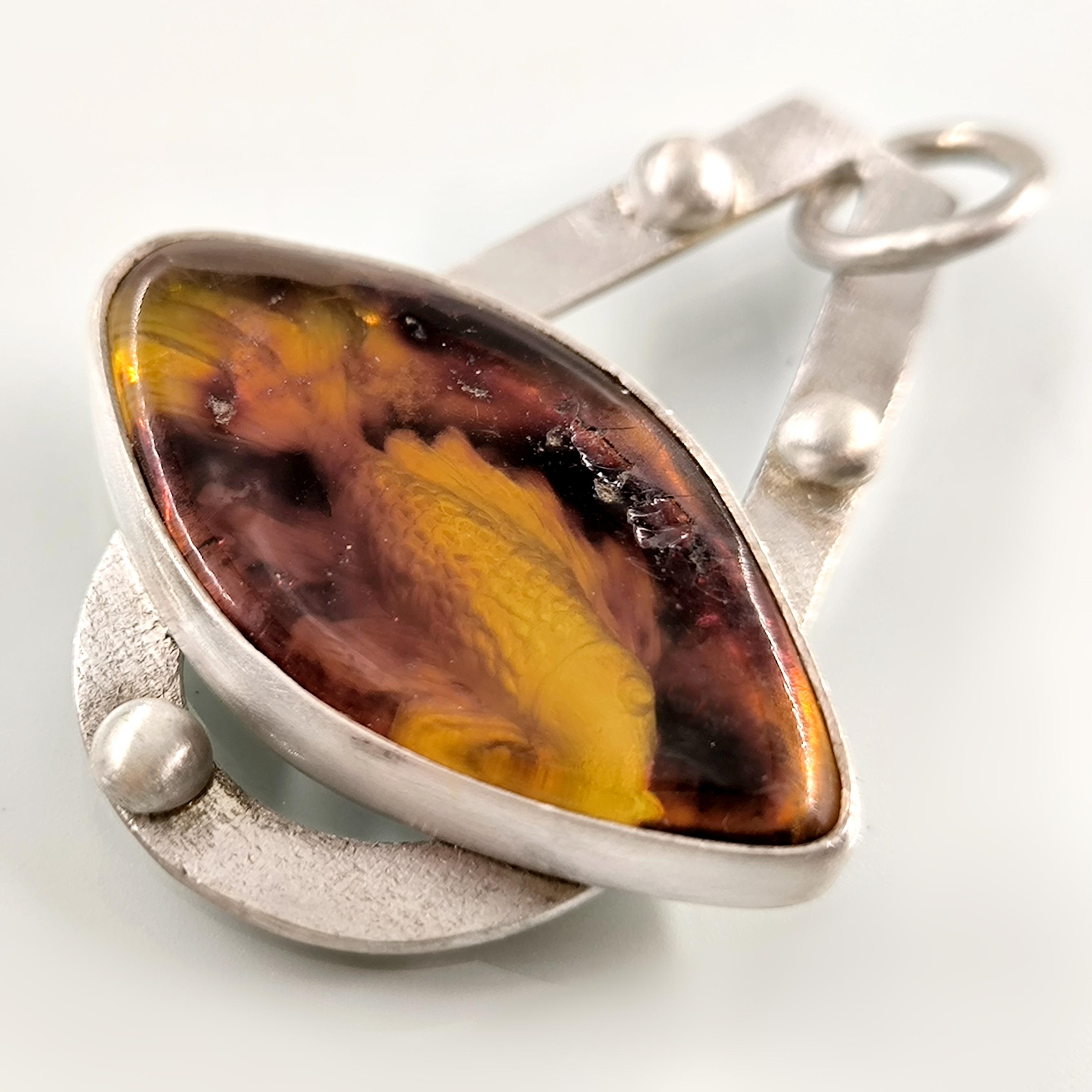 Zamanla donmuş bir damlanın içine işlediğimiz intaglio balık, derinlik, akış ve sezgiyi simgeliyor. 925 ayar gümüş çerçeveyle tamamlanan bu özel kolye, doğayla sanatın iç içe geçtiği nadir tasarımlardan biri. Kehribarın sıcaklığıyla birleşen balığın mistik yolculuğu, boynunuzda anlam bulur.