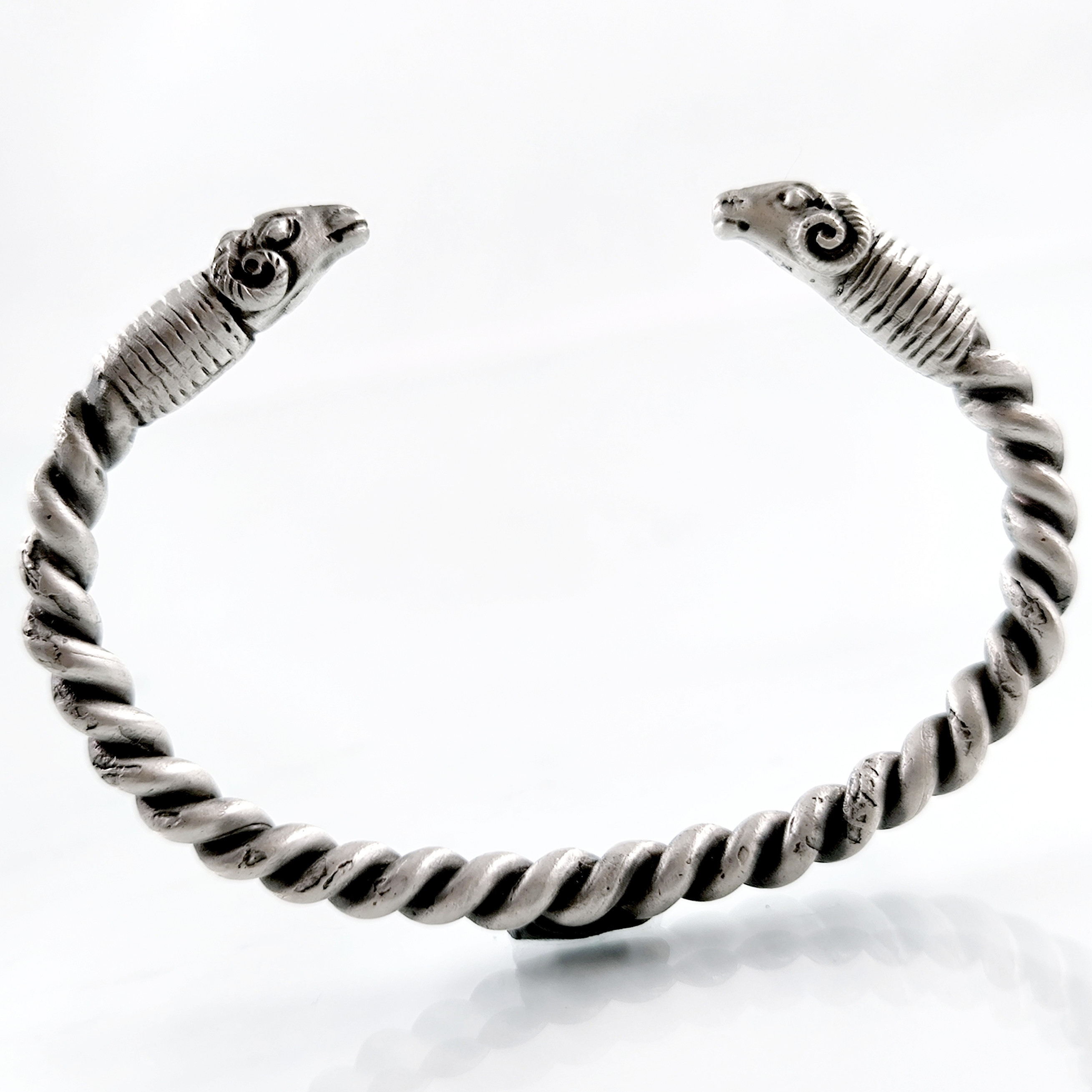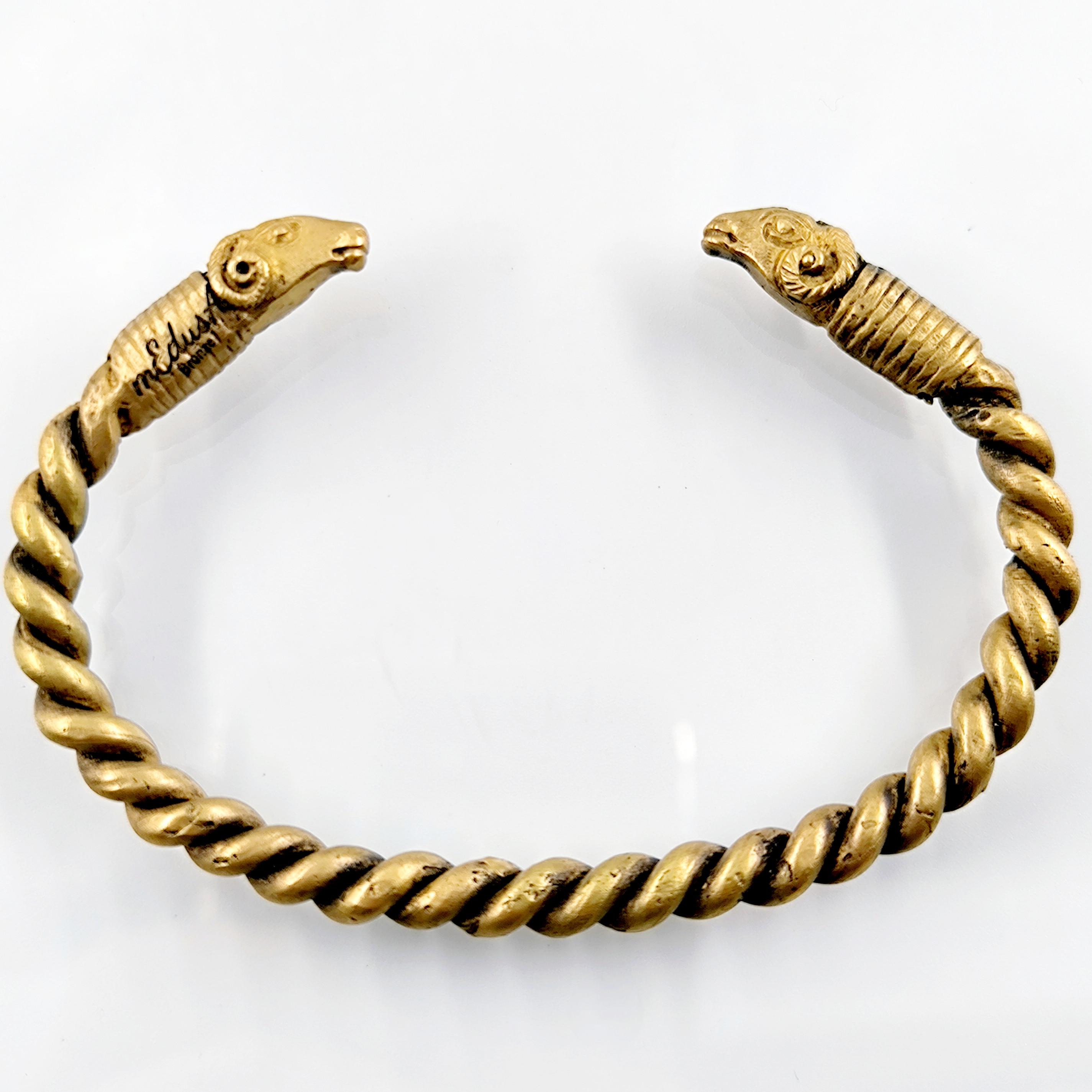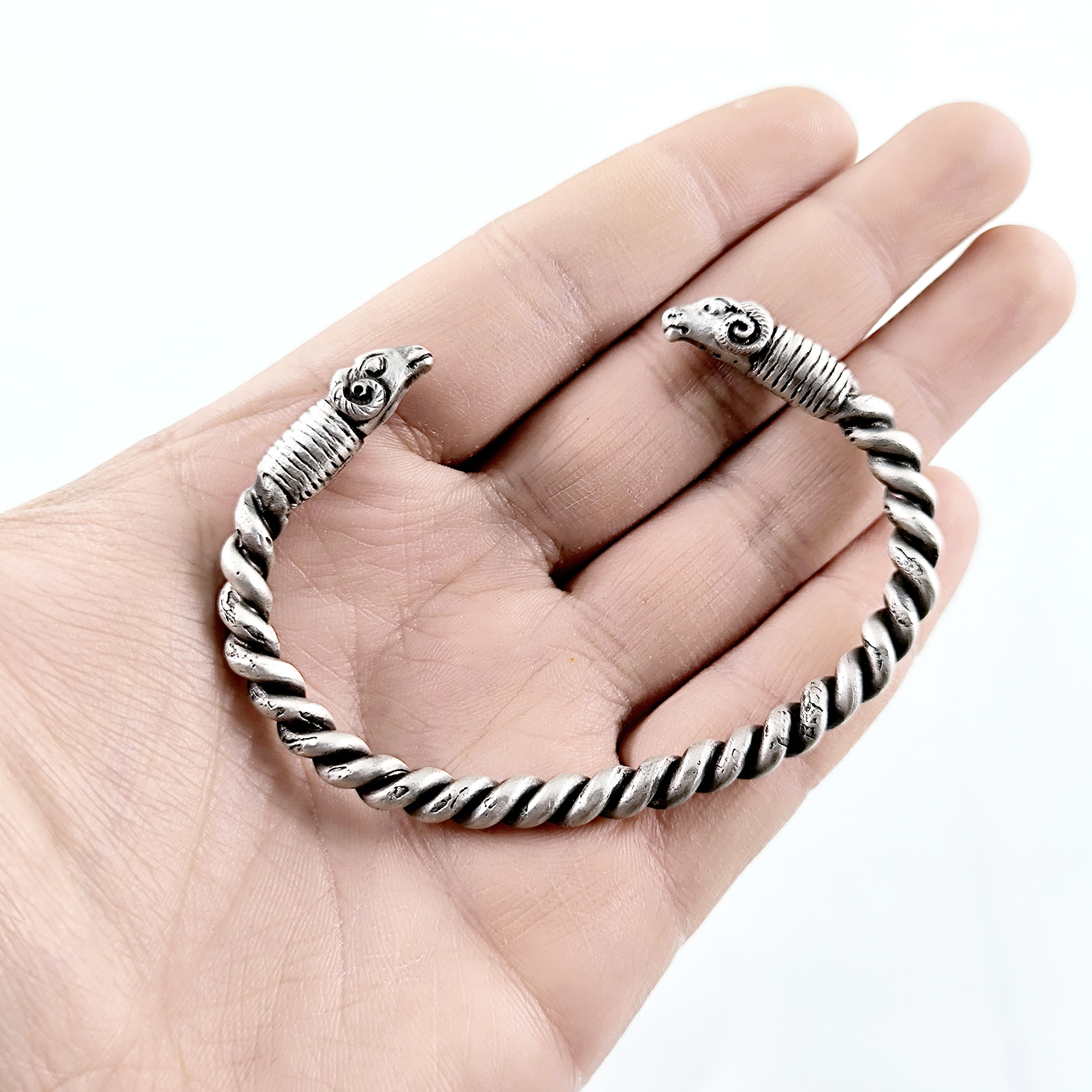 " Koç Başlı Antik Bileziğimiz! " Asalet ve gücün sembolü koçbaşları bir çok antik medeniyetin mücevherlerinde kullanılmıştır. Antik stil burgu kolları ile bir medusa eseri Gümüş koç başı bilekliğimiz !