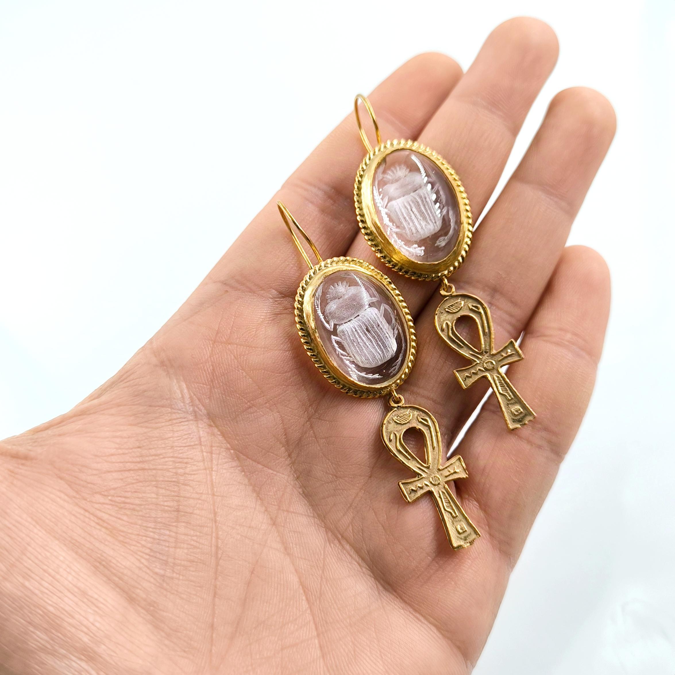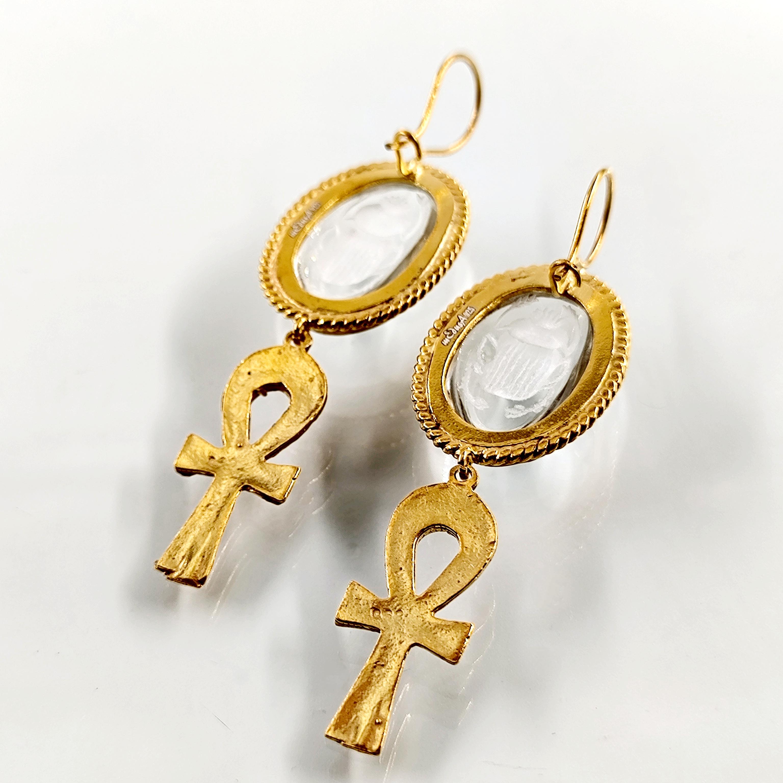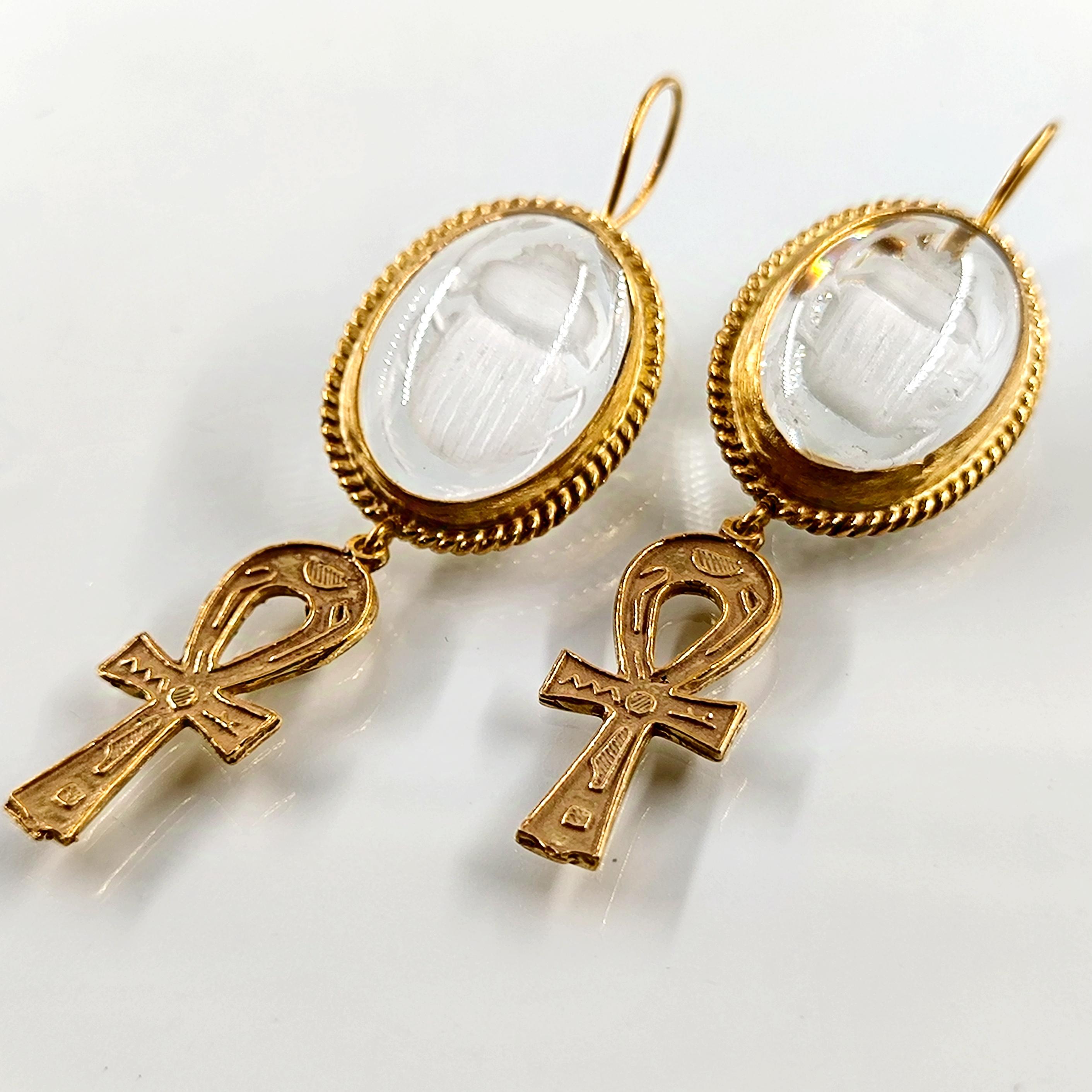 Kendi kendini doğuran Scarab! Güneşin gökyüzünde hareketini kumanda eden Kheper'in hiyeroglif işareti olarak bilinir, ayrıca Güneş tanrısı Ra'nın da önemli sembolleri arasındadır. Bok böceği biçiminde mühür ve muskalar bugün dahi şans ve uğur getirecek tılsımlar olarak itibar görürler. Nil'in anahtarı olarak bilinen Ankh sembolü ile süslediğimiz, kuvars intaglio bu gümüş küpeler tamamen bir @medusantik eseridir.