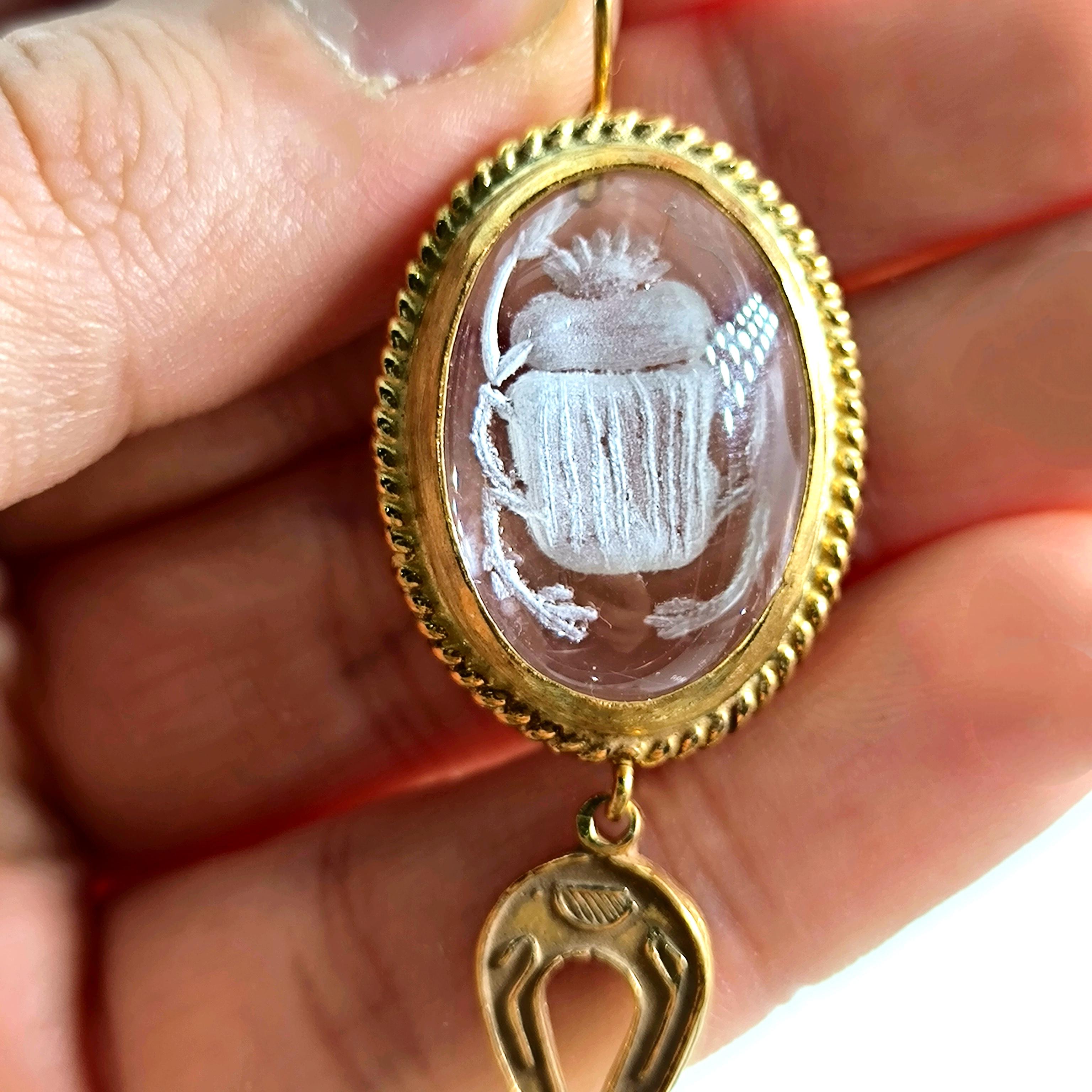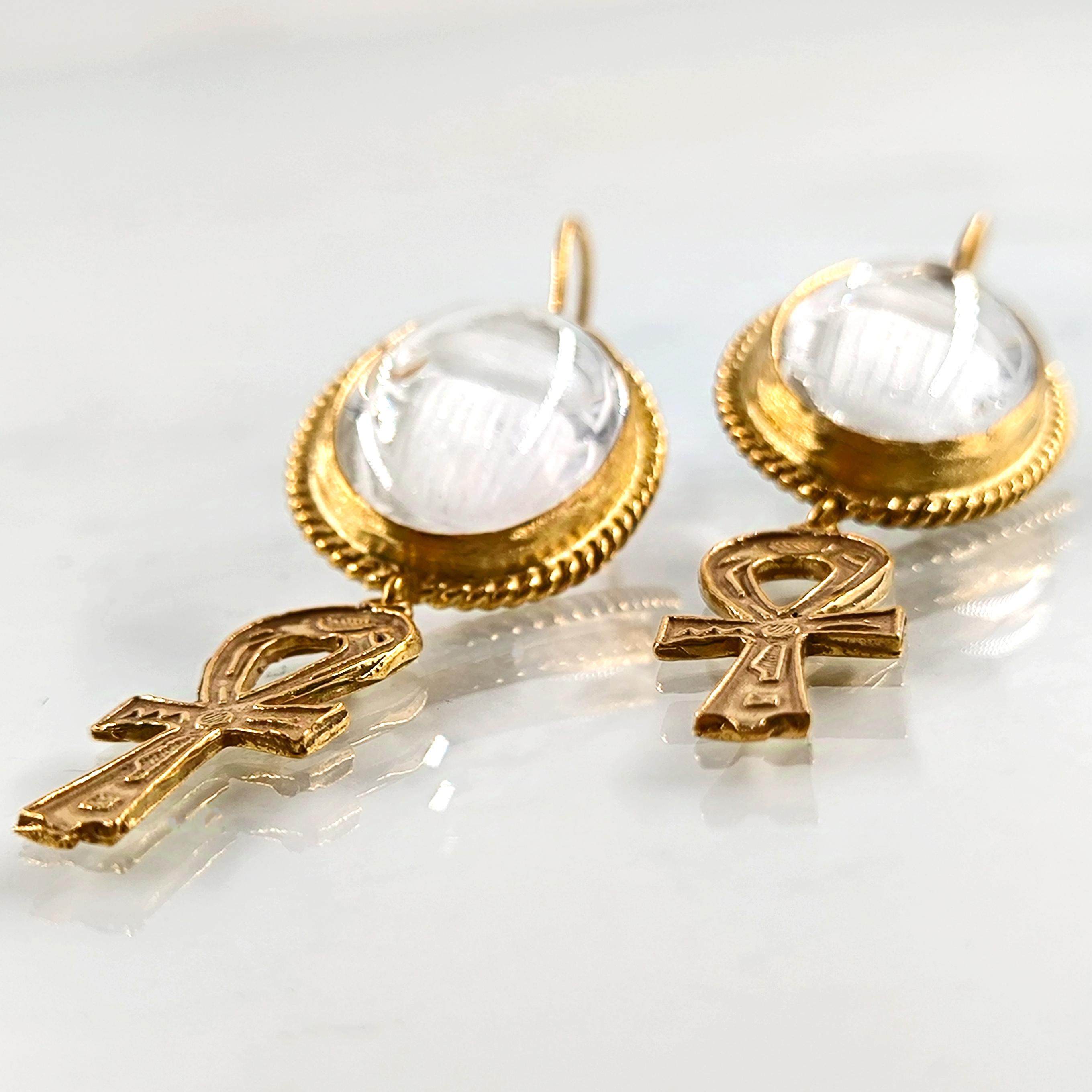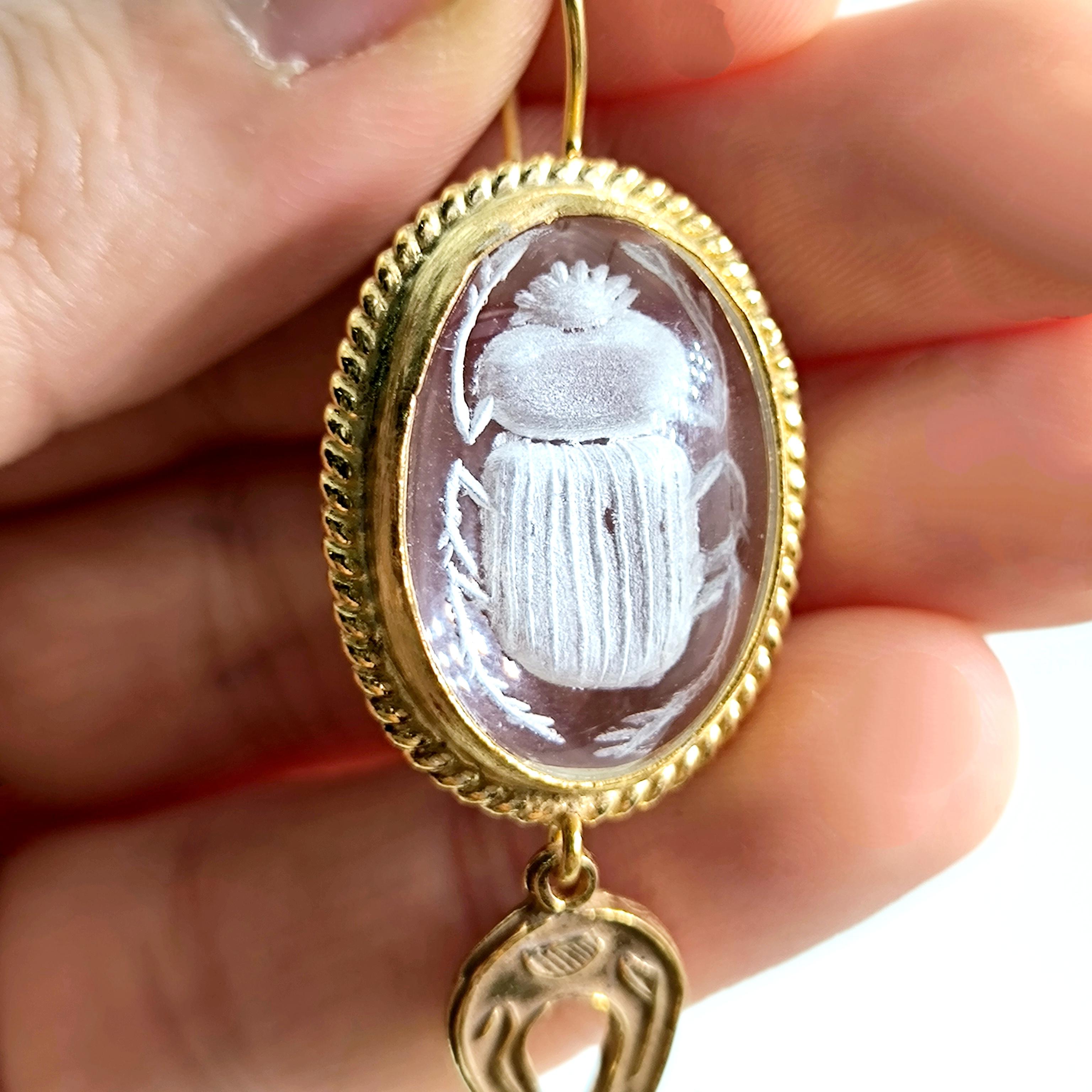 Kendi kendini doğuran Scarab! Güneşin gökyüzünde hareketini kumanda eden Kheper'in hiyeroglif işareti olarak bilinir, ayrıca Güneş tanrısı Ra'nın da önemli sembolleri arasındadır. Bok böceği biçiminde mühür ve muskalar bugün dahi şans ve uğur getirecek tılsımlar olarak itibar görürler. Nil'in anahtarı olarak bilinen Ankh sembolü ile süslediğimiz, kuvars intaglio bu gümüş küpeler tamamen bir @medusantik eseridir.