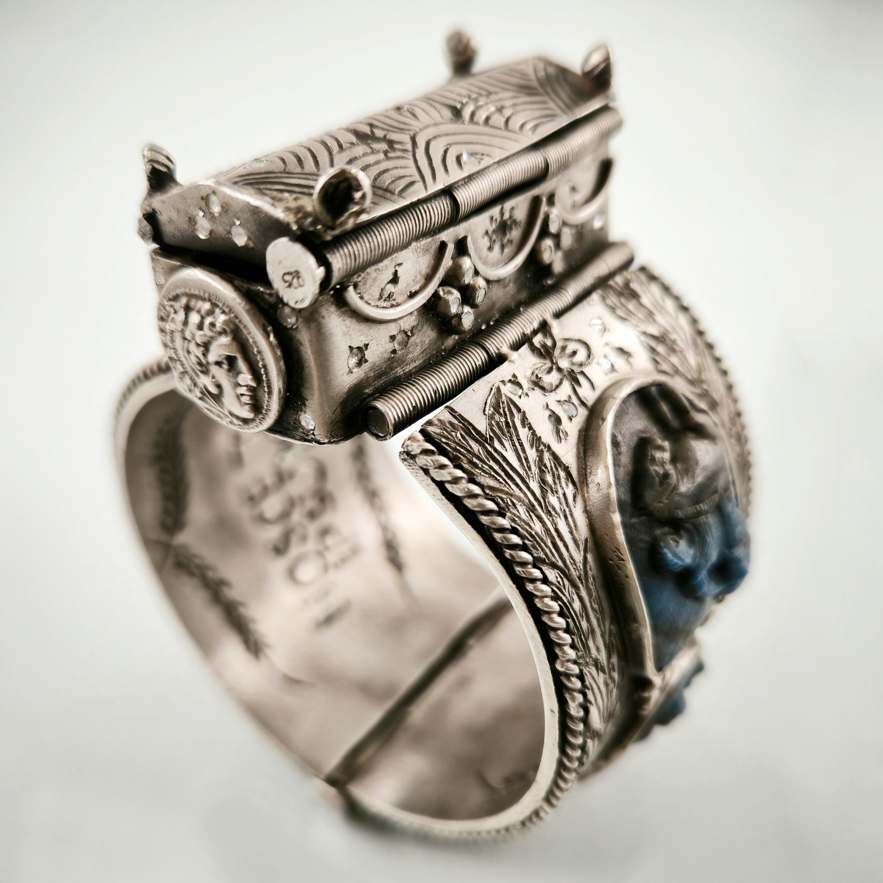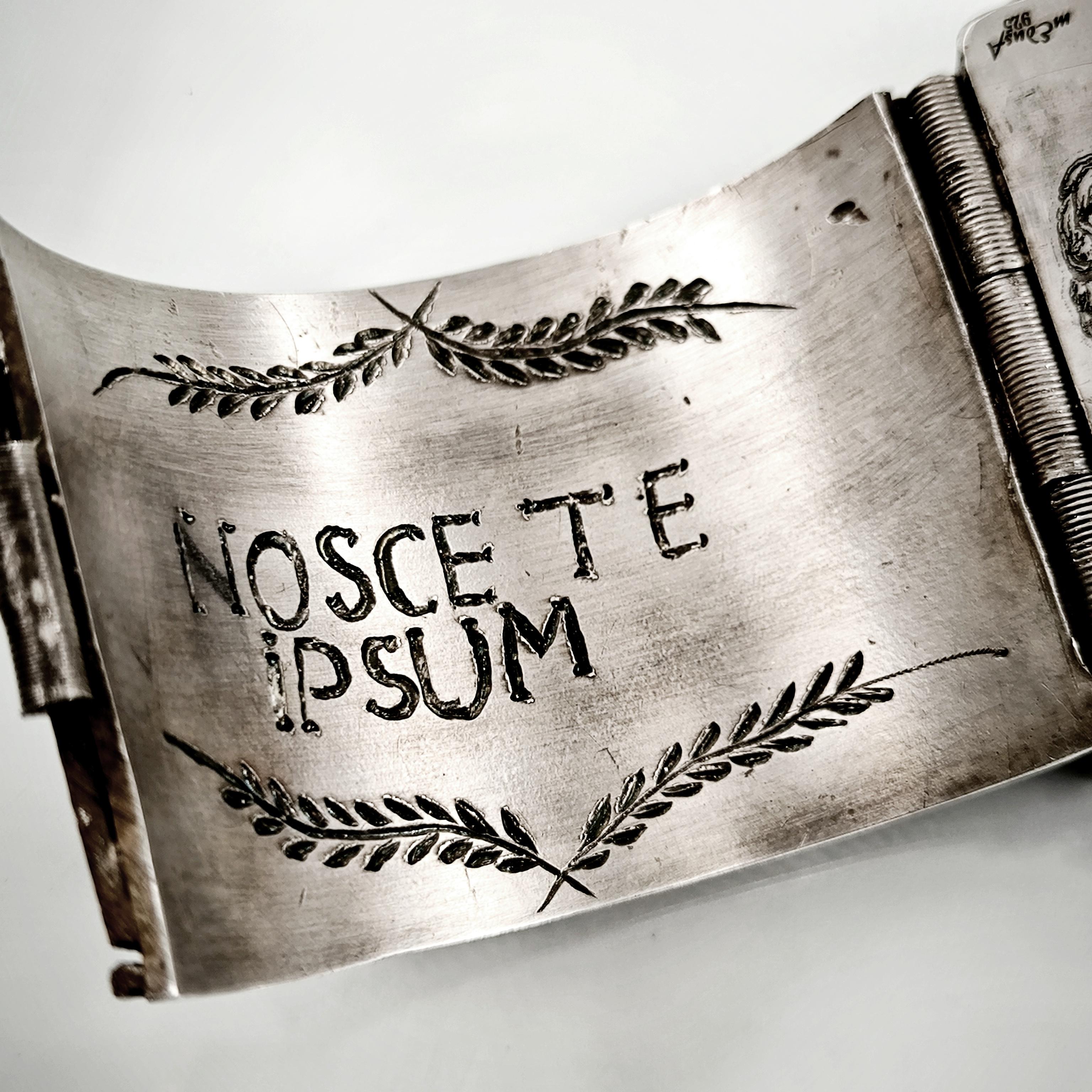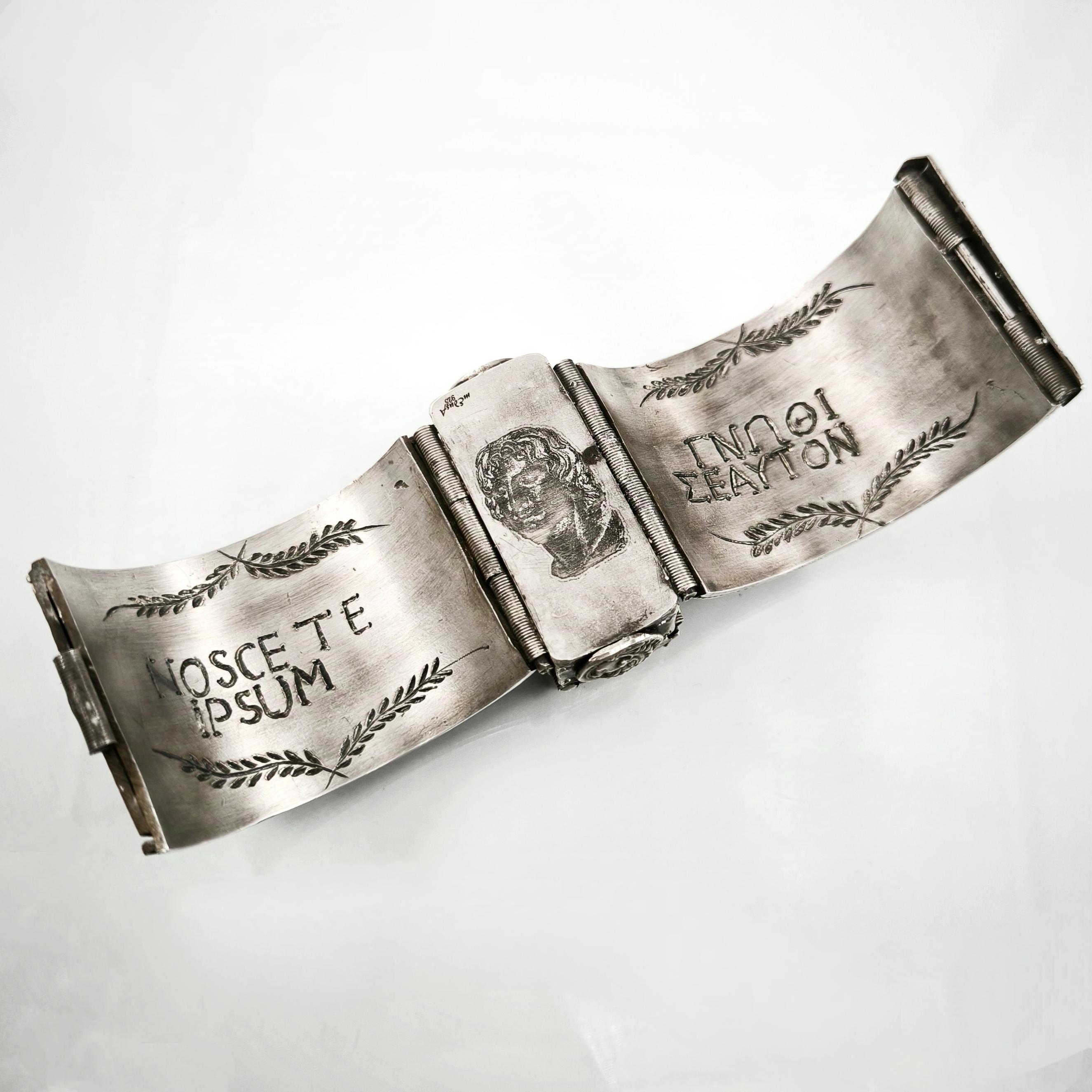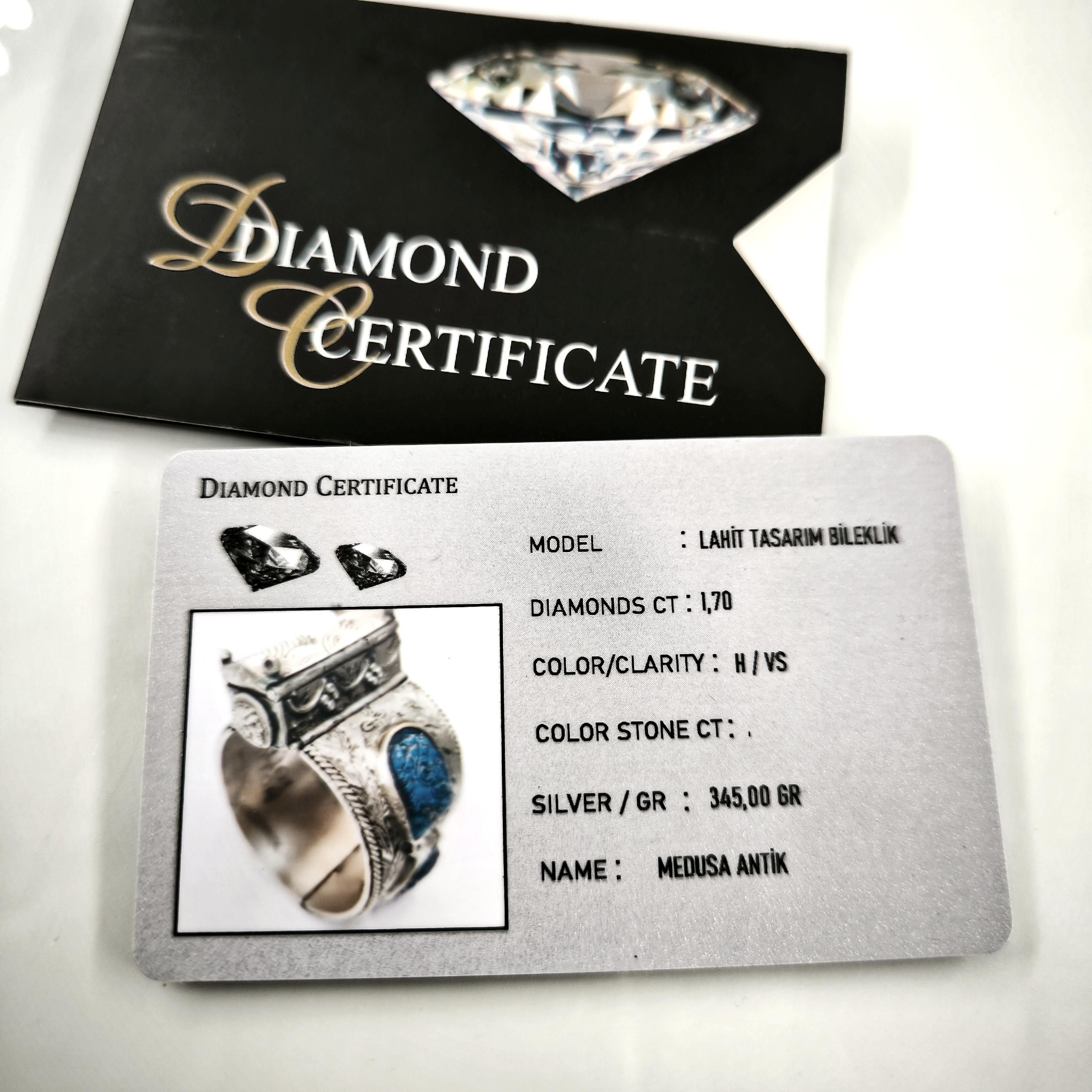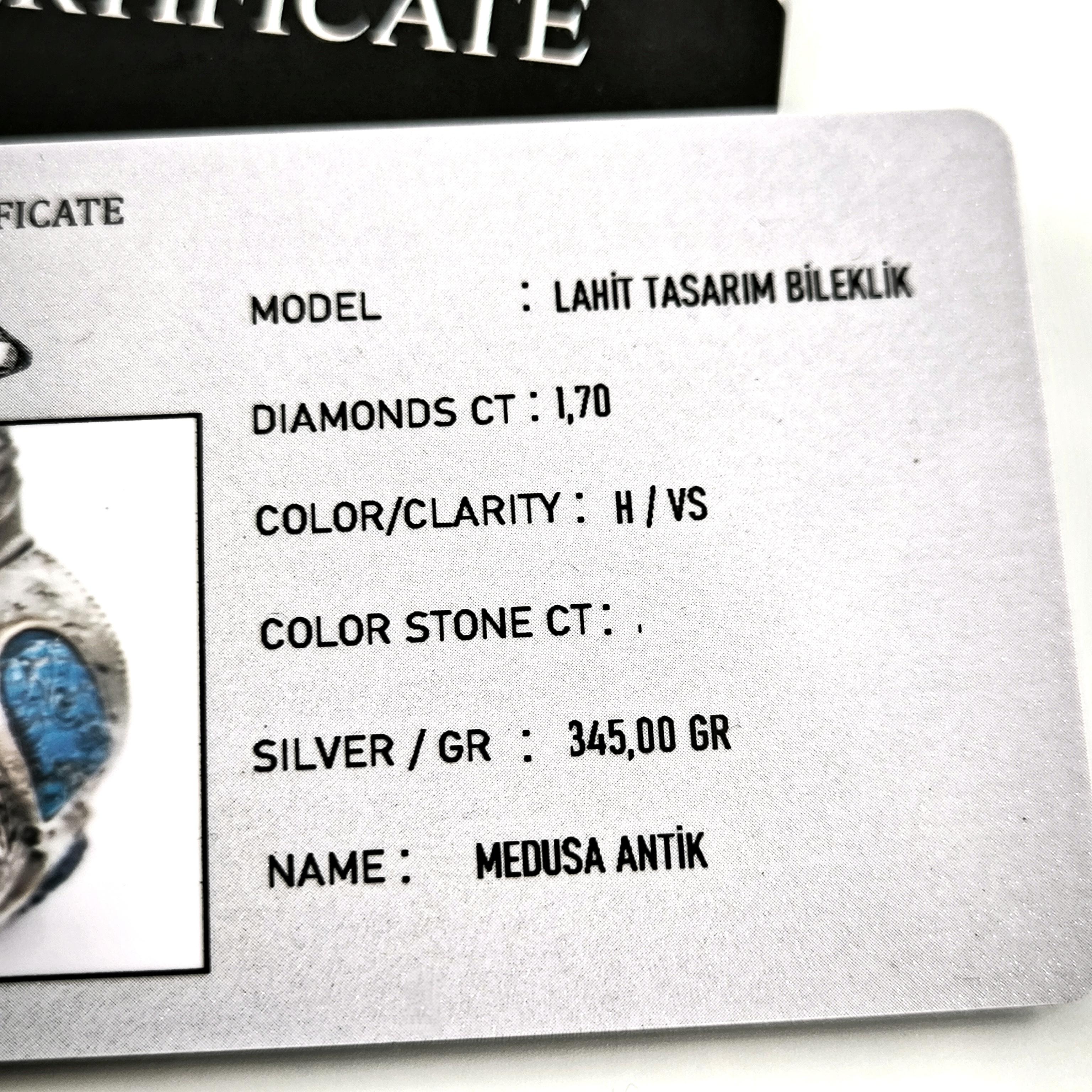 BİR @medusantik TASARIMIDIR. "BÜYÜK İSKENDERİN ONURUNA" LAHİT MEZAR BİLEKLİK! Dünyada eşi ve benzeri olmayan emsalsiz bir marjinal tasarım! Bilekliğin iç kısmında Antik dünyadan günümüze ulaşan özel antik sözler bulunmaktadır. Bu sözlerden birisi Delphi tapınağının girişinde yazılan "Kendini bil" diğeri ise ünlü Hatay mozaiği üzerindeki "Neşeli ol Hayatını yaşa" sözüdür. ayrıca lahitin alt kısmında Büyük İskender'in mermer heykelinin gravürü bulunmaktadır. Bilekliğin kenar kısımlarında ise çerçeveler içindeki Lapis taşlar üzerine kabartma cameo işçiliğinde Büyük İskender'in portreleri yer almaktadır, Lahitin içinde ise tamamen kemikten işlediğimiz Büyük iskenderin, terakota içerisinde kemik olmuş cansız bedeni bulunmaktadır. Eserimiz de yapılan her bir dokunuş baştan sona el işçiliğidir! Işığın değdiği hemen her yere toplam 1.70 crt elmas taşlarla süslediğimiz eşsiz, emsalsiz ve marjinal bir esere dönüştürdüğümüz, Medusa imzalı Lahit Bileklik! Ayrıca bilekliğimize özel lahit formunda ahşap sandık çalıştık! ve üzerini piton derisi ile kapladığımız, iç kısmı ise özel kadife döşemeli oyma yuvası ile muhafa edilerek gönderilecektir. Yapım süreci ve kurgusu aylarca süren bu çok değerli eser için Keyifli Seyirler dilerim! (345 gr.) (925 ayar gümüş) (1.70 crt H/VS diamond)