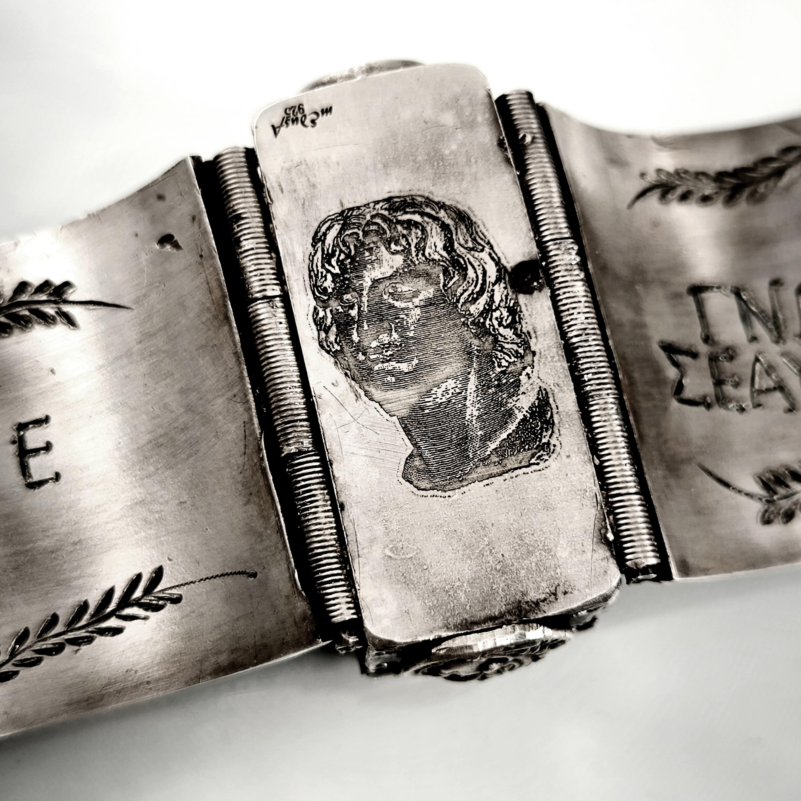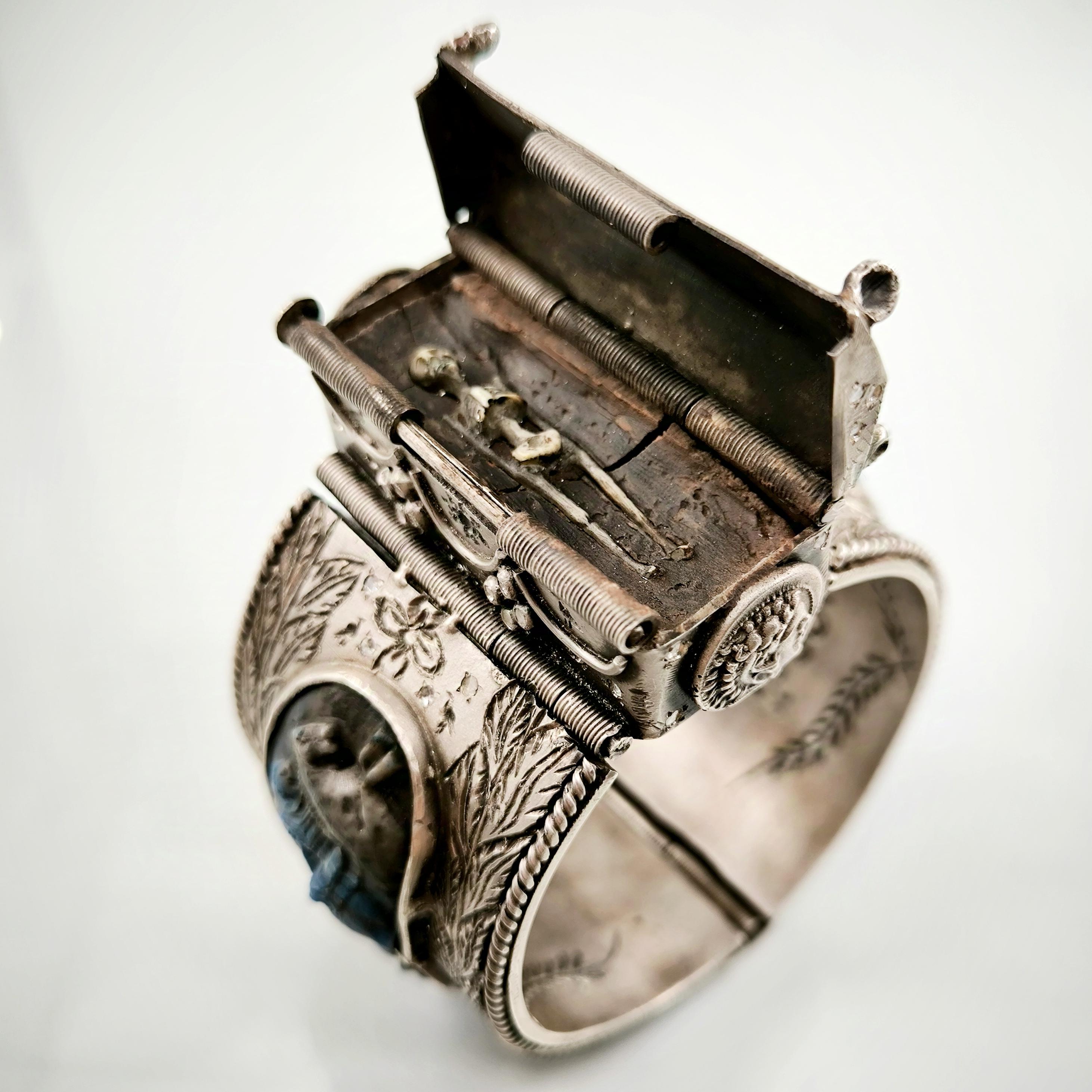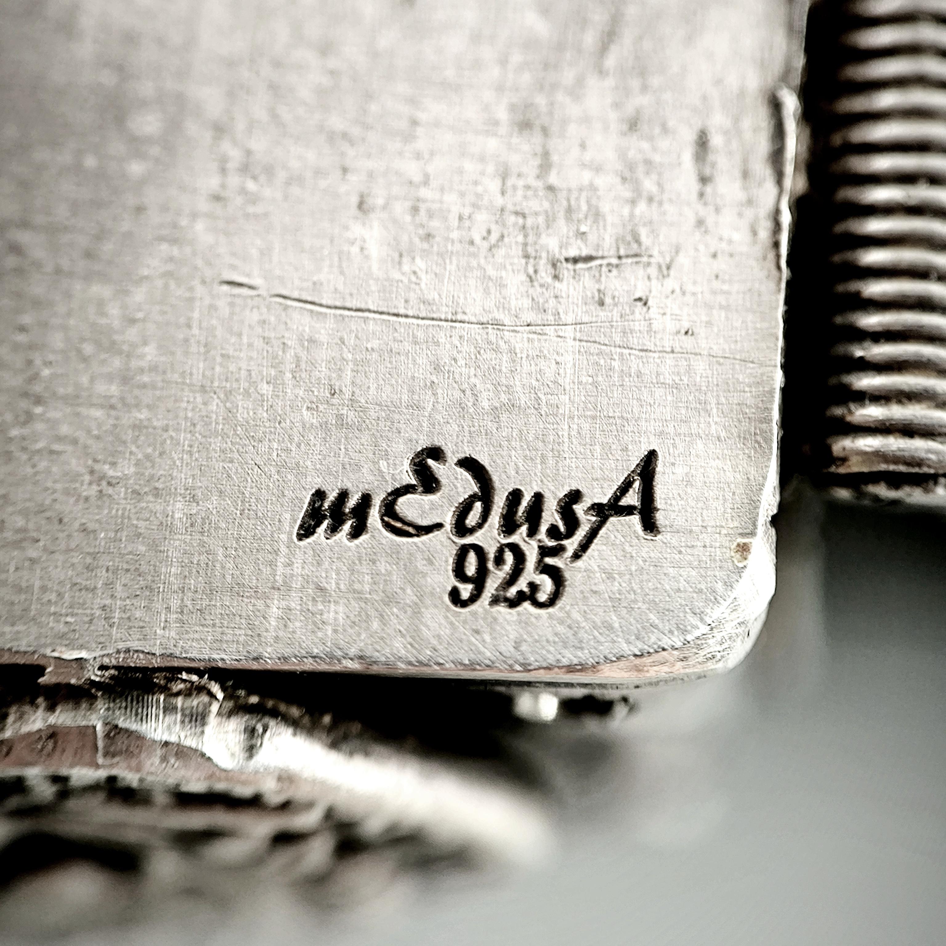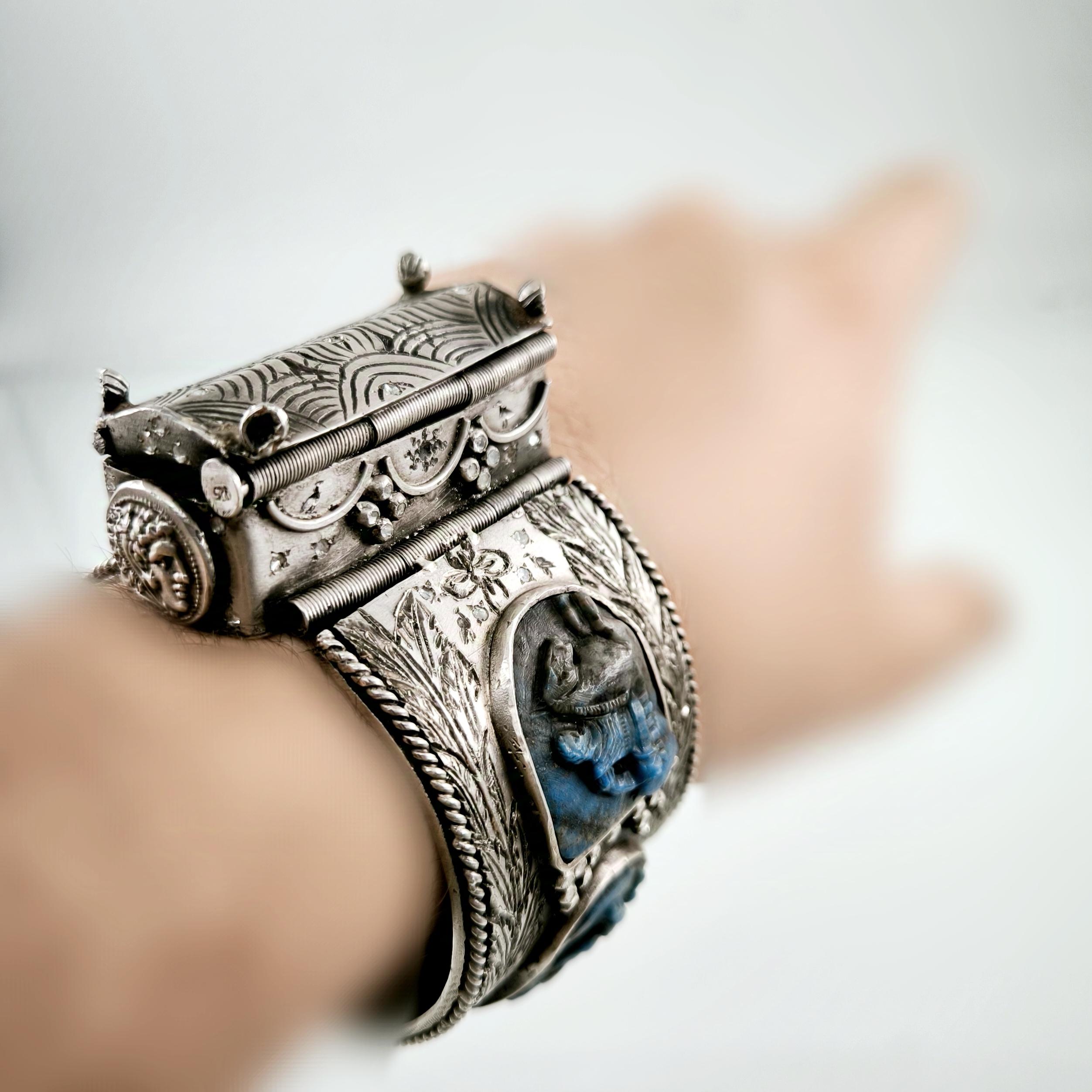 BİR @medusantik TASARIMIDIR. "BÜYÜK İSKENDERİN ONURUNA" LAHİT MEZAR BİLEKLİK! Dünyada eşi ve benzeri olmayan emsalsiz bir marjinal tasarım! Bilekliğin iç kısmında Antik dünyadan günümüze ulaşan özel antik sözler bulunmaktadır. Bu sözlerden birisi Delphi tapınağının girişinde yazılan "Kendini bil" diğeri ise ünlü Hatay mozaiği üzerindeki "Neşeli ol Hayatını yaşa" sözüdür. ayrıca lahitin alt kısmında Büyük İskender'in mermer heykelinin gravürü bulunmaktadır. Bilekliğin kenar kısımlarında ise çerçeveler içindeki Lapis taşlar üzerine kabartma cameo işçiliğinde Büyük İskender'in portreleri yer almaktadır, Lahitin içinde ise tamamen kemikten işlediğimiz Büyük iskenderin, terakota içerisinde kemik olmuş cansız bedeni bulunmaktadır. Eserimiz de yapılan her bir dokunuş baştan sona el işçiliğidir! Işığın değdiği hemen her yere toplam 1.70 crt elmas taşlarla süslediğimiz eşsiz, emsalsiz ve marjinal bir esere dönüştürdüğümüz, Medusa imzalı Lahit Bileklik! Ayrıca bilekliğimize özel lahit formunda ahşap sandık çalıştık! ve üzerini piton derisi ile kapladığımız, iç kısmı ise özel kadife döşemeli oyma yuvası ile muhafa edilerek gönderilecektir. Yapım süreci ve kurgusu aylarca süren bu çok değerli eser için Keyifli Seyirler dilerim! (345 gr.) (925 ayar gümüş) (1.70 crt H/VS diamond)
