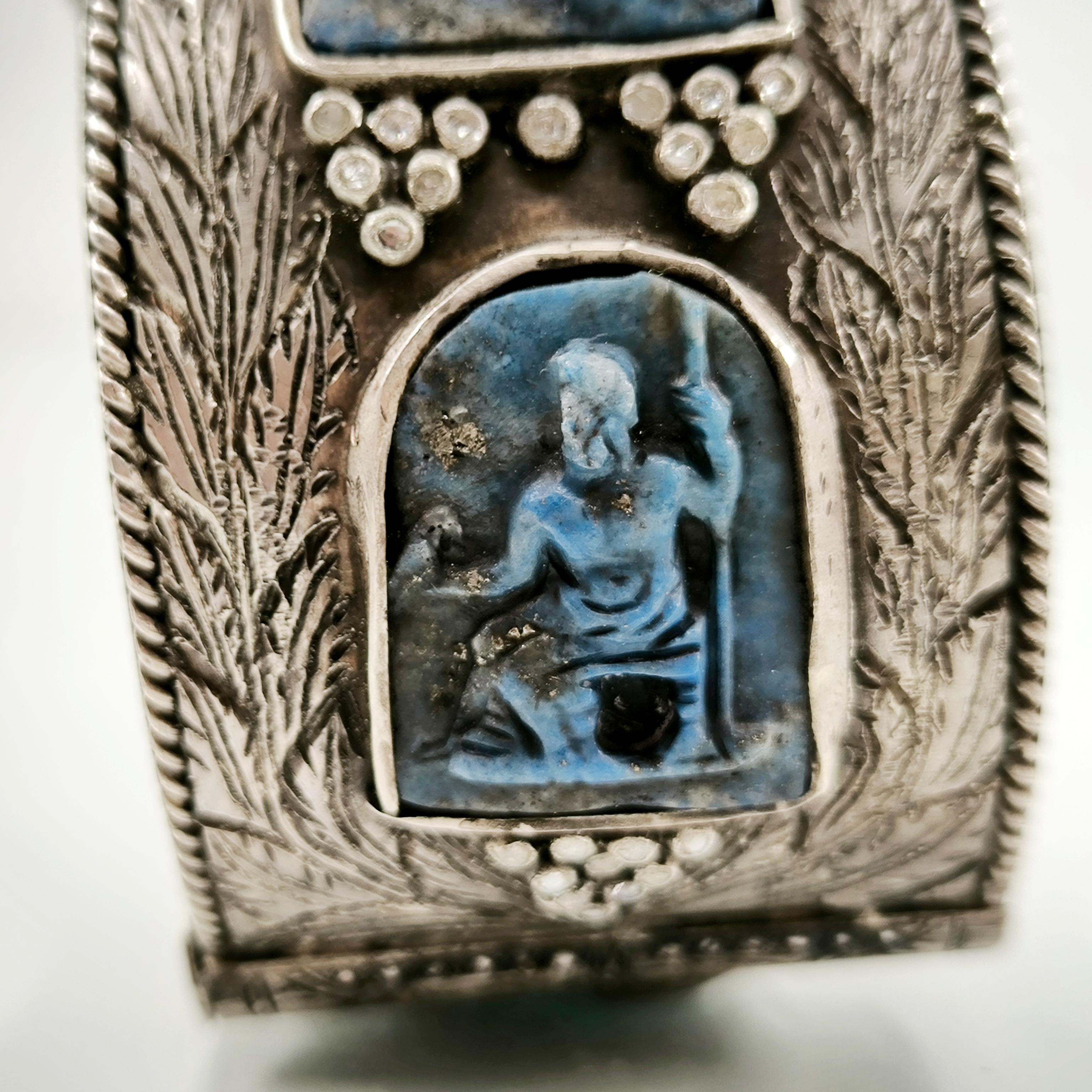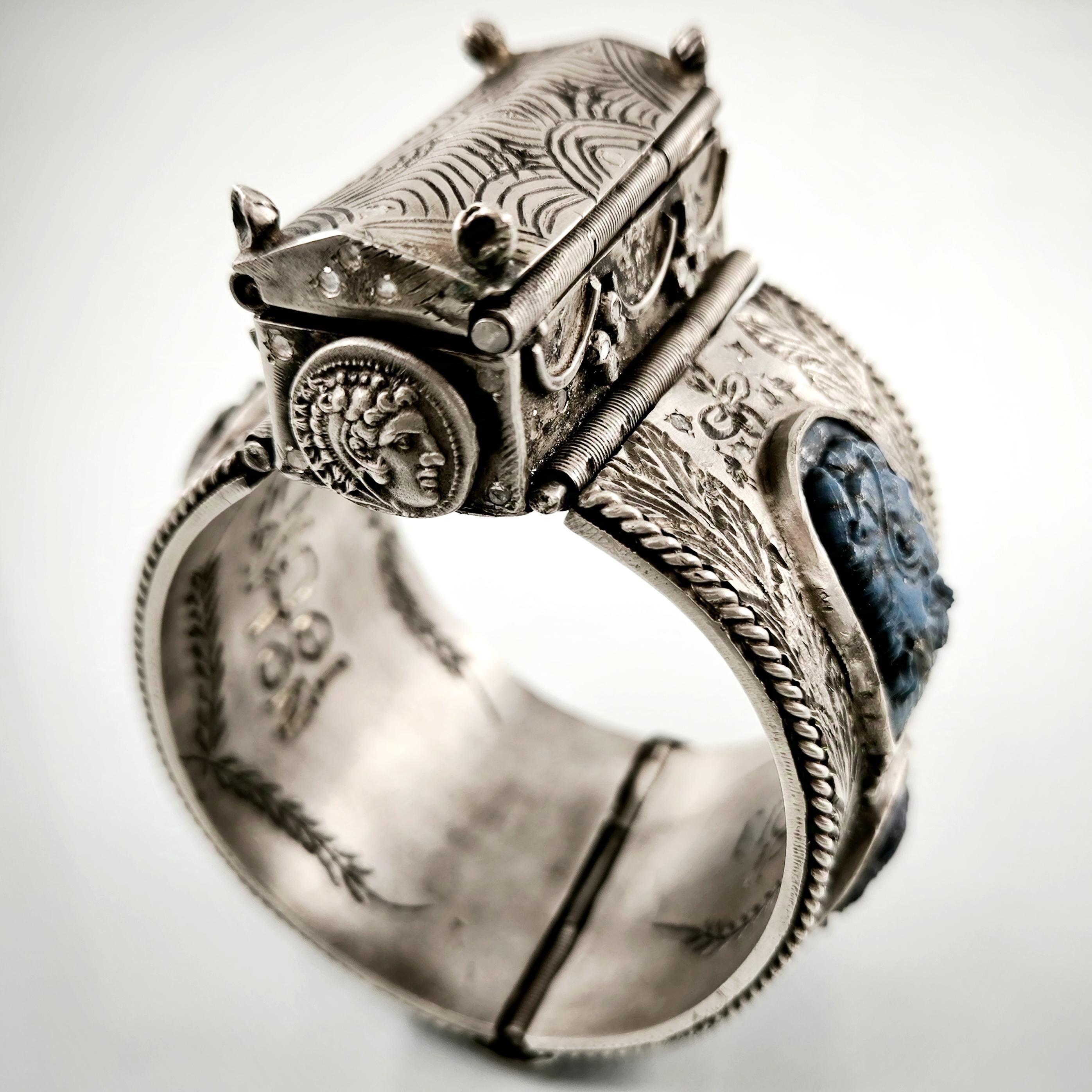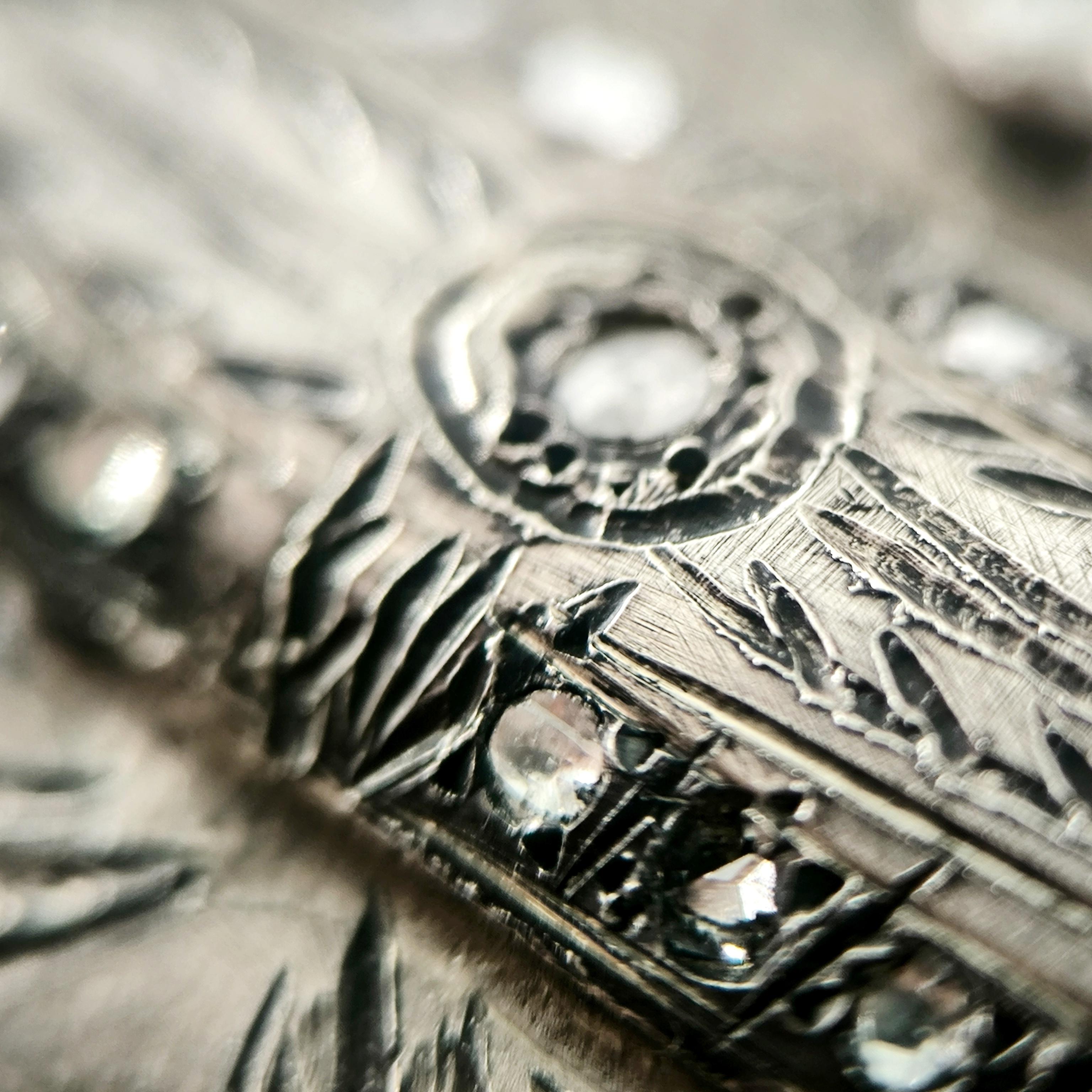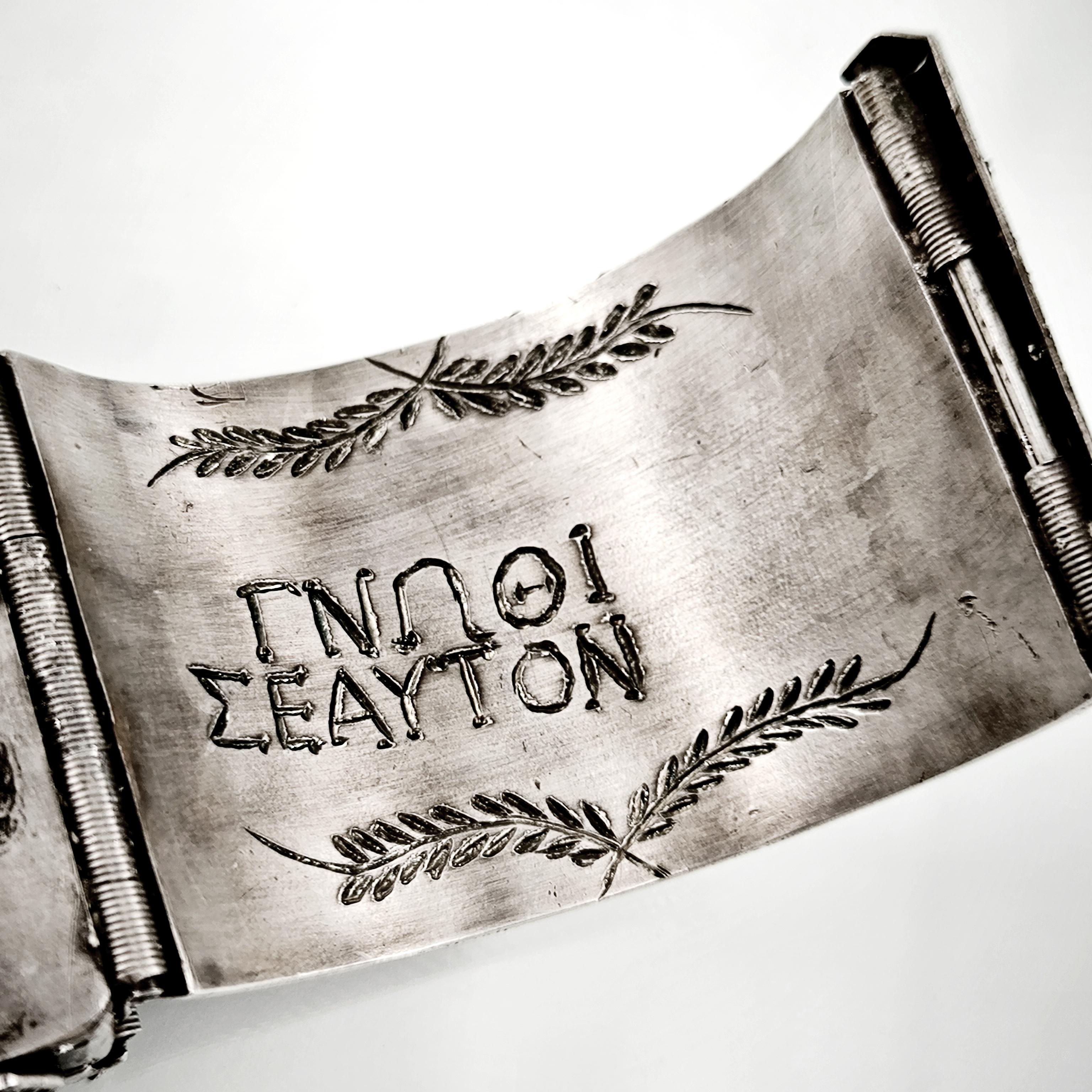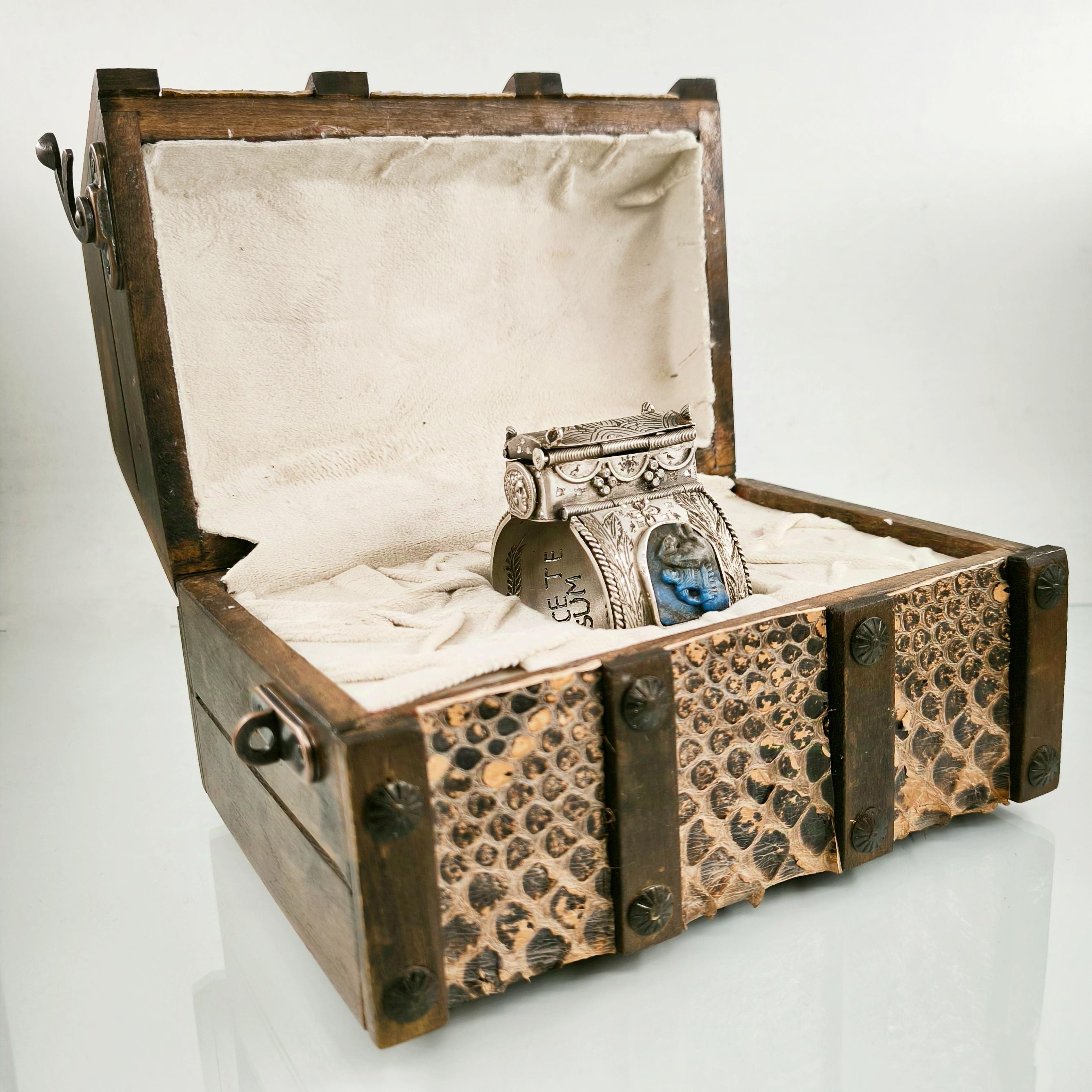 BİR @medusantik TASARIMIDIR. "BÜYÜK İSKENDERİN ONURUNA" LAHİT MEZAR BİLEKLİK! Dünyada eşi ve benzeri olmayan emsalsiz bir marjinal tasarım! Bilekliğin iç kısmında Antik dünyadan günümüze ulaşan özel antik sözler bulunmaktadır. Bu sözlerden birisi Delphi tapınağının girişinde yazılan "Kendini bil" diğeri ise ünlü Hatay mozaiği üzerindeki "Neşeli ol Hayatını yaşa" sözüdür. ayrıca lahitin alt kısmında Büyük İskender'in mermer heykelinin gravürü bulunmaktadır. Bilekliğin kenar kısımlarında ise çerçeveler içindeki Lapis taşlar üzerine kabartma cameo işçiliğinde Büyük İskender'in portreleri yer almaktadır, Lahitin içinde ise tamamen kemikten işlediğimiz Büyük iskenderin, terakota içerisinde kemik olmuş cansız bedeni bulunmaktadır. Eserimiz de yapılan her bir dokunuş baştan sona el işçiliğidir! Işığın değdiği hemen her yere toplam 1.70 crt elmas taşlarla süslediğimiz eşsiz, emsalsiz ve marjinal bir esere dönüştürdüğümüz, Medusa imzalı Lahit Bileklik! Ayrıca bilekliğimize özel lahit formunda ahşap sandık çalıştık! ve üzerini piton derisi ile kapladığımız, iç kısmı ise özel kadife döşemeli oyma yuvası ile muhafa edilerek gönderilecektir. Yapım süreci ve kurgusu aylarca süren bu çok değerli eser için Keyifli Seyirler dilerim! (345 gr.) (925 ayar gümüş) (1.70 crt H/VS diamond)