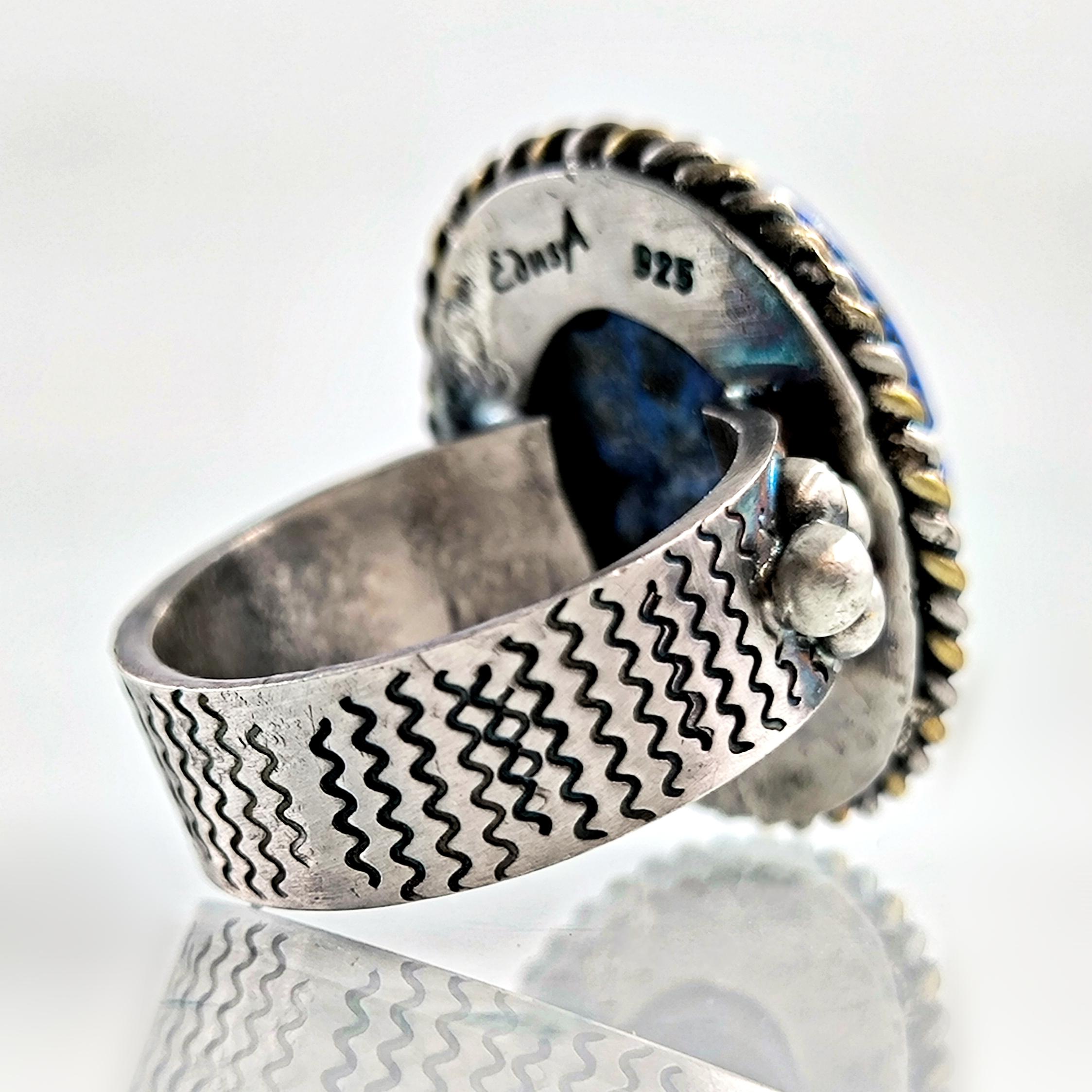 Antik Mısır’ın yeniden doğuş ve koruyucu tılsımı olarak bilinen scarab figürünü, derin mavi lapis taşının üzerine tek tek oyma tekniğiyle işledim. Lapis’in gökyüzünü andıran yoğun mavisi, altın pirit tanecikleriyle yıldızlı bir geceyi hatırlatıyor. 925 ayar gümüş yuva, el işçiliği burgu çerçeve ve kabartma detaylarla tamamlanarak, hem antik hem modern bir ruh taşıyor. Bu parça, binlerce yıllık sembolizmi parmağınızda taşımanız için tasarlandı.