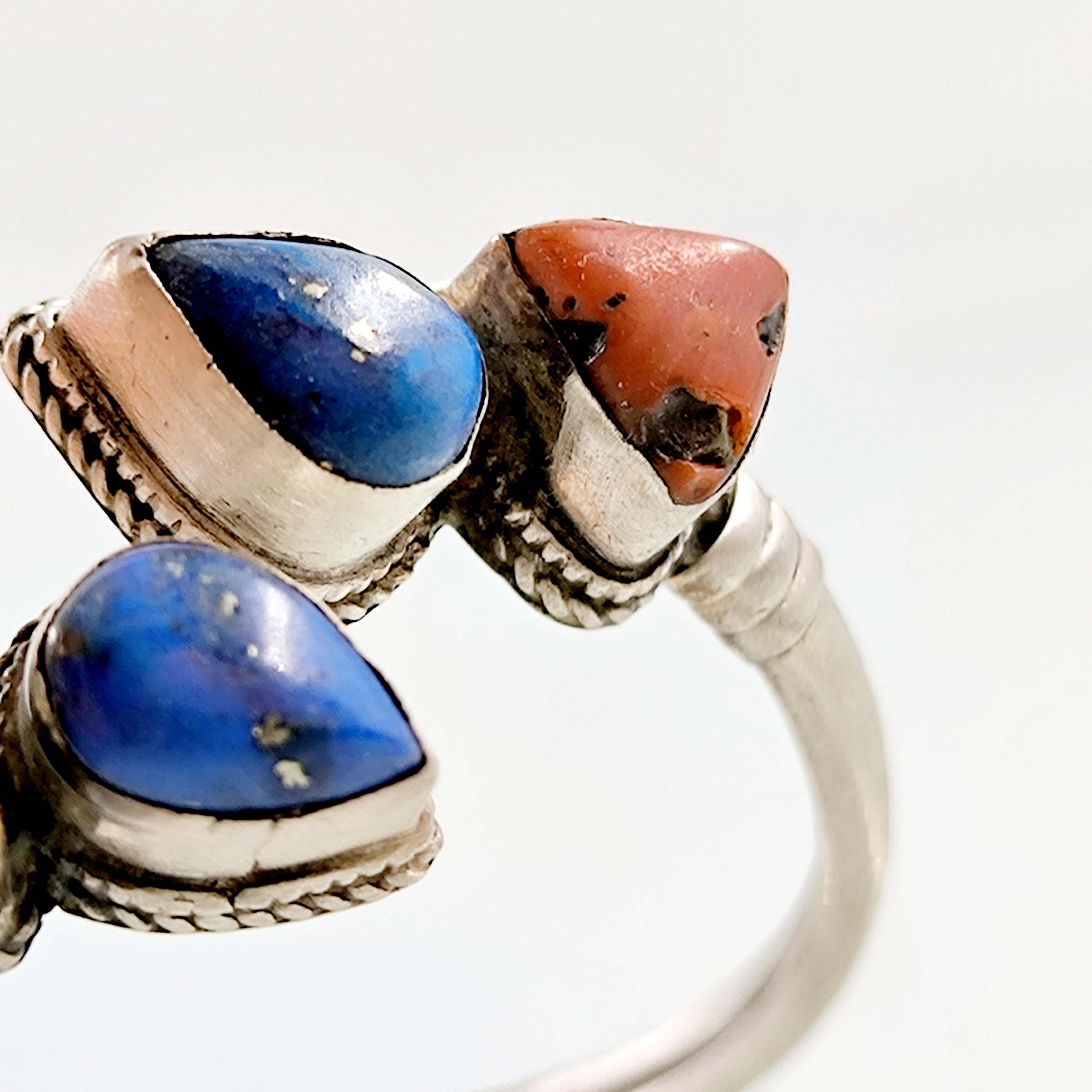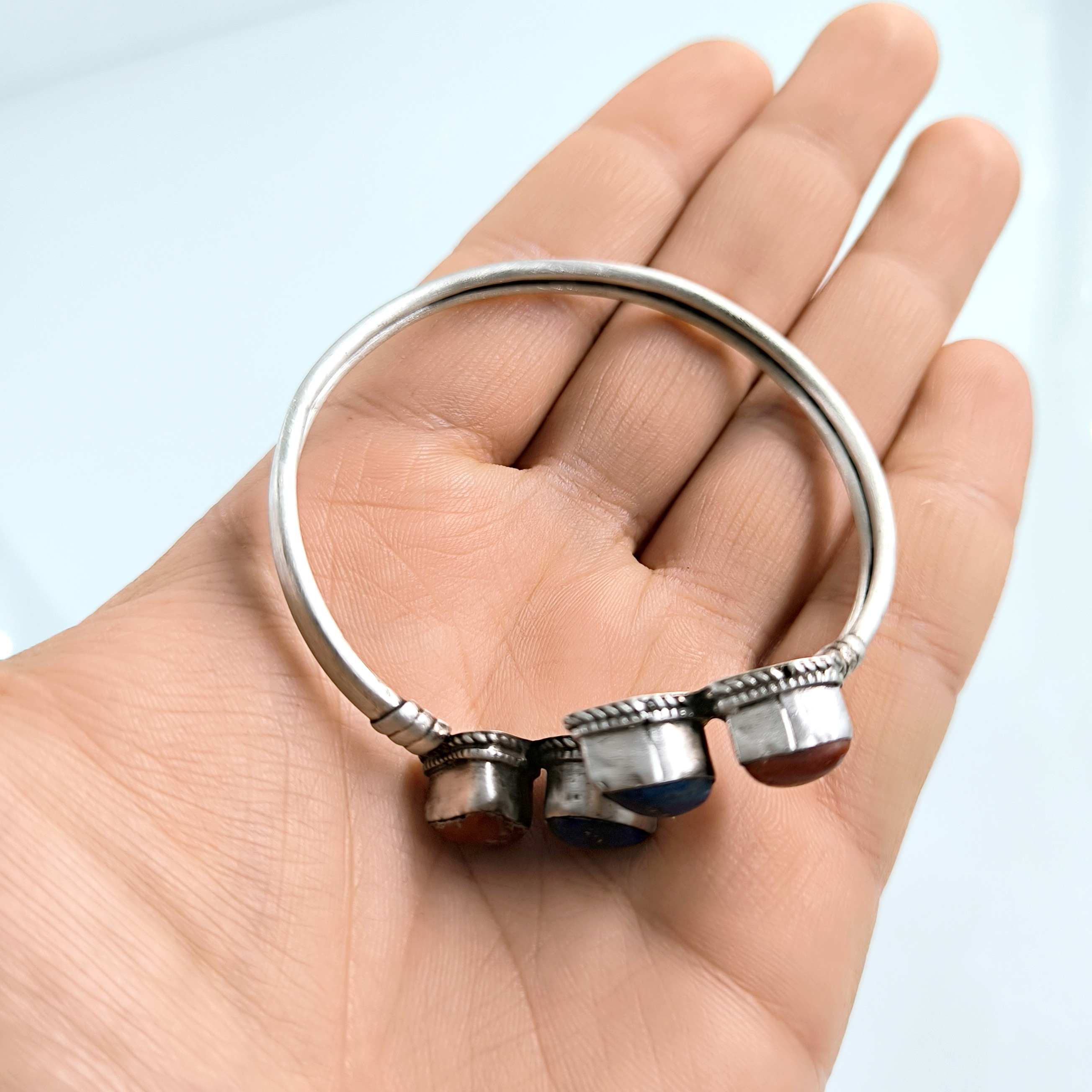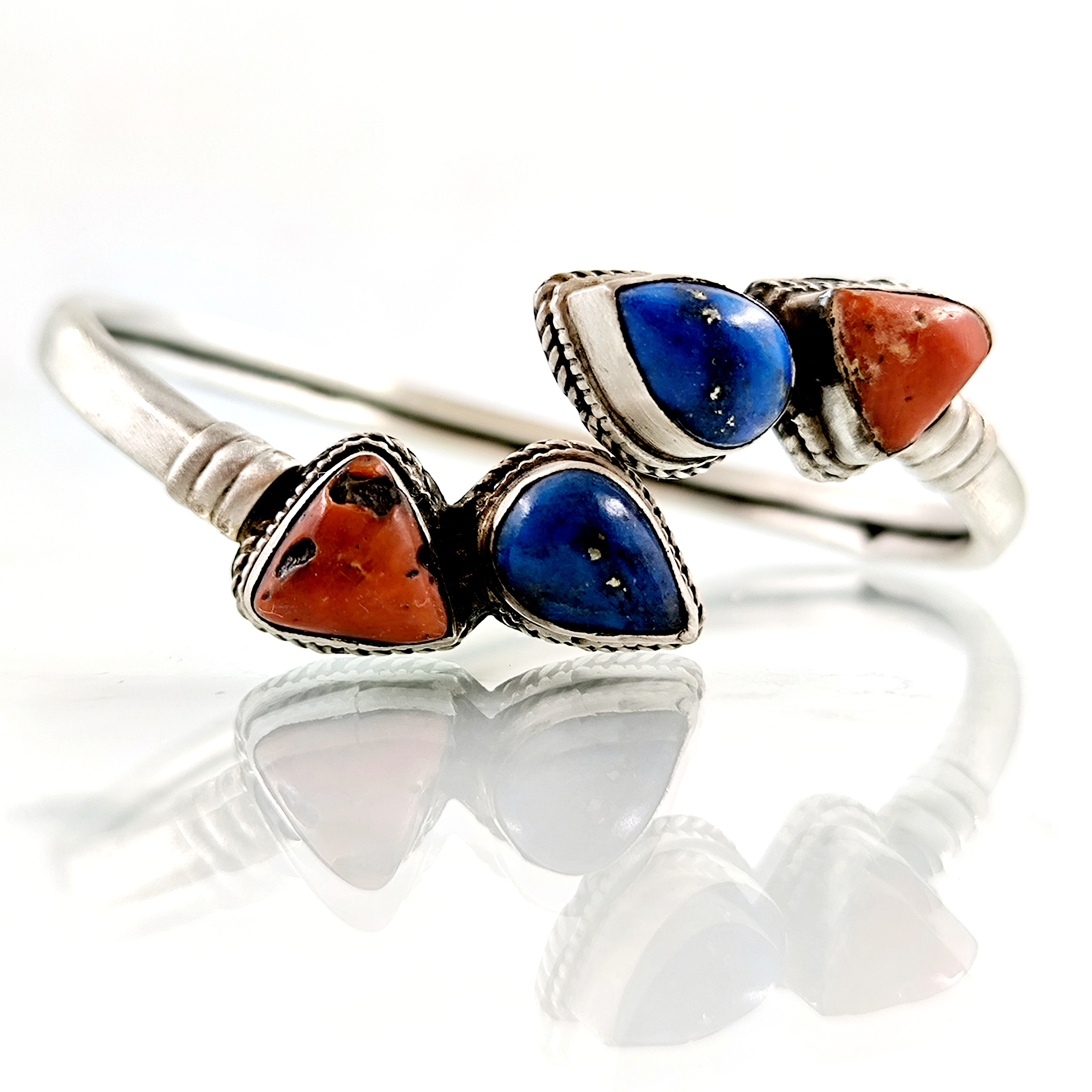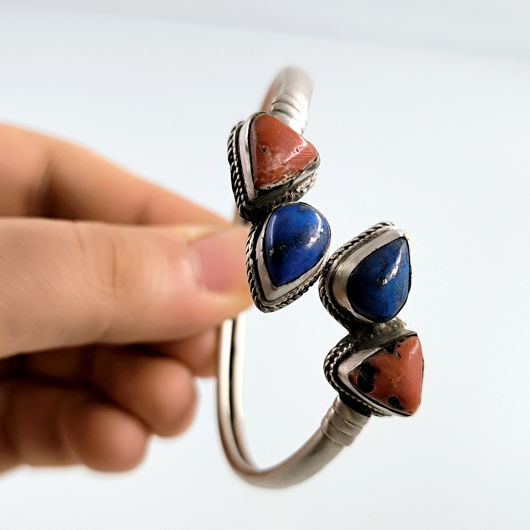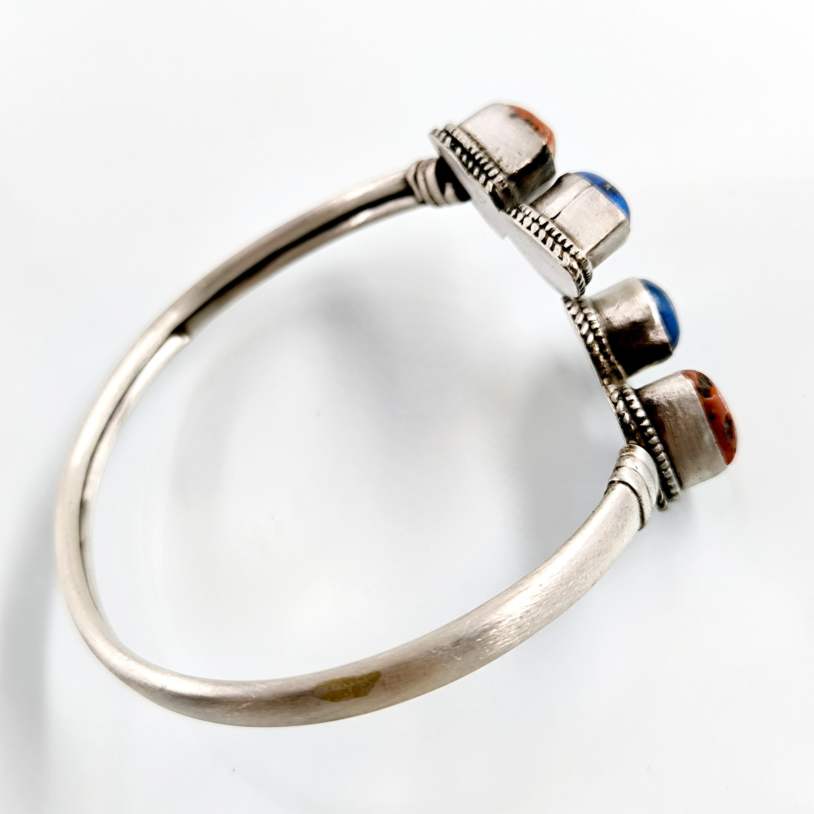 Eski vintage yapım 925 Ayar Gümüşten Lapis Lazuli ve Tunus Mercan taşlı eşsiz güzellikte gümüş bilekligimiz! (16.2 Gr.)