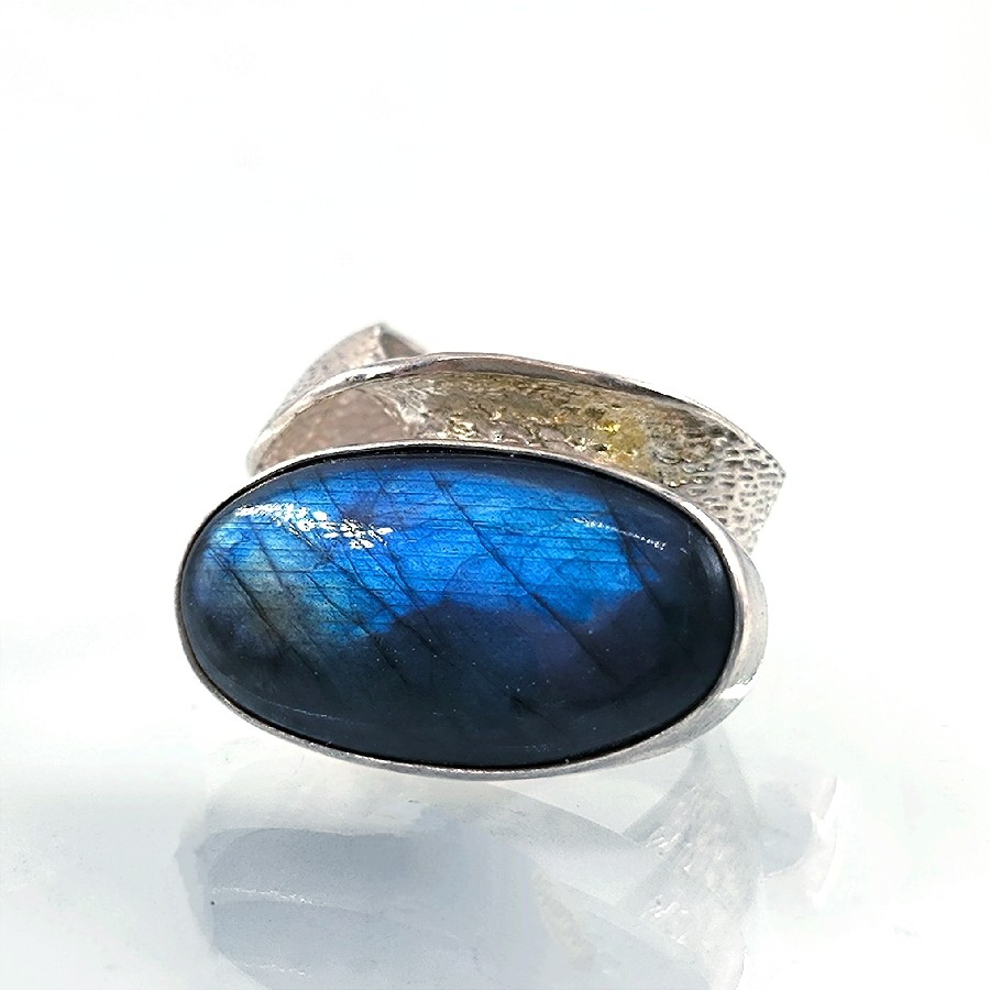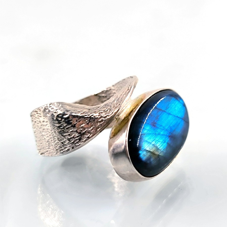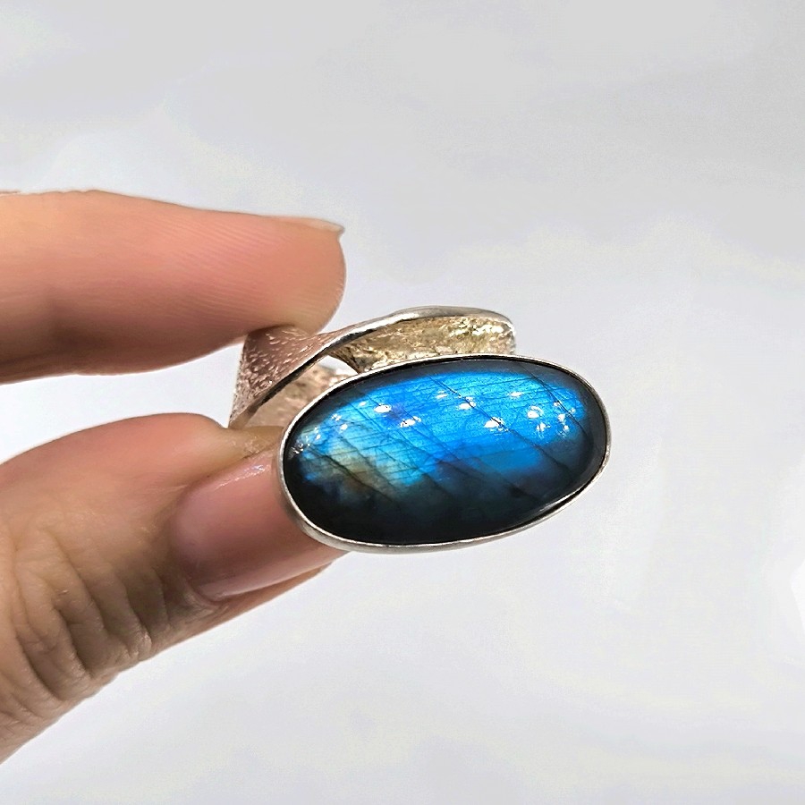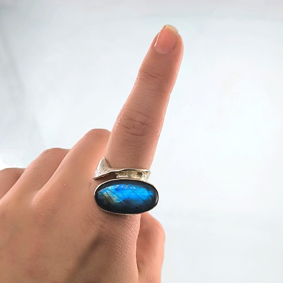 Üstün kalite gümüş malzemesi ve işçiliği ile dikkat çeken bu yüzük, zarif tasarımı sayesinde her türlü kıyafette şıklık ve zarafet sağlıyor. Mavi janjansı rengiyle görenleri büyüleyen labradorit taşı, özel ustalaramız tarafından yapılmıştır.