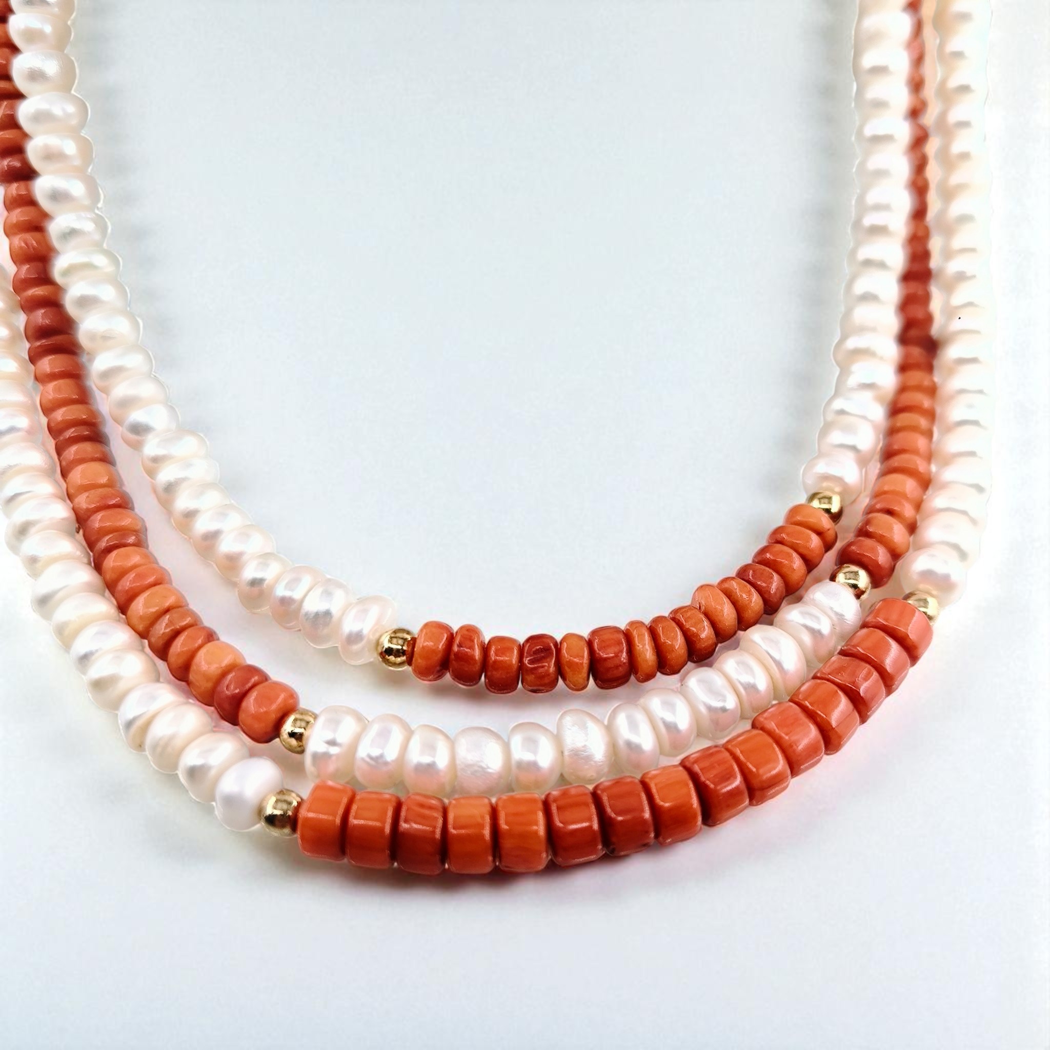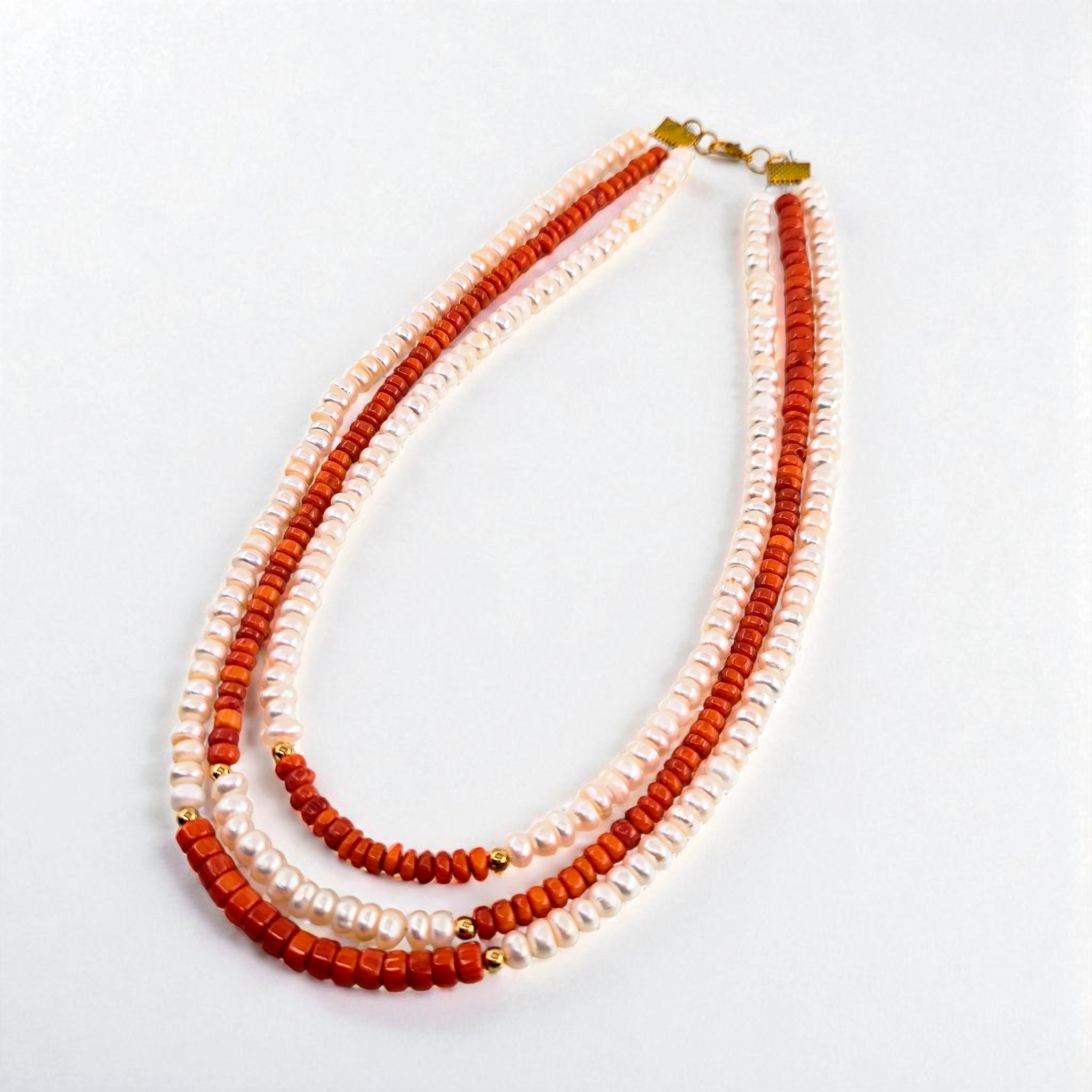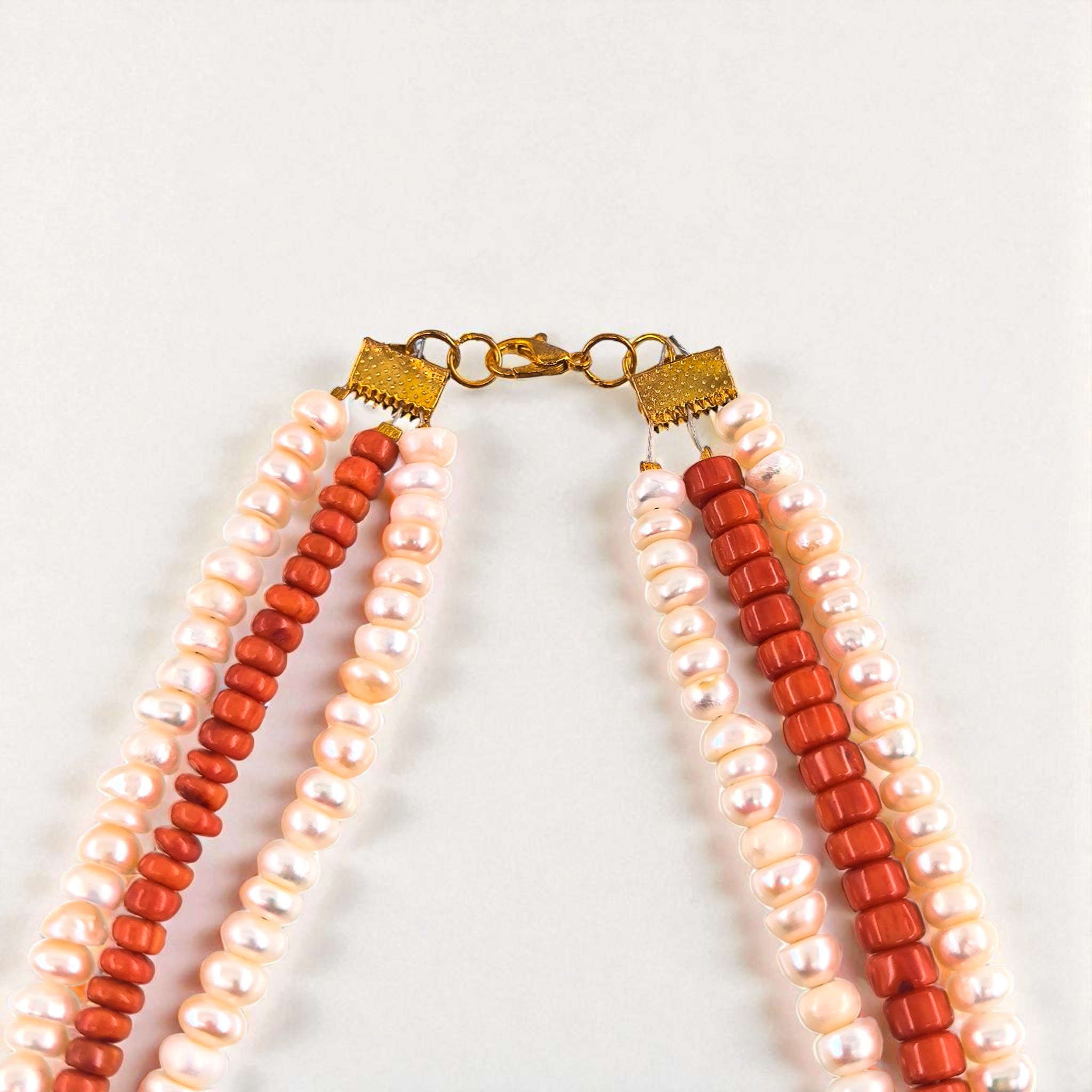 Orijinal mercan ve doğal inci taşlarının büyüleyici uyumuyla tasarlanmış bu üç sıralı gerdanlık, geçmişle bugünü zarif bir dengede buluşturur.