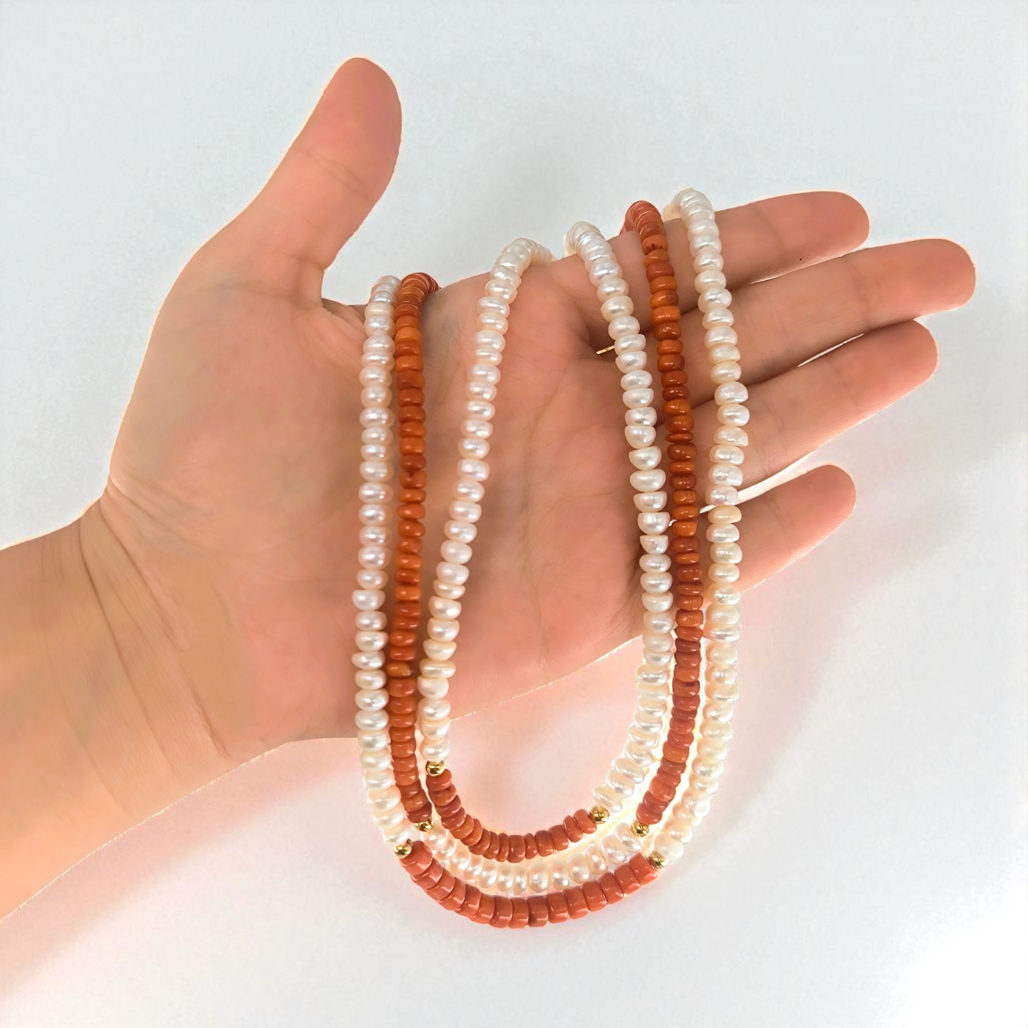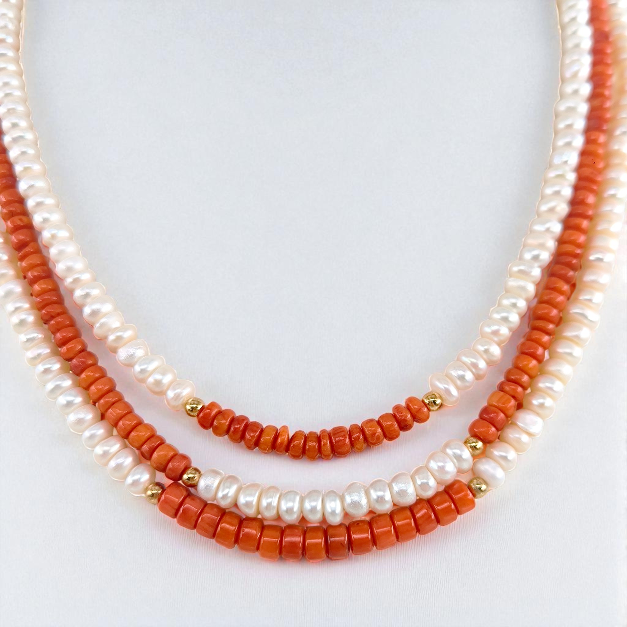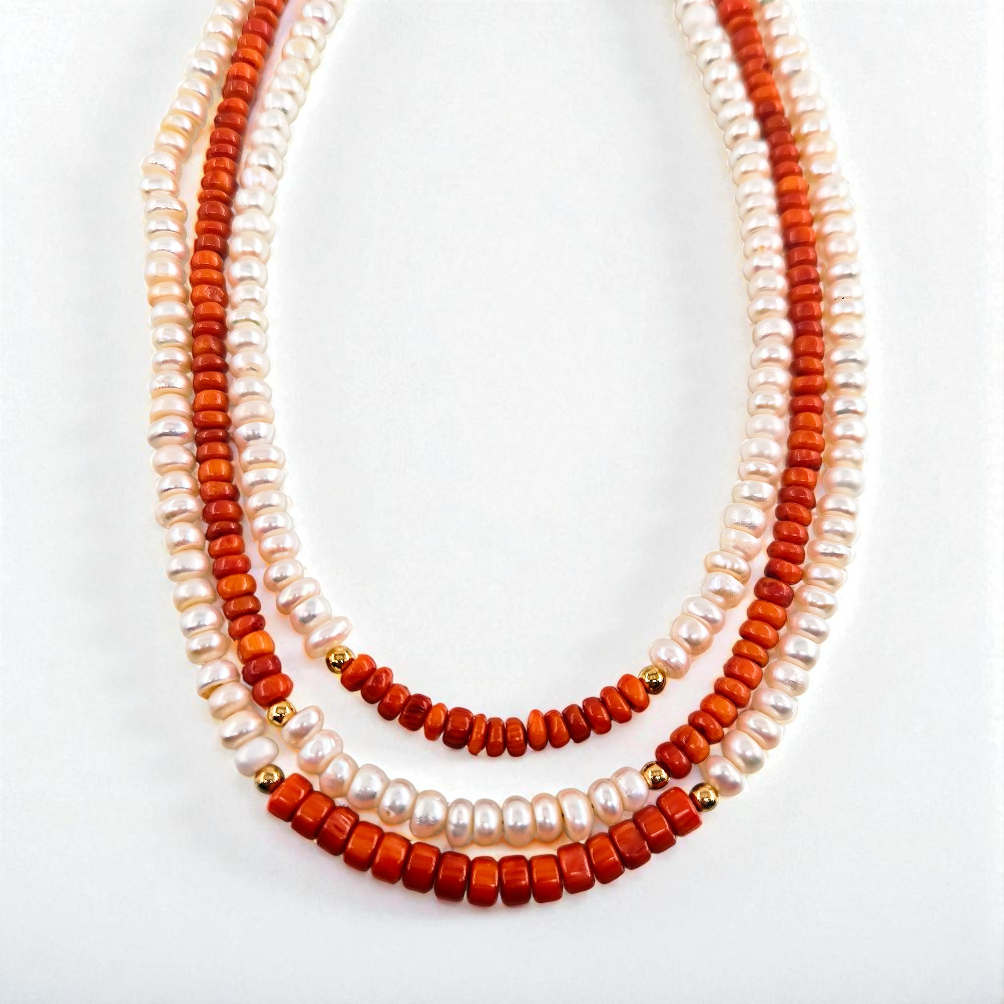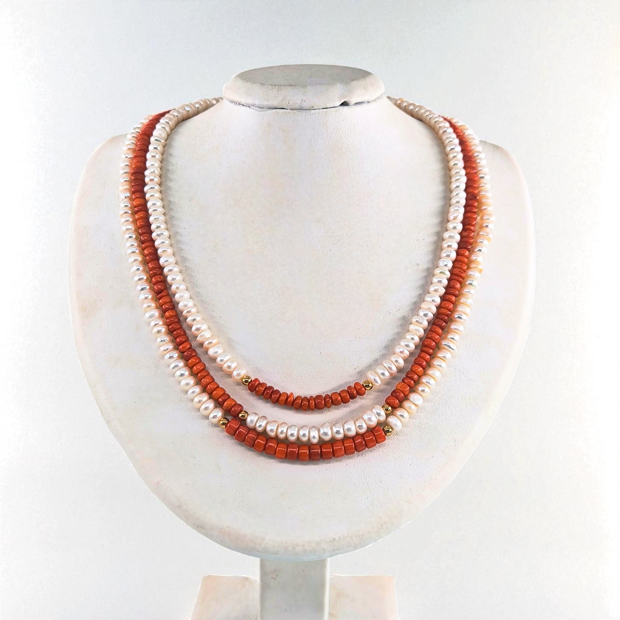Orijinal mercan ve doğal inci taşlarının büyüleyici uyumuyla tasarlanmış bu üç sıralı gerdanlık, geçmişle bugünü zarif bir dengede buluşturur.