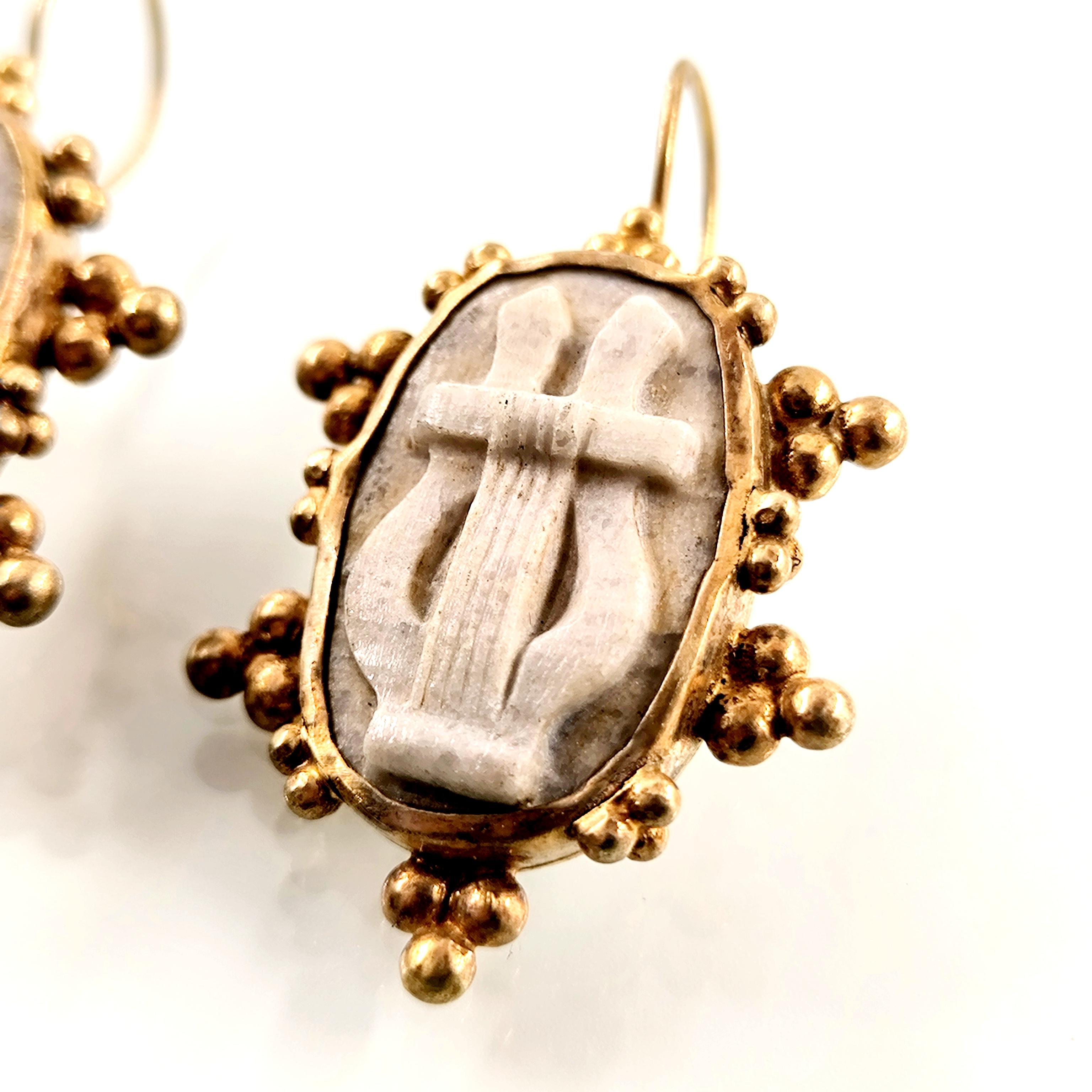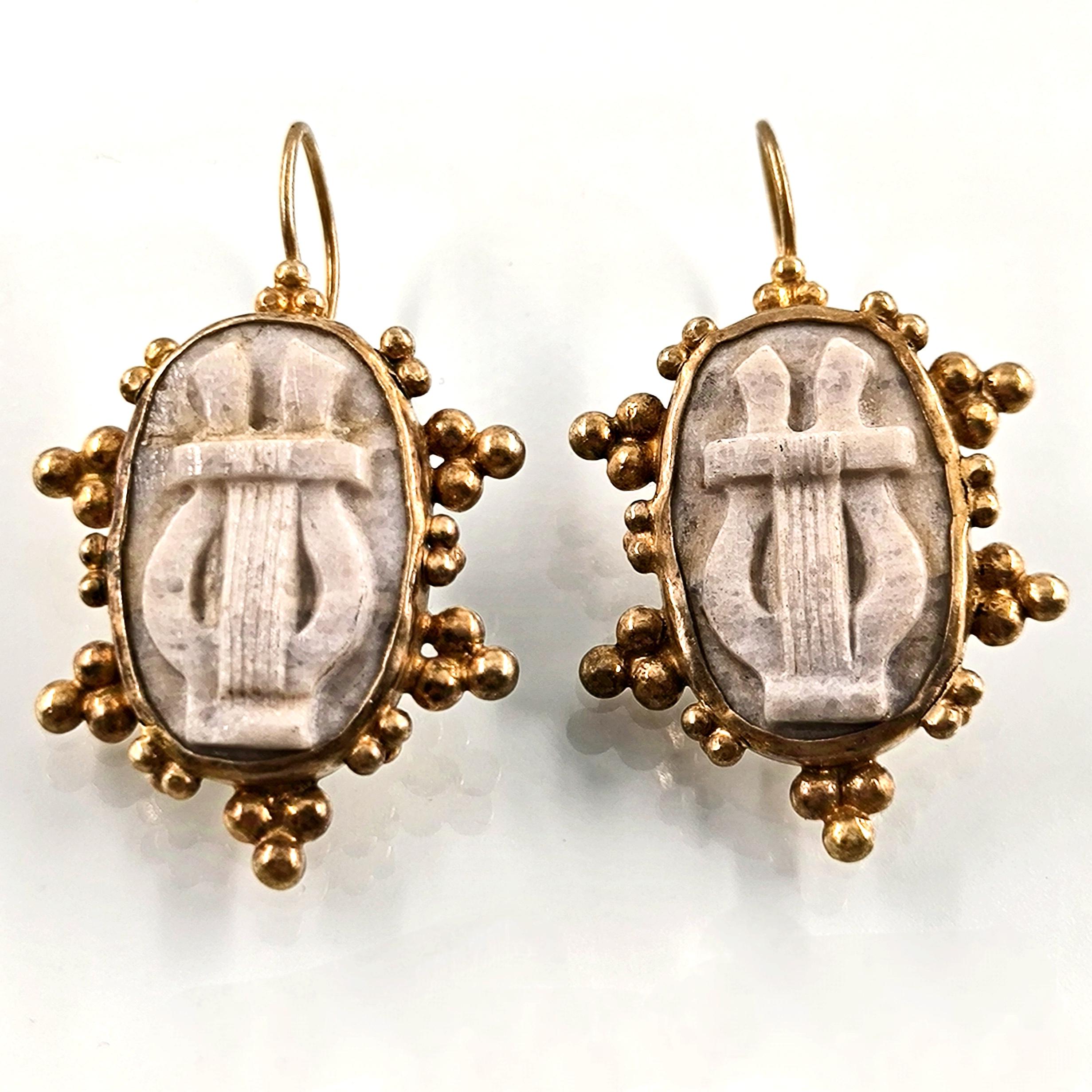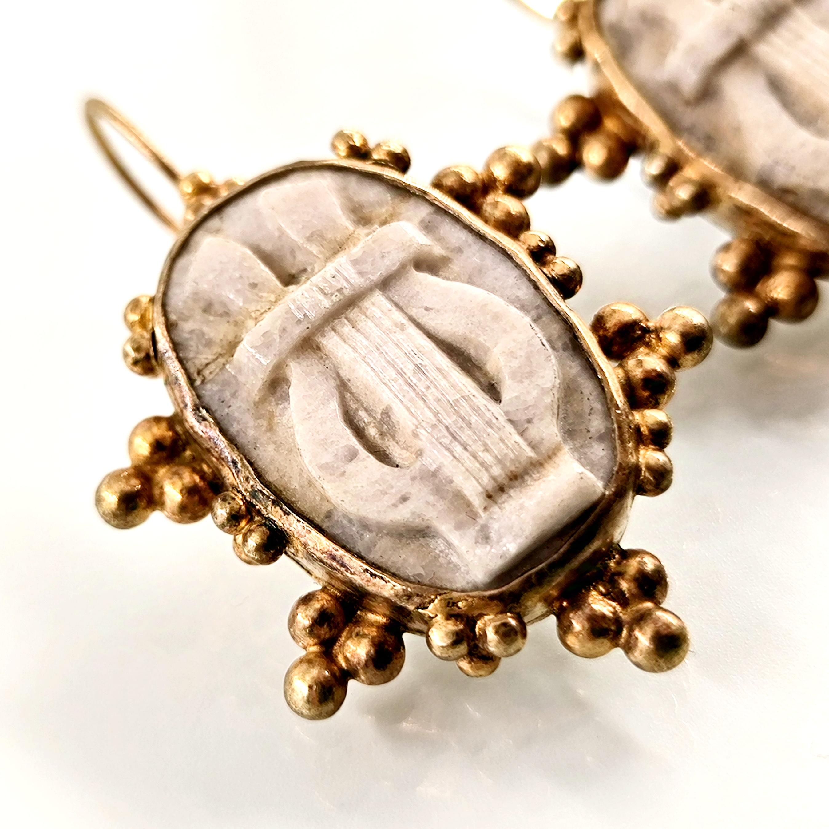 Antik medeniyetlerin en sık kullandığı çalgı aletlerinden kirişleri elle çekilerek çalınan bir çalgı olan LİR! Bir diğer adı ile Arp! Natürel mermer taş üzeri Lir rölyefi çalıştığımız çerçevesi komple 925 ayar gümüş ve üzeri altın kaplama Lir küpelerimiz!