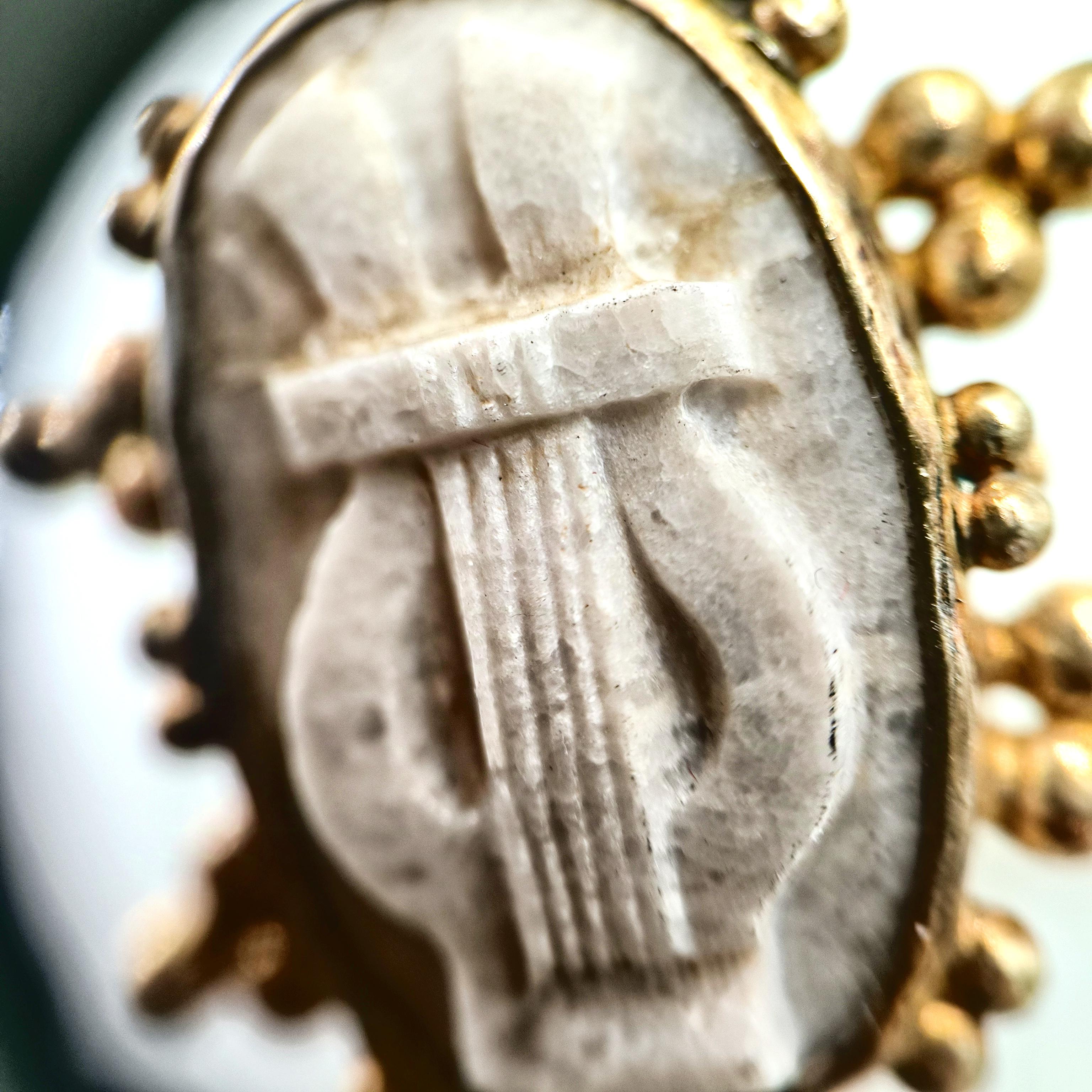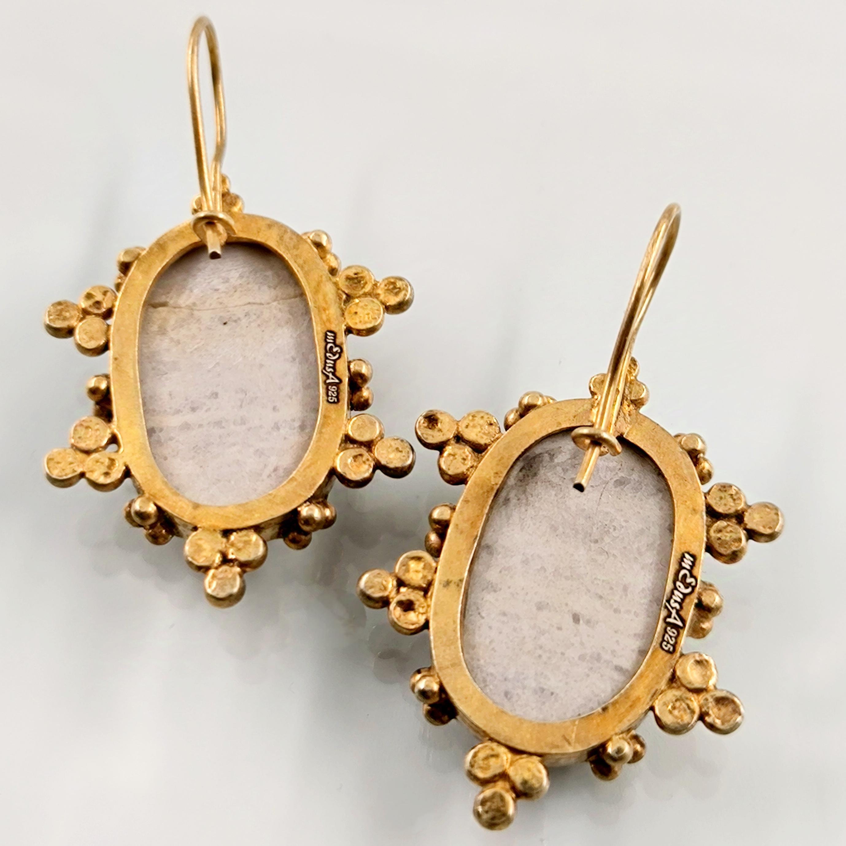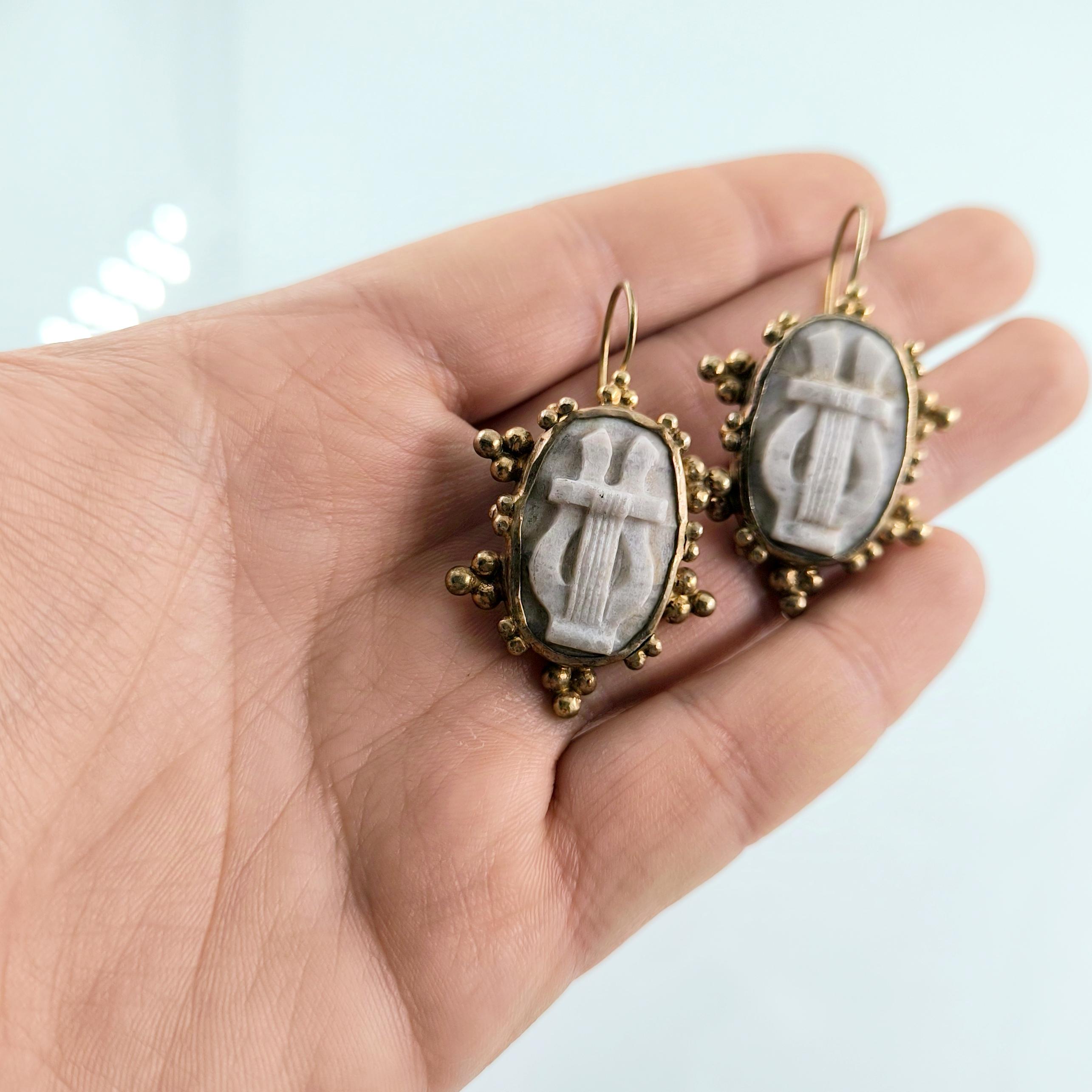 Antik medeniyetlerin en sık kullandığı çalgı aletlerinden kirişleri elle çekilerek çalınan bir çalgı olan LİR! Bir diğer adı ile Arp! Natürel mermer taş üzeri Lir rölyefi çalıştığımız çerçevesi komple 925 ayar gümüş ve üzeri altın kaplama Lir küpelerimiz!
