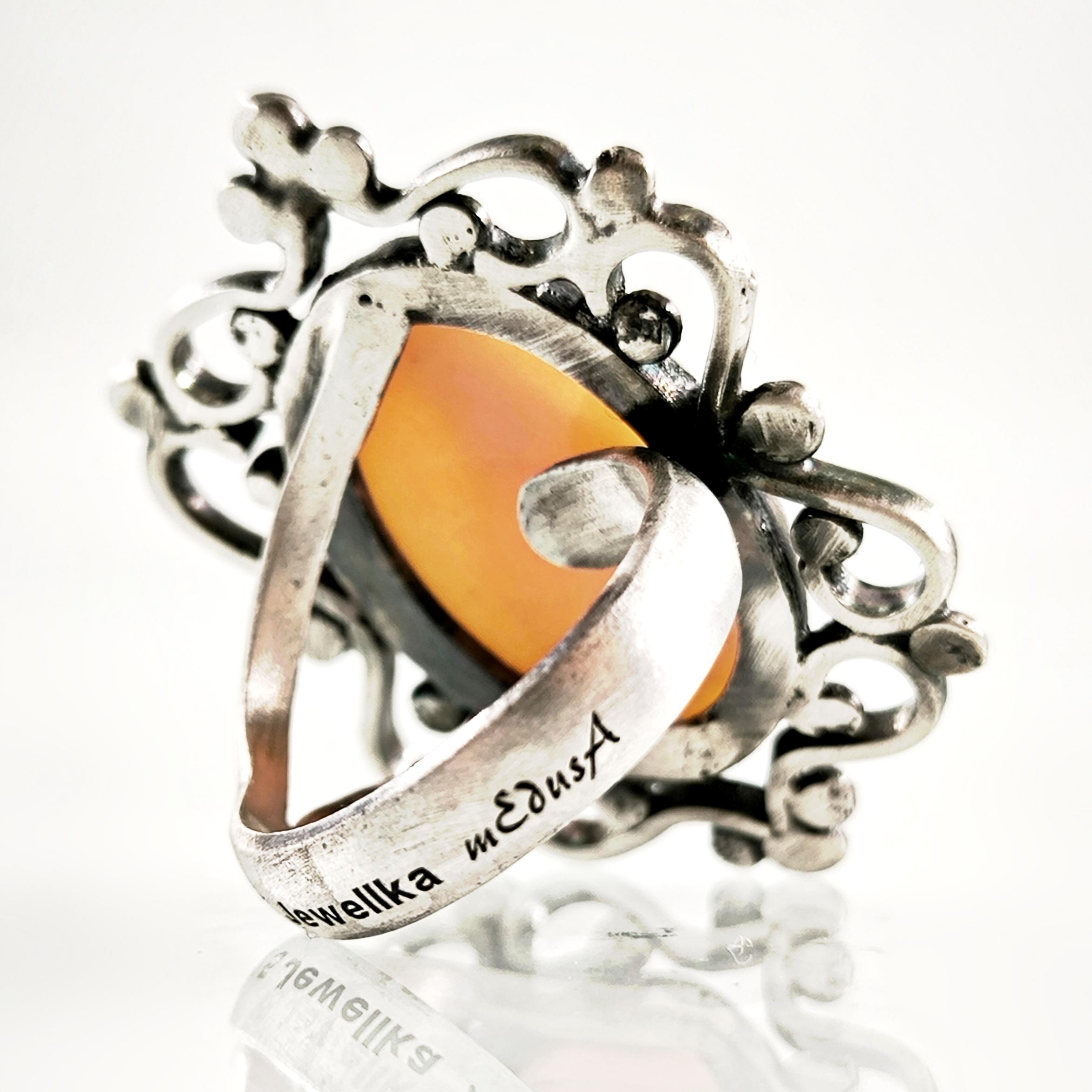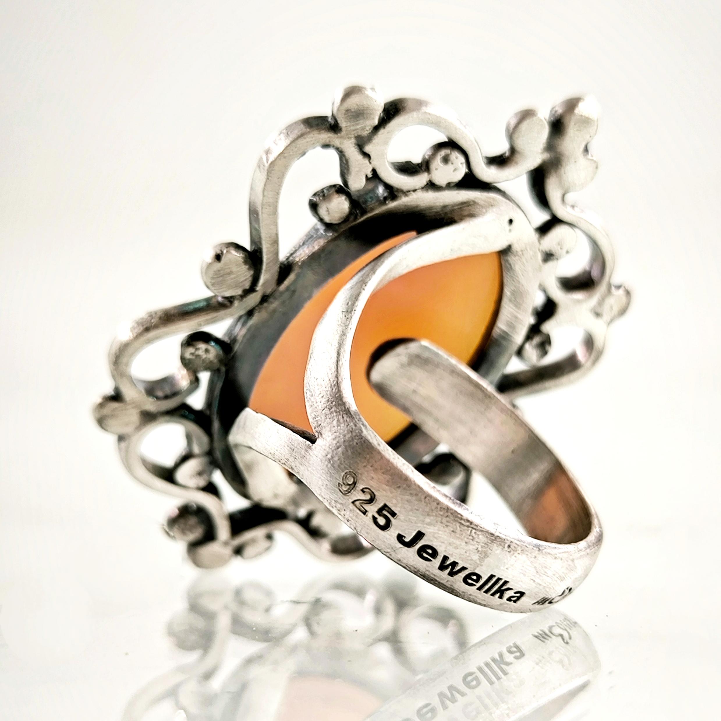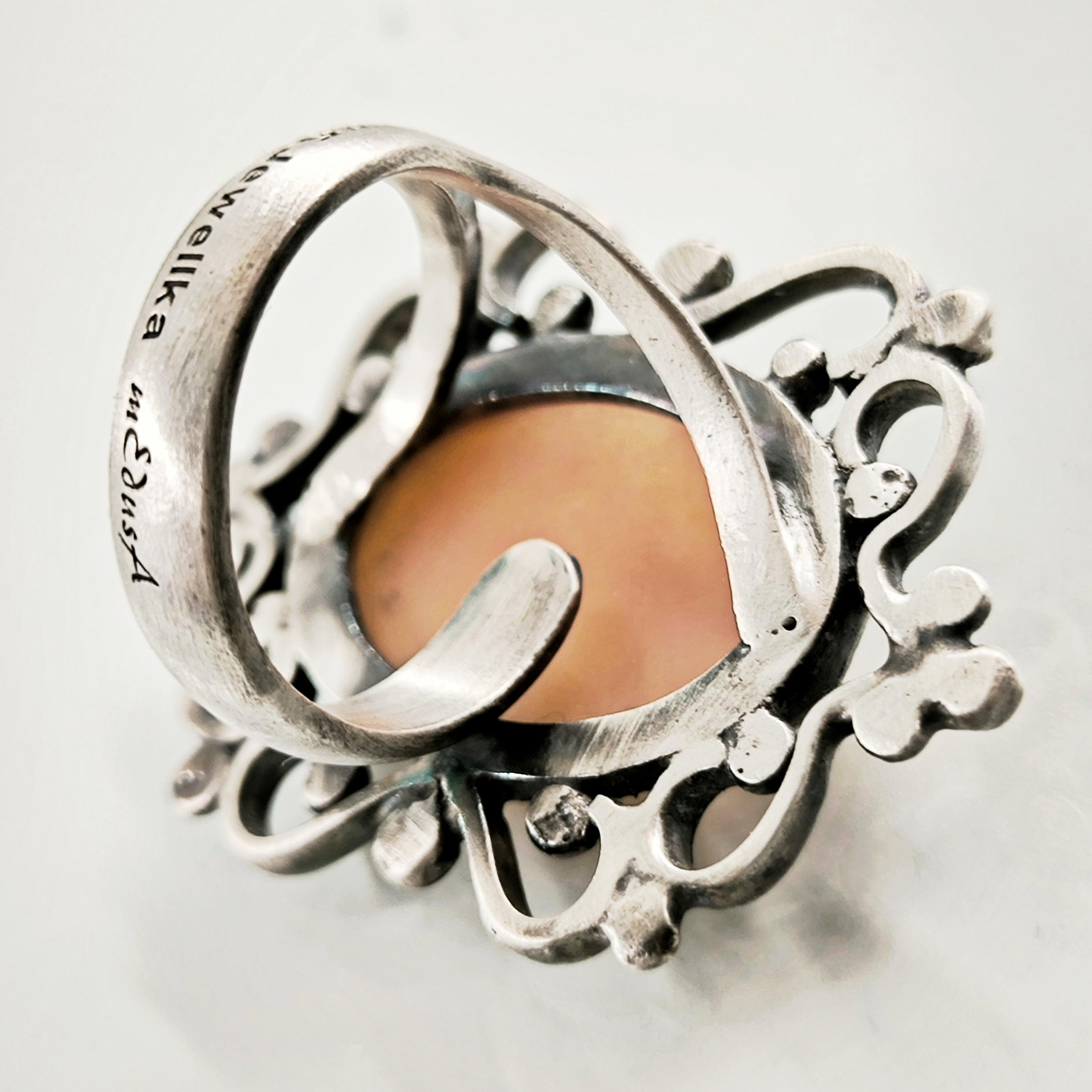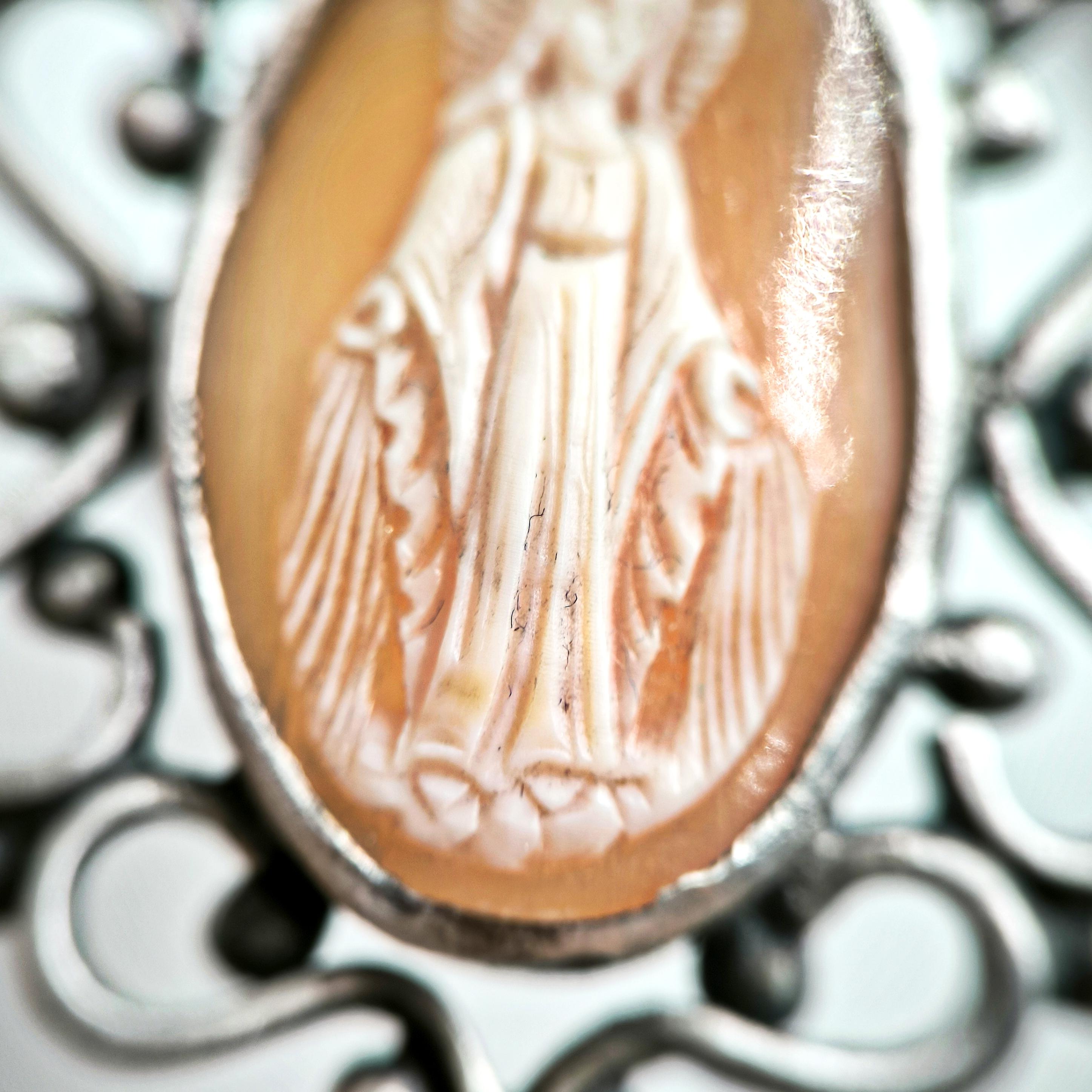 Yaklaşık 40-50 yıllık gerçek bir antika cameo, zarif bir el işçiliğiyle Meryem Ana figürü işlenmiş. Orijinal kabuk üzerine oyulmuş bu nadide taş, özel olarak hazırlanmış 925 ayar gümüş bir yüzüğe çevrildi. Antik dönemin ruhunu ve dini tasvirin mistik gücünü taşıyan bu eşsiz parça, hem manevi bir anlam hem de koleksiyon değeri sunuyor.
